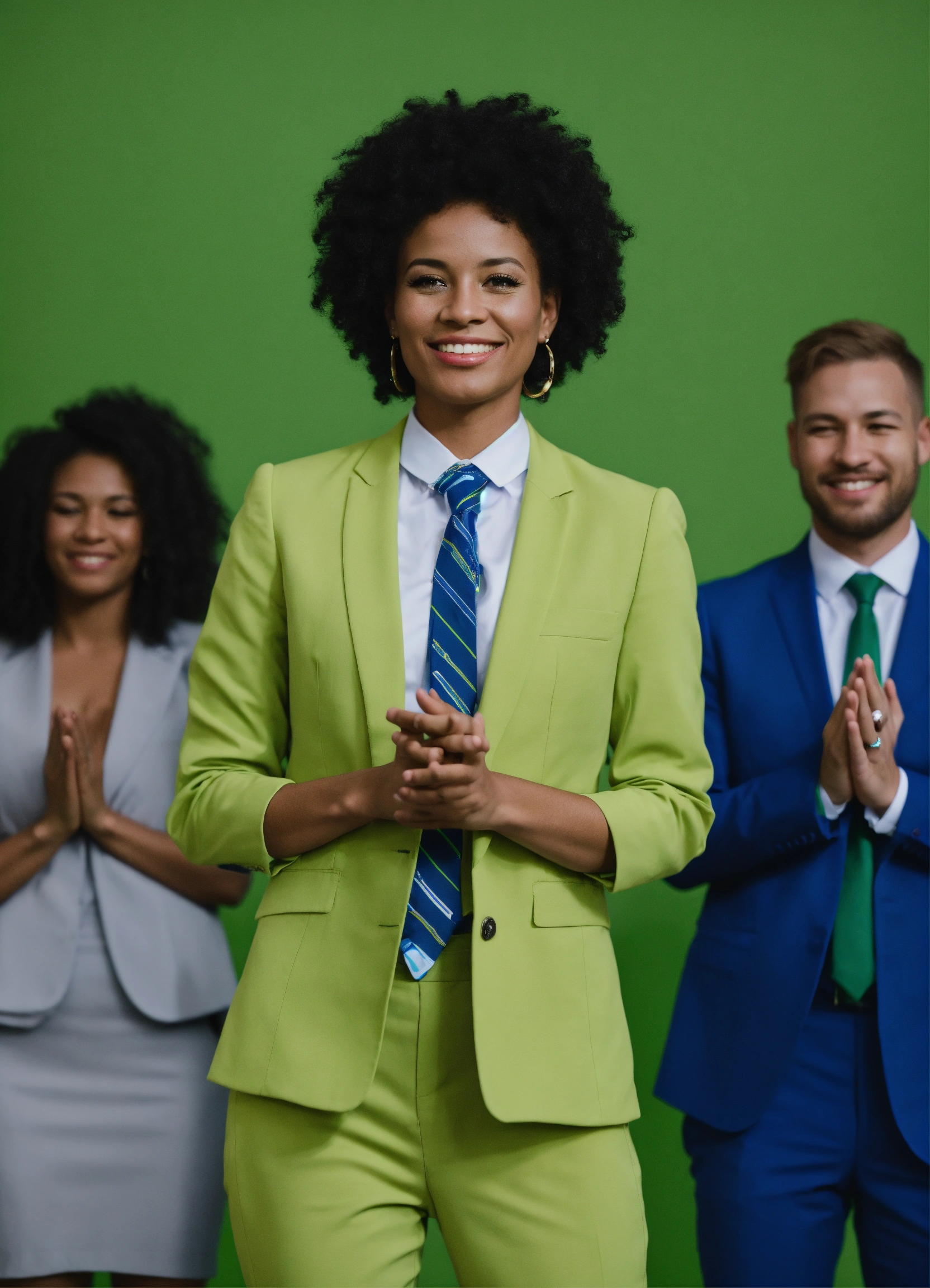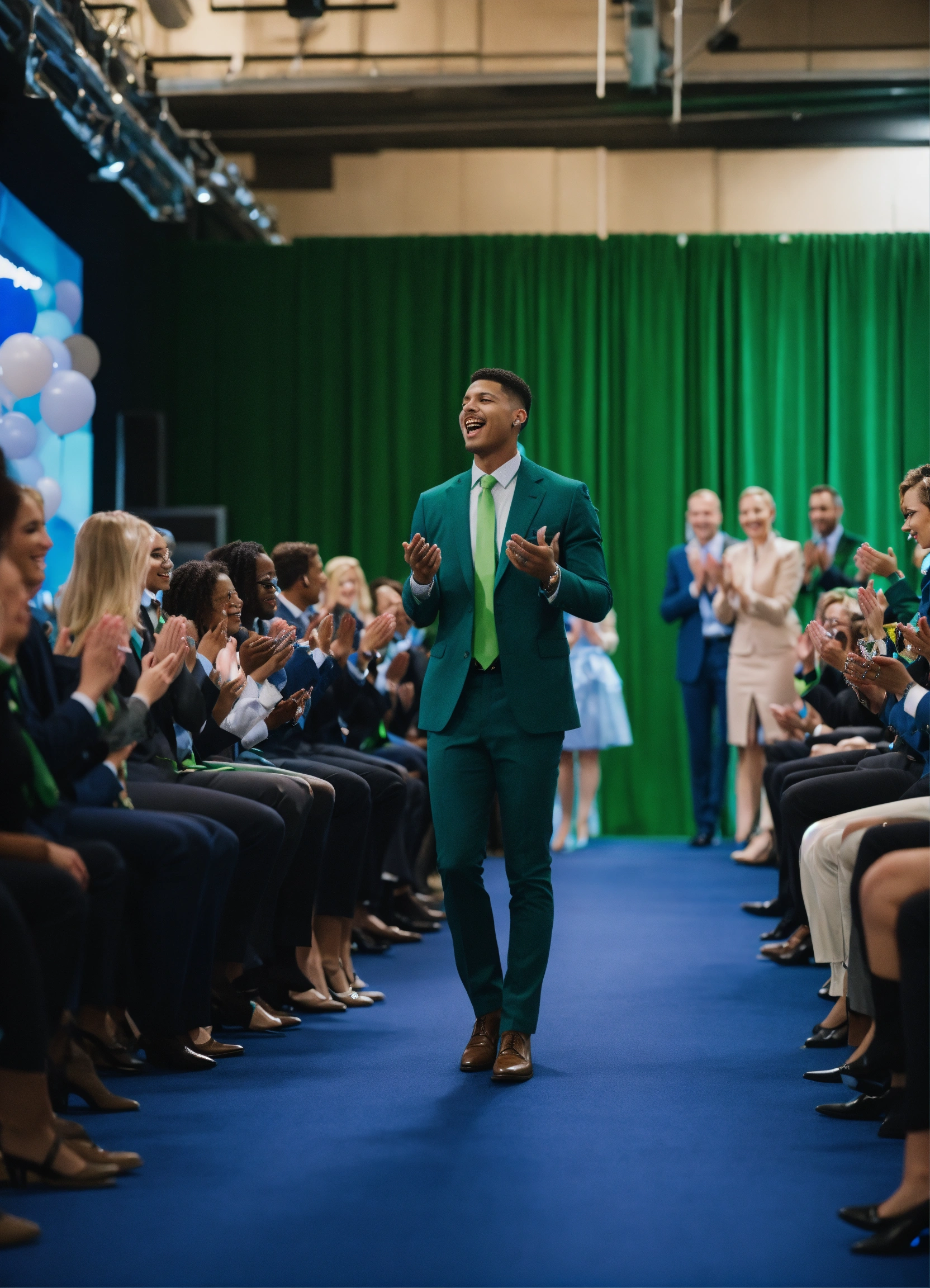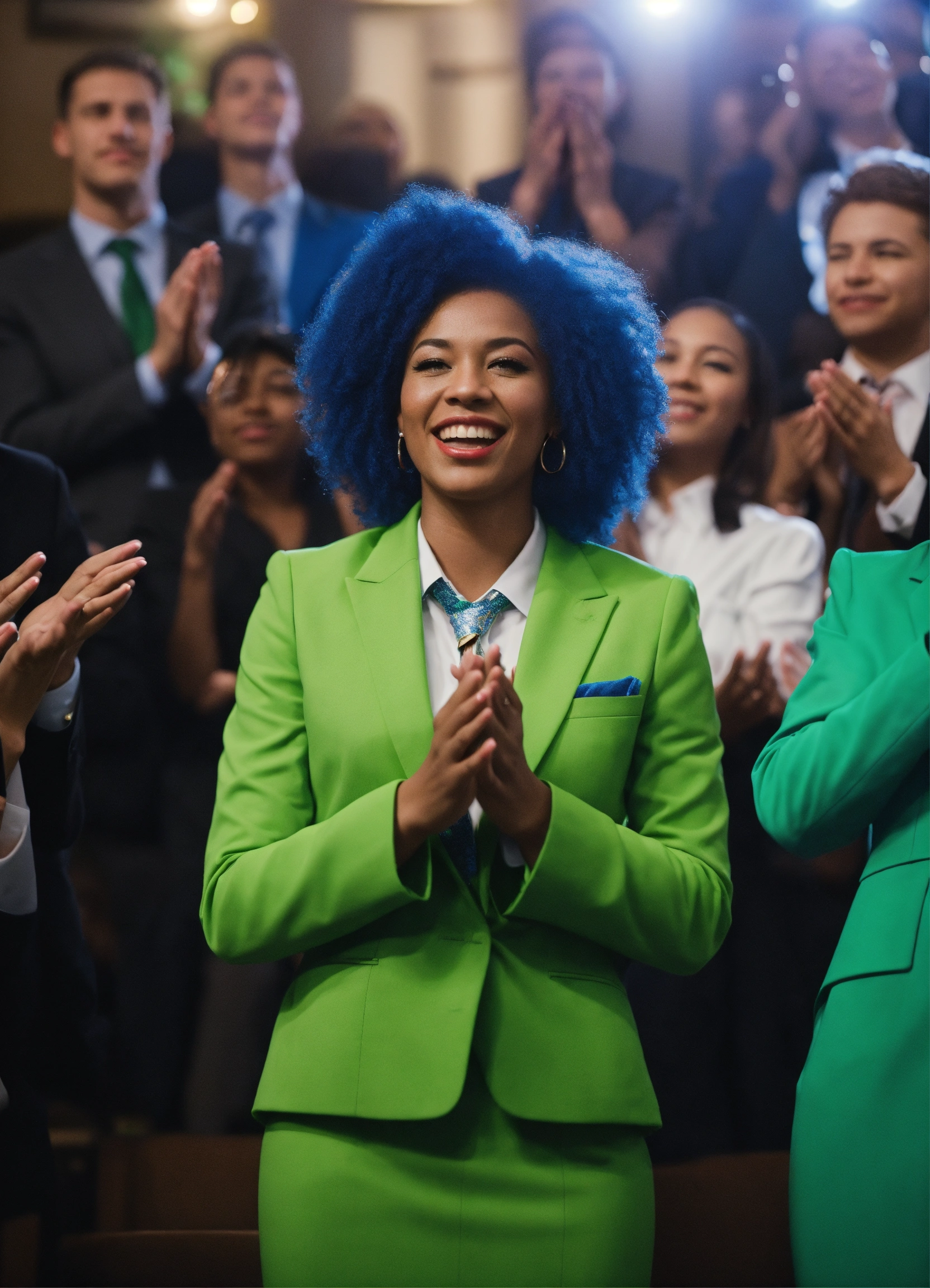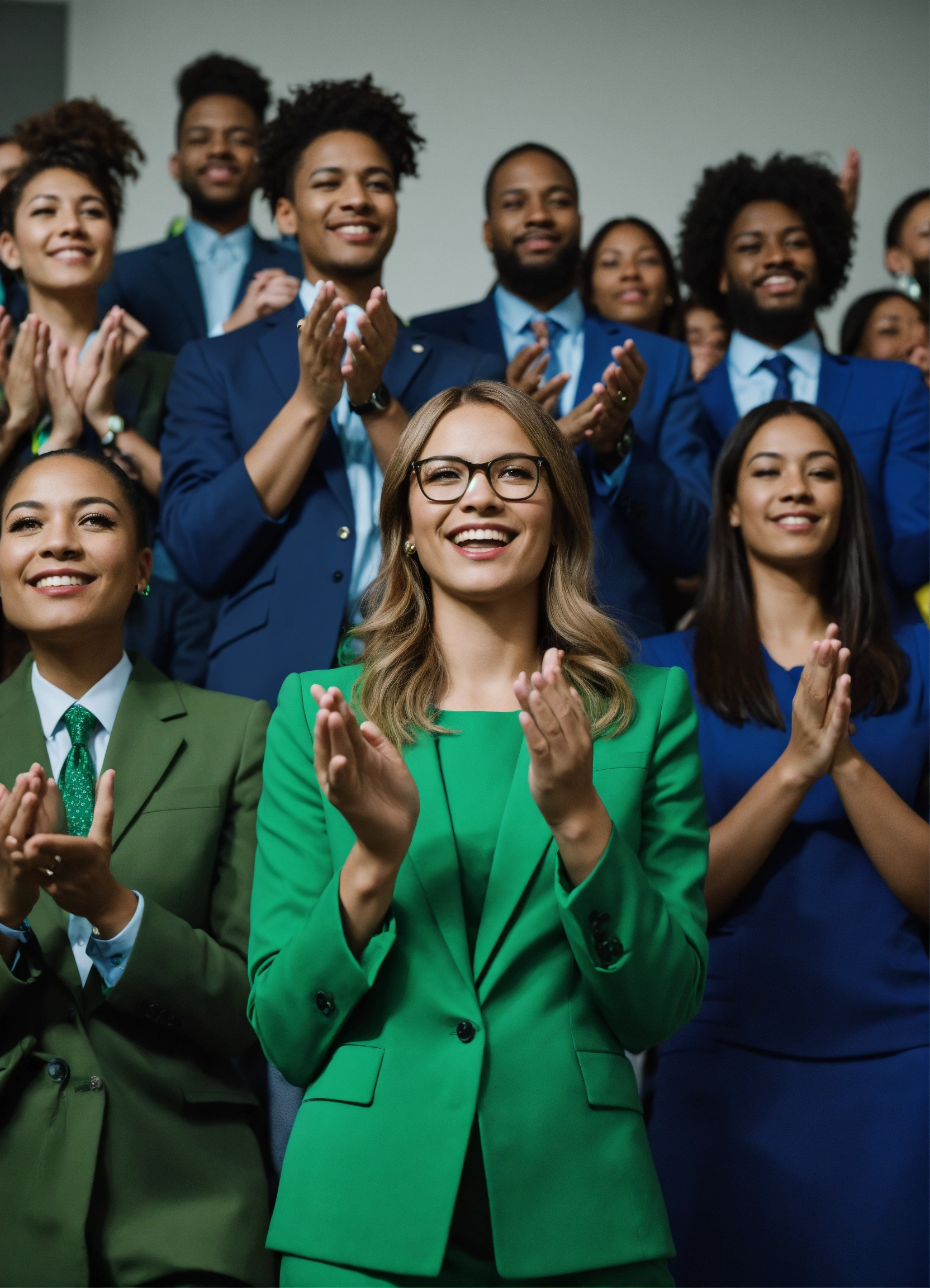 A gender nonconforming person with their team applauding for them, professional, business attire, motivating, blues and greens, 4k