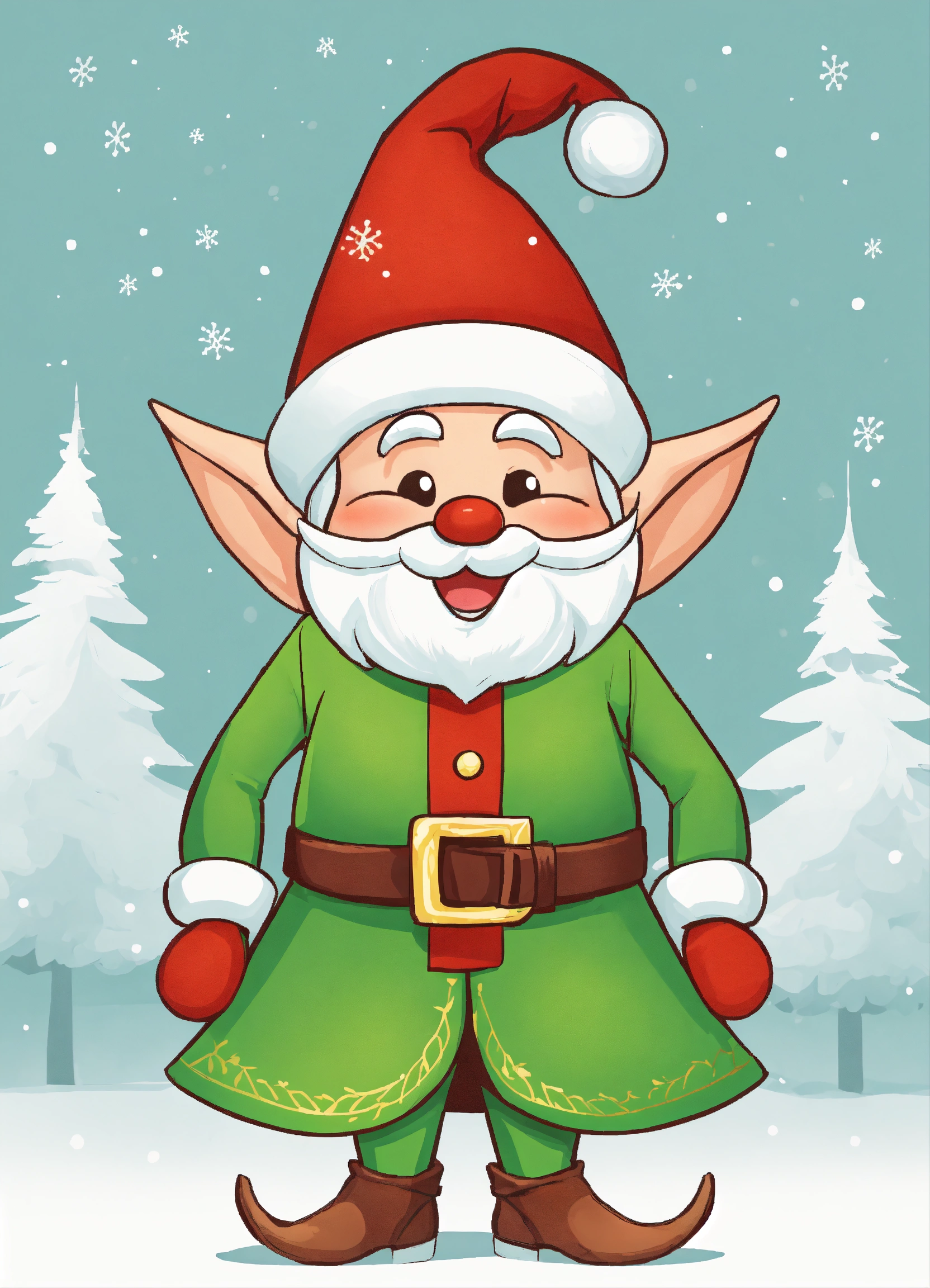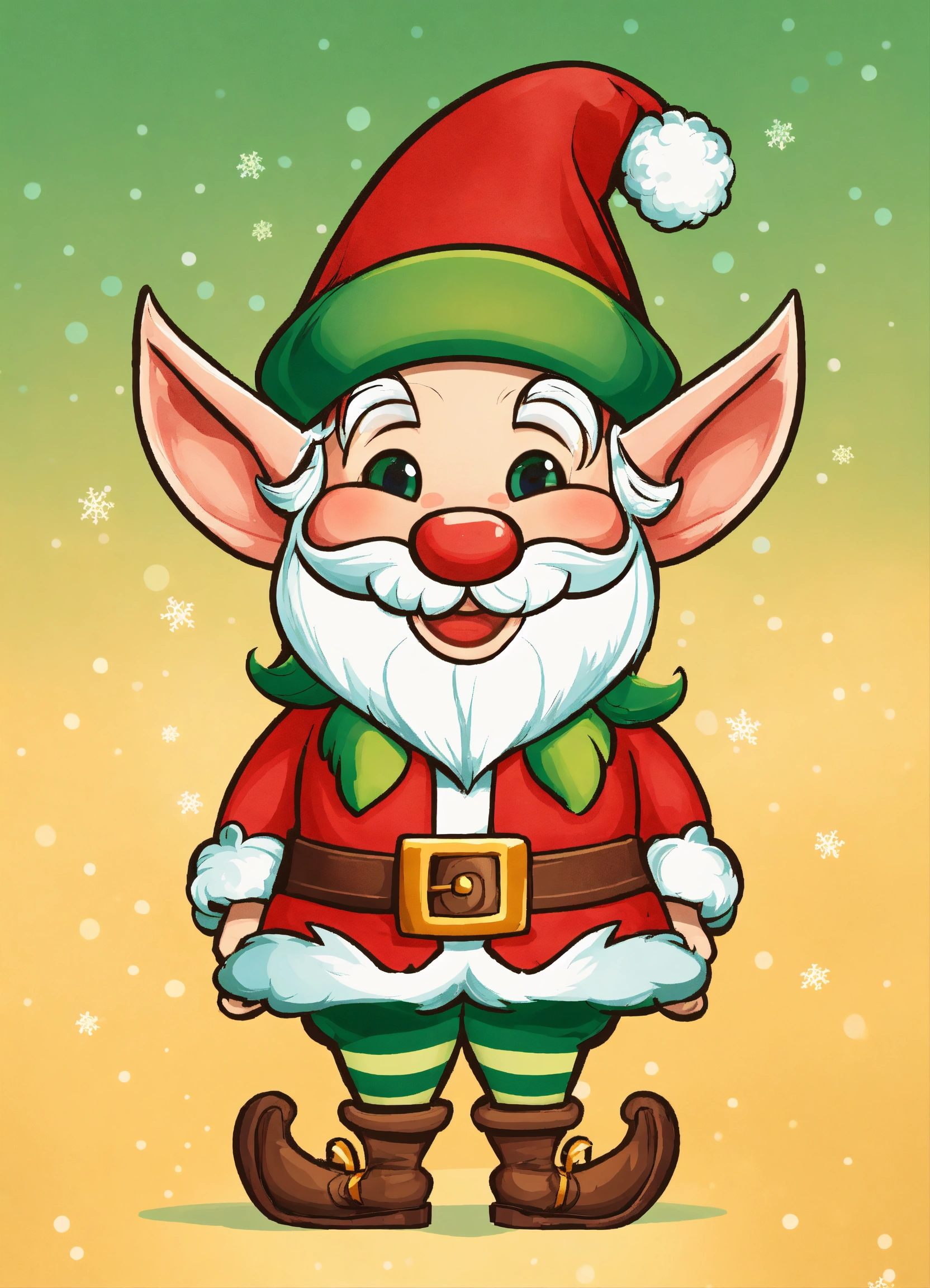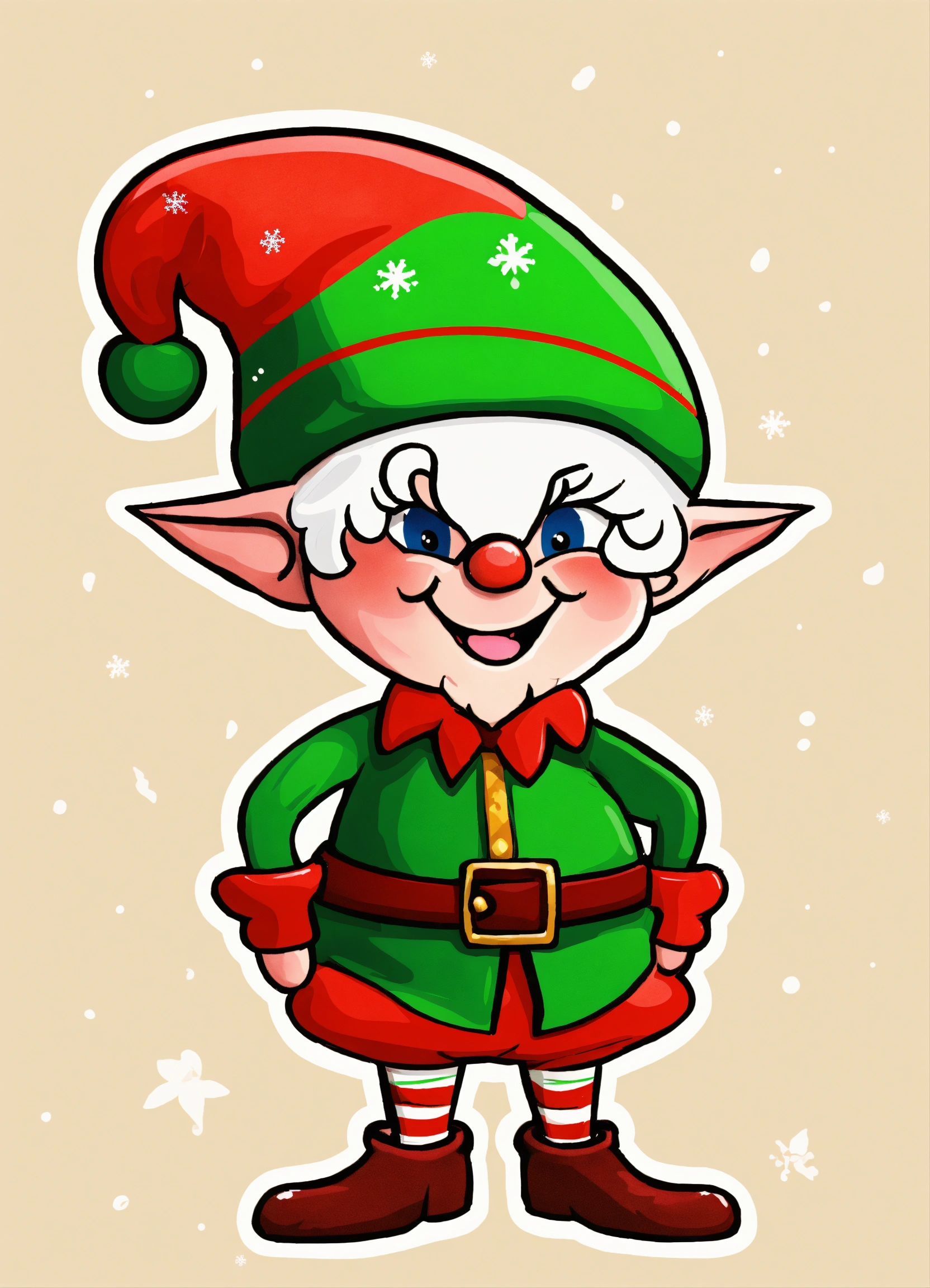 The cartoon illustration of santa's elf is a diminutive, whimsical figure with rosy cheeks and pointy ears. they typically wear vibrant, festive attire, including a green or red tunic, pointy hat, striped leggings, and curly-toed shoes, all topped off with a big, friendly smile. color on a white background.