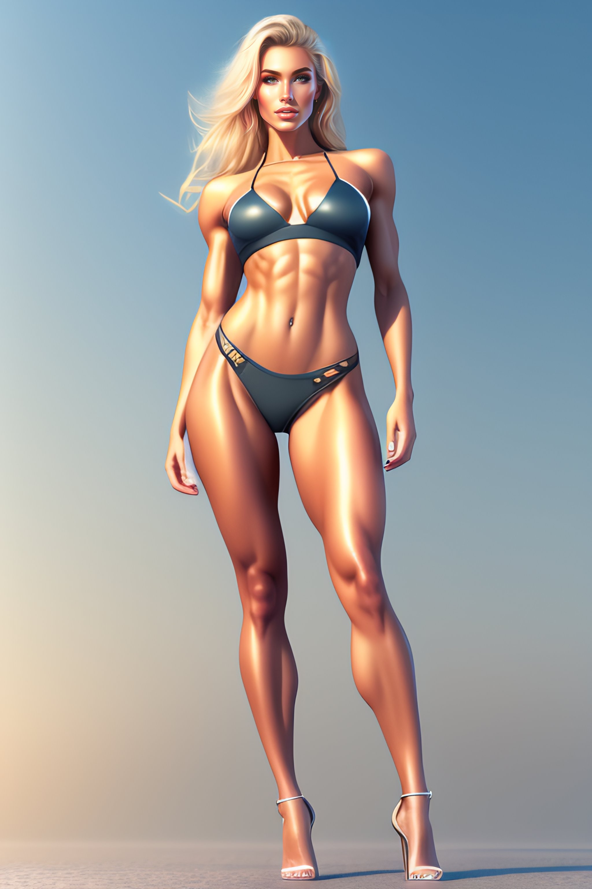 Muscular body blonde, woman hyper realistic, larger legs and chest anime cartoon, small waist, sci fi, third person perspective, voluptuary, involuntary, attractive, goddess, kind, pretty, smiling, female, nice, highly detailed, bright open eyes, clothes tight, realistic digital painting, smooth, sharp focus illustration, attractive body, muscular legs, pretty skin, gorgeous, picture, beautiful model, perfect skin, beautiful symmetrical face, body, posing, thinly veiled, cupped hands