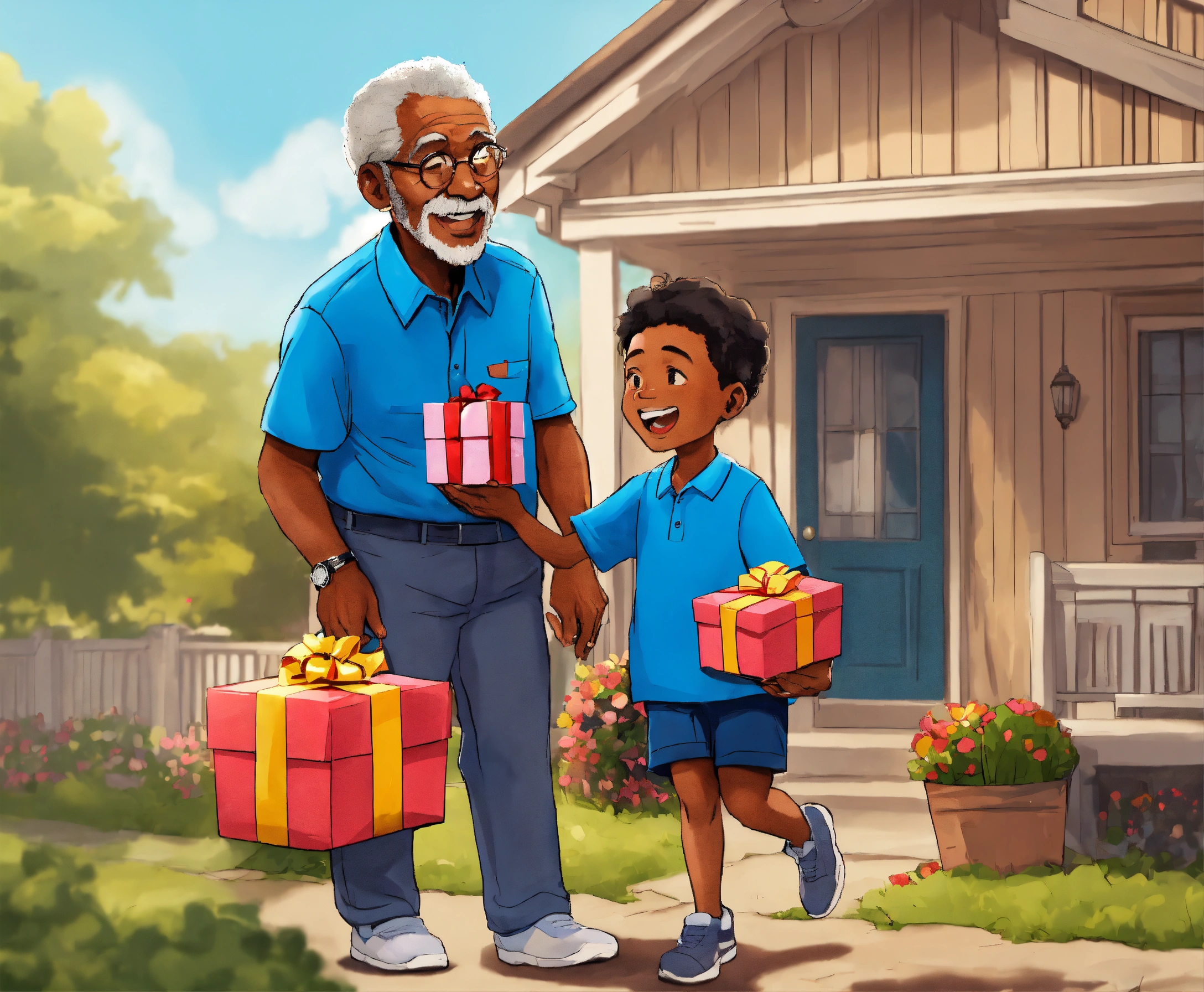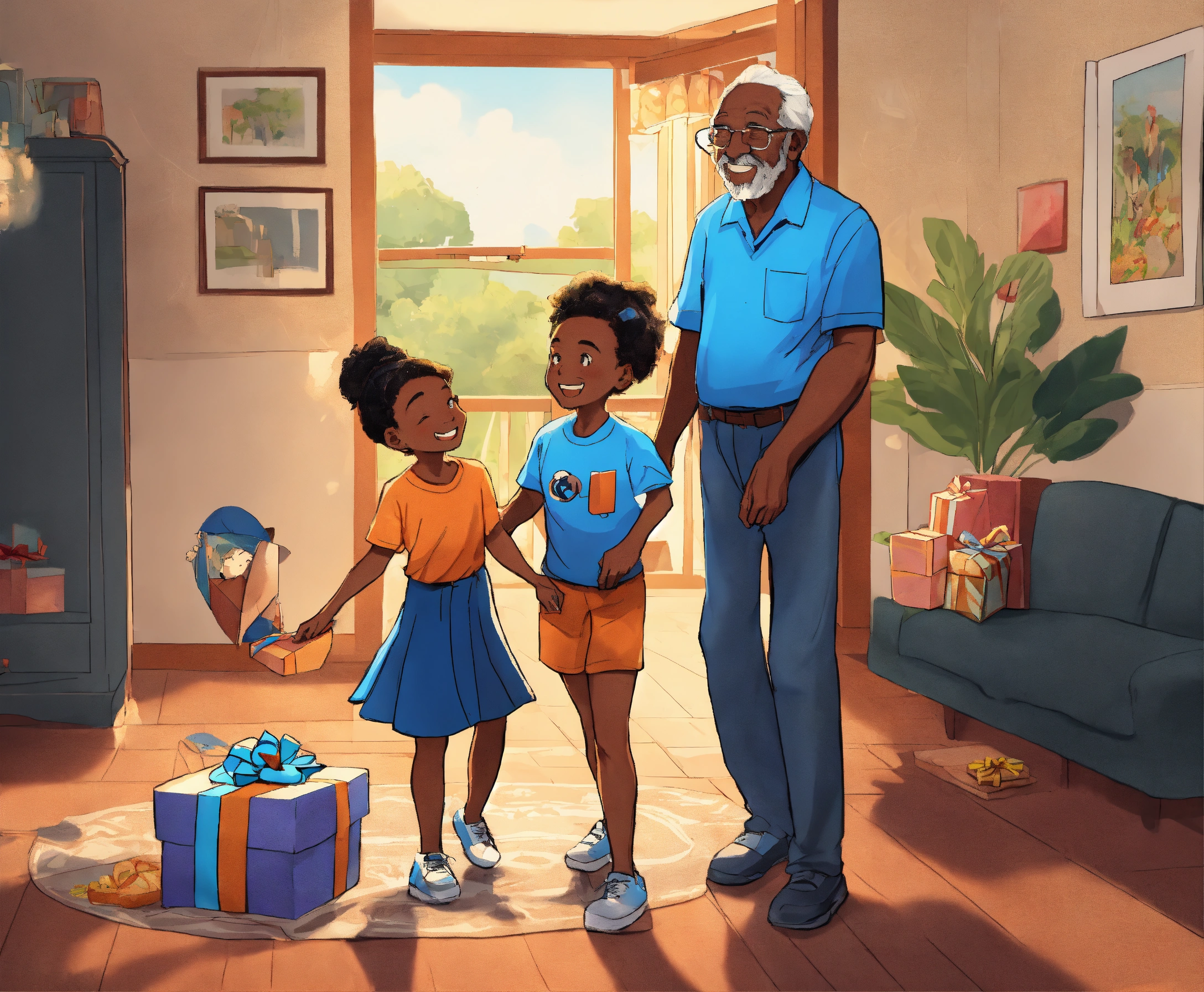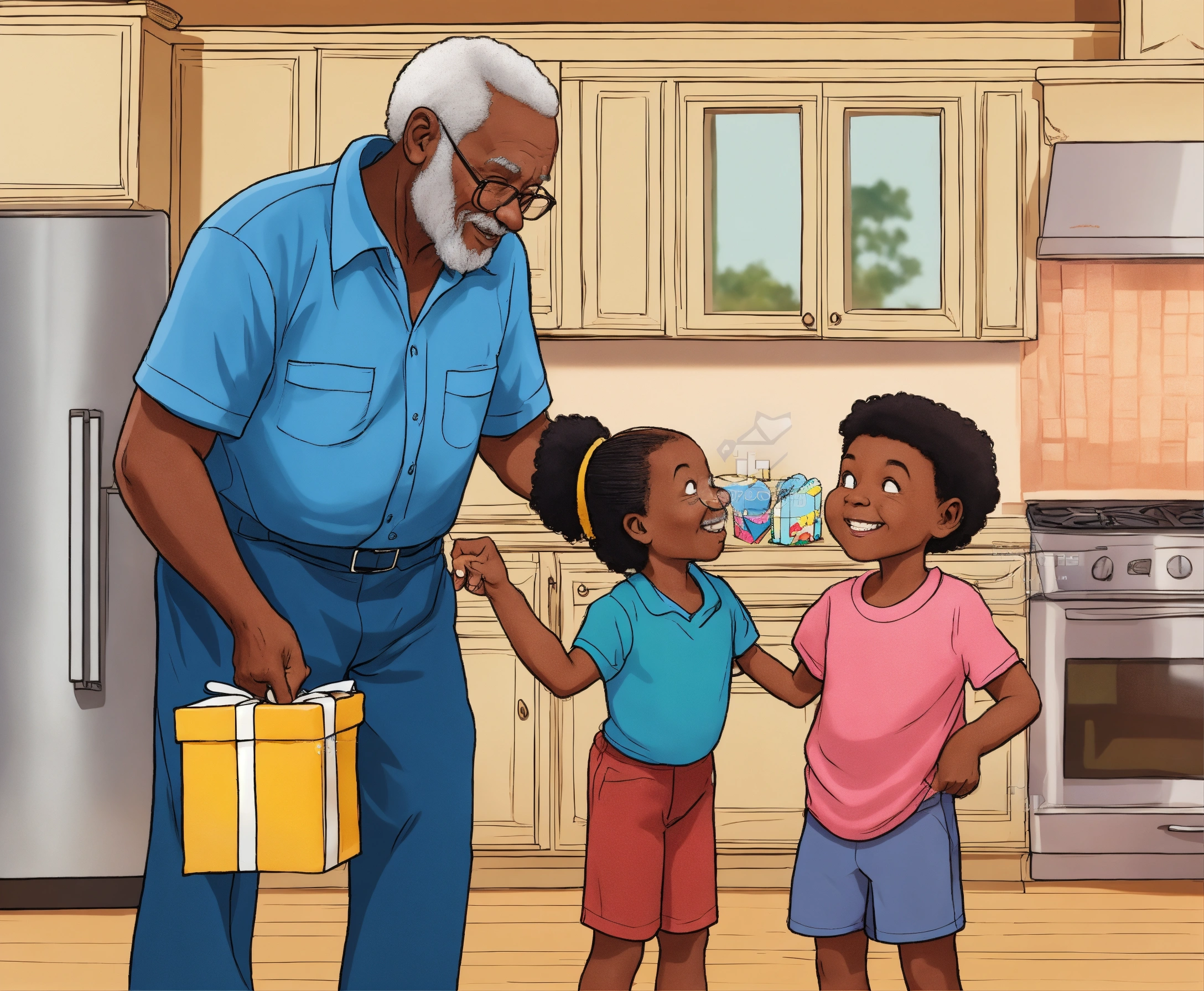 Black elderly cartoon grandpa waring a blue shirt, with son and daughter bring in larger birthday gifts into the house.
