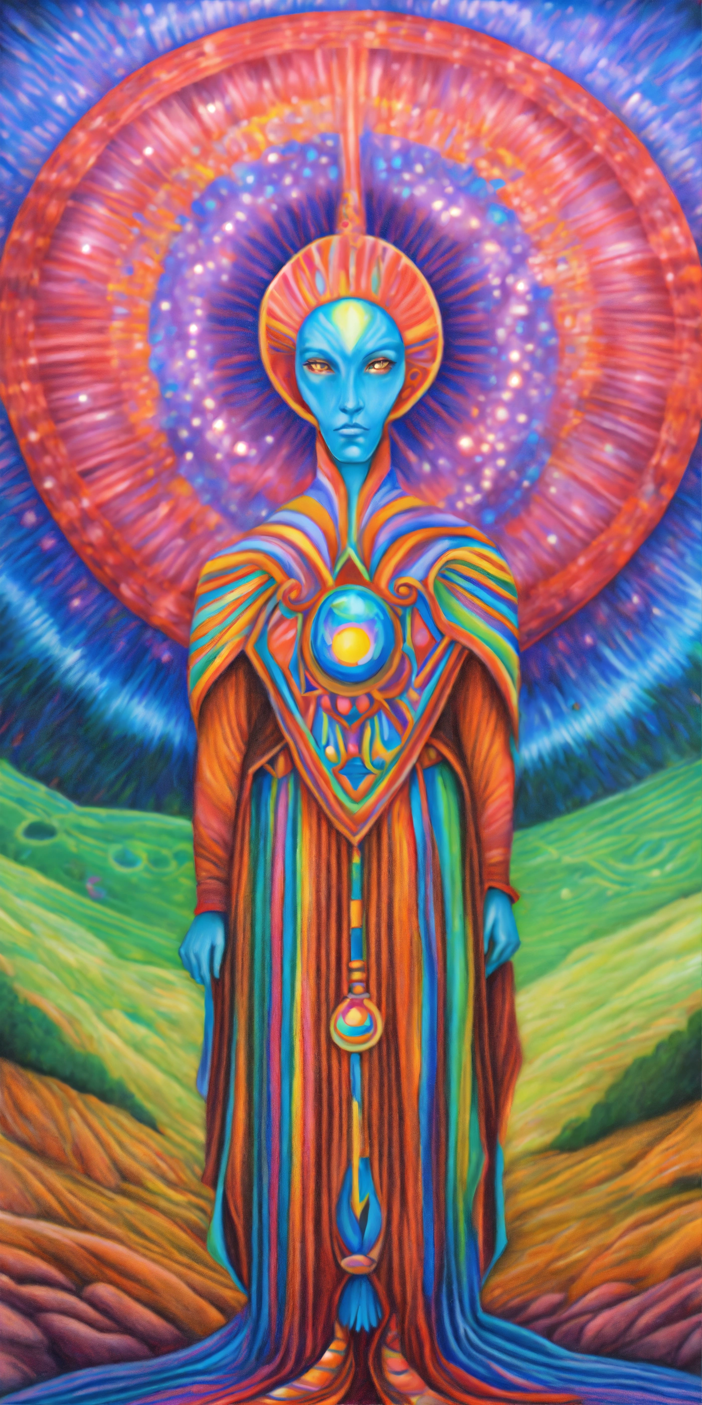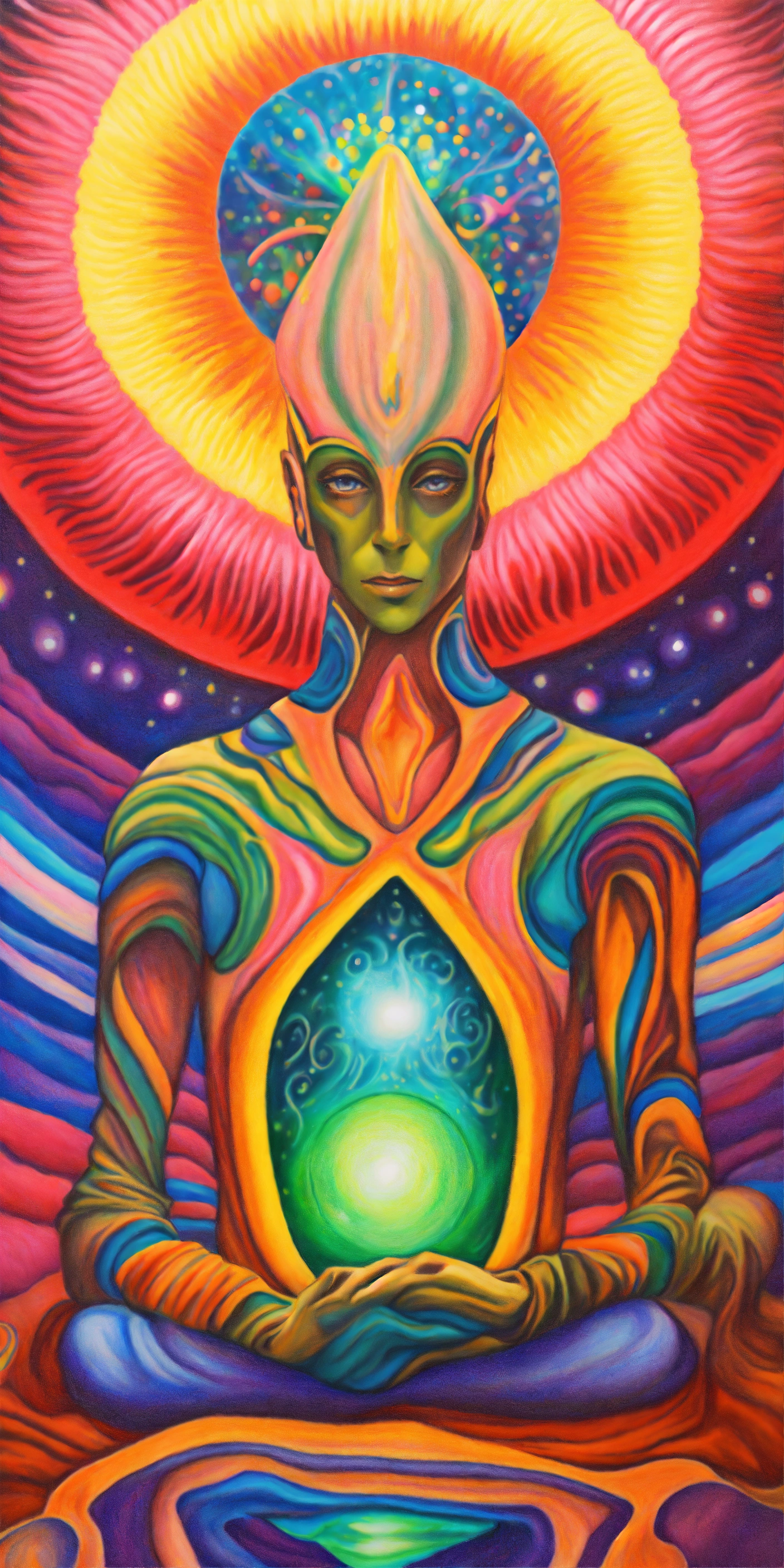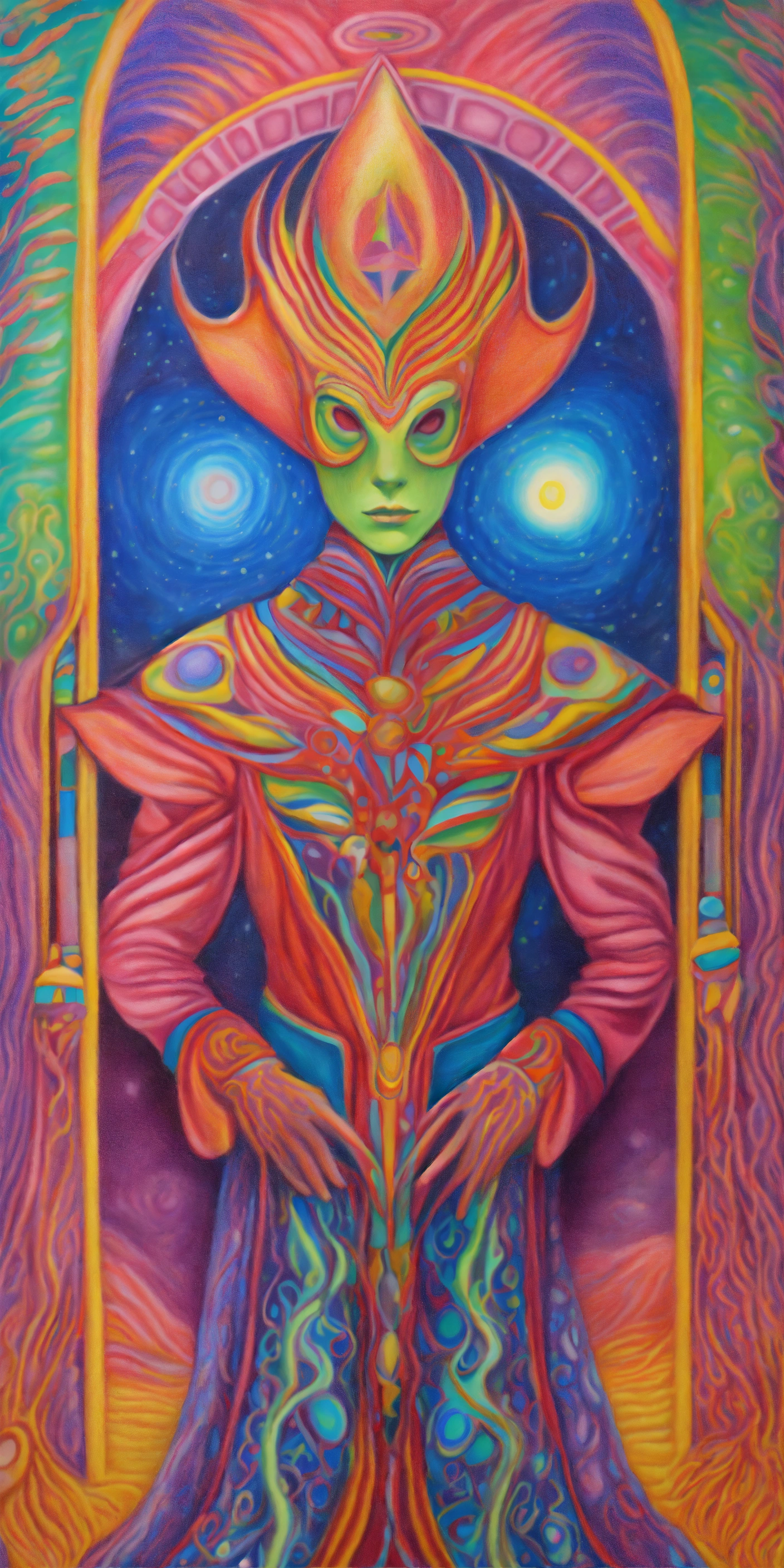 Colored pencil drawing psychedelic painting arcturian multicolored alien magician