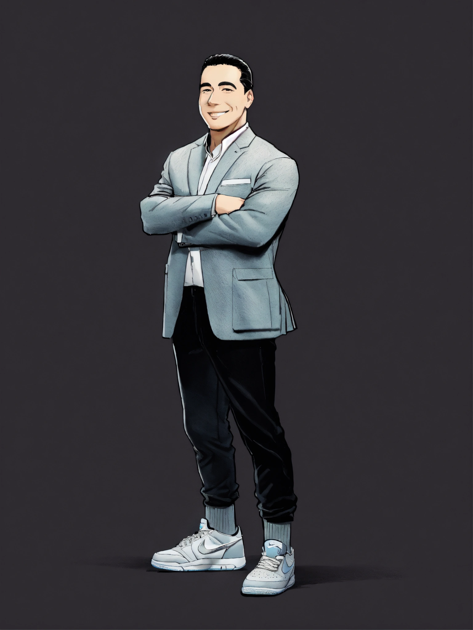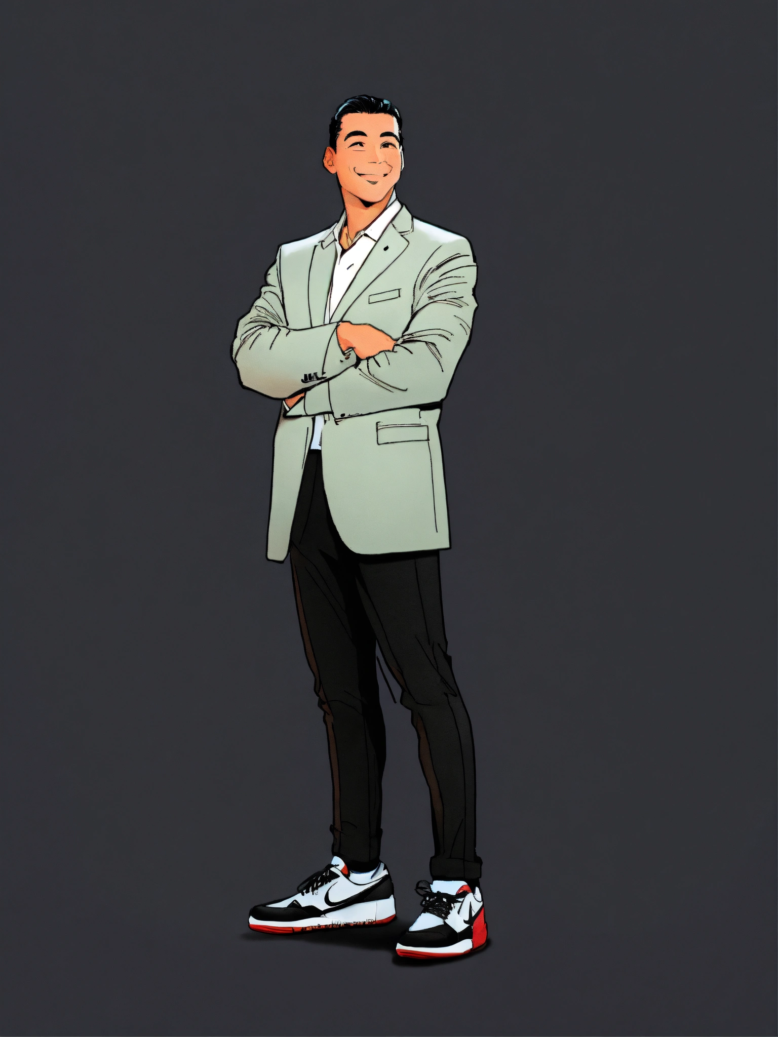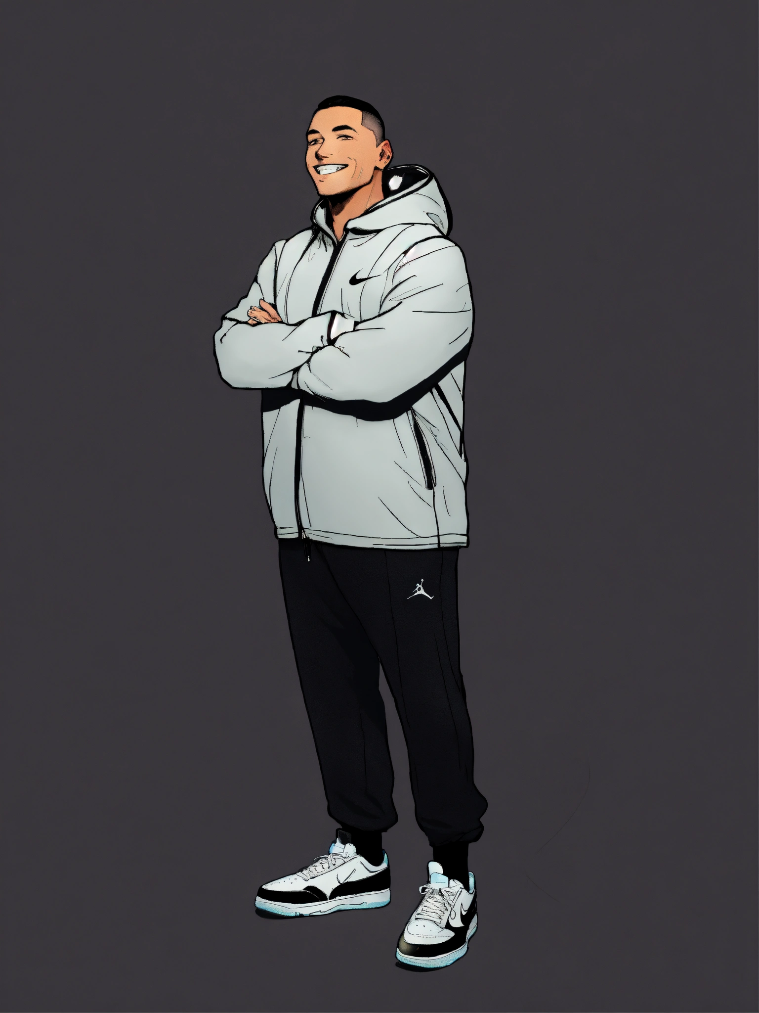 A rounded face ceo standing and smiling wearing black and white nike air jordan, slicked back black hair, illustration by hergé, perfect coloring, 8k