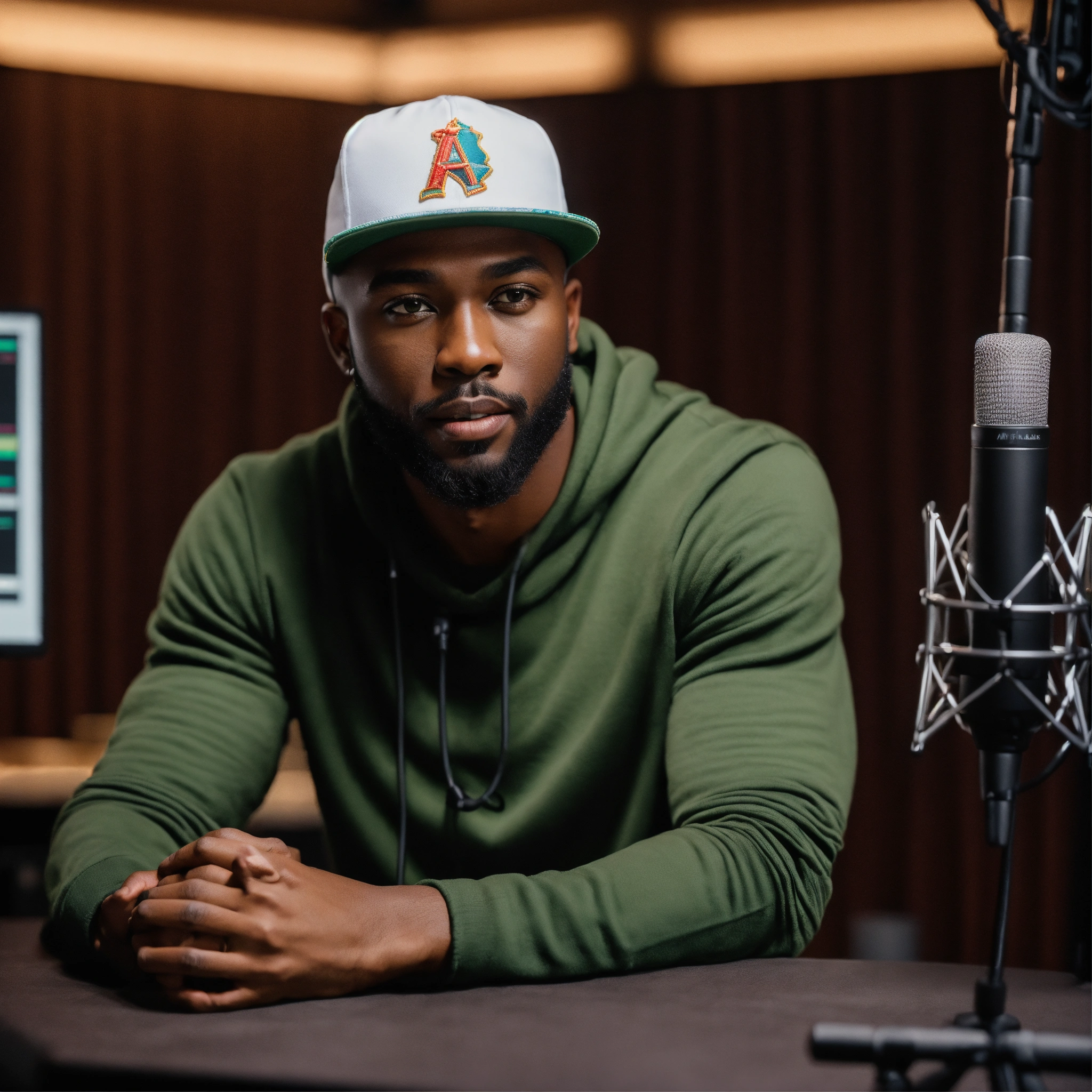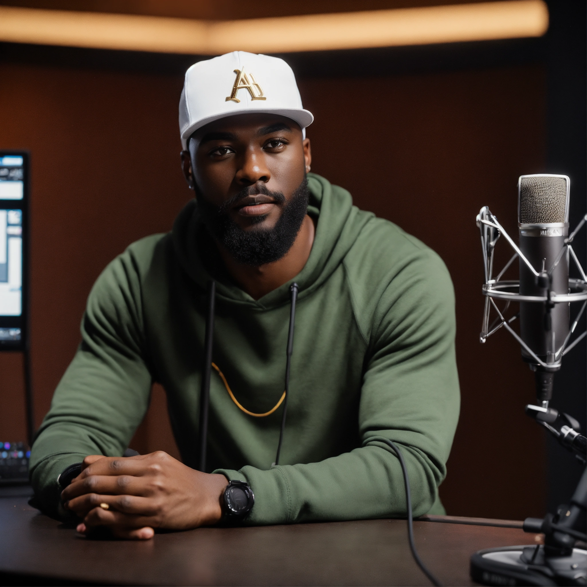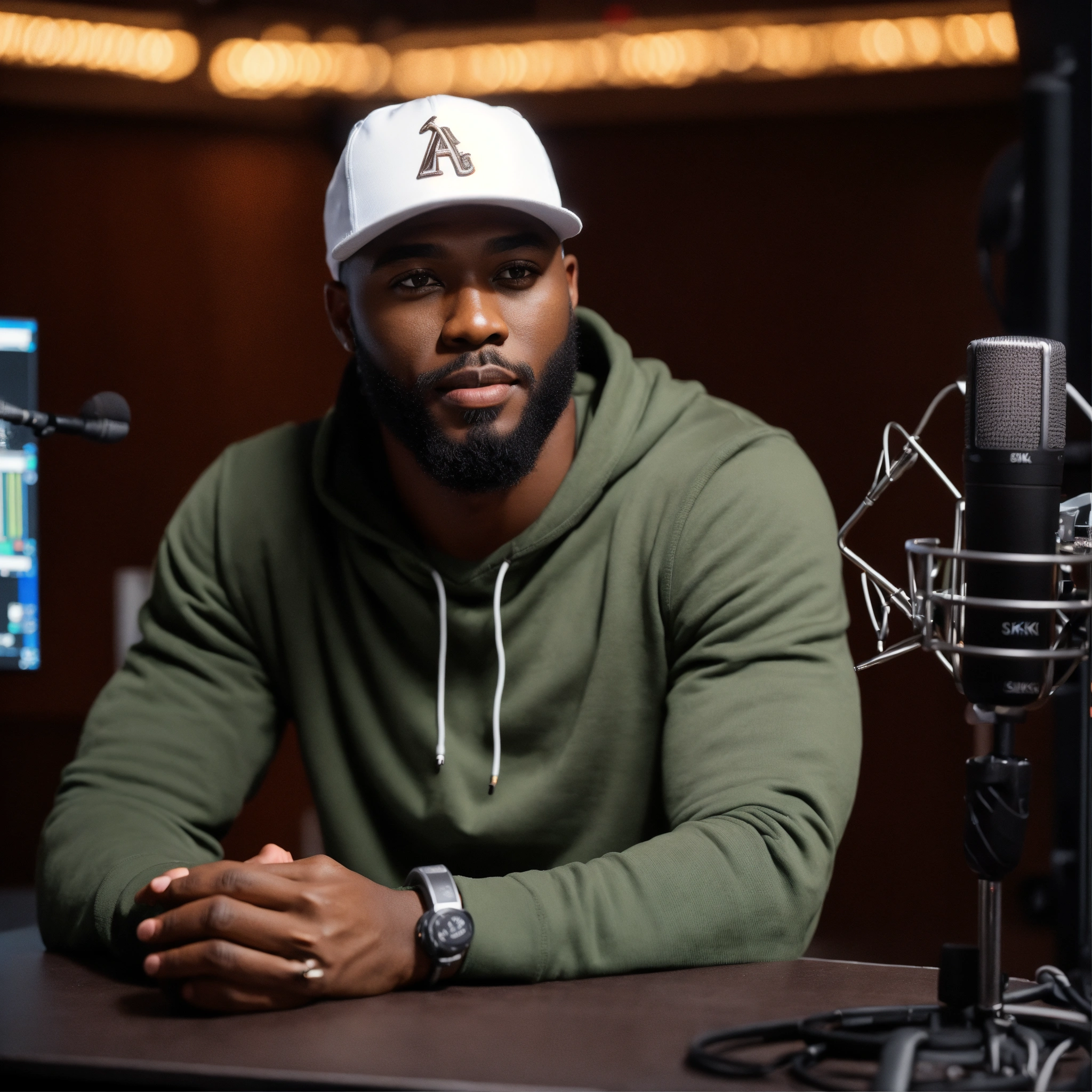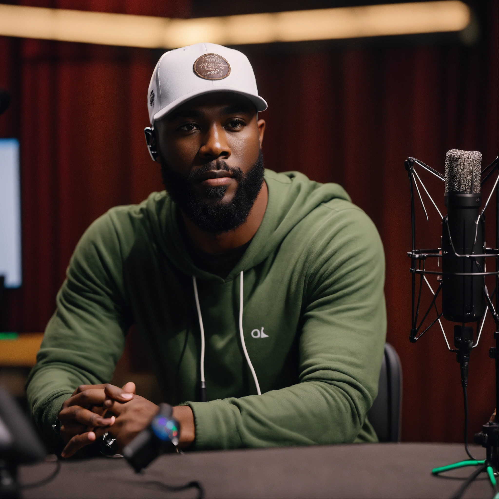 Real photo of a gugu e michaels chocolate dark skin tone handsome black man with beard, bald with white cap, talking into a mic with a short mic stand at a podcast studio, in a very large fancy studio, wearing long sleeve to the writst green sweat shirt and white atlanta sun visor, black jeans, very realistic, ultimate detail, 8k, face front looking straight into the camera, 8k, expensive recording studio with dark brown background, extreme detail, cinematic lighting, face front, brown eyes looking at camera.