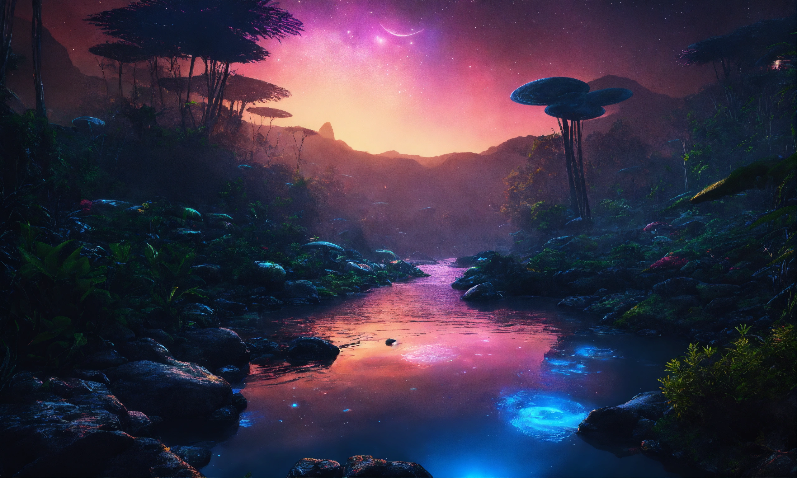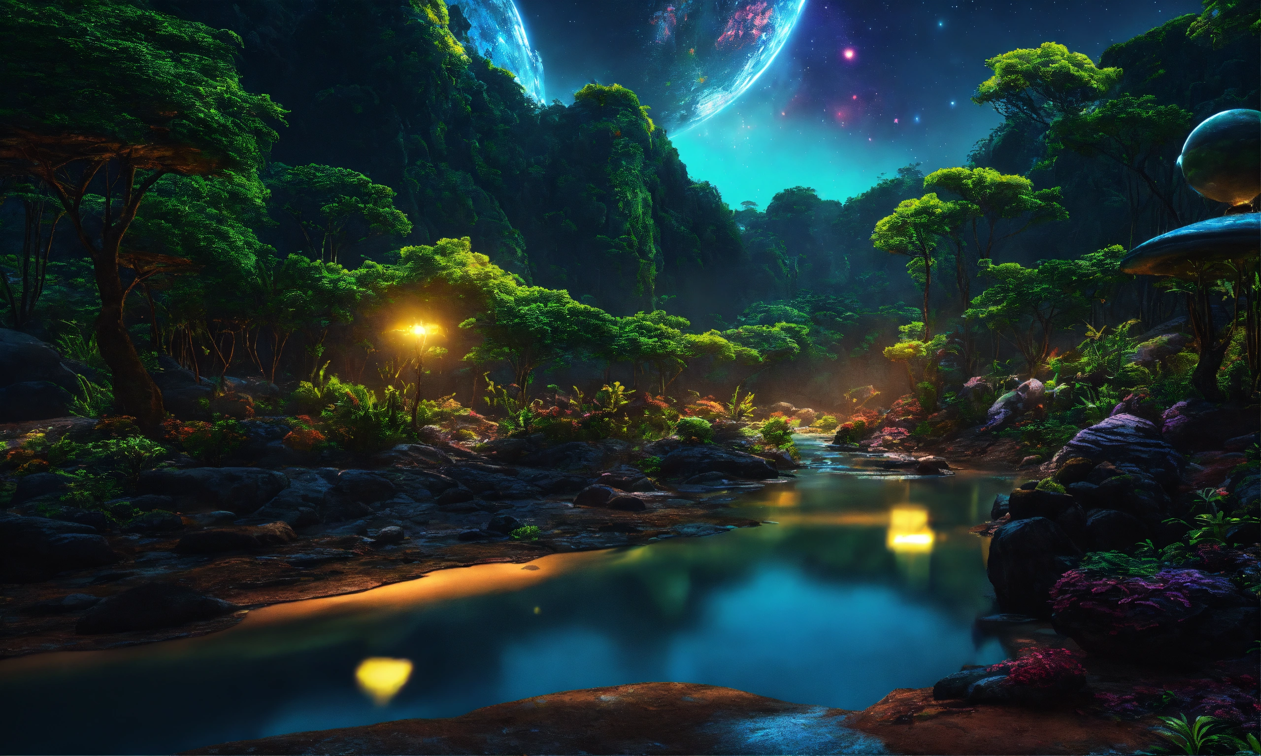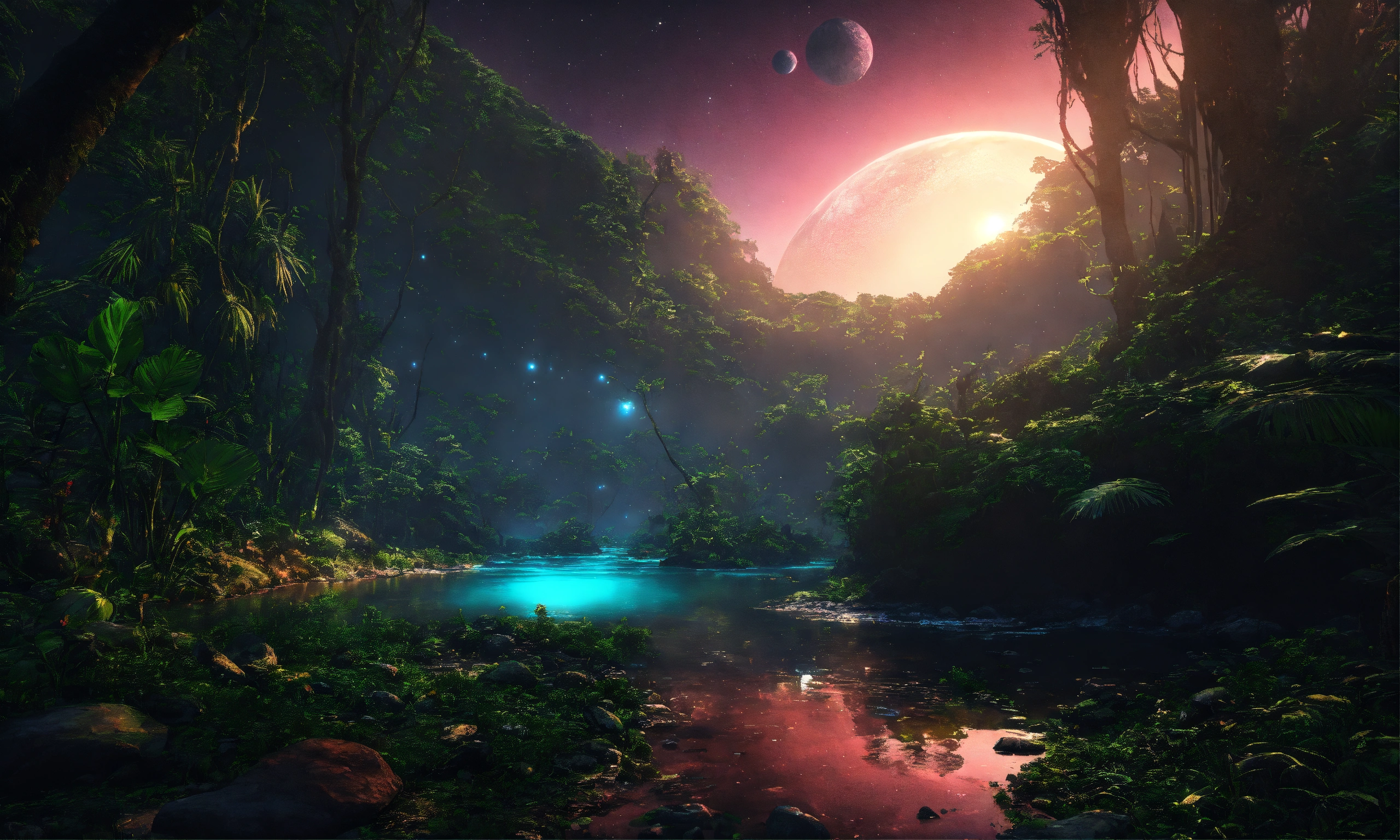 Draw a award winning photograph of a alien planet jungle with a river during a dark gloomy night with stars, 8k, 3d, hyper realistic, insane detail, colorful, surreal, dream-like, beautiful, fantasy, immersive, intense shadows, eerie