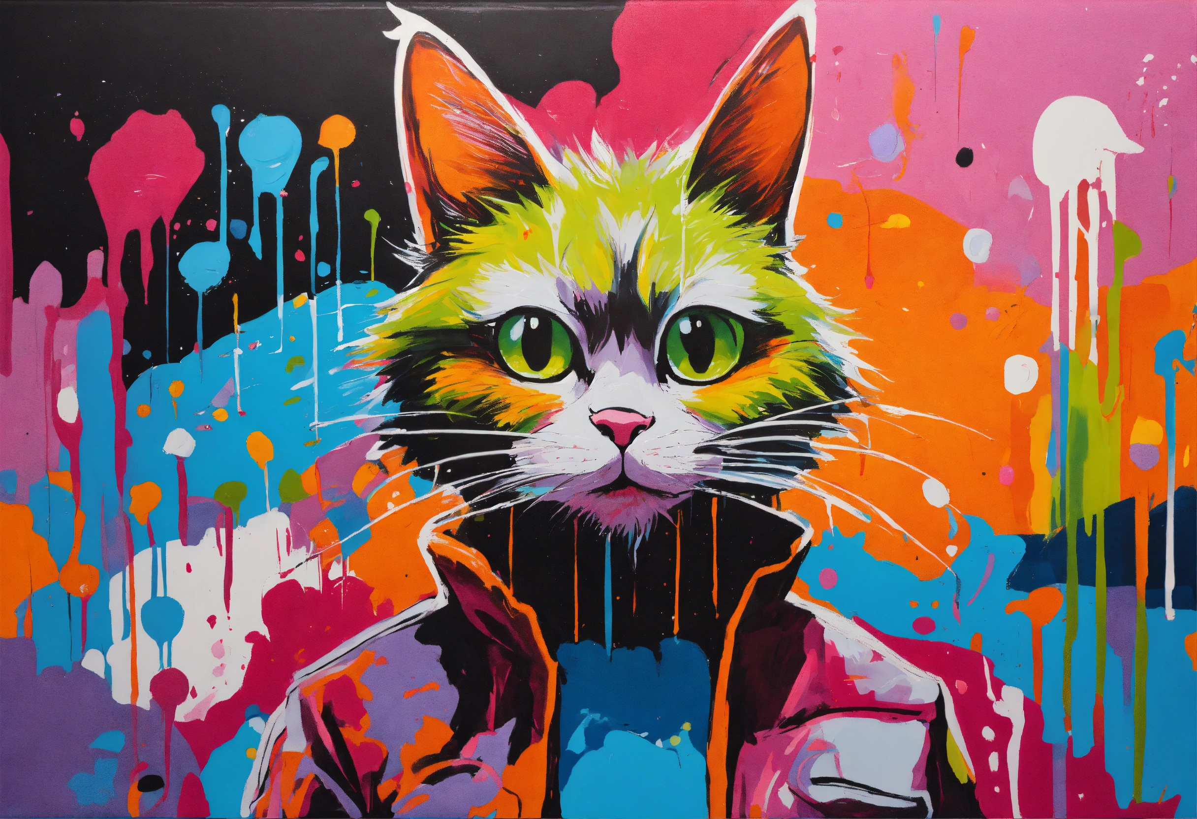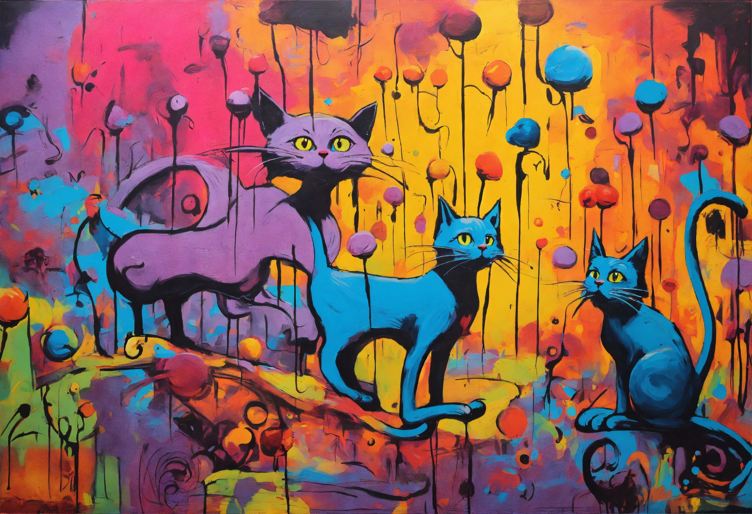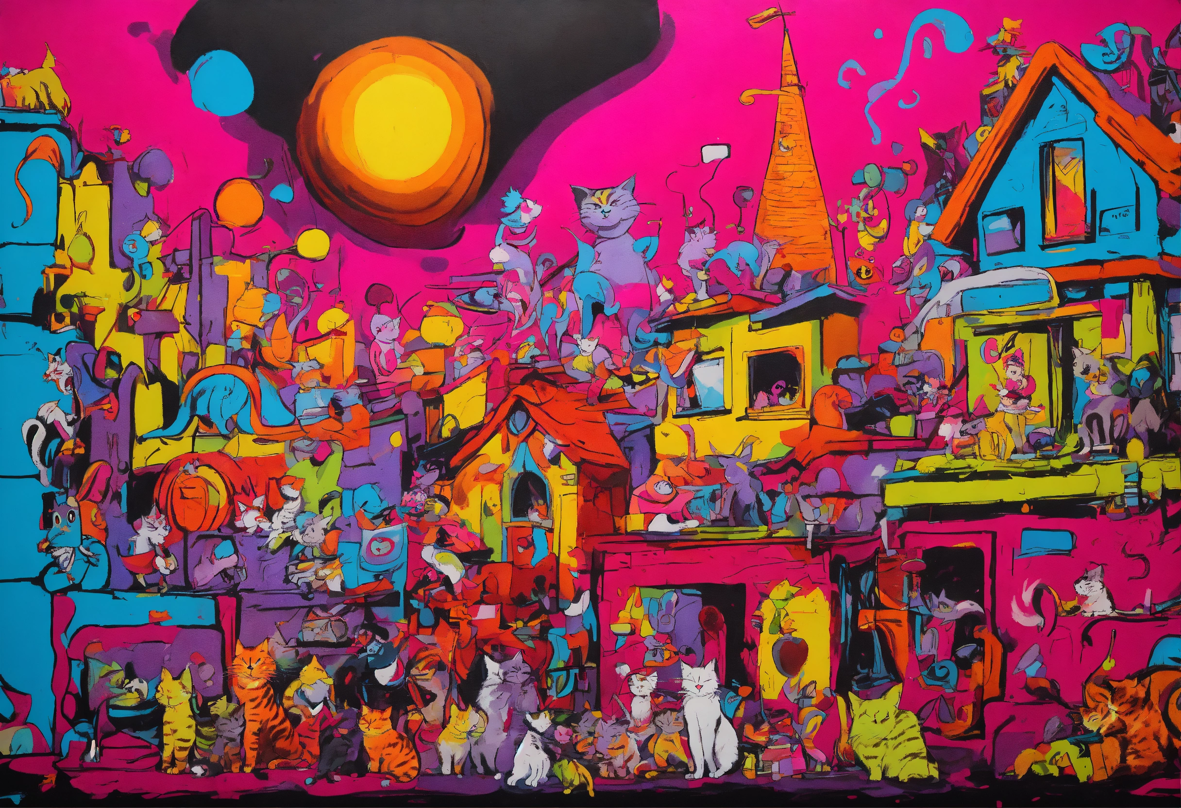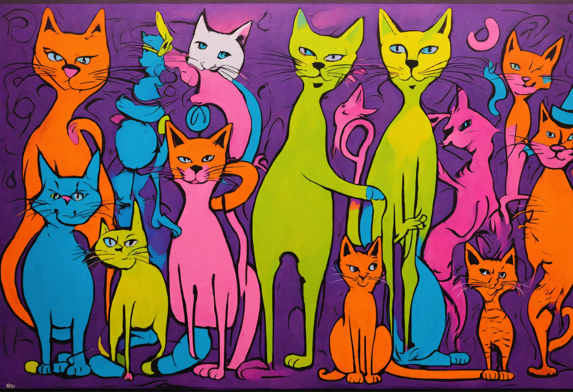 Blend the art of dr seuss characters and neo expressionism graffiti as an acrylic painting with only black, orange, hot pink, yellow, neon green, lilac, maroon, bably blue, and white create a cat world