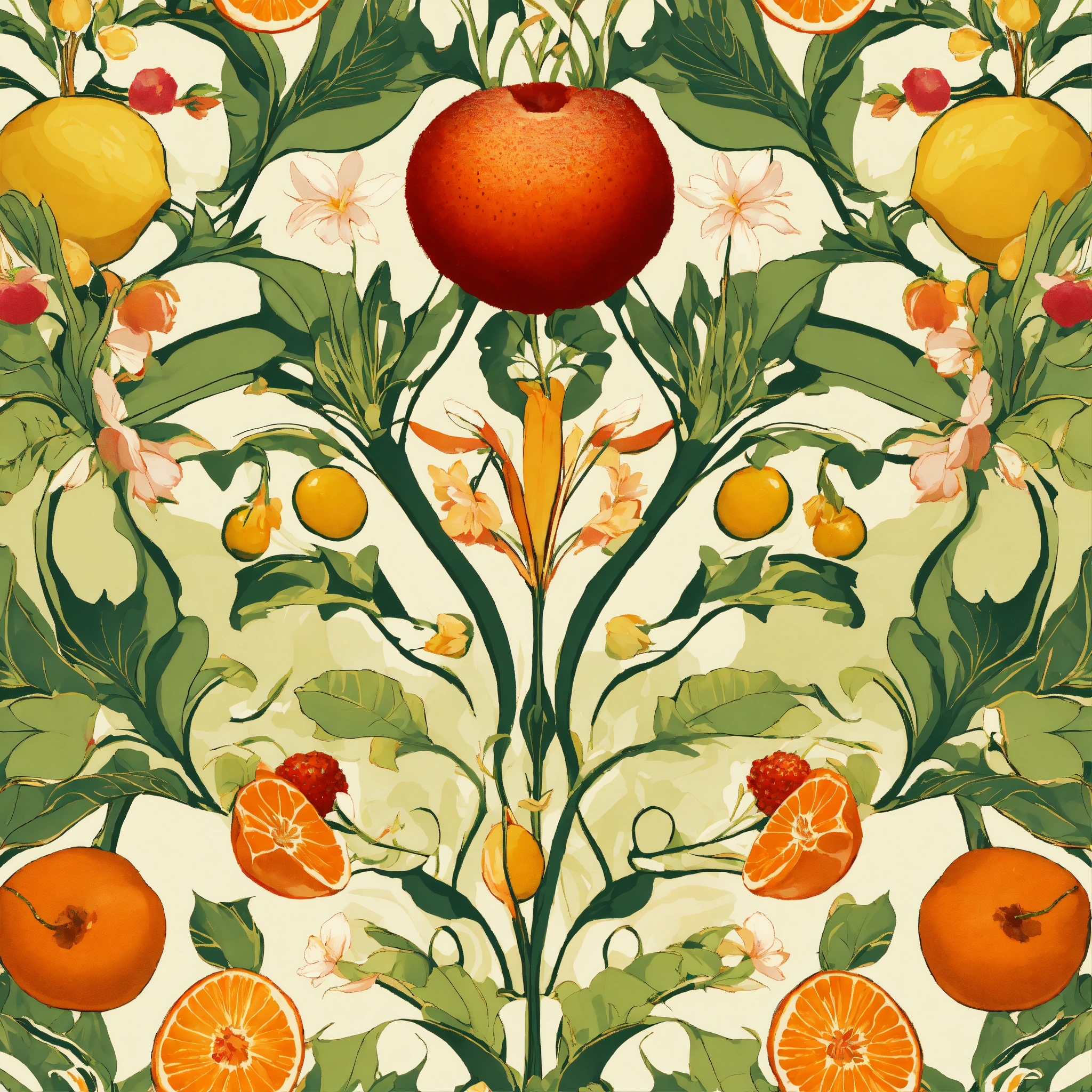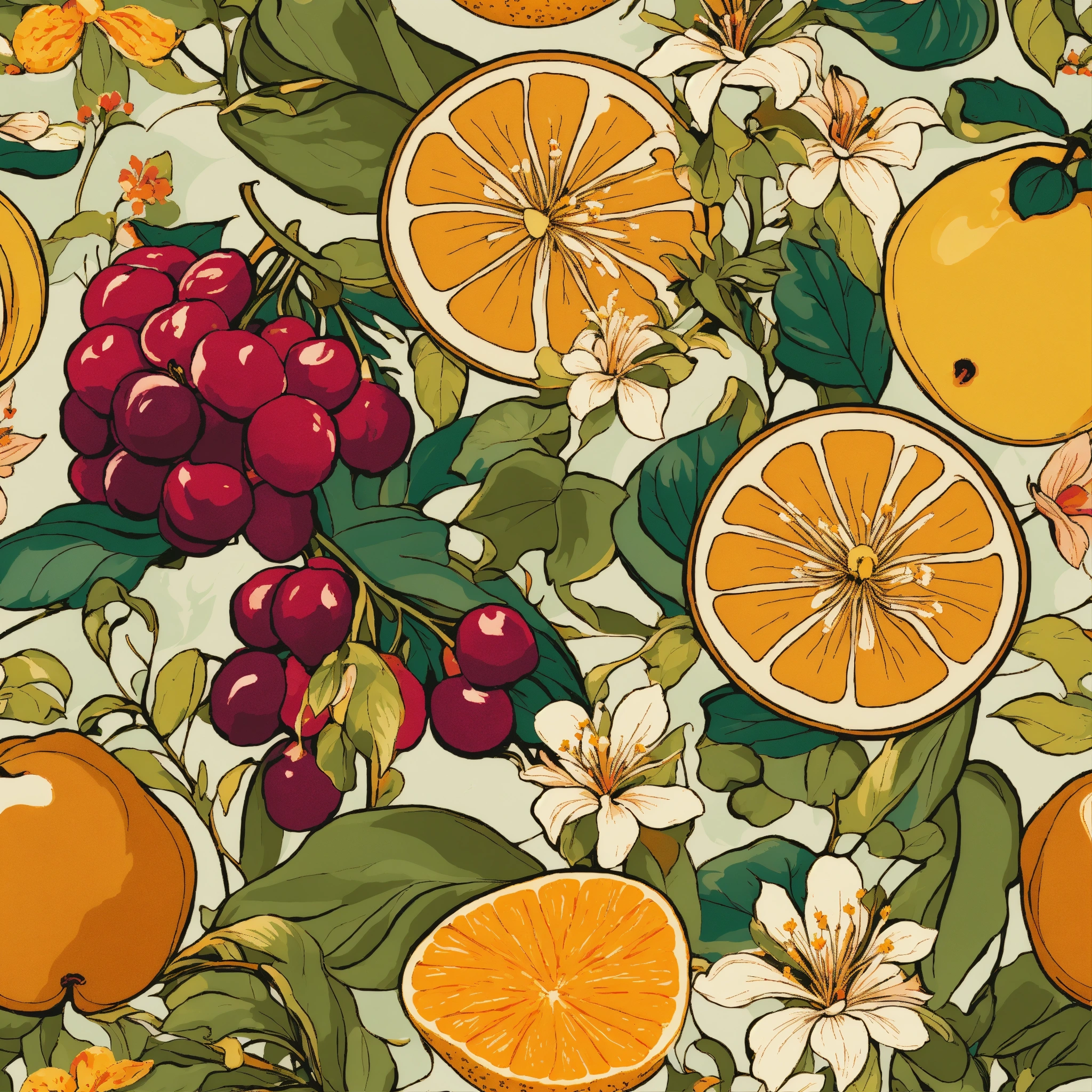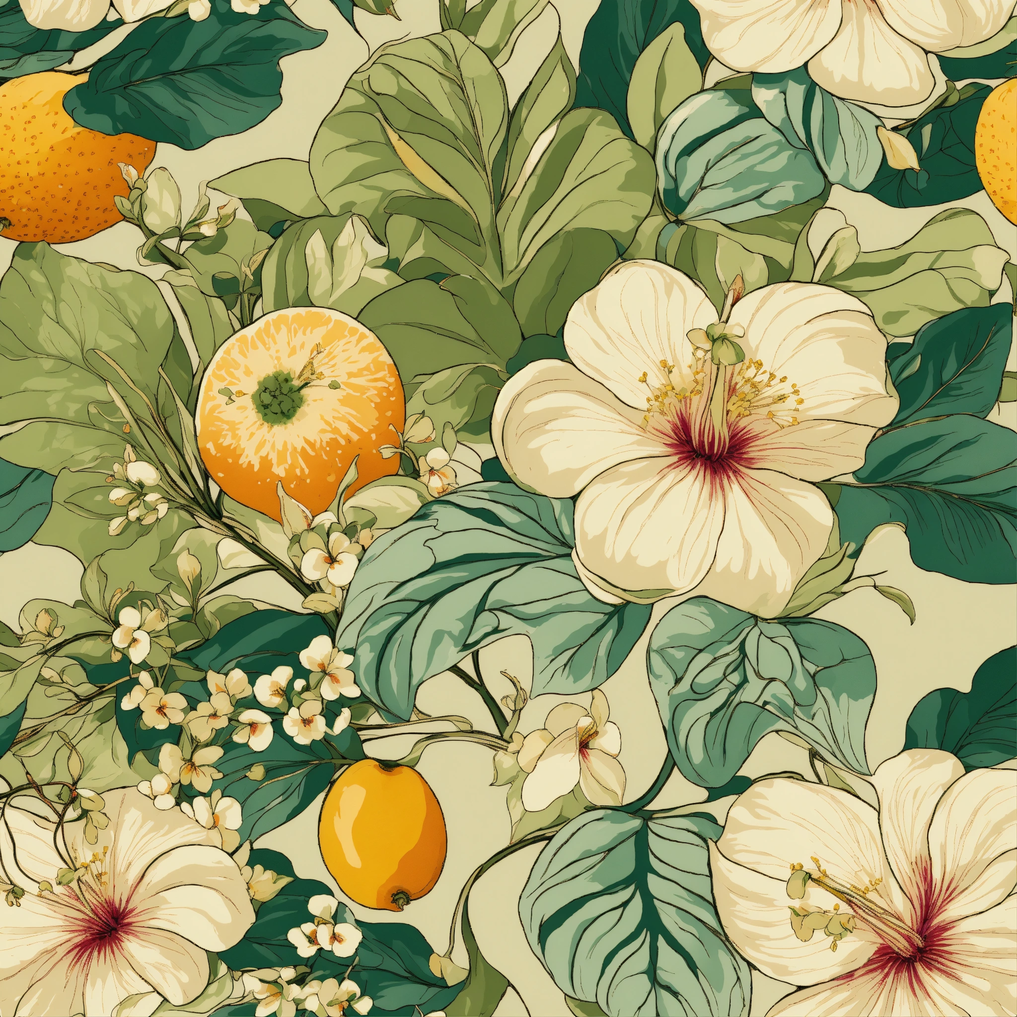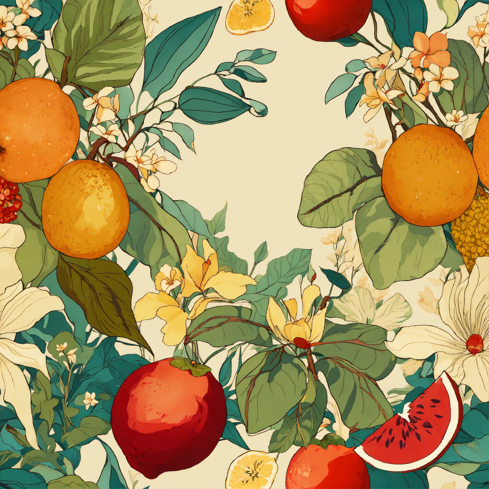Create a stylistic art nouveau inspired pattern with a variety of tropical and summer fruits with winter blooming florals suitable for stationary design elements and motifs, light creamy background