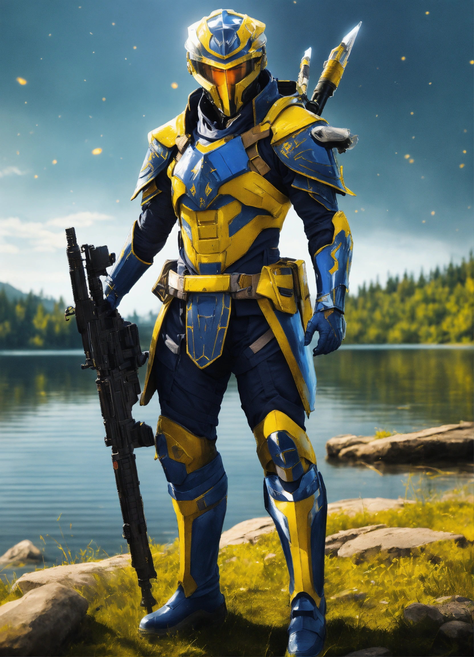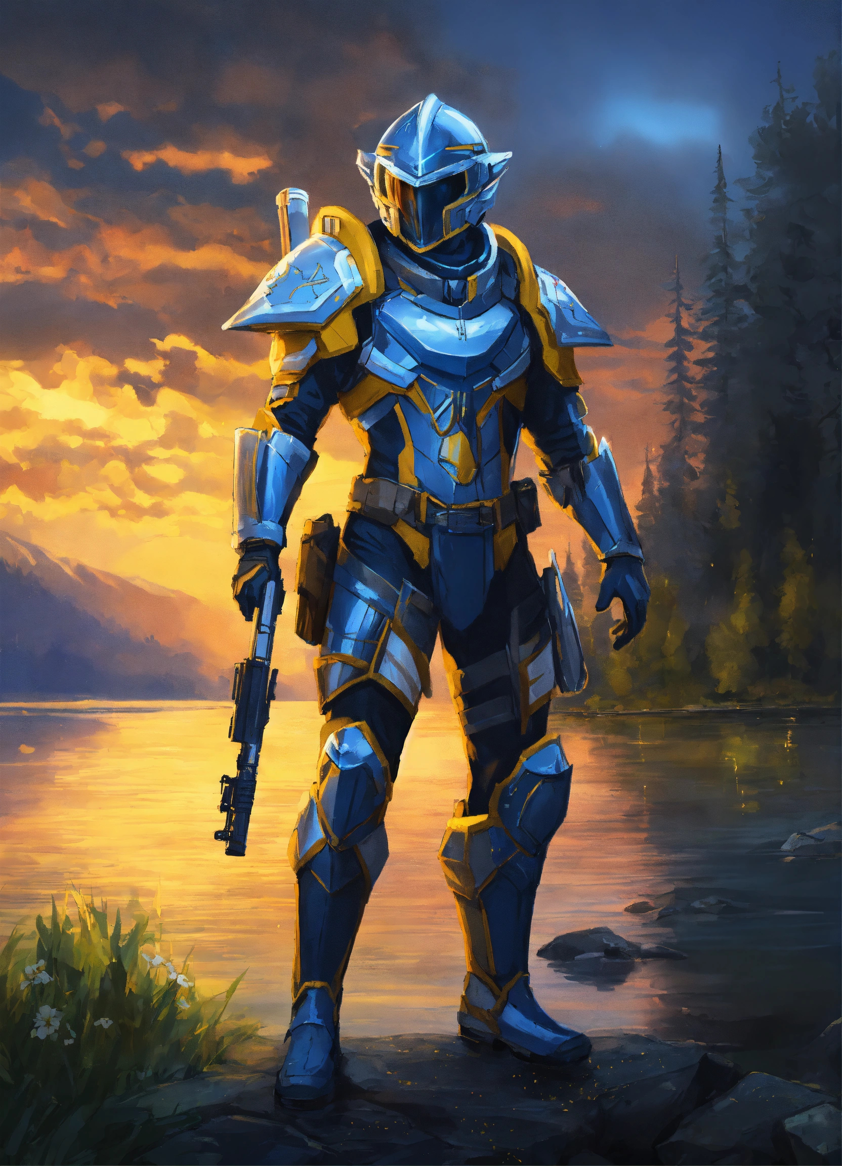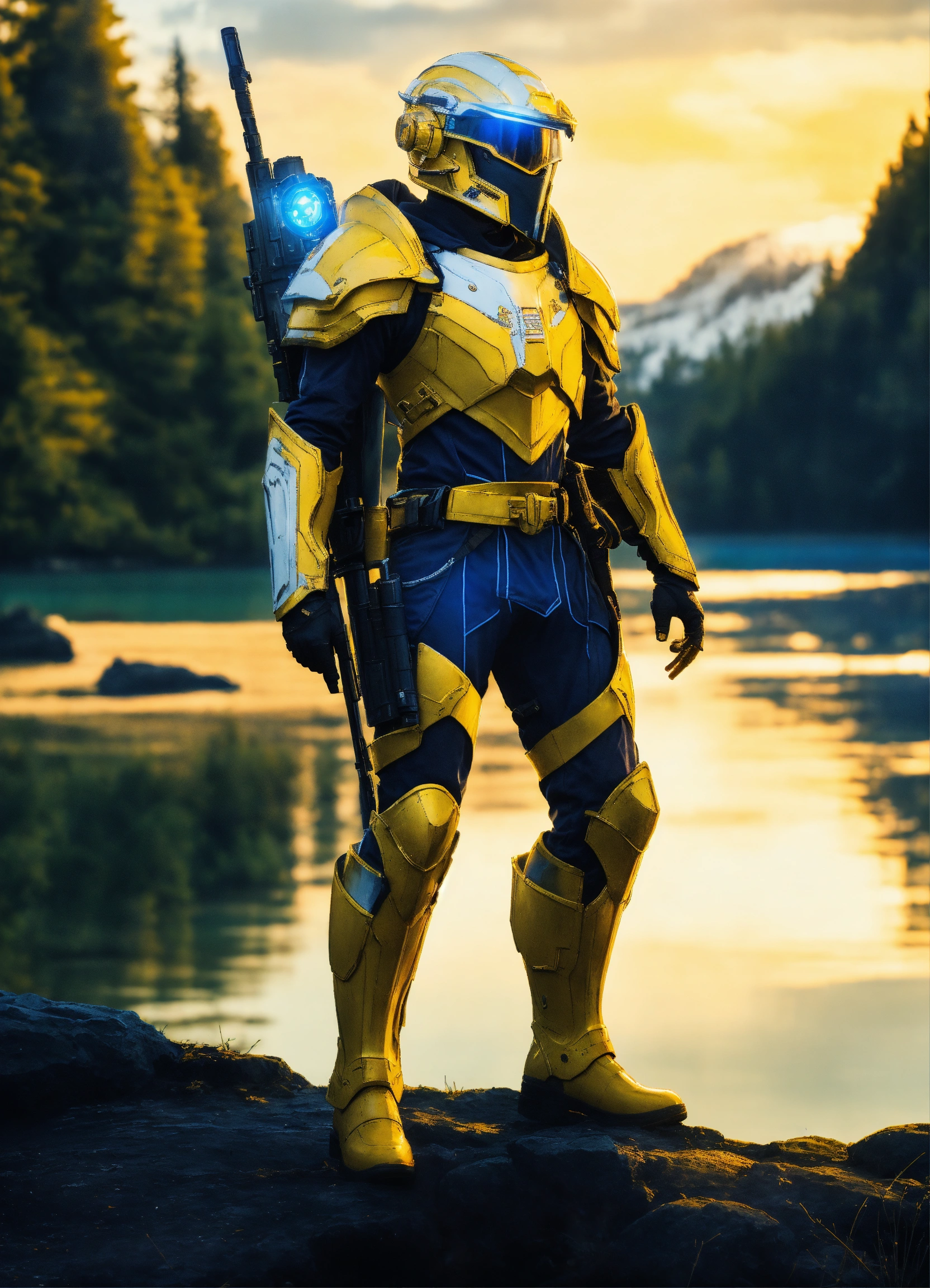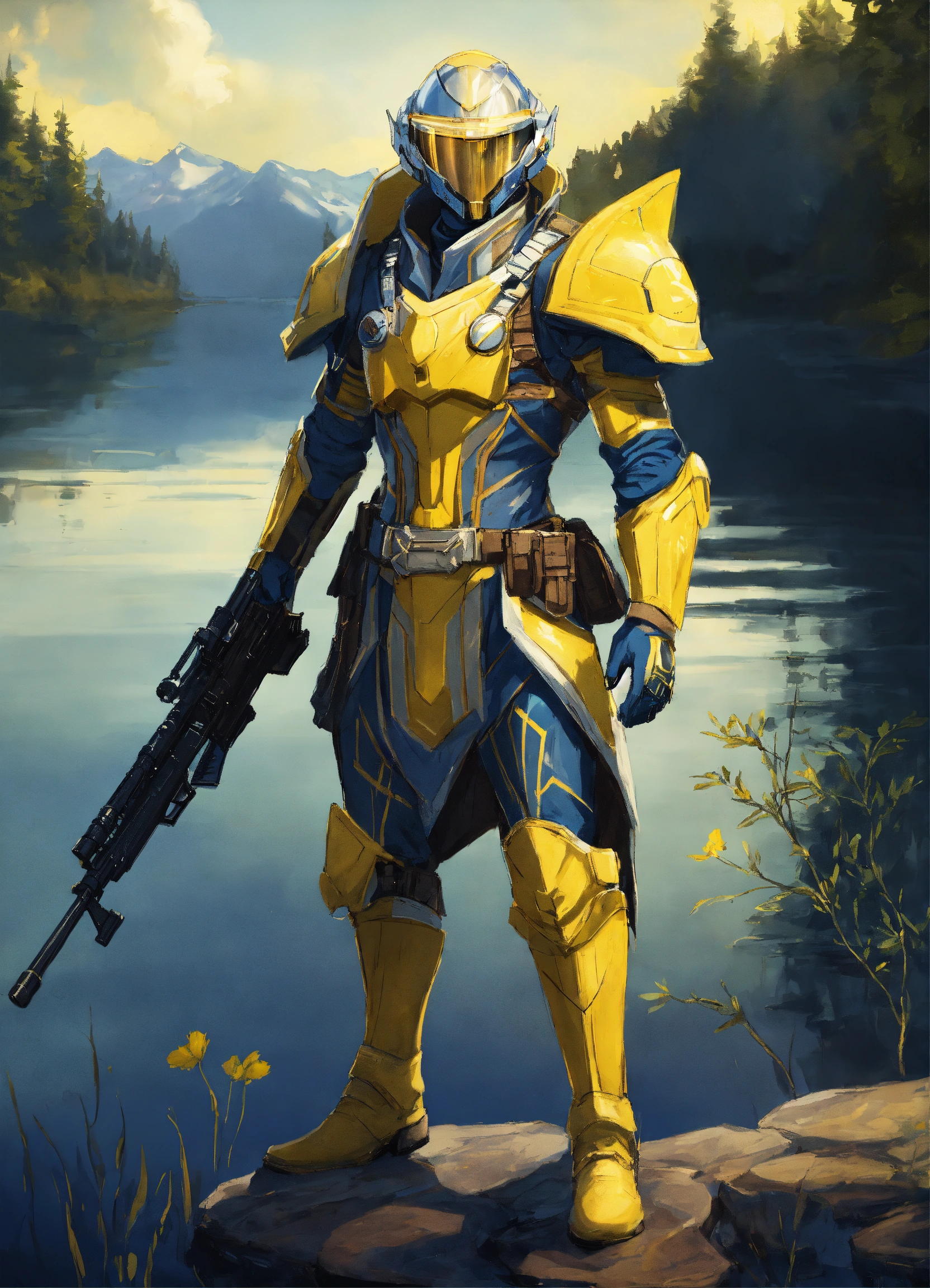 Epic drawing of a full body of a high elf sci fi soldier wearing sci fi armor, navy blue and yellow and white sci fi armor and helmet, visor, boots, male, holding a light machine gun, standing by a lake