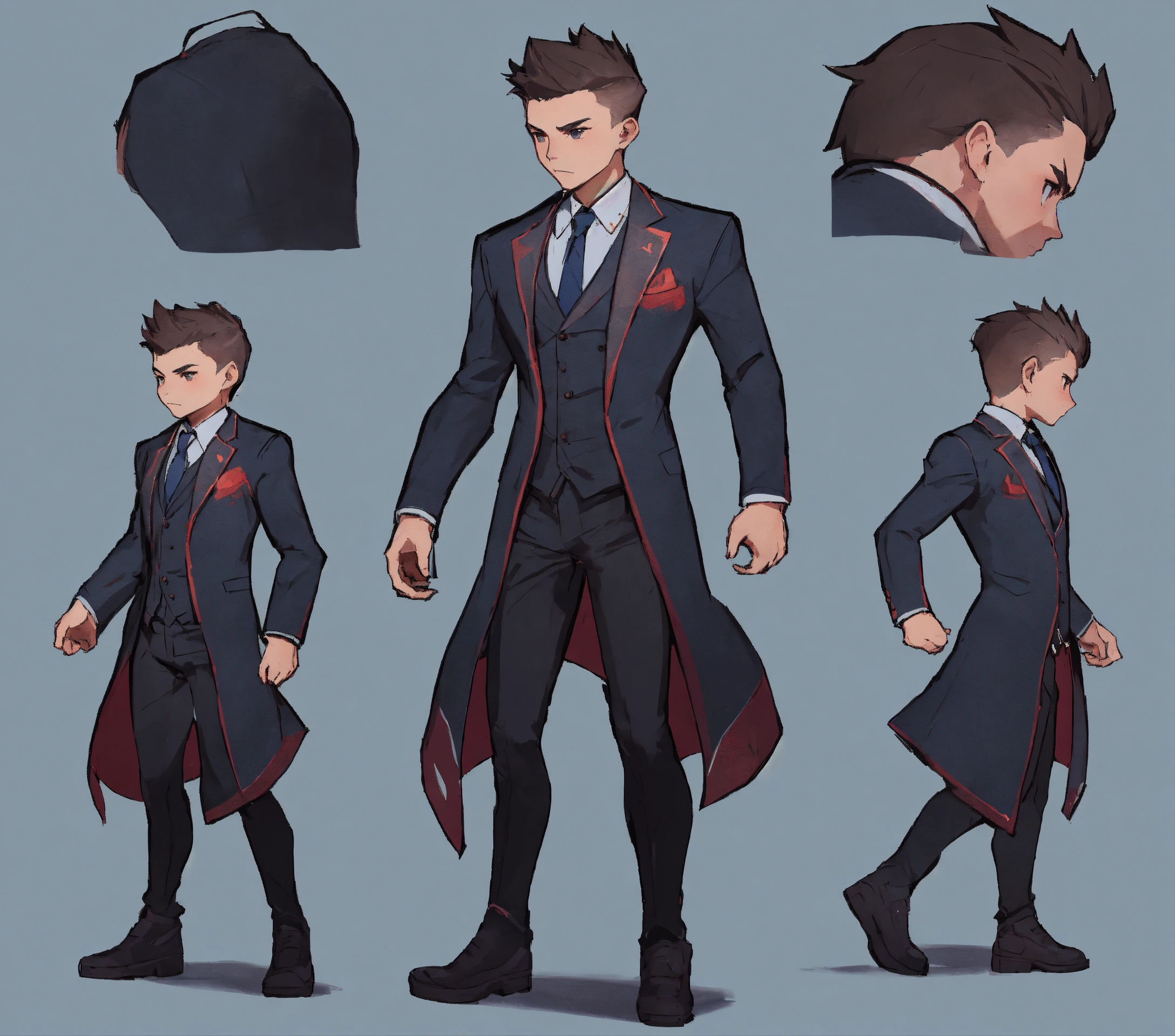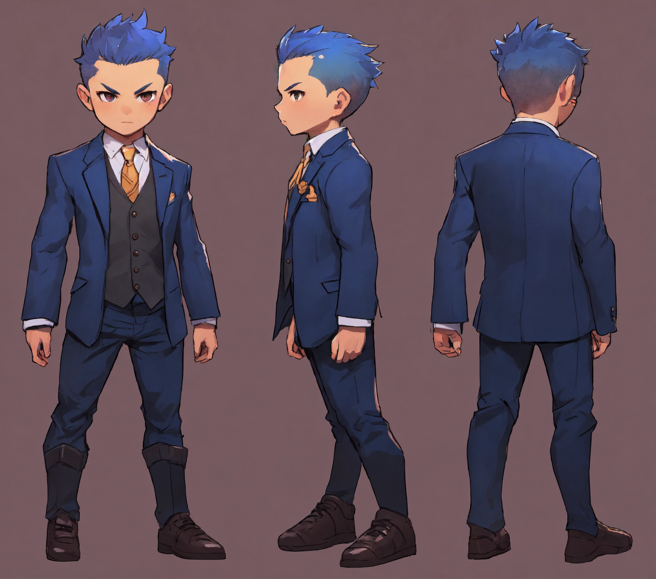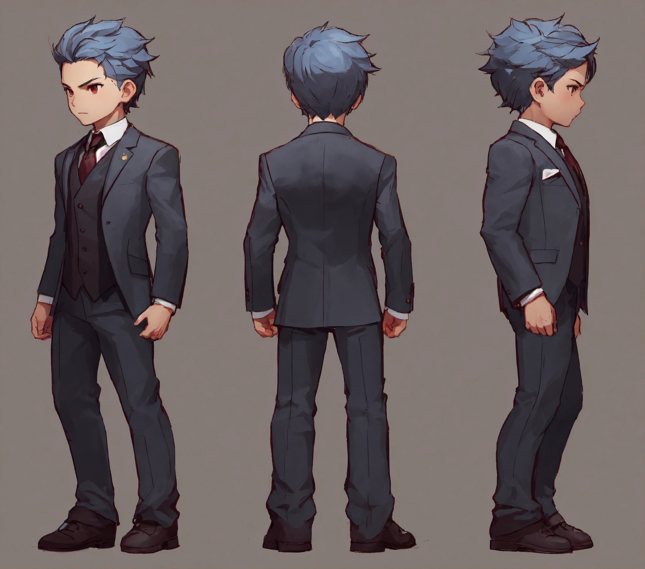 Game assets, concept art, boy, walking, suit, evil, sideview, full body view, blank background, artstyle from the ragnarok, chibi proportions