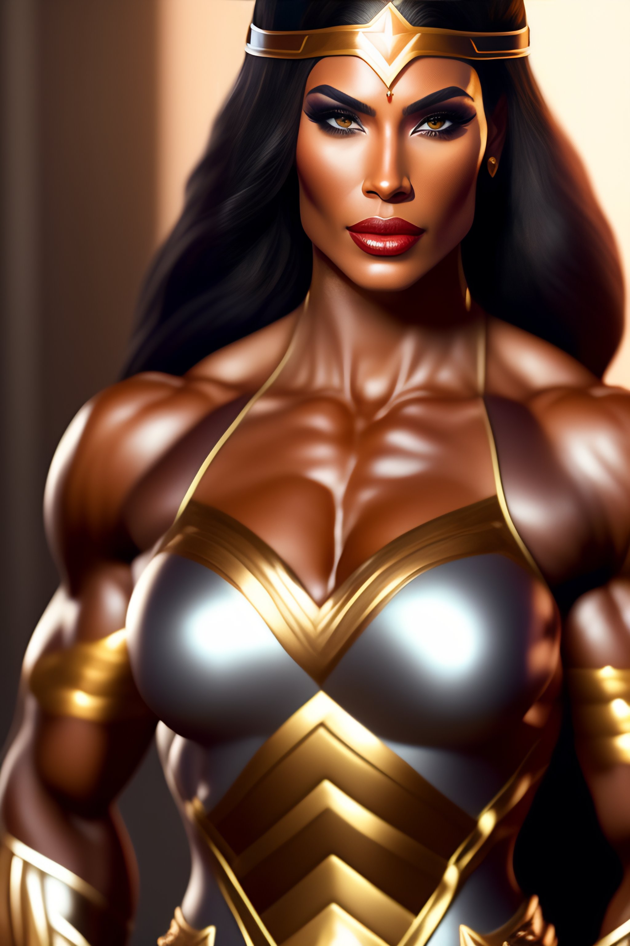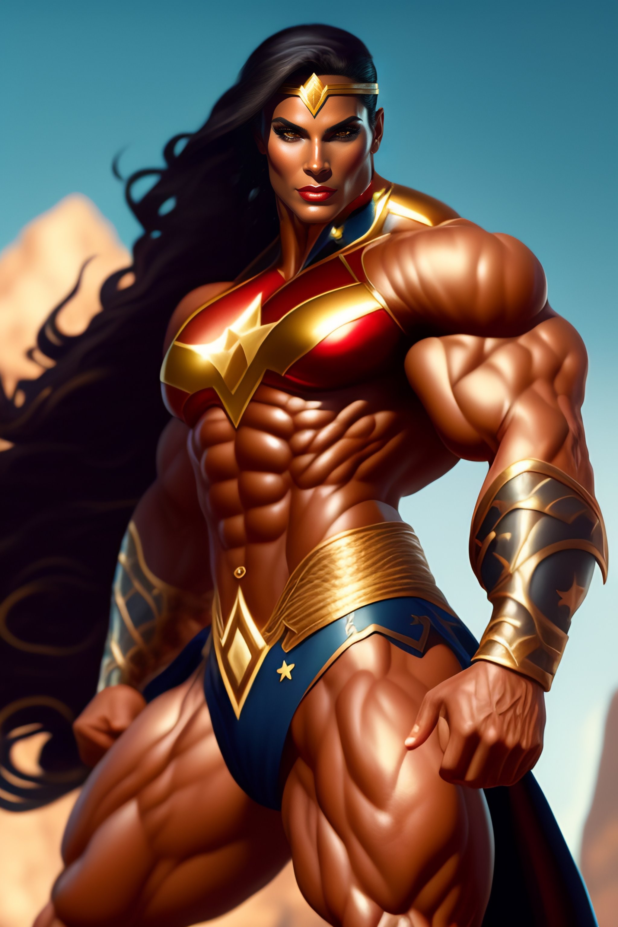 Full body portrait of tanned man as skinny muscular wonder woman, middle shot, digital art, highly detailed, intricate, sharp focus, trending on artstation, hq, unreal engine 5, 4k uhd image, by brom, loish, artgerm, face by otto schmidt