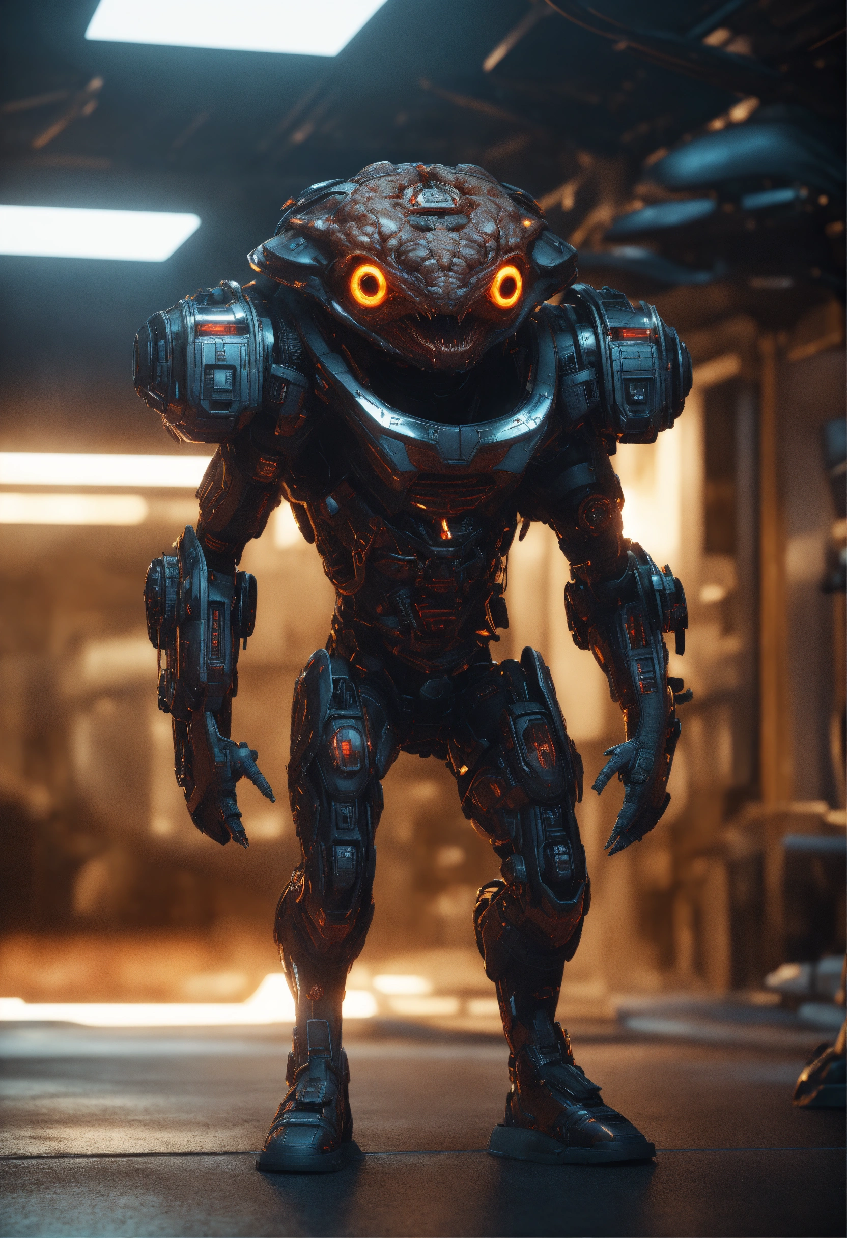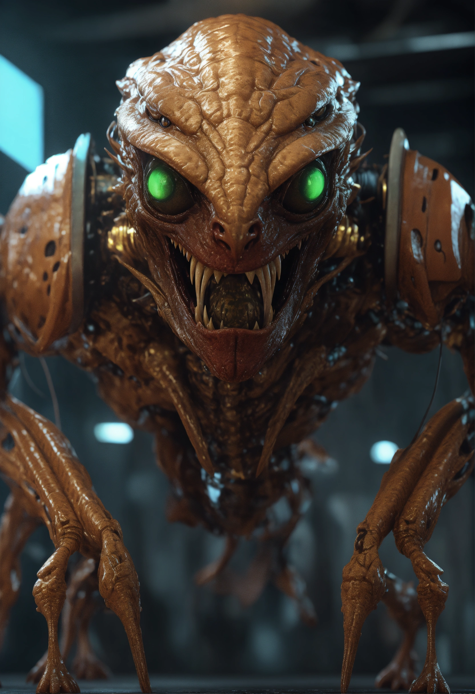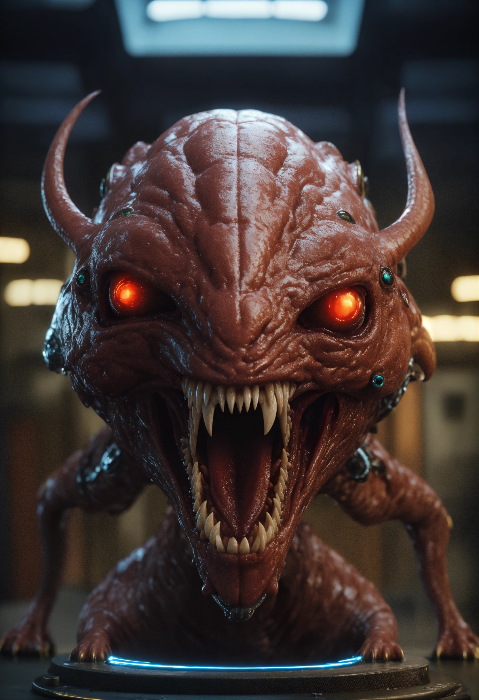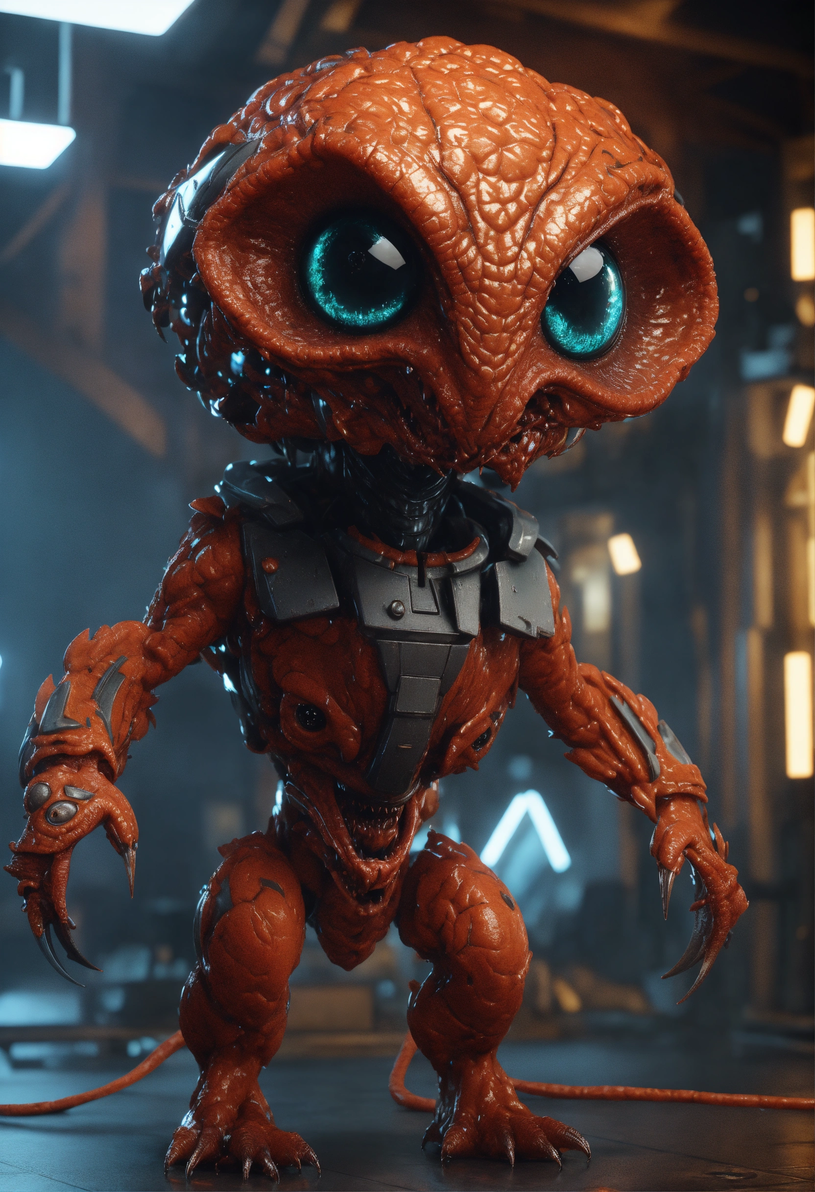 3d render, 3d, best quality, unreal engine, sci-fi creature, staring down and to the right, sci-fi, pulp, excited, aroused, full body image, lustful, hungry, predatory, bizarre, evil smile, wicked grin, horny, big eyes, looking towards center of frame, brilliant, brain, mastermind