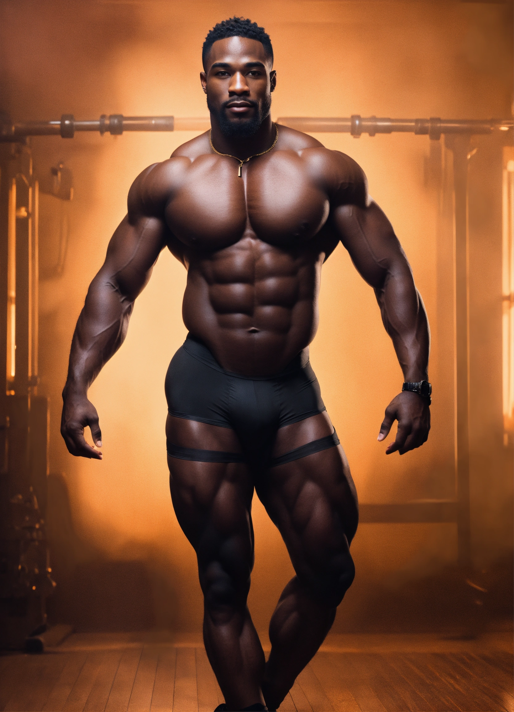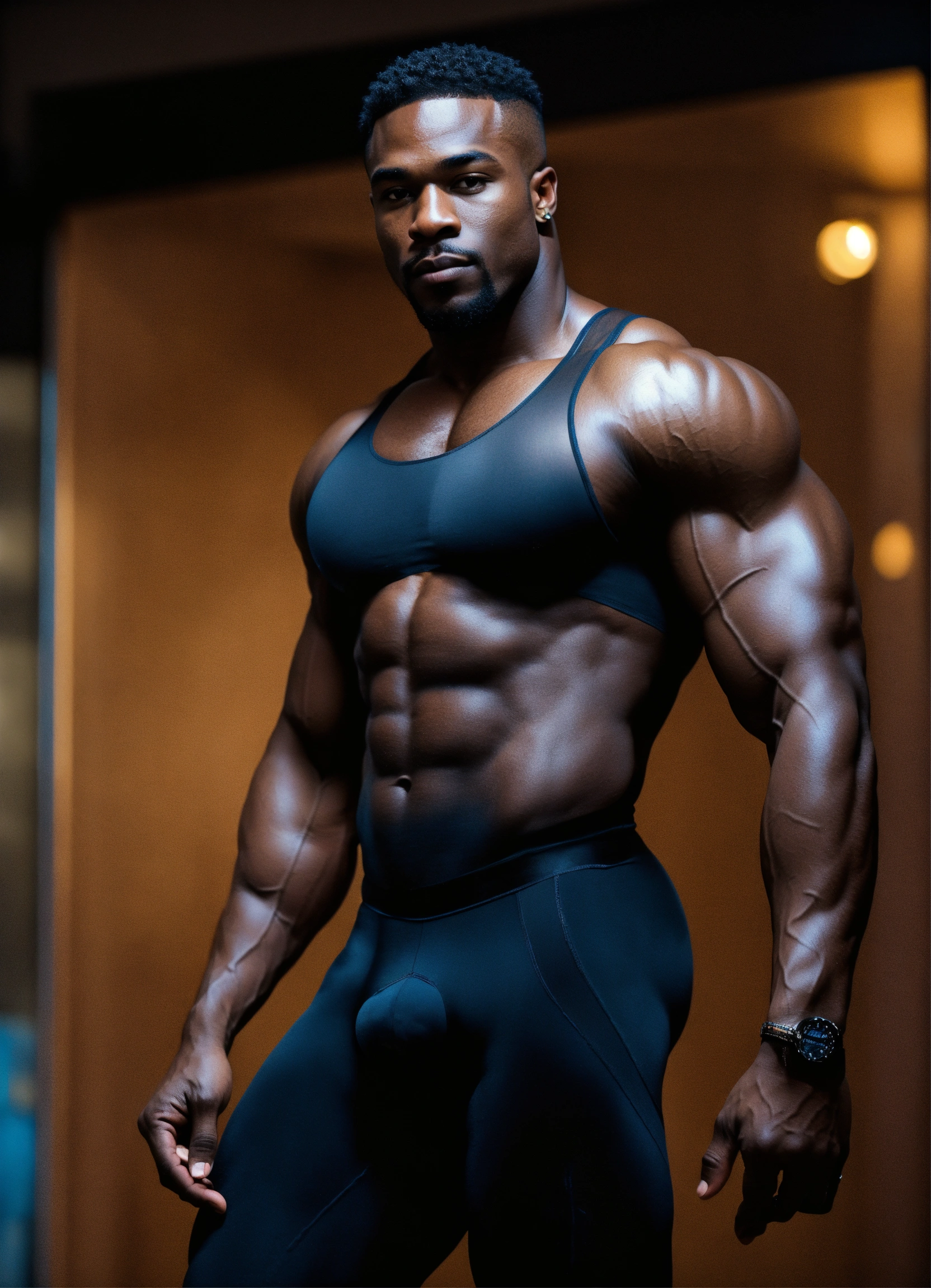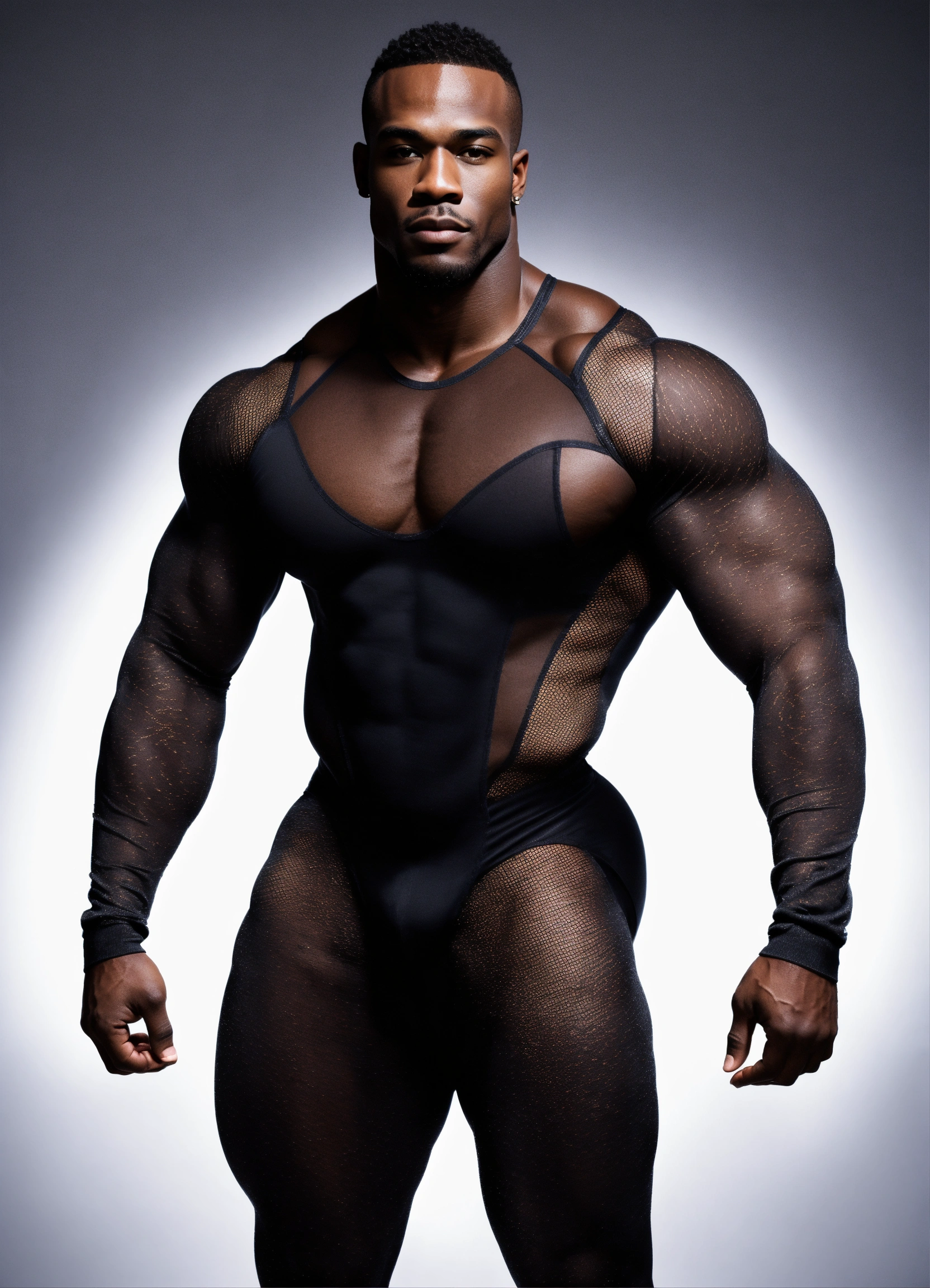 A full picture of a handsome black bodybuilder wearing a sheer leotard and stockings on legs, detailed.