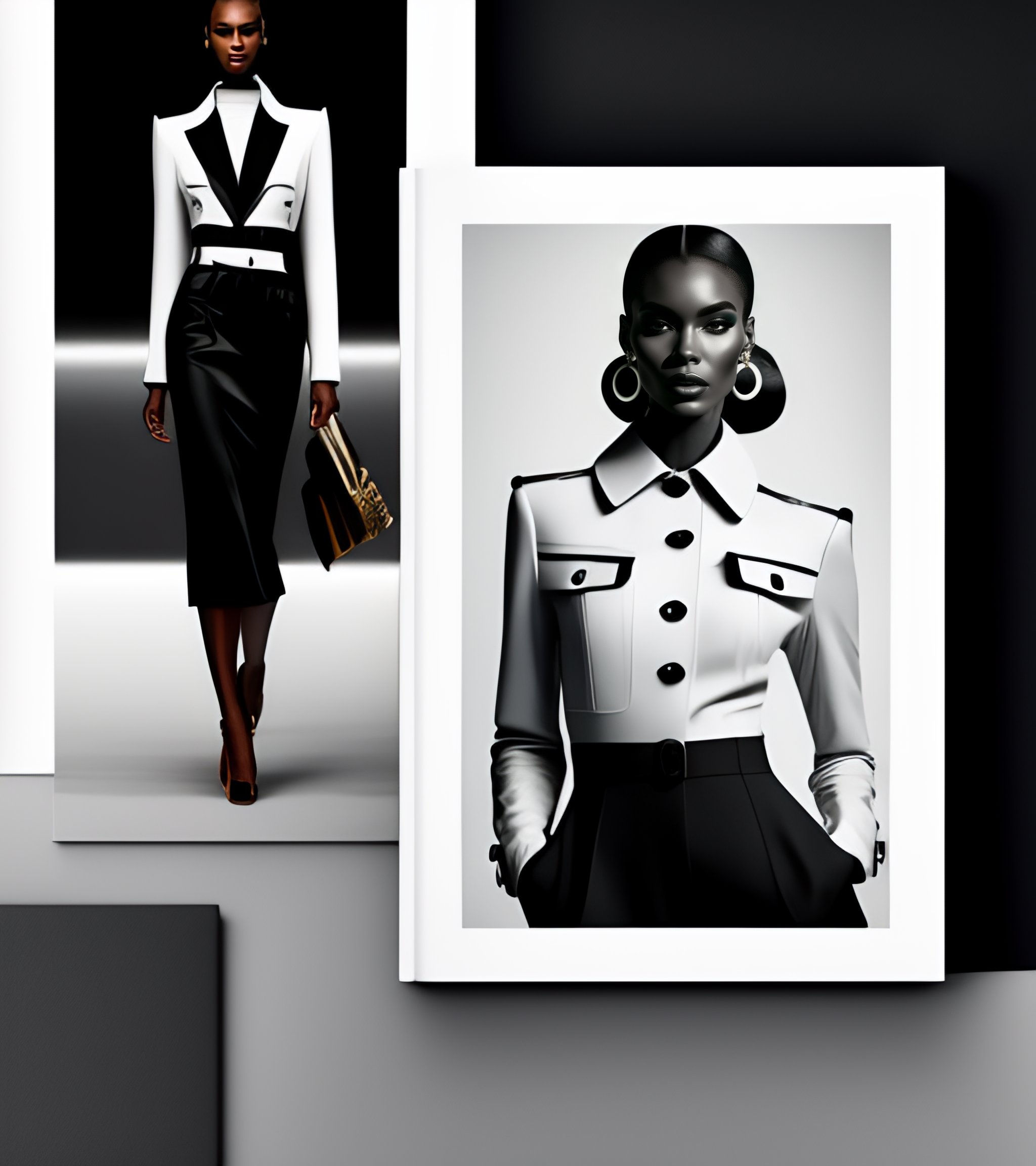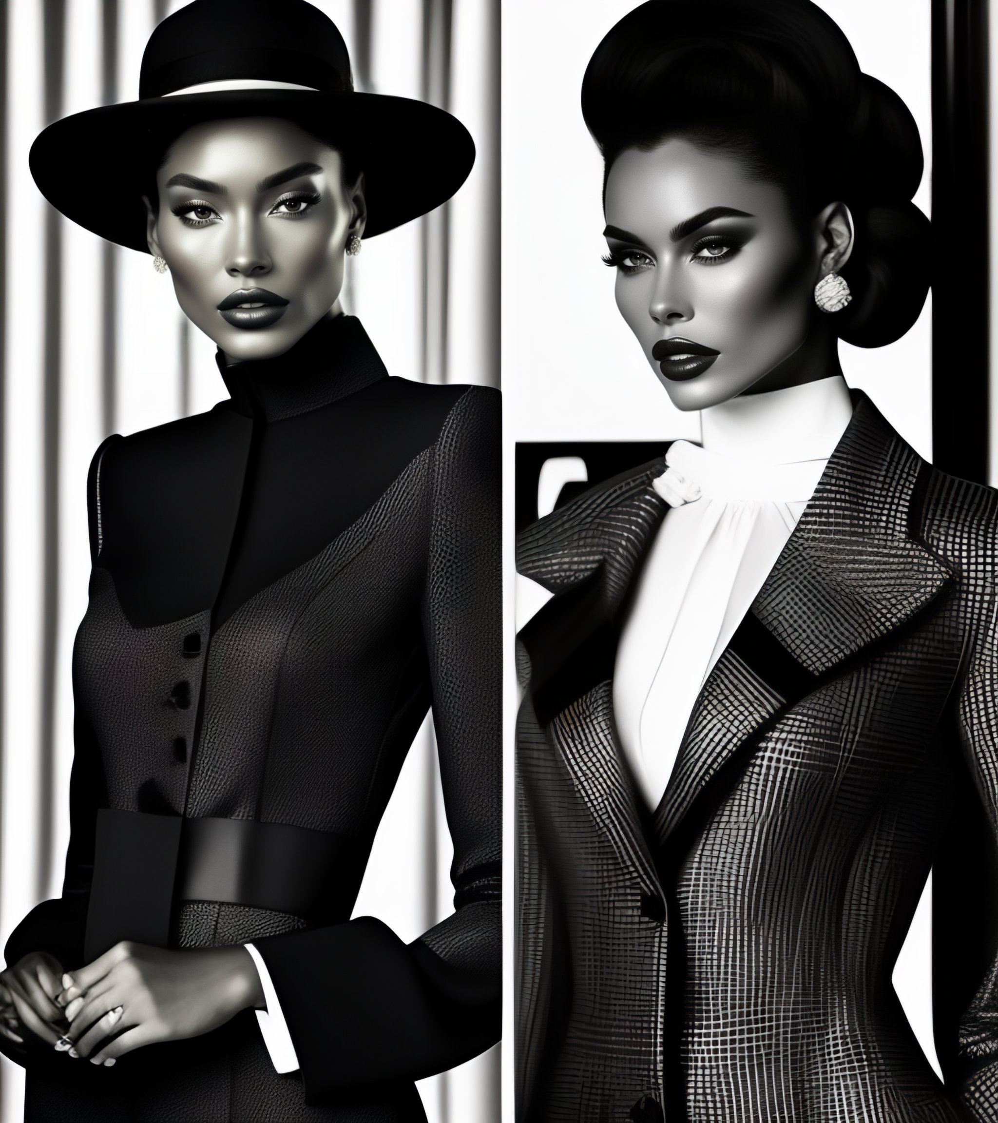 Fashion catalogue in mid-century modern style in black and white color with suits for women