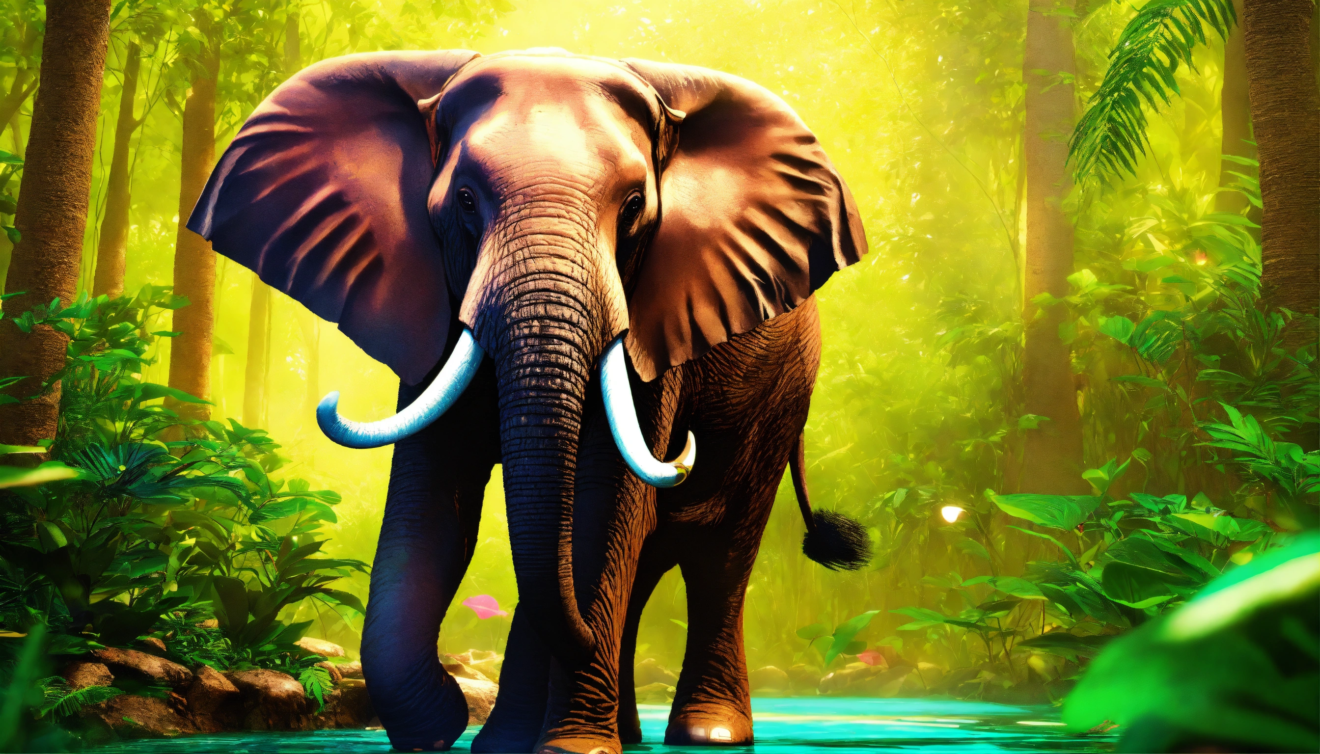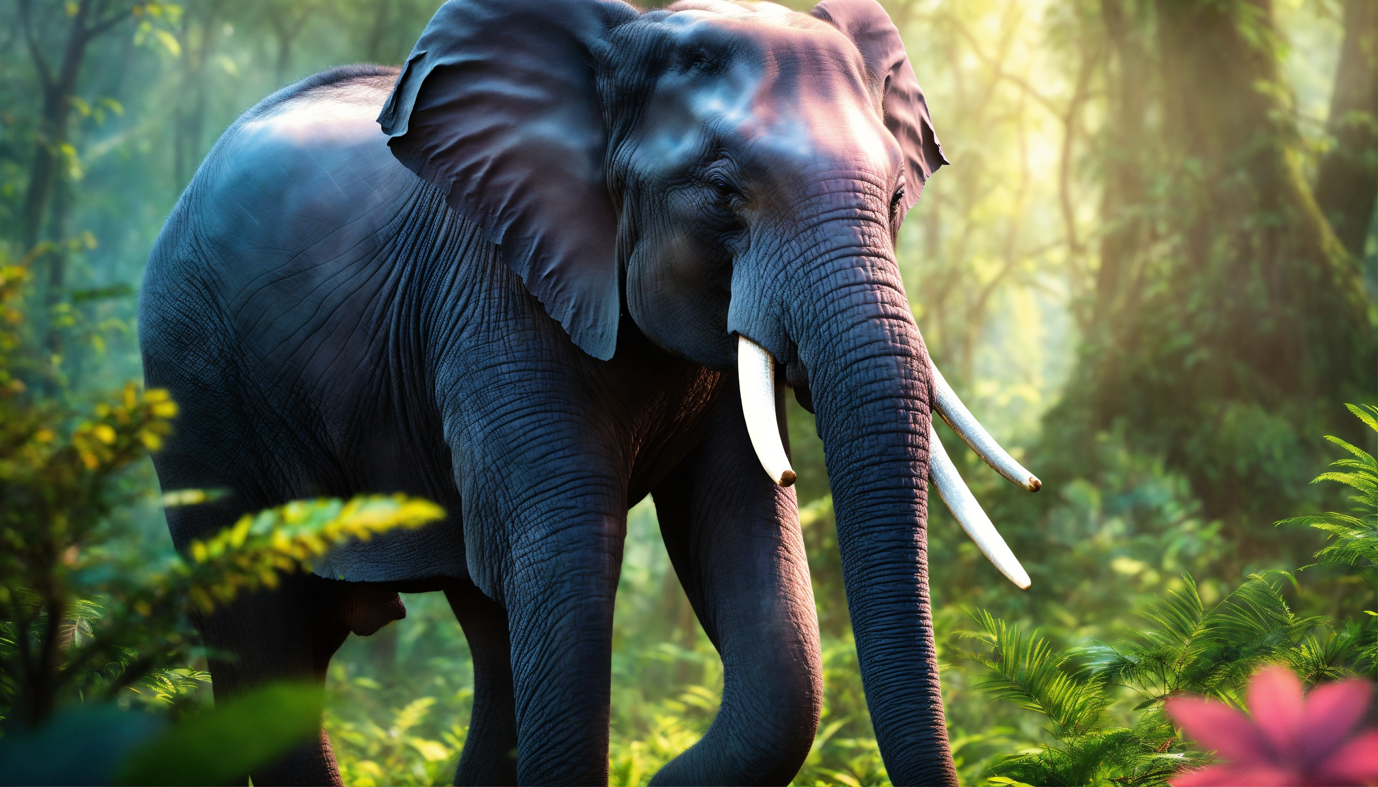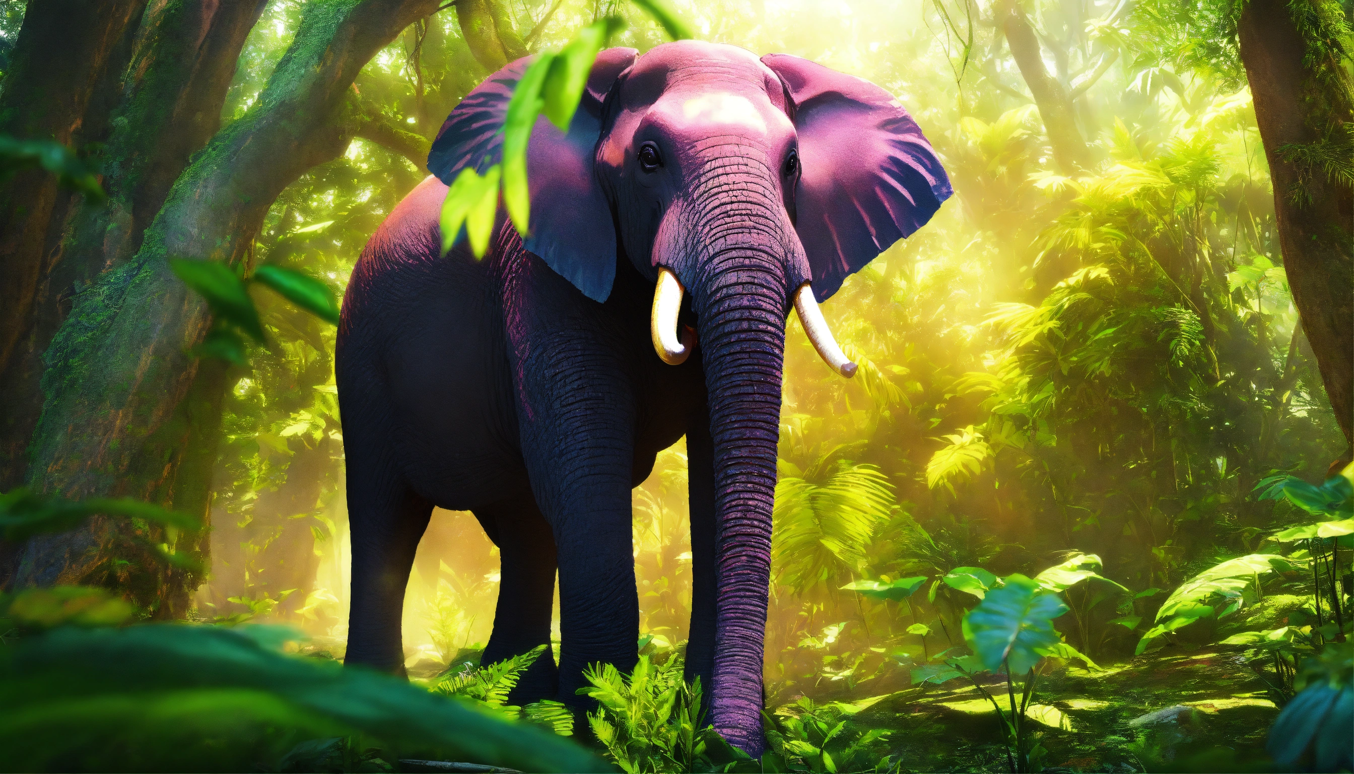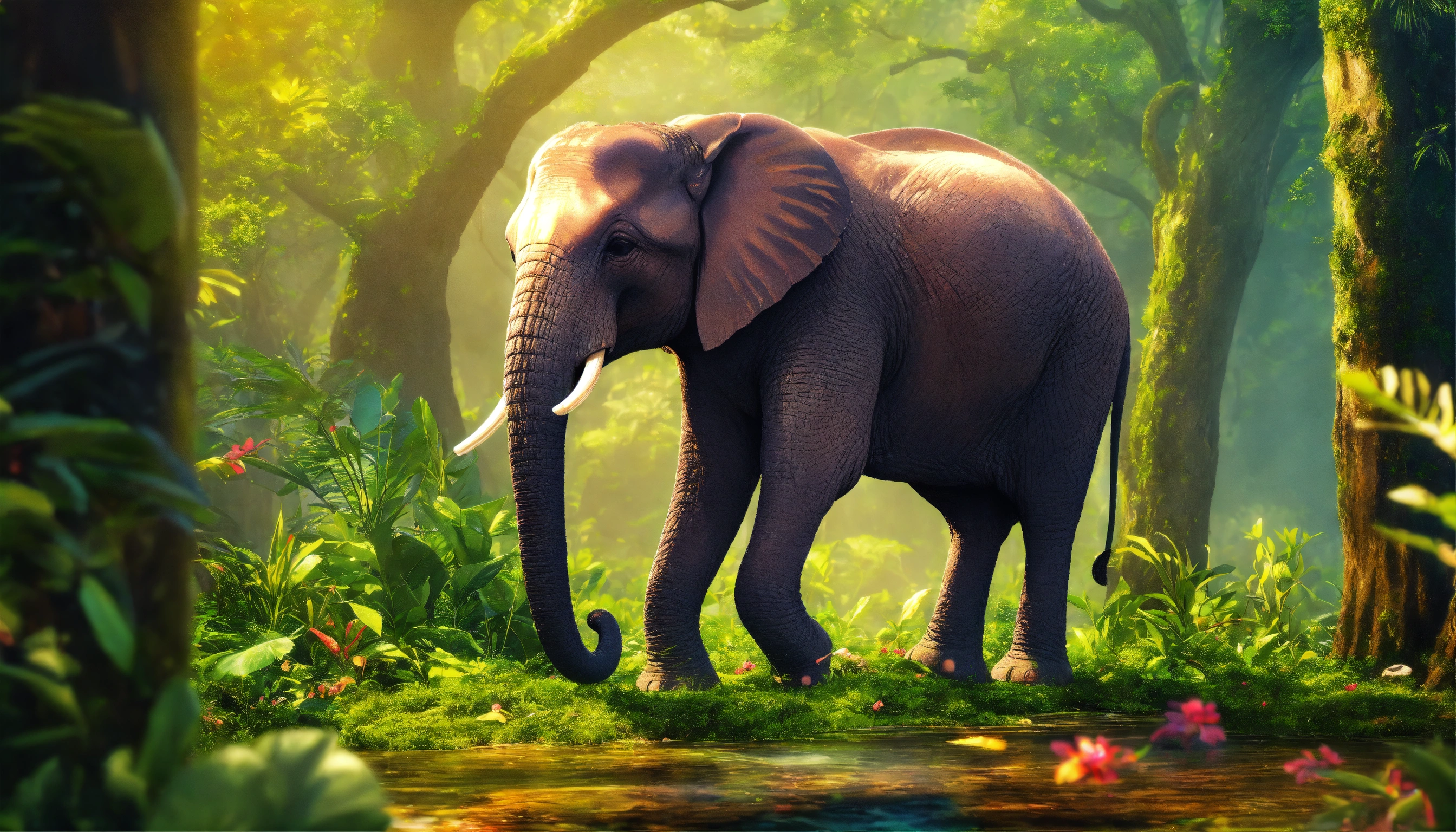 "visualize an elephant living in a lush, vibrant forest.", 3d pictures, storybook illustration, digital art, professional, high quality, detailed.