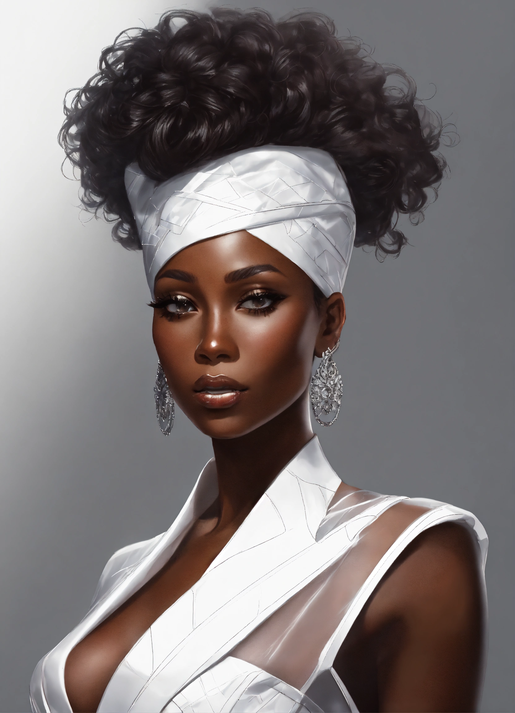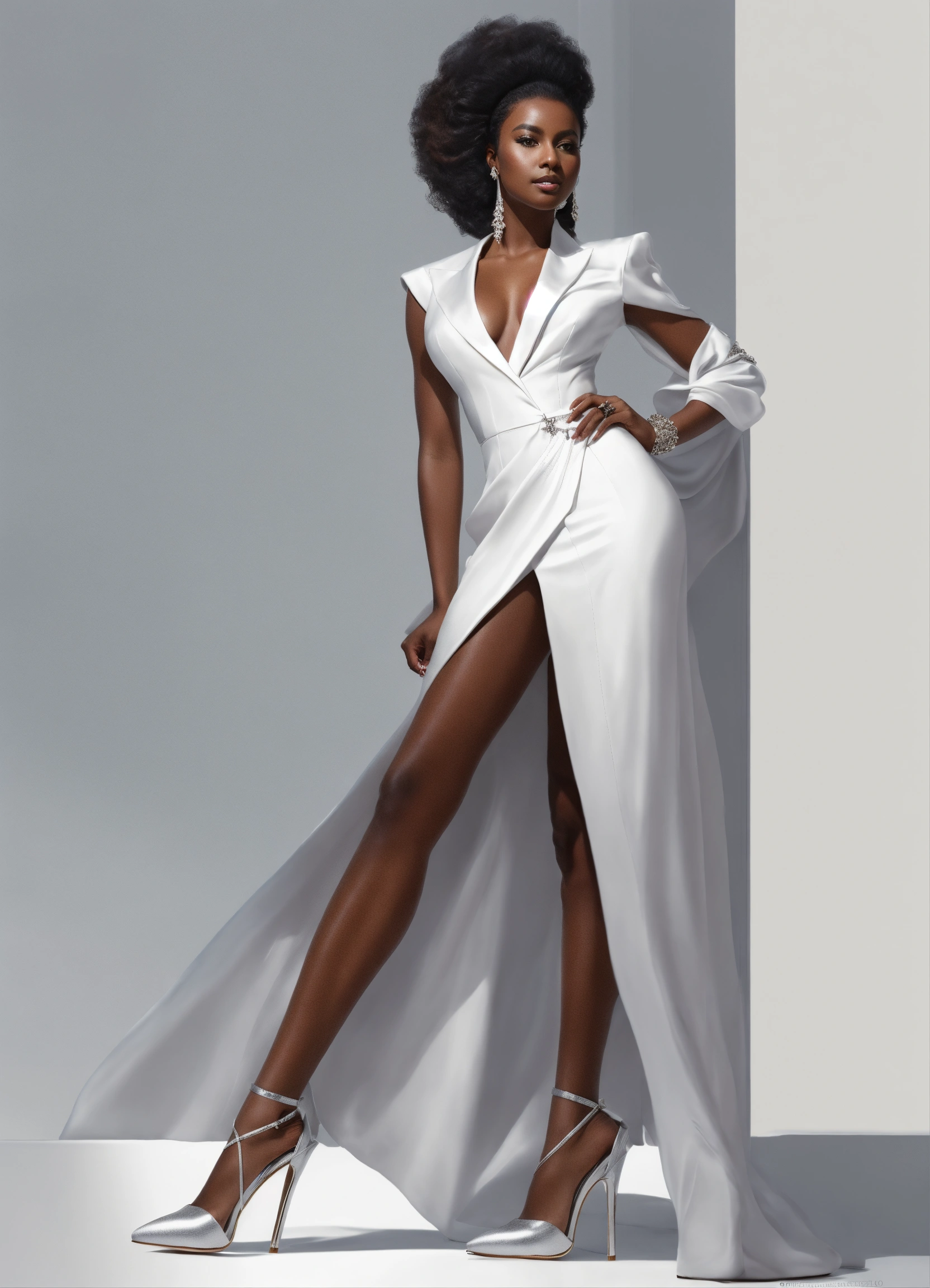 Beautiful dark skin black business woman wearing stylish haute couture outfit white clothes, silver stiletto heels, detailed line art, fine details, no background, full body view, top of hair, top of head to toe, center, solid white background, greg rutkowski