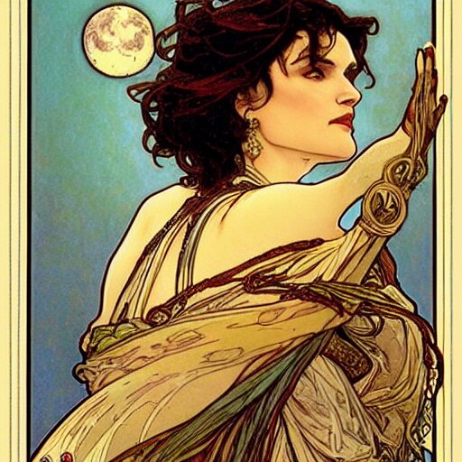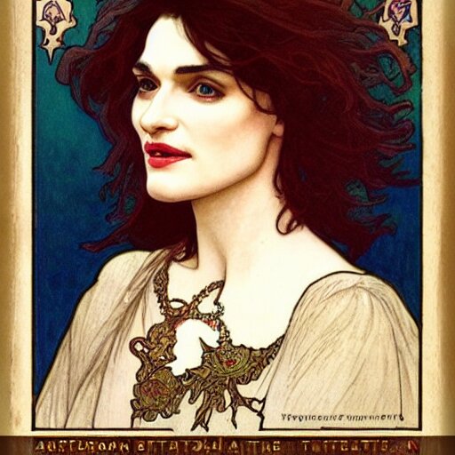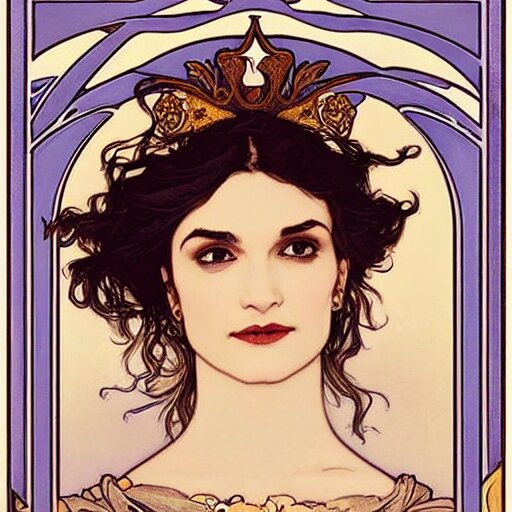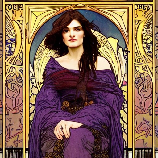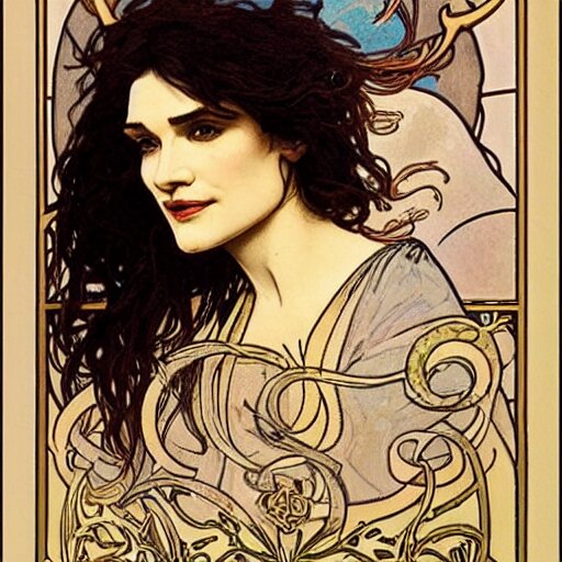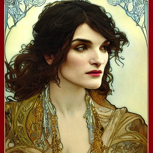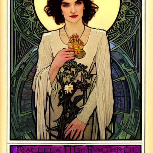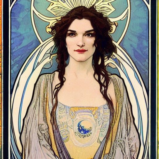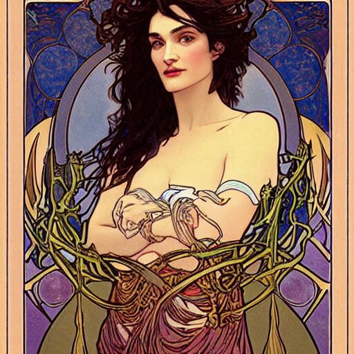 Rachel weisz portrait by louis - theophile hingre and alphonse mucha, realistic, sharp focus, zodiac signs, tarot cards, planets, ethereal, art nouveau, magic, moon, sun, crown, dreamy, royal, jewellery
