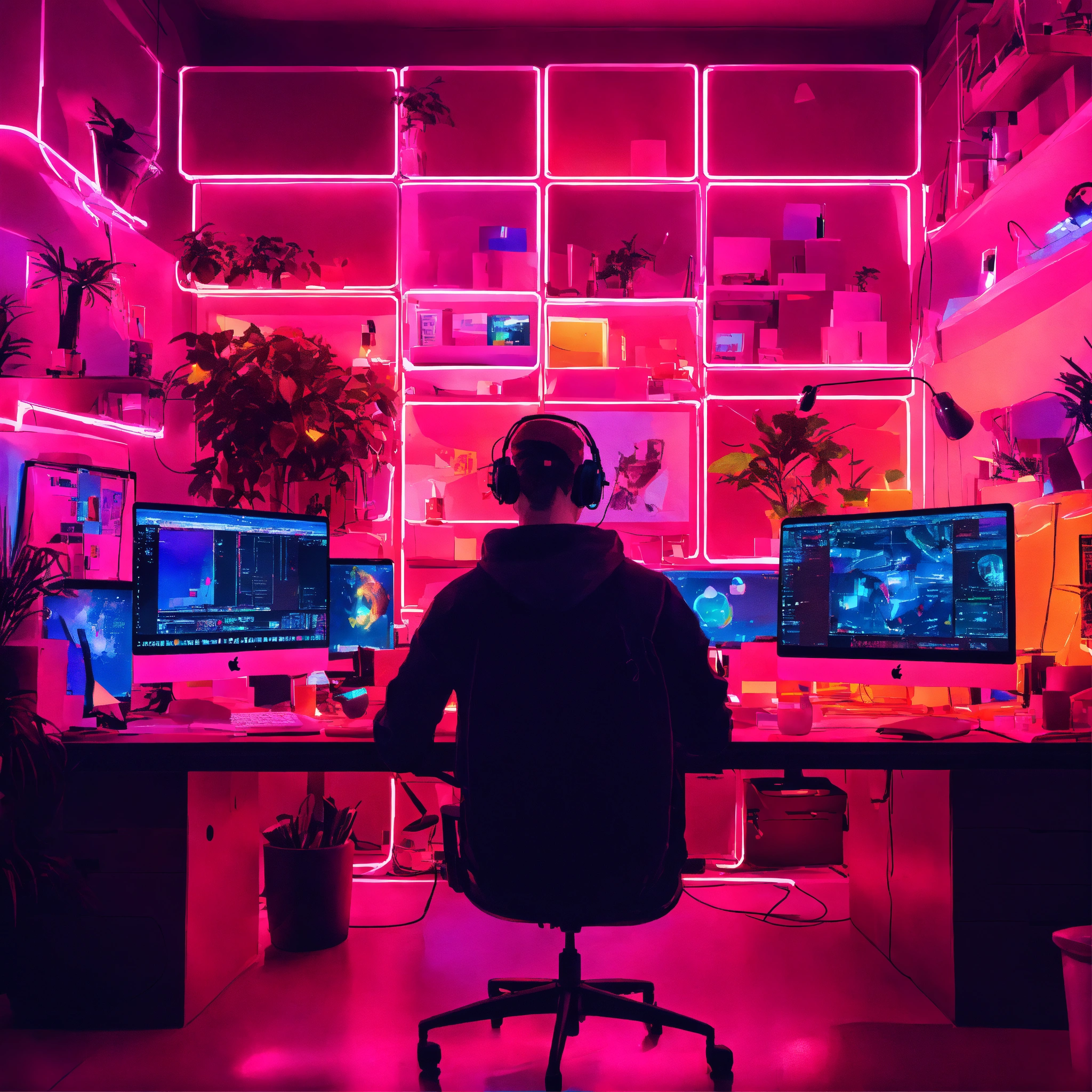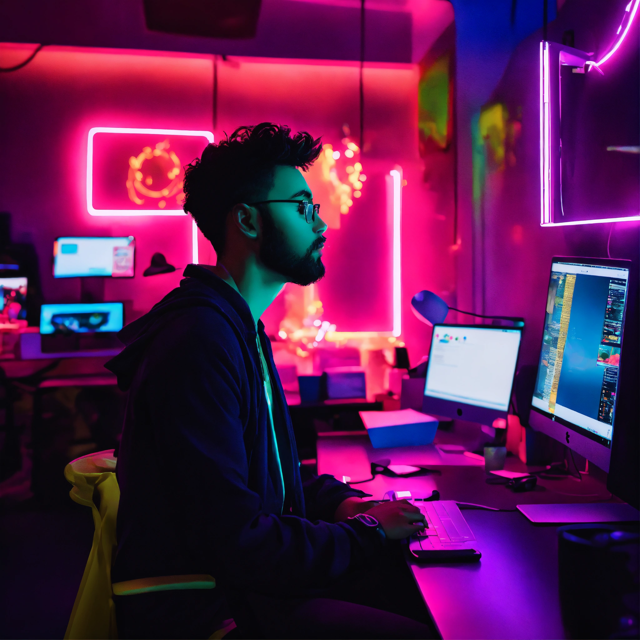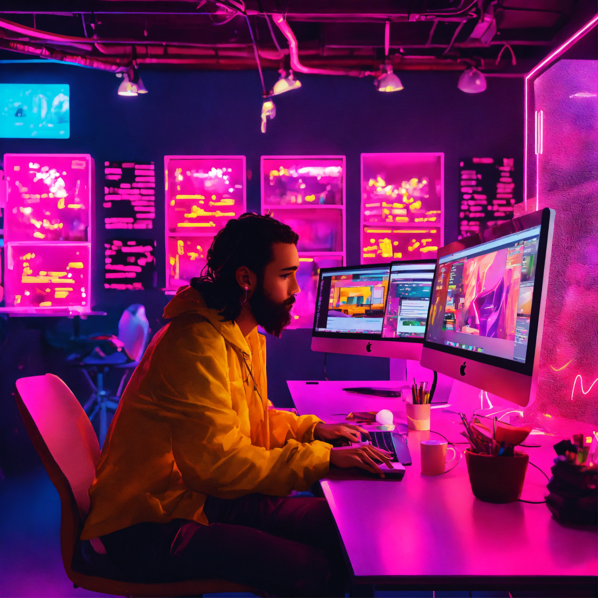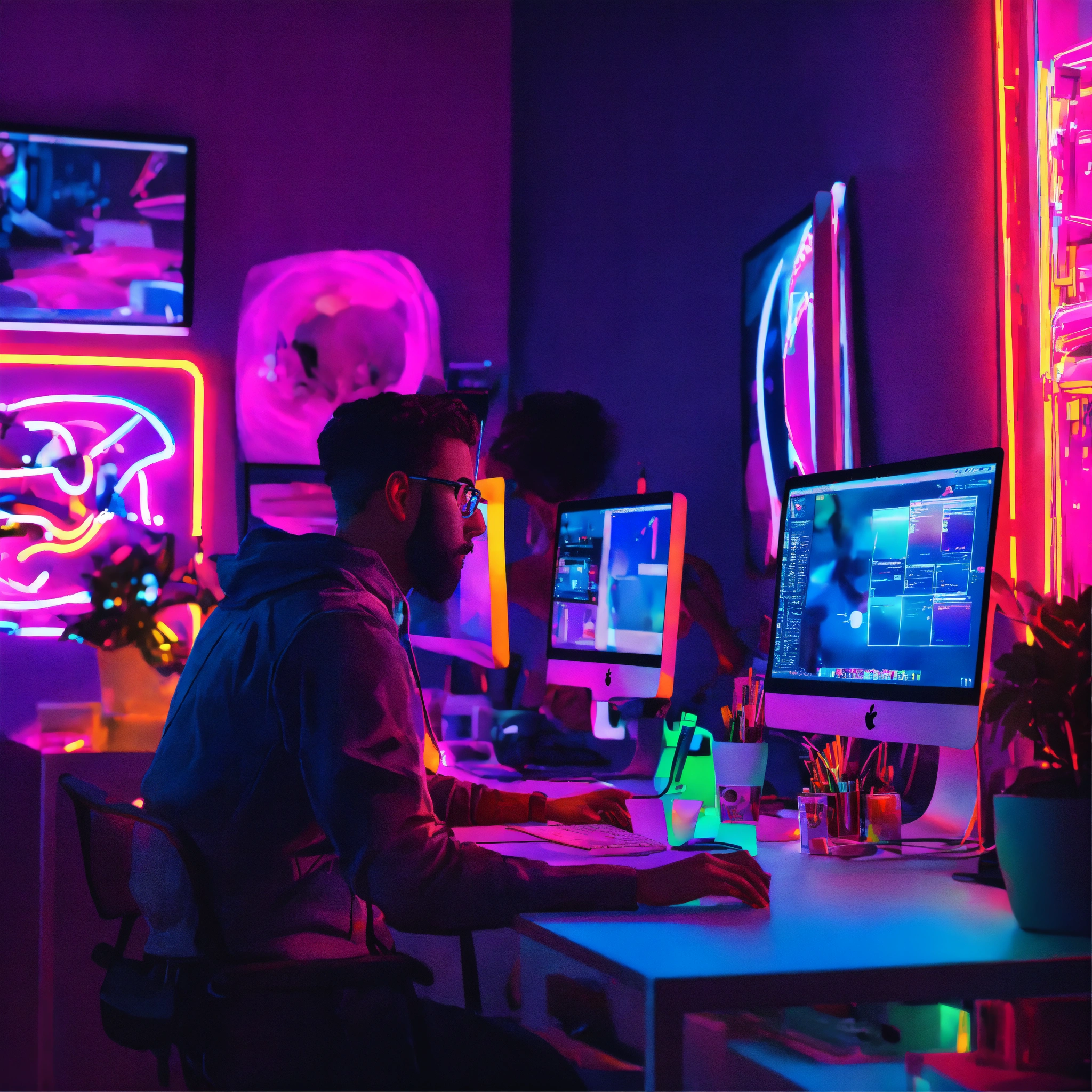 A ux designer with many individuals in a workspace with neon lights and a lot of imac