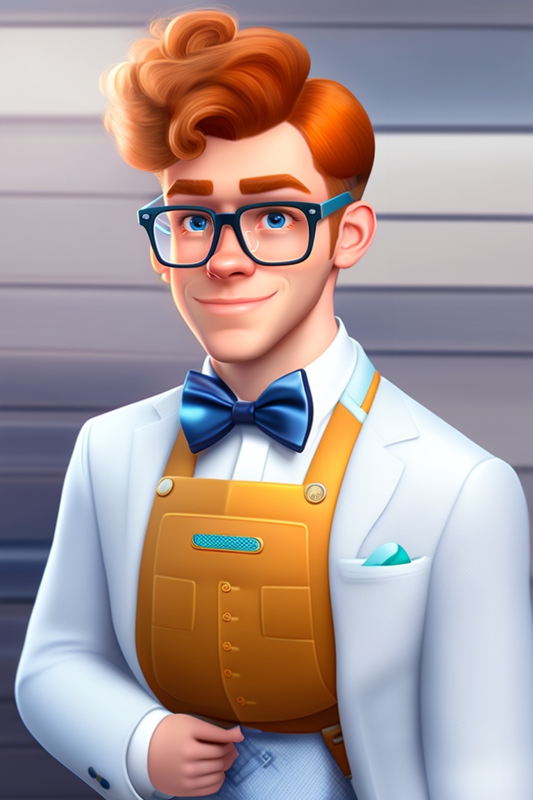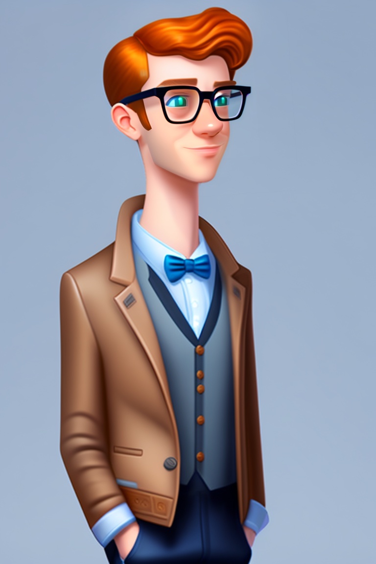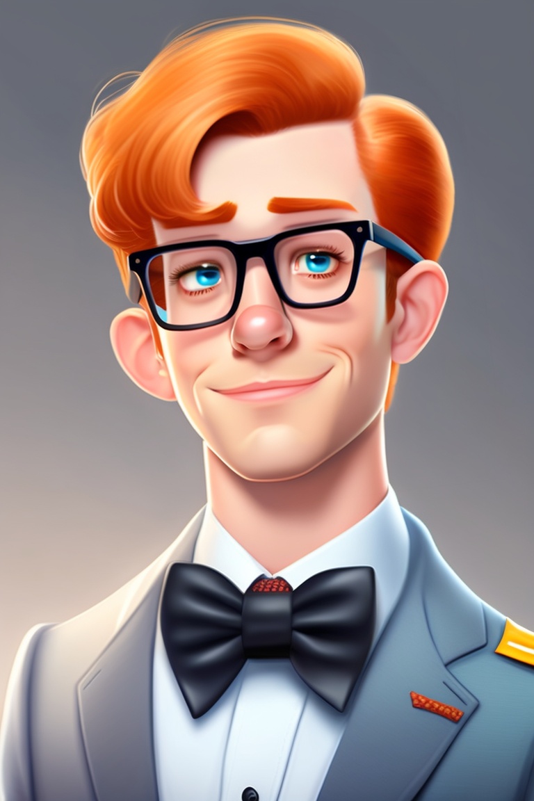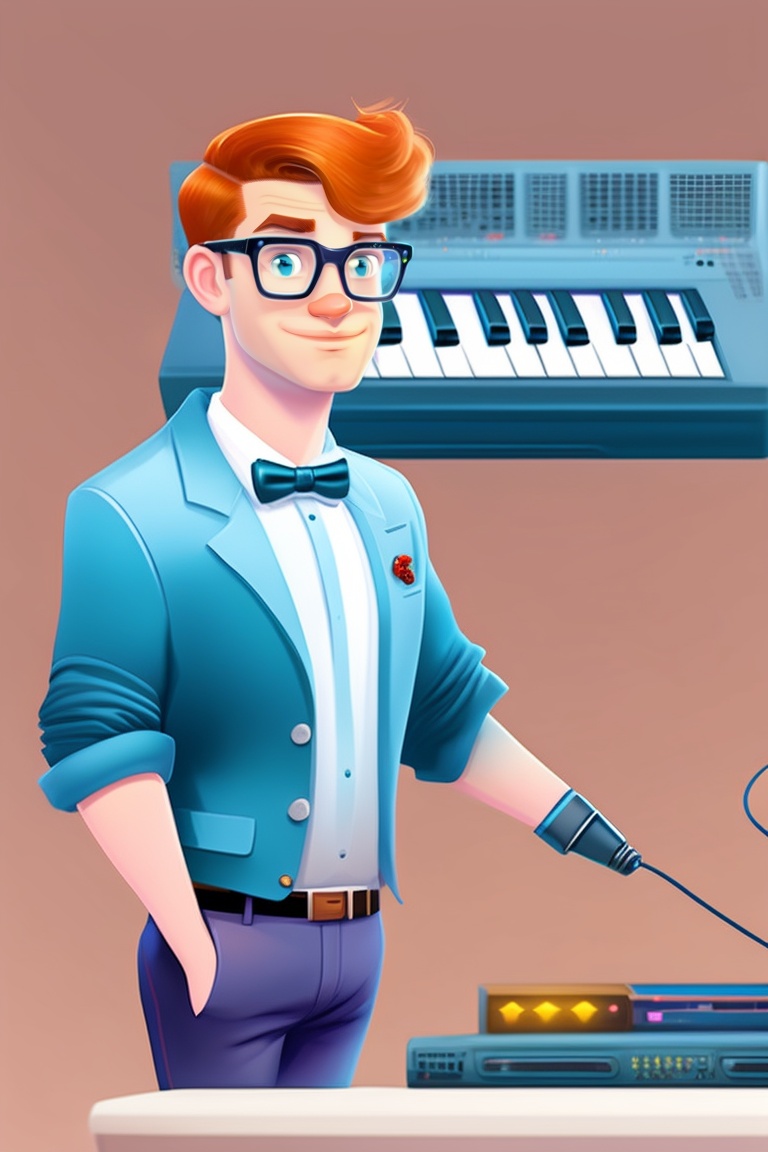 Cartoon. realistic, ugly, spotty, ginger hair. male nerd aged 19, geek, awkward, glasses, bow tie. walking, holding a keyboard.