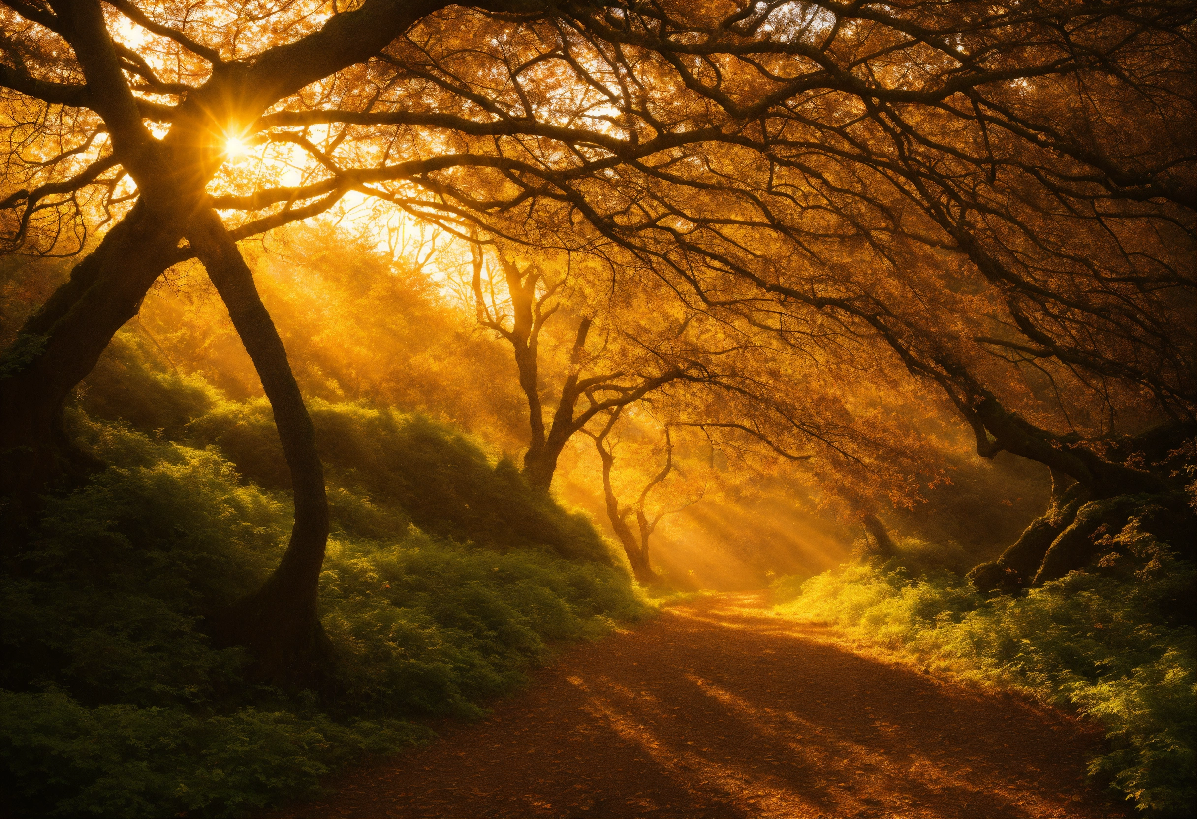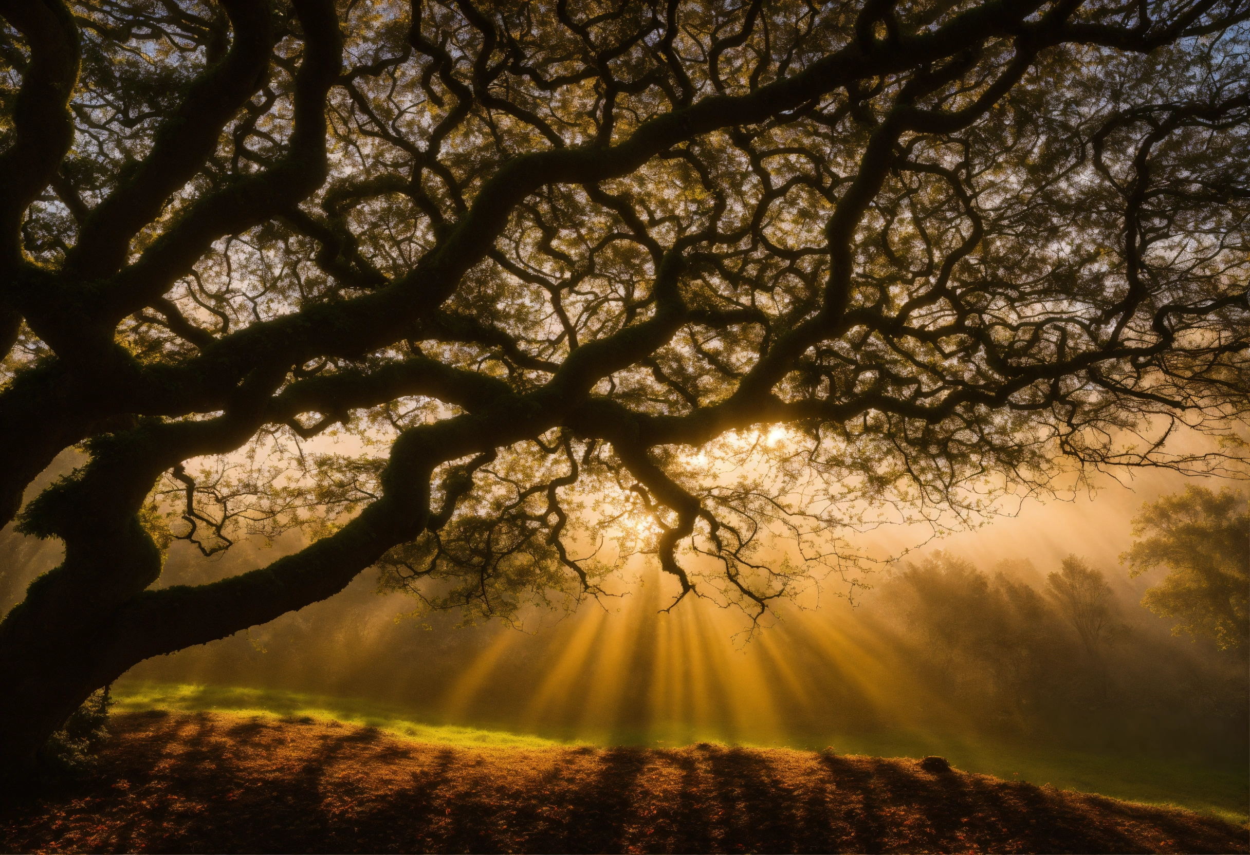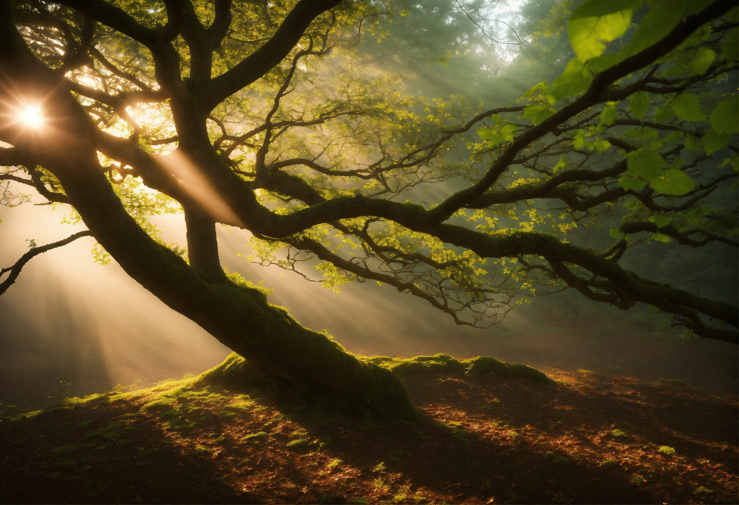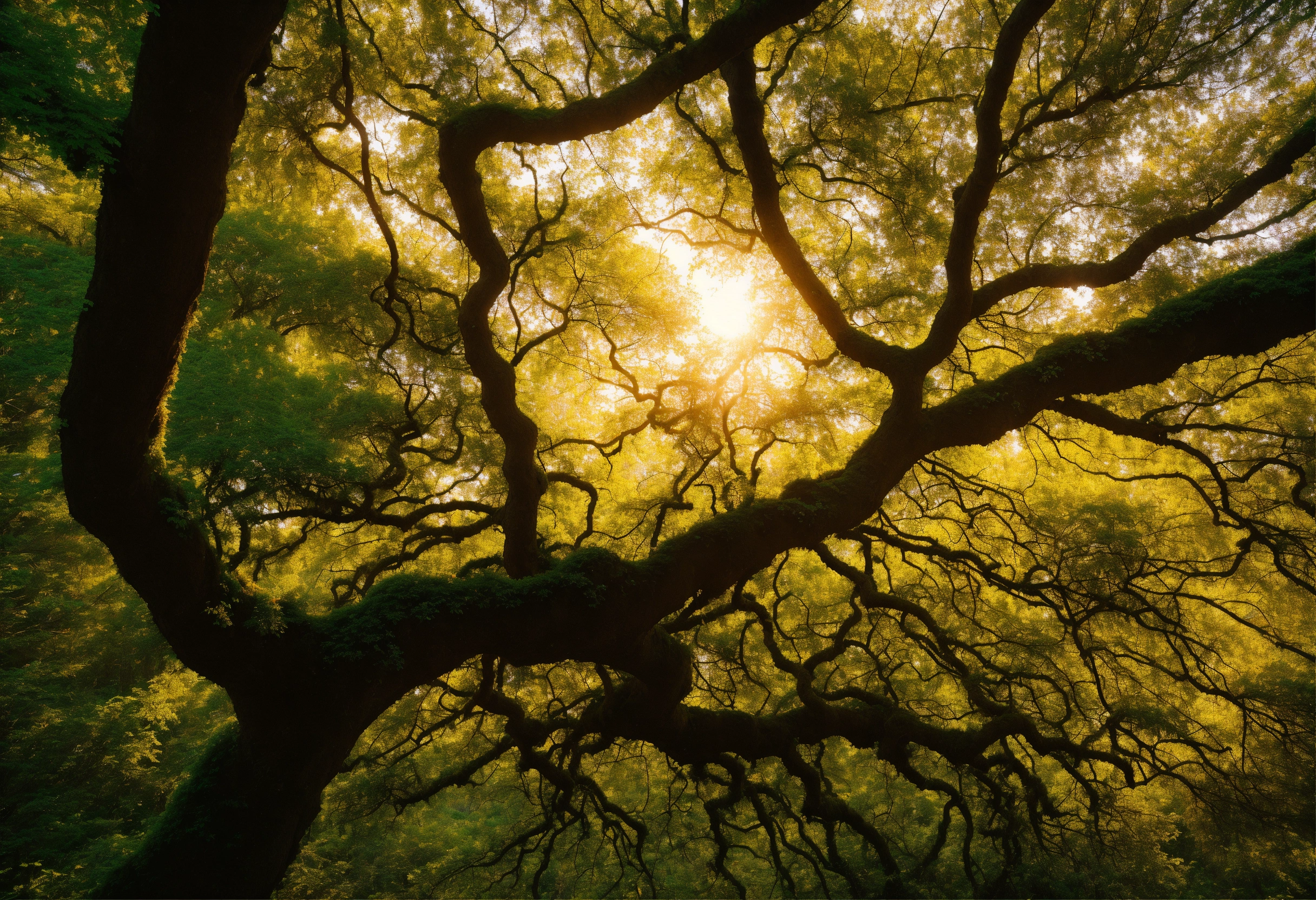 A mystical landscape with tree branches delicately intertwining to form a serene and enigmatic celestial face. the branches have an ethereal quality, casting intricate shadows across the scene. the environment is a lush forest, filled with vibrant foliage and soft sunlight filtering through the leaves. the mood is mysterious, evoking a sense of wonder and connection with nature. capture this scene in a photographic style, using a macro lens to showcase the intricate details and textures of the branches.
