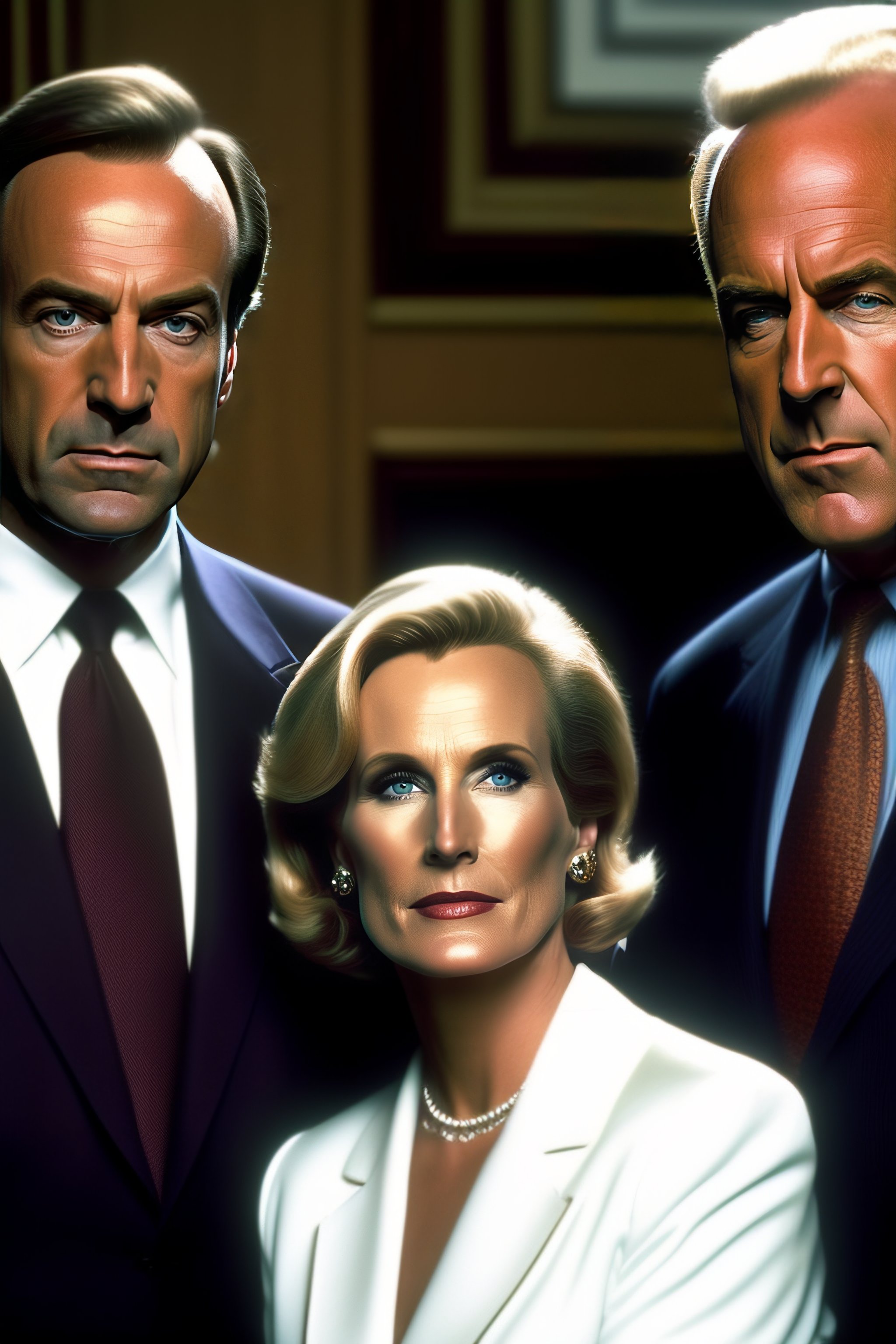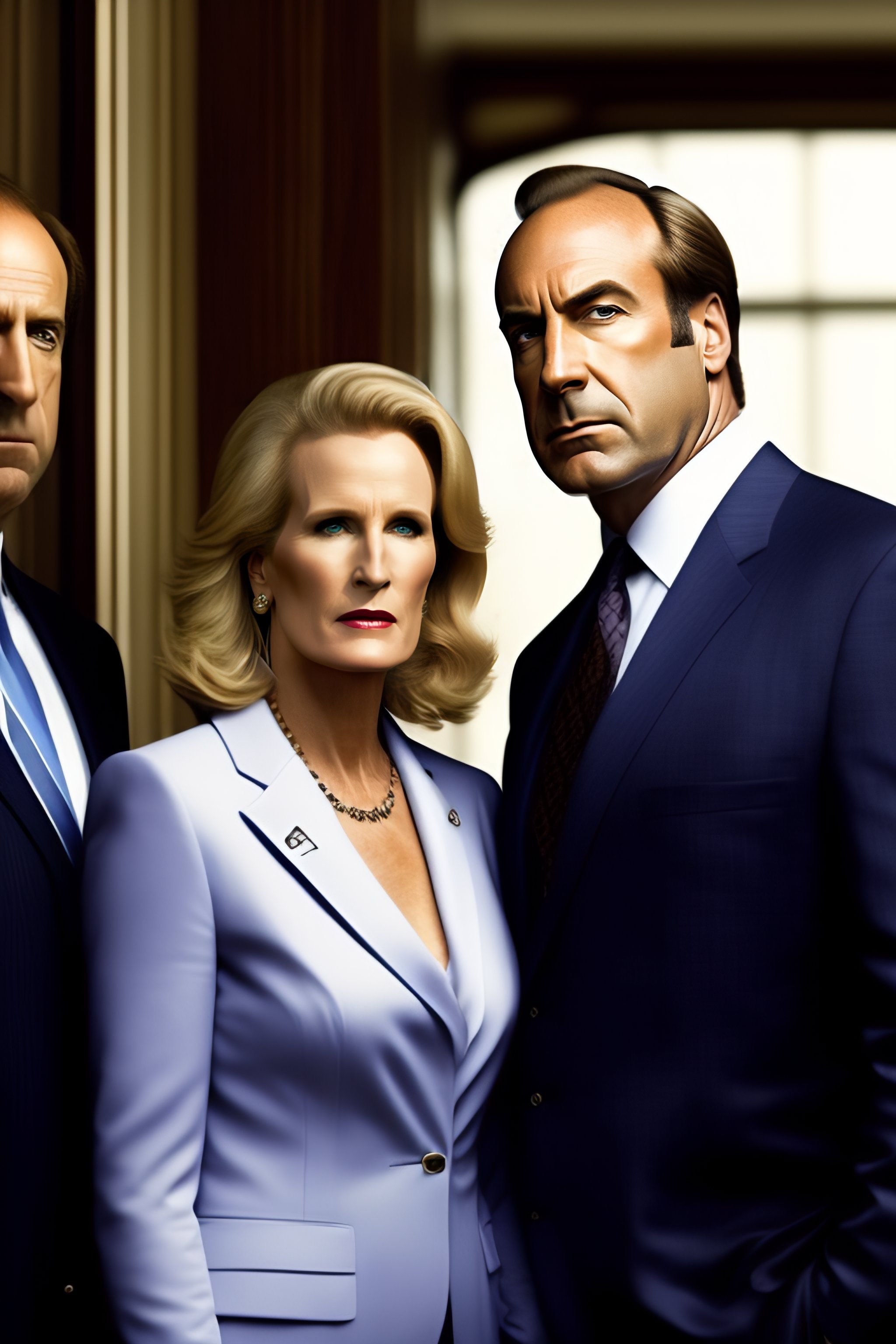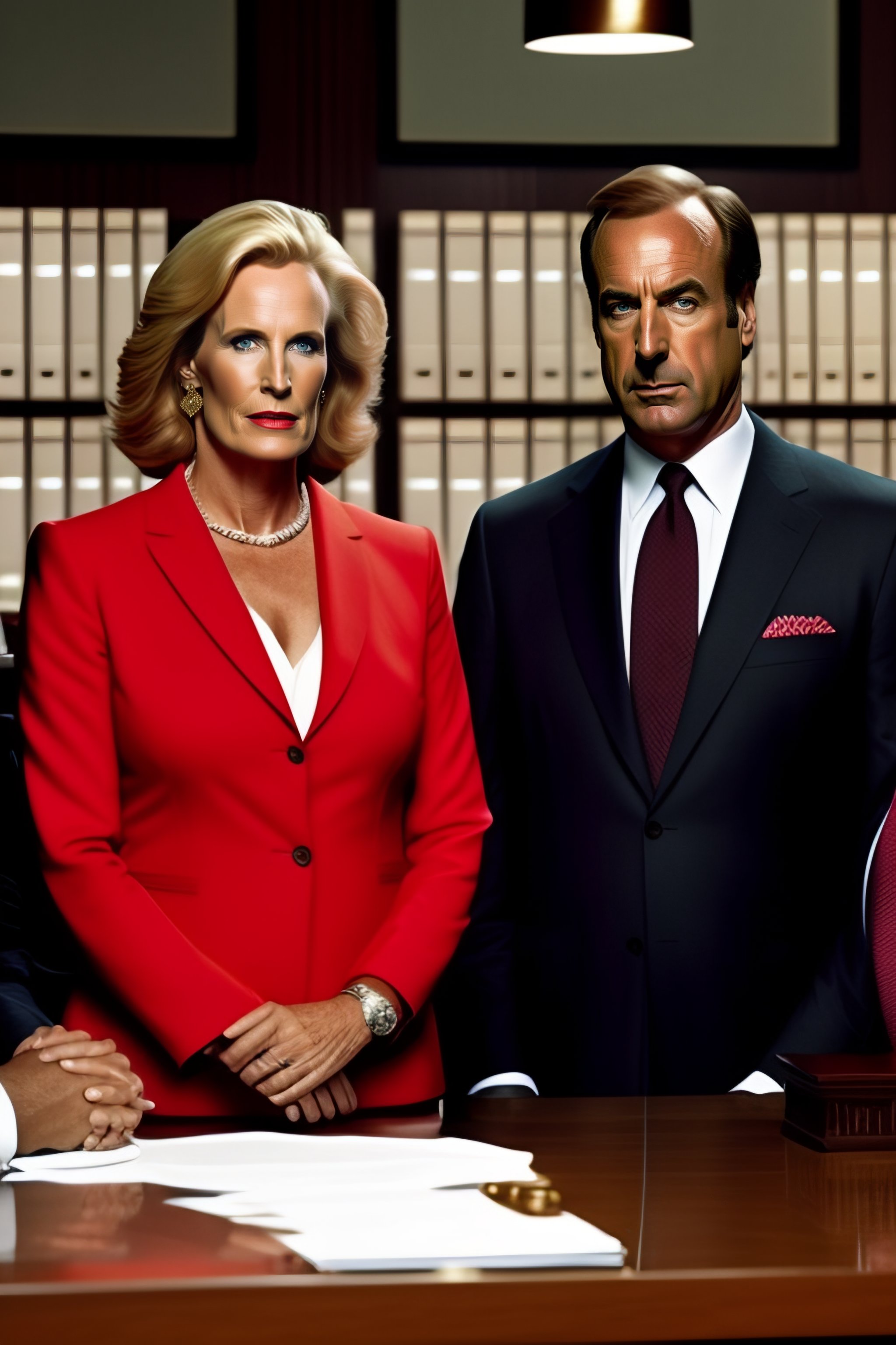 Saul goodman, patty hewes, and perry mason standing together like lawyers at a law firm. landscape orientation. funny. realistic.