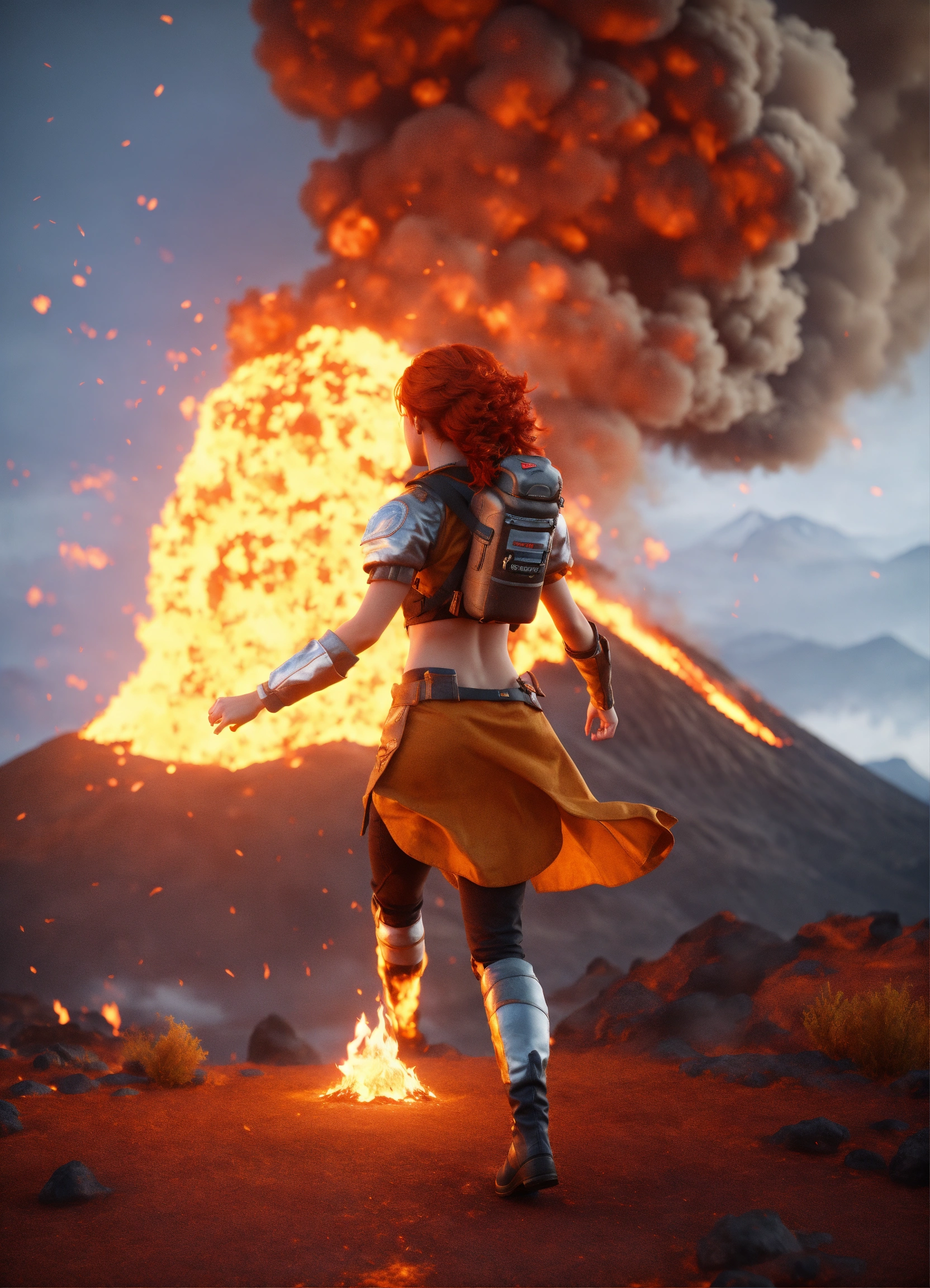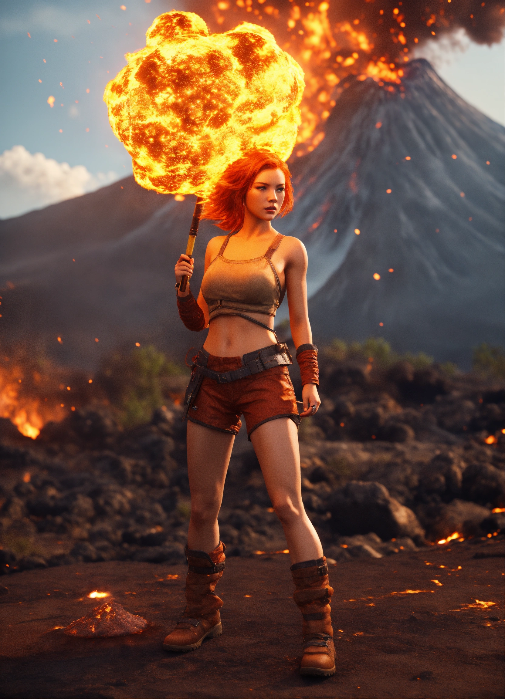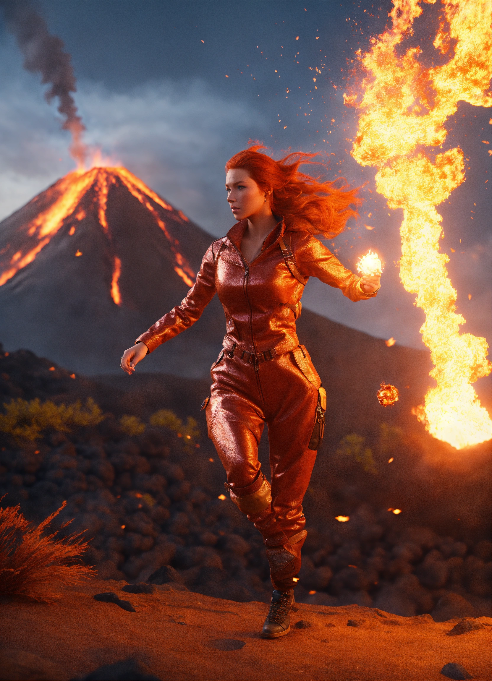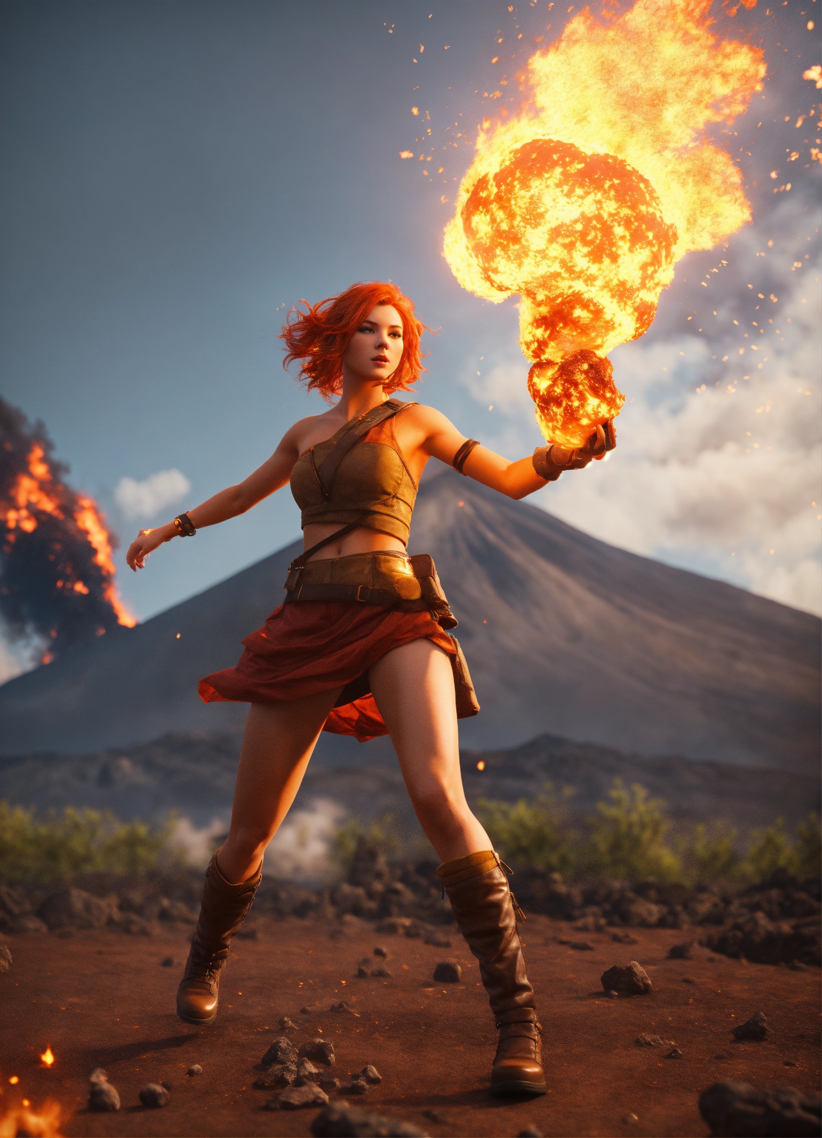 Small female pale skinned redhead fire elementalwearing traveling clothing throwing a fireball with an active volcano in the background unreal engine render 8k