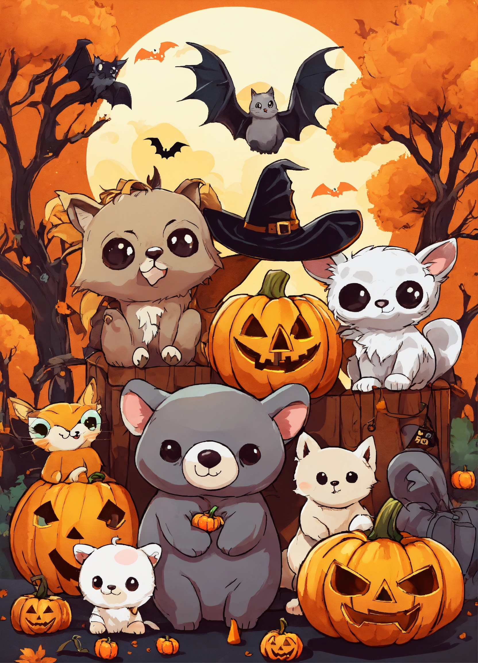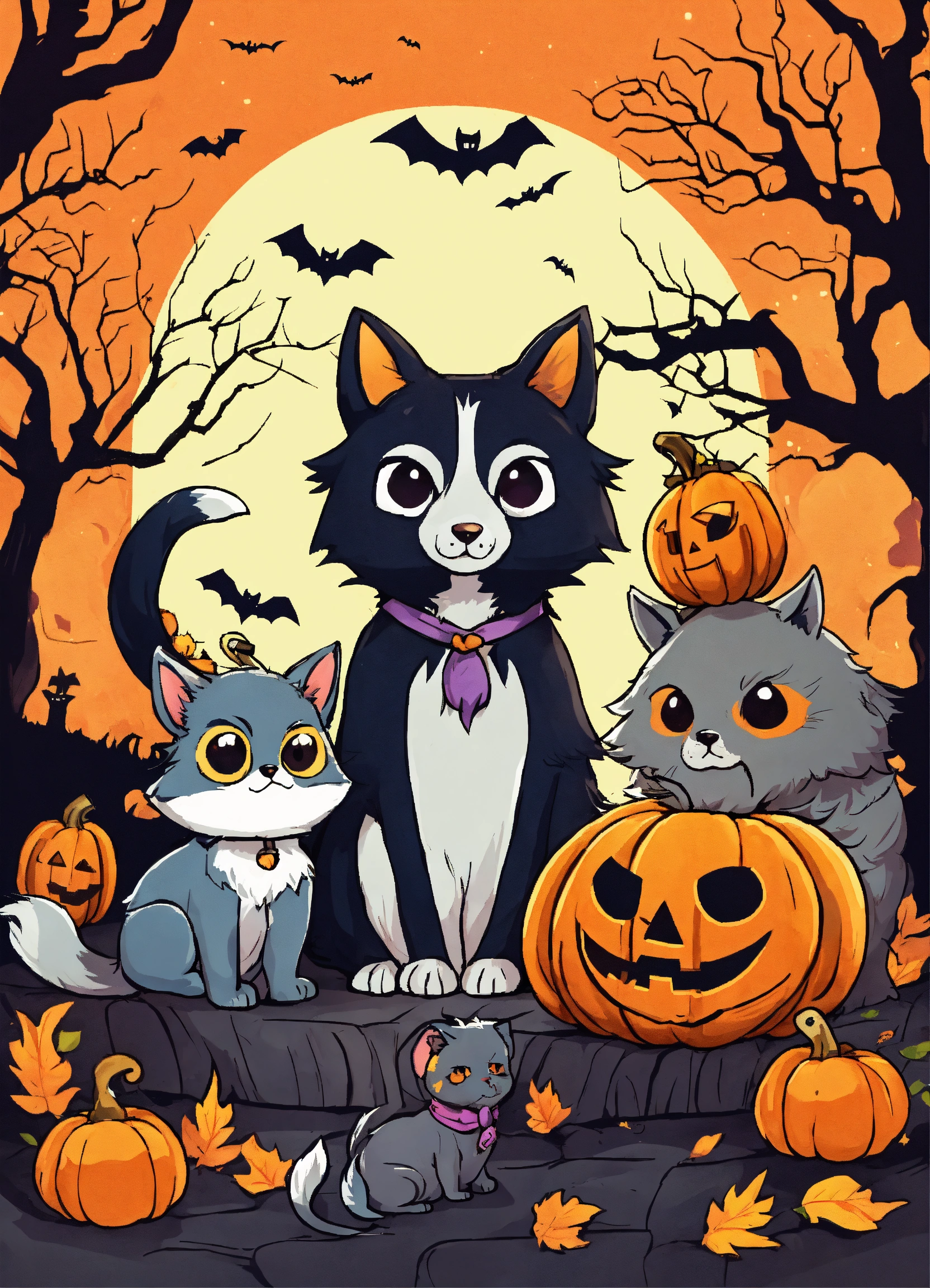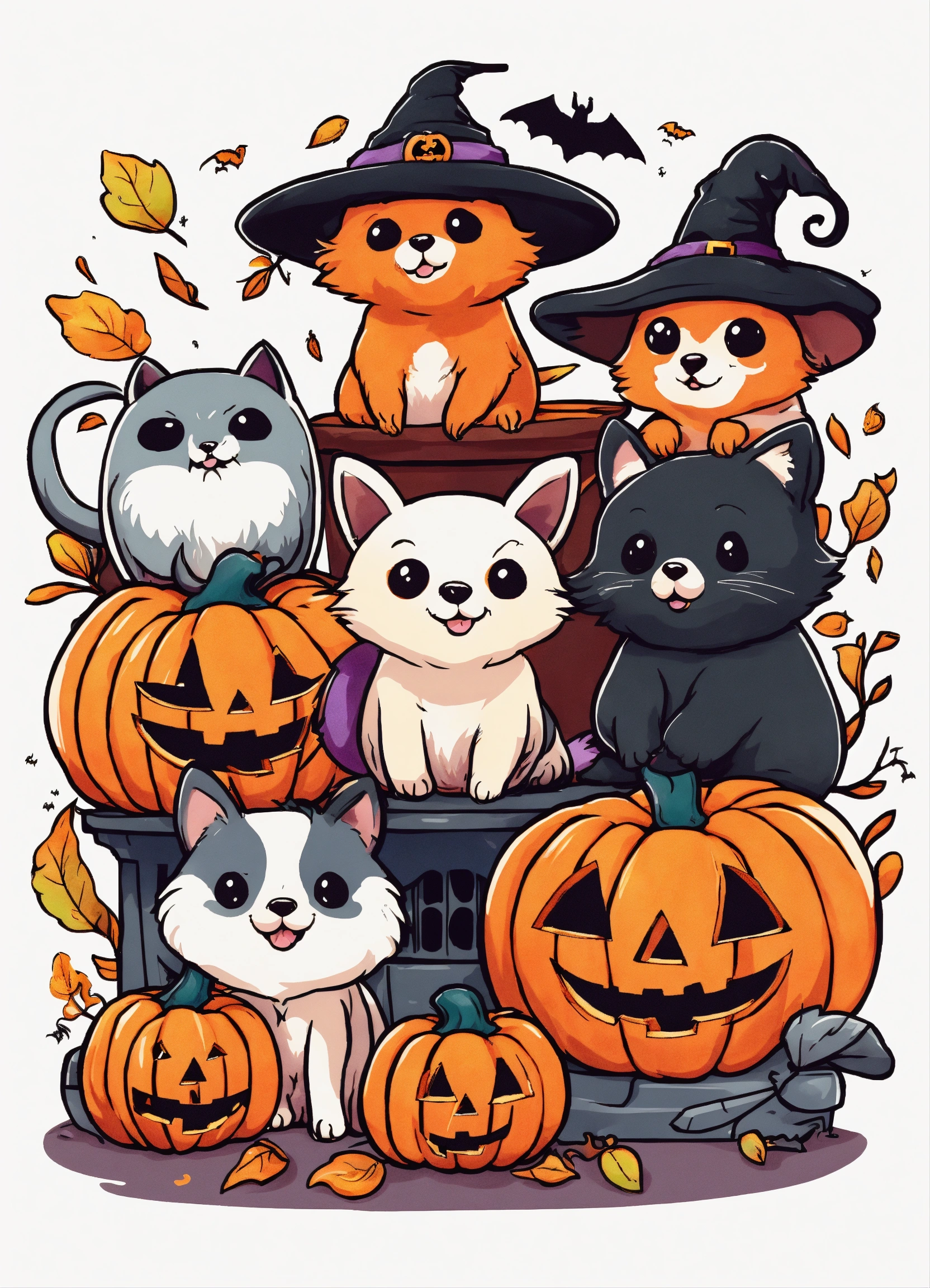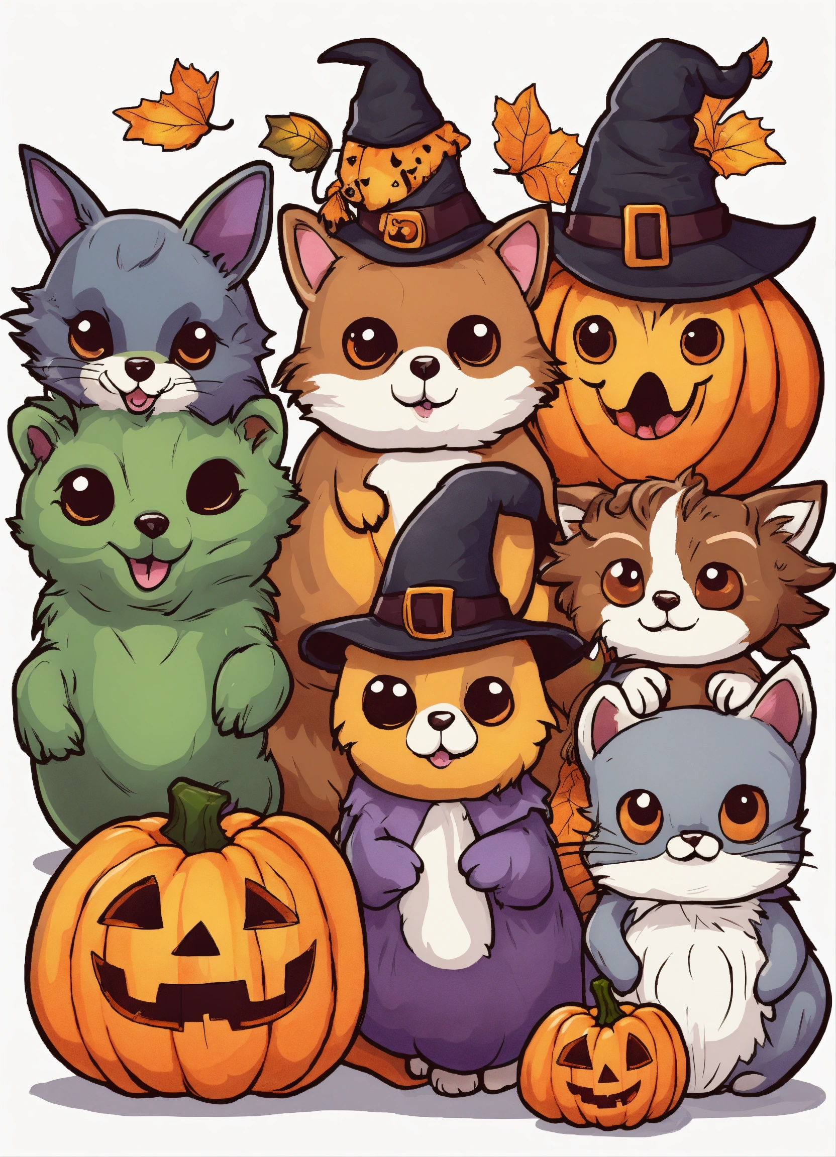 Generate a cute halloween animal gang illustration, 4k resolution, cartoon-sticker style with clear lines on a pure white background suitable for a children's coloring book.