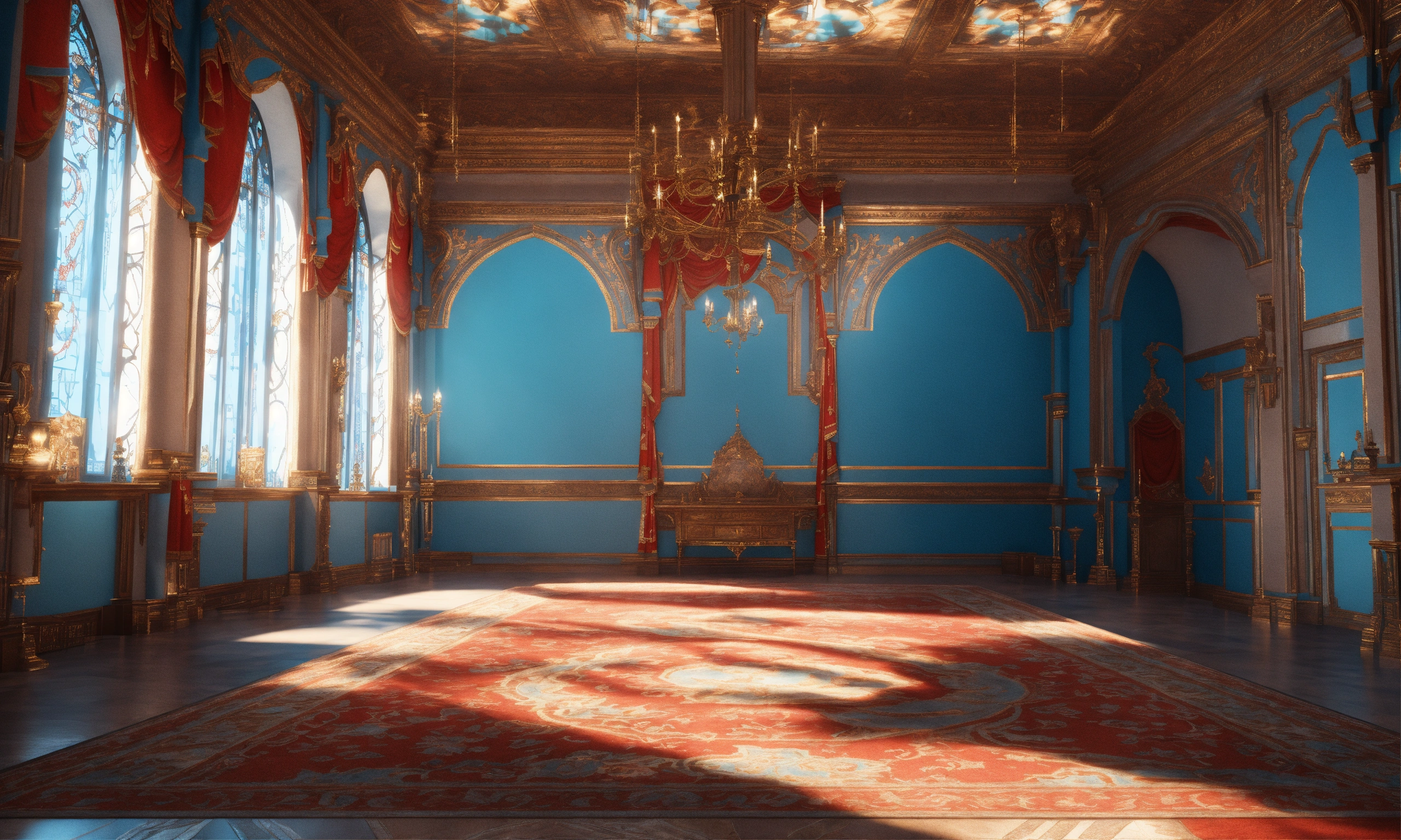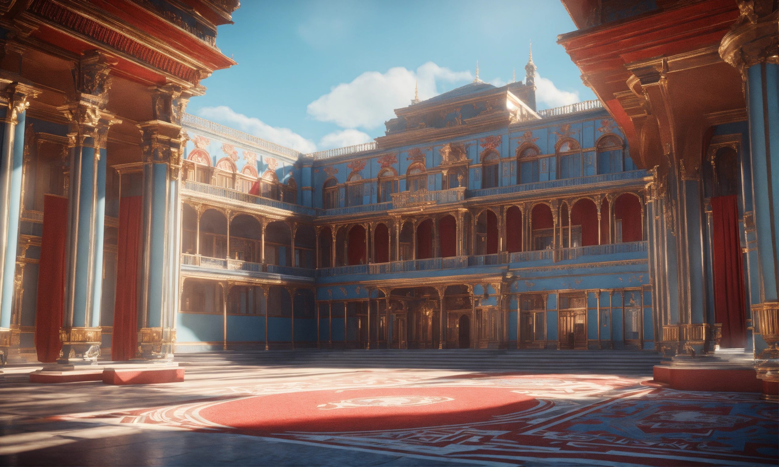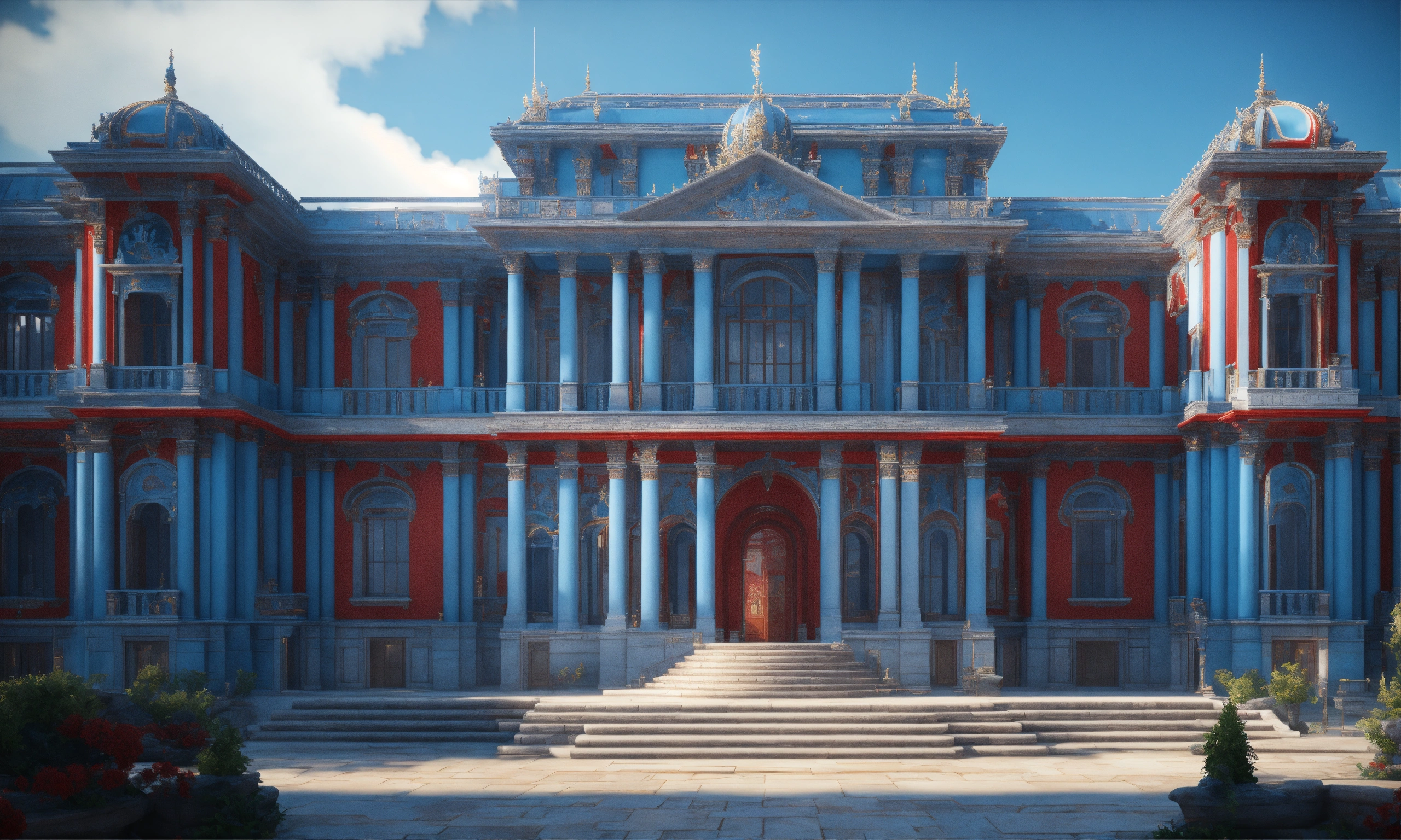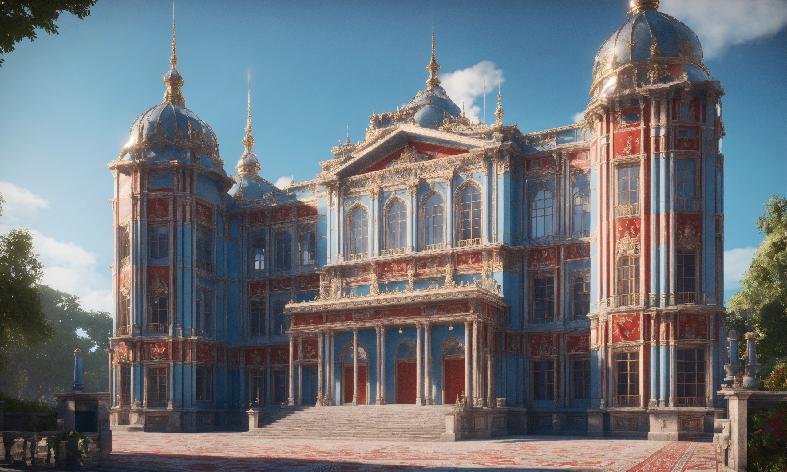 Full image of a massive palace with light blue and red designs, british architecture, highly detailed, unreal engine, 8d