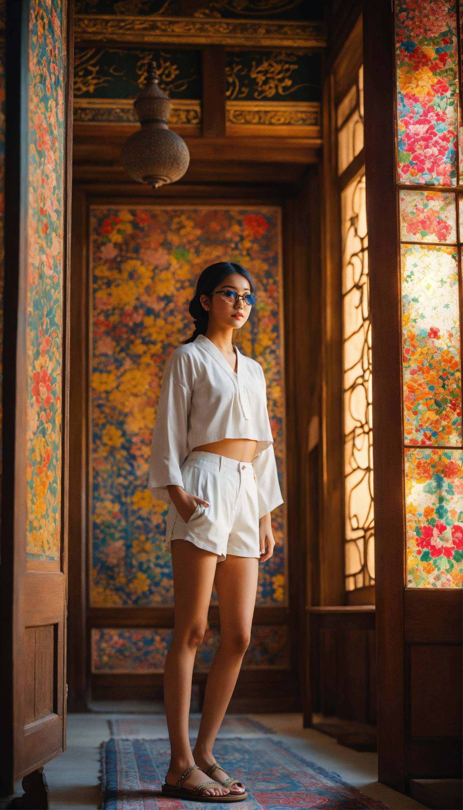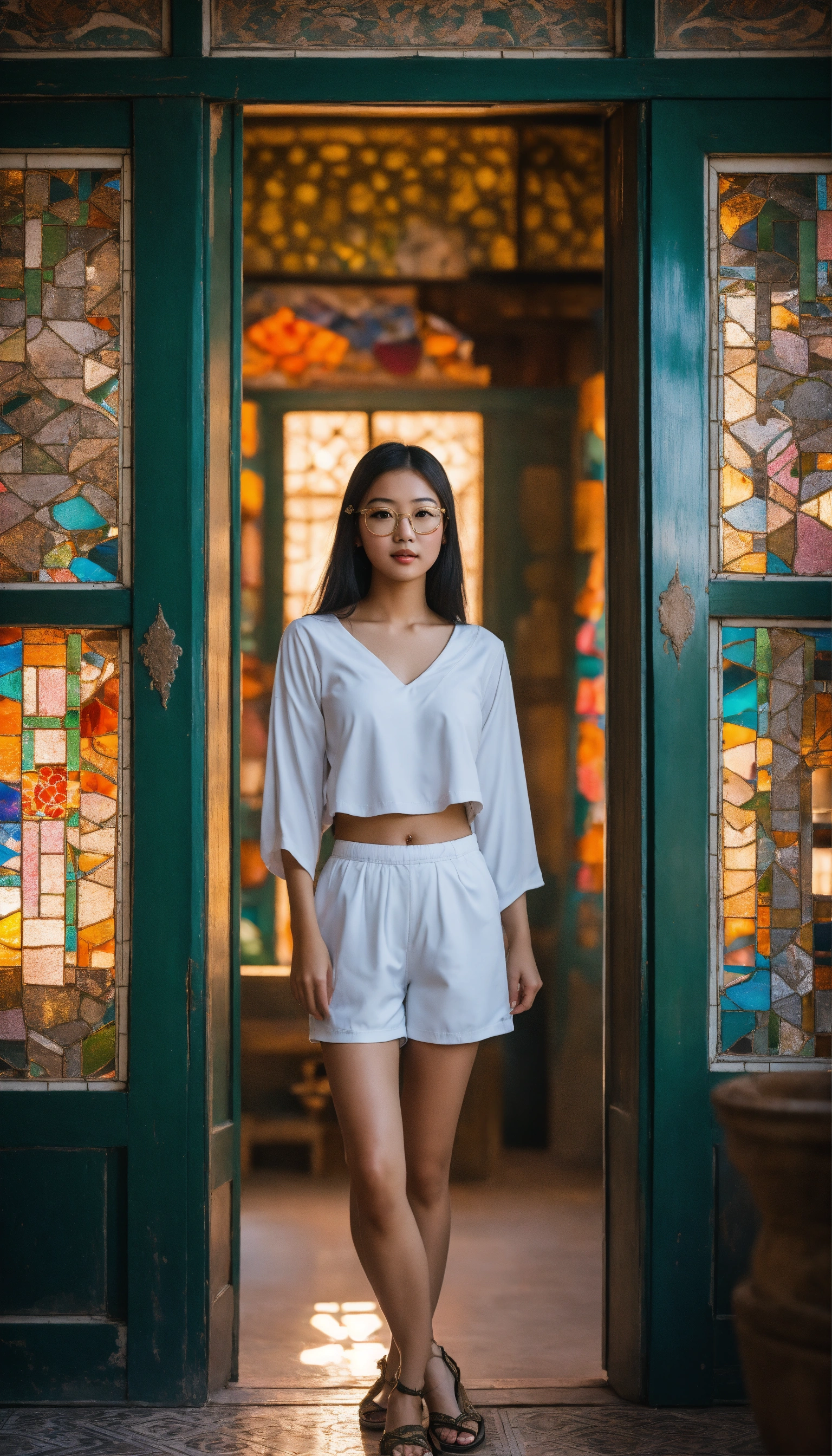 Portrait of a beautiful japanese schoolgirl wearing a white crop top and white shorts with sandals, standing in a vintage house in yazd with colorful glasses on windows, highly detailed, 32k resolution, cinematic lighting, dramatic lighting, vertical shot, iranian architecture, persian culture background