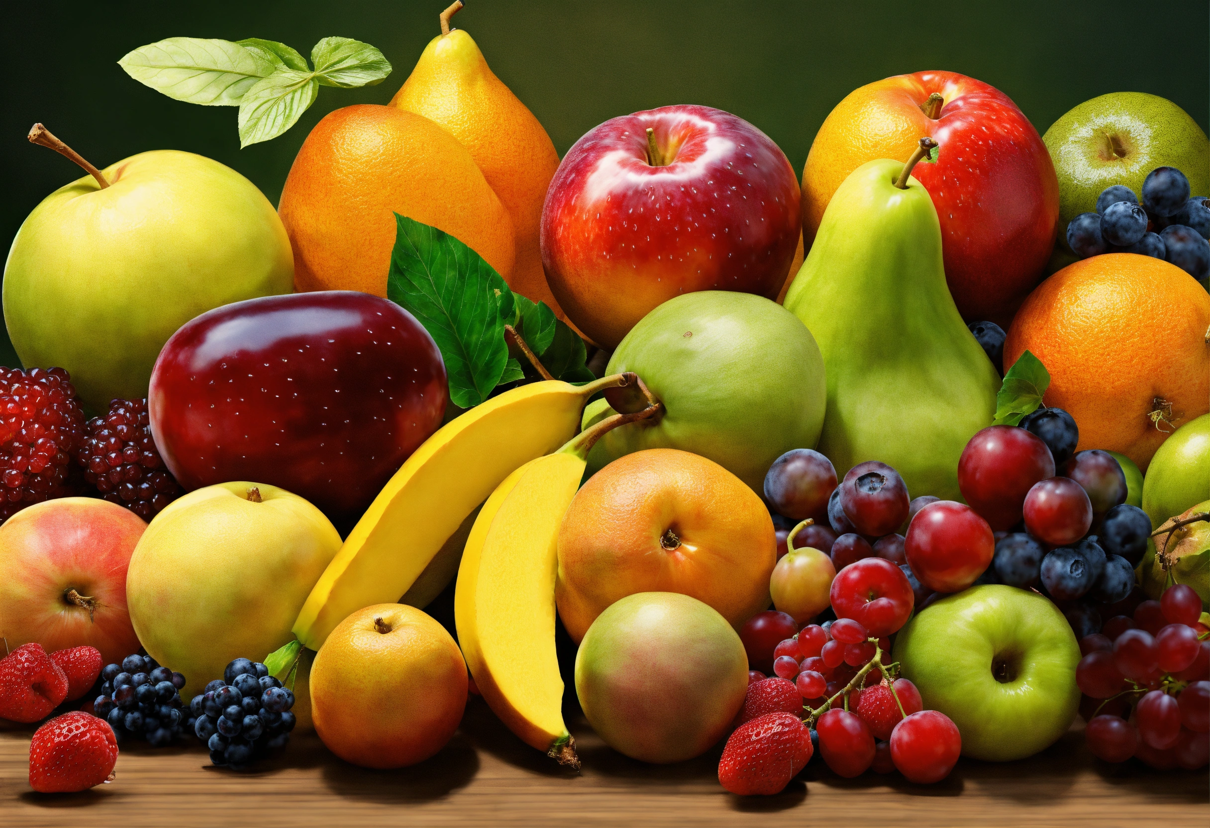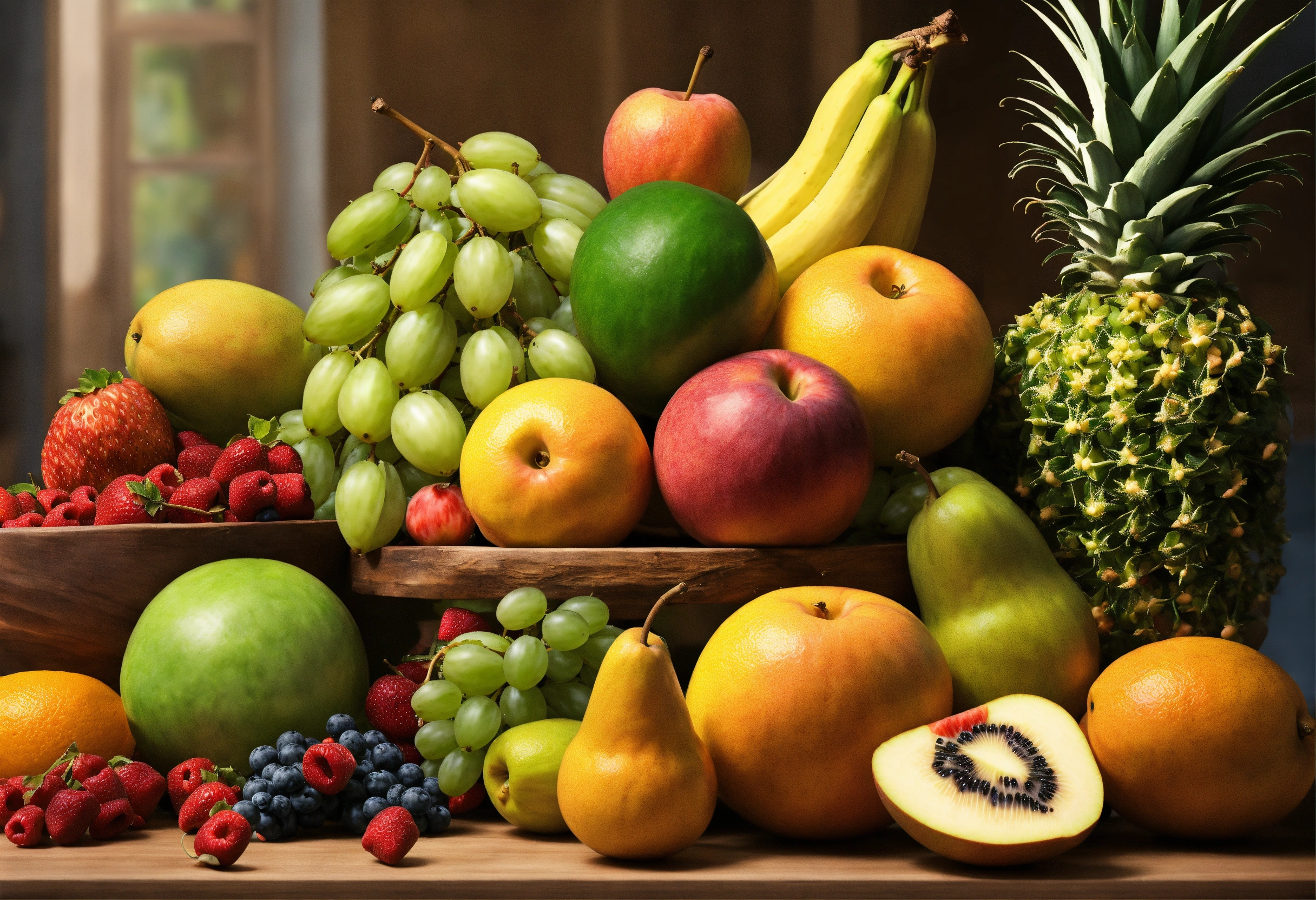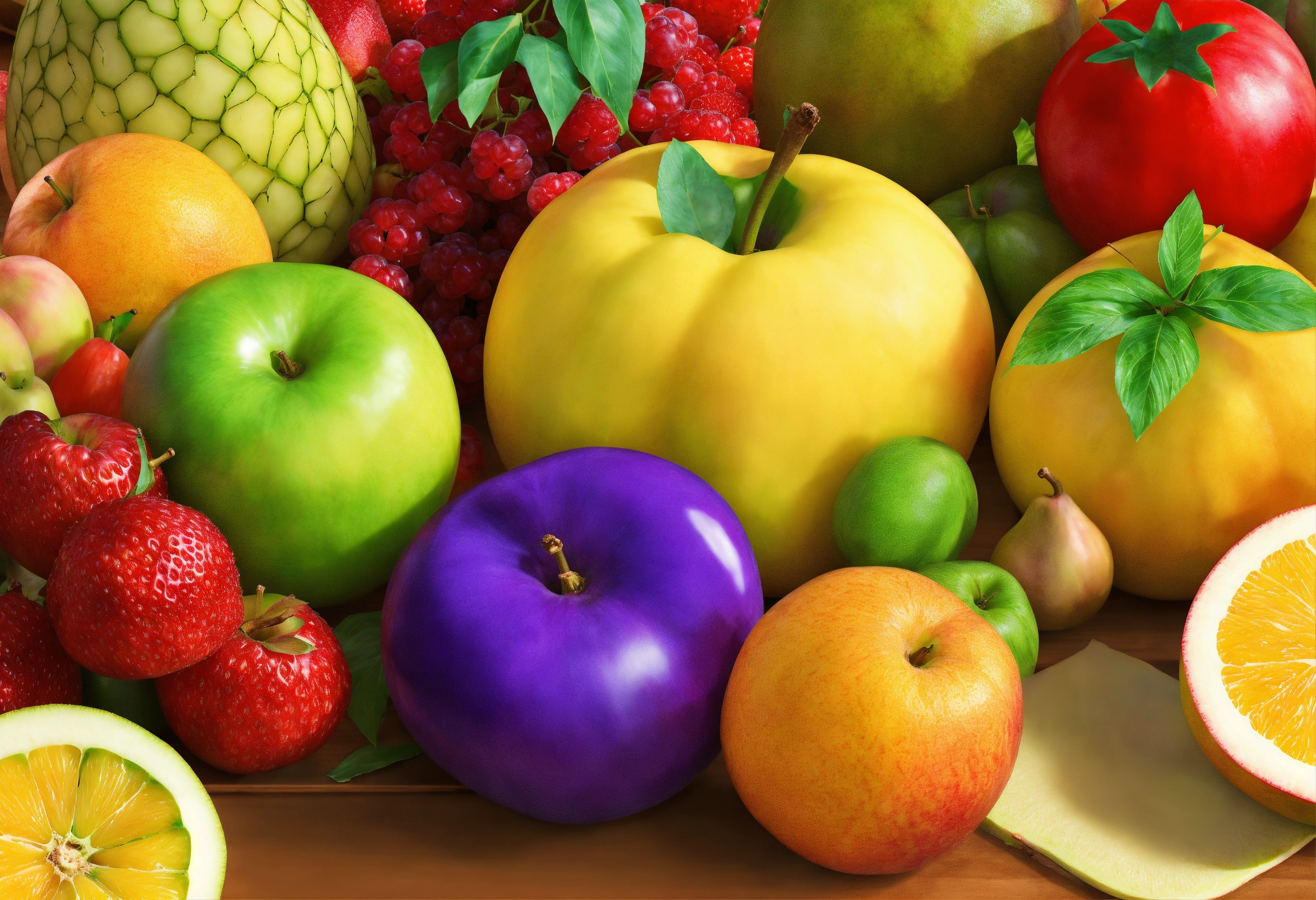 Many different fruits on the table, many colors, forms, shapes, sizes, no overlapping, super detailed, realistic
