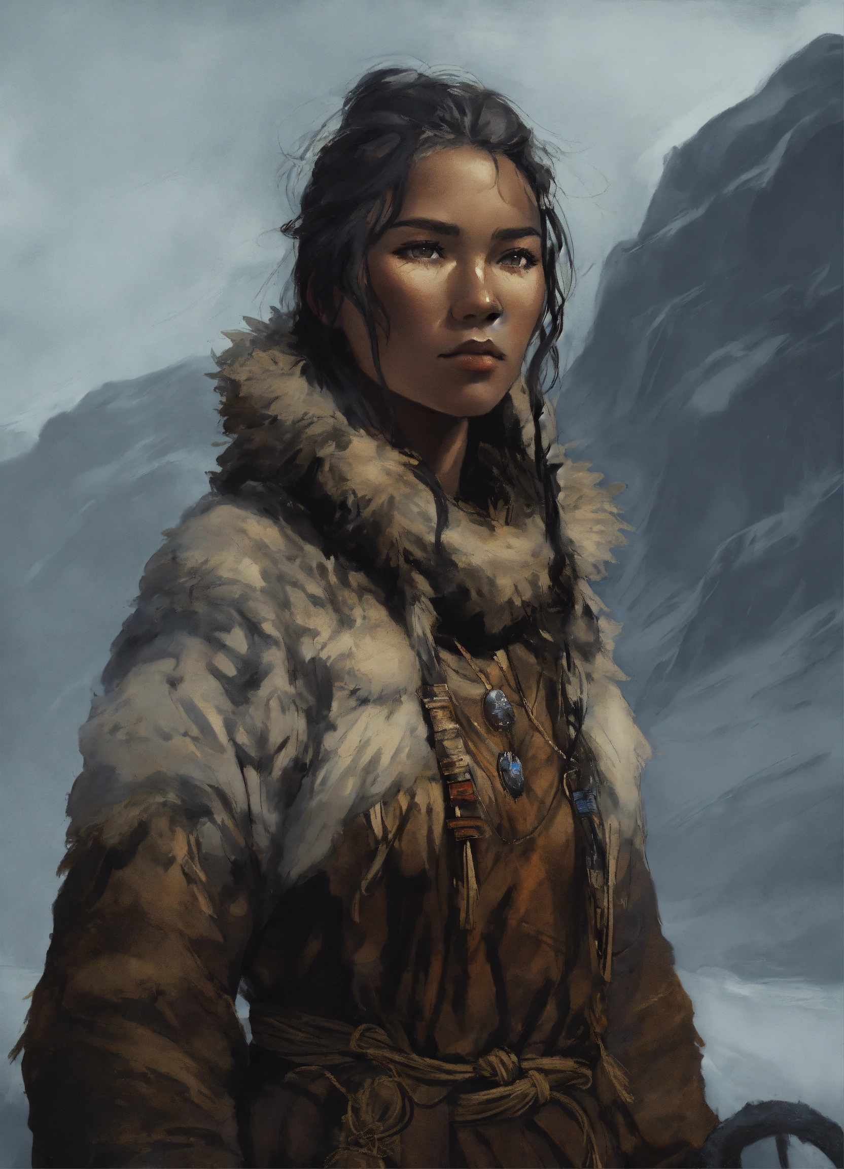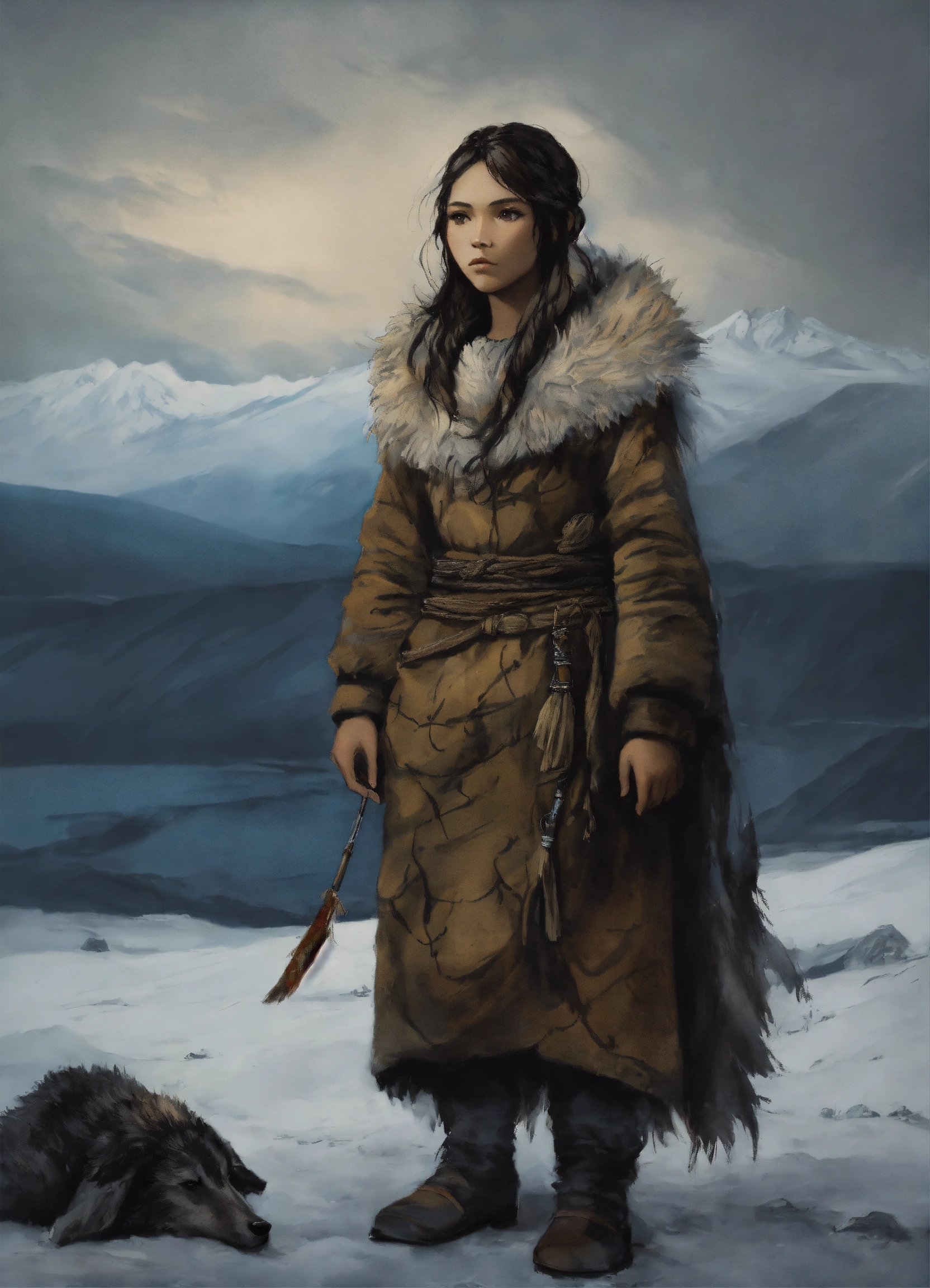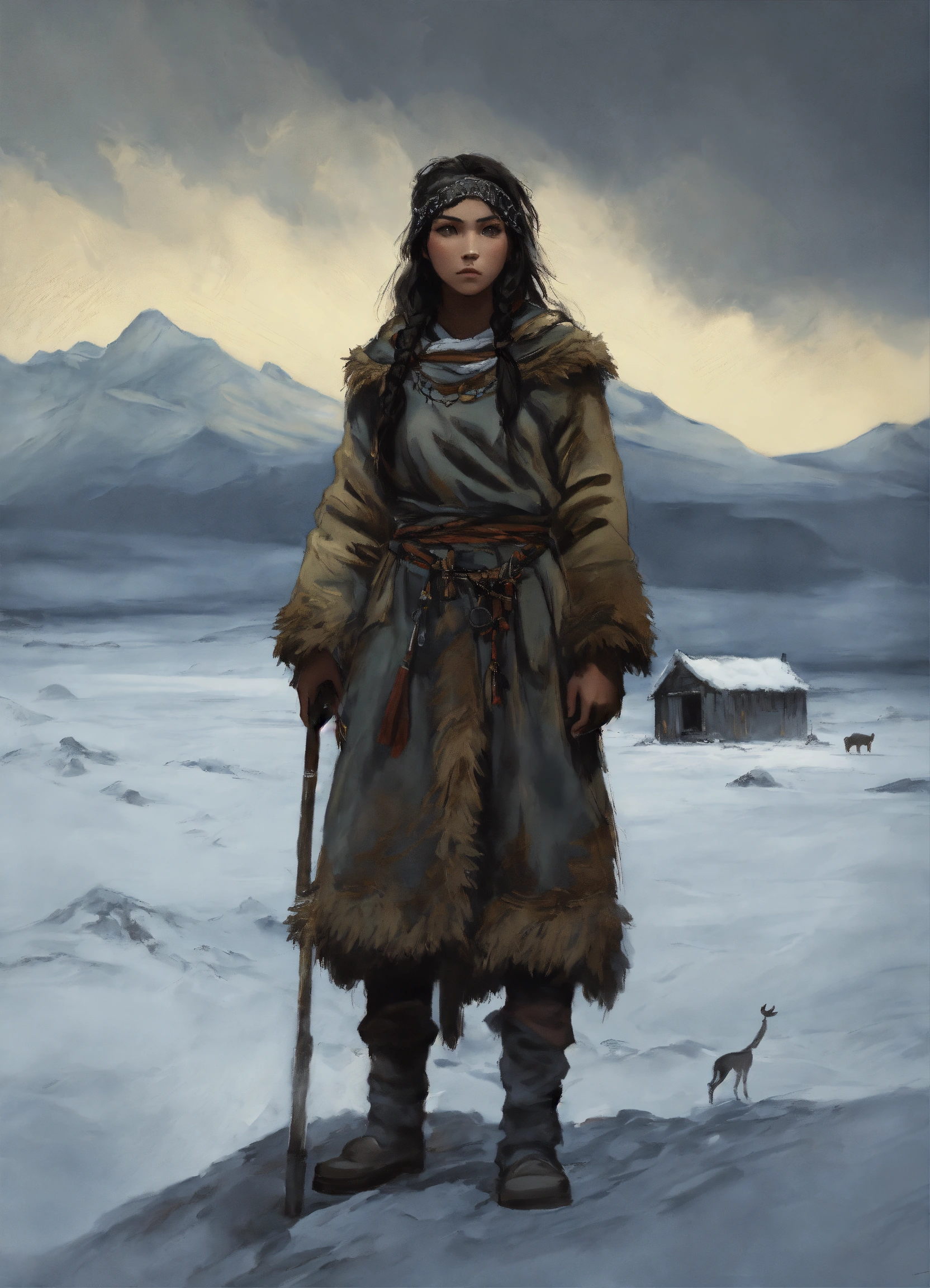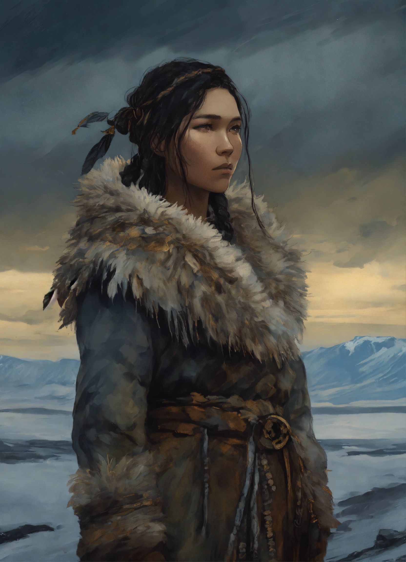 Painting of a young siberian chukchi woman wearing paleolithic arctic clothing, dark fantasy, 8k, outlined silhouettes, dark hues, gloomy and depressing ambient, in the style of tom björklund and alan lee, inspired by senua's sacrifice and horizon zero dawn