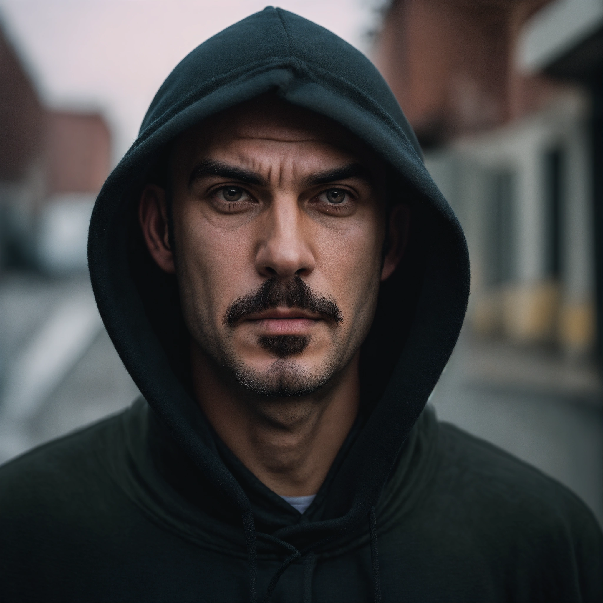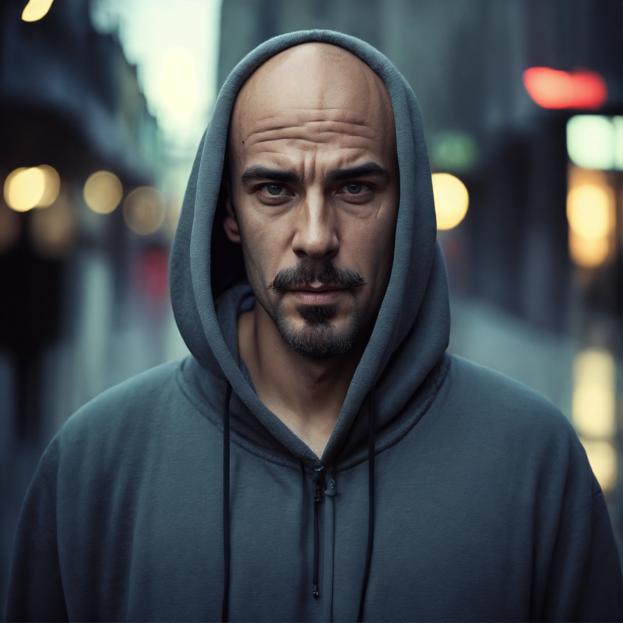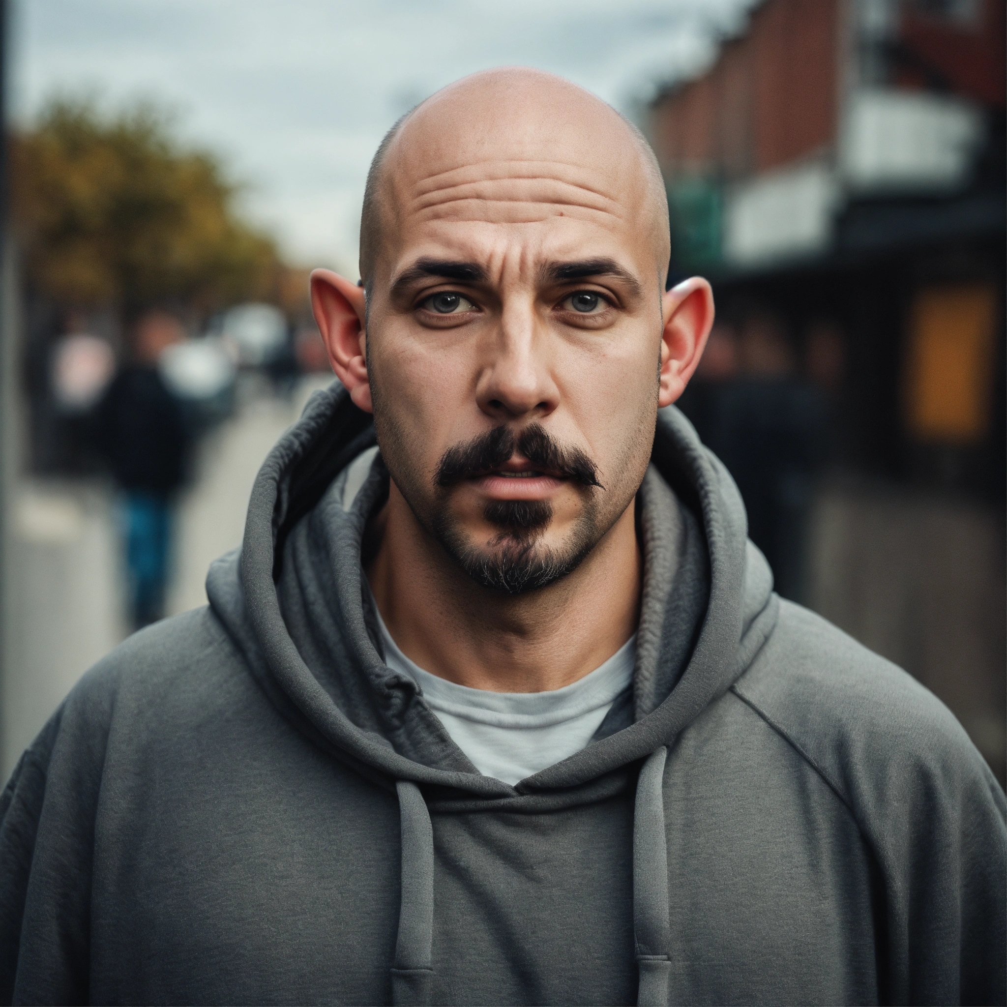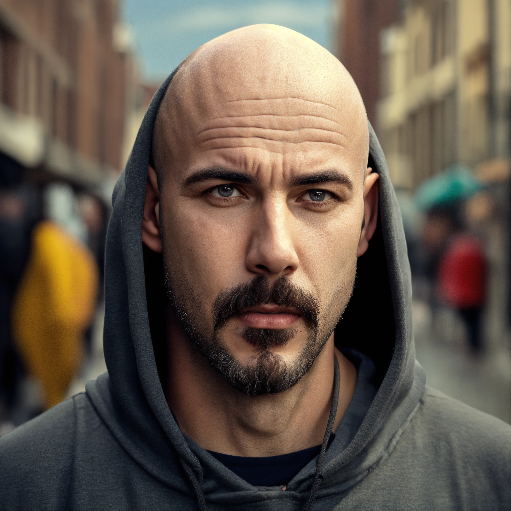 A huge bald creepy looking man with a little goatee and no mustache, extended protruding brow forehead, grey eyes, crooked mouth, large ears, wearing a hoodie up over his head, standing out in the street