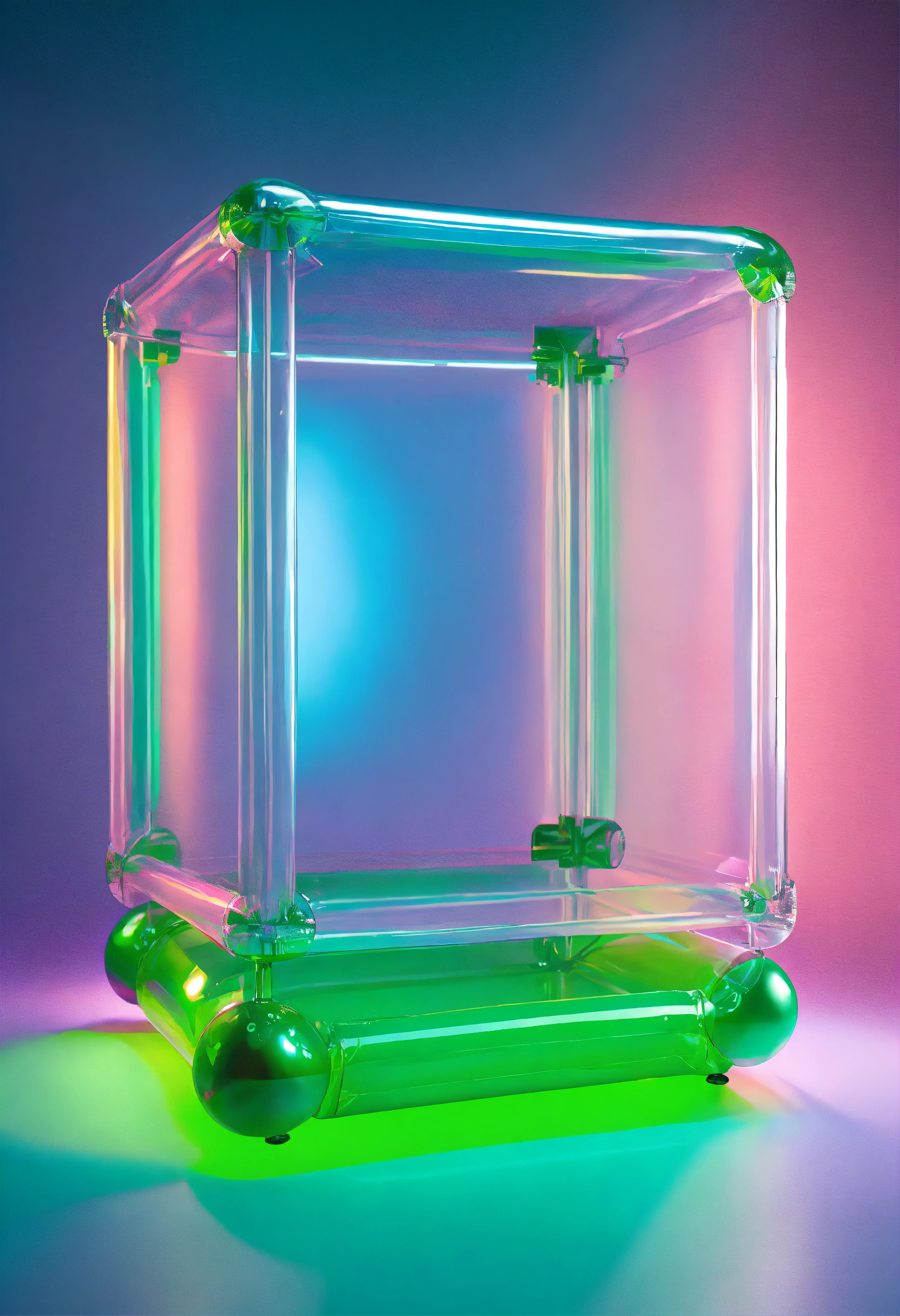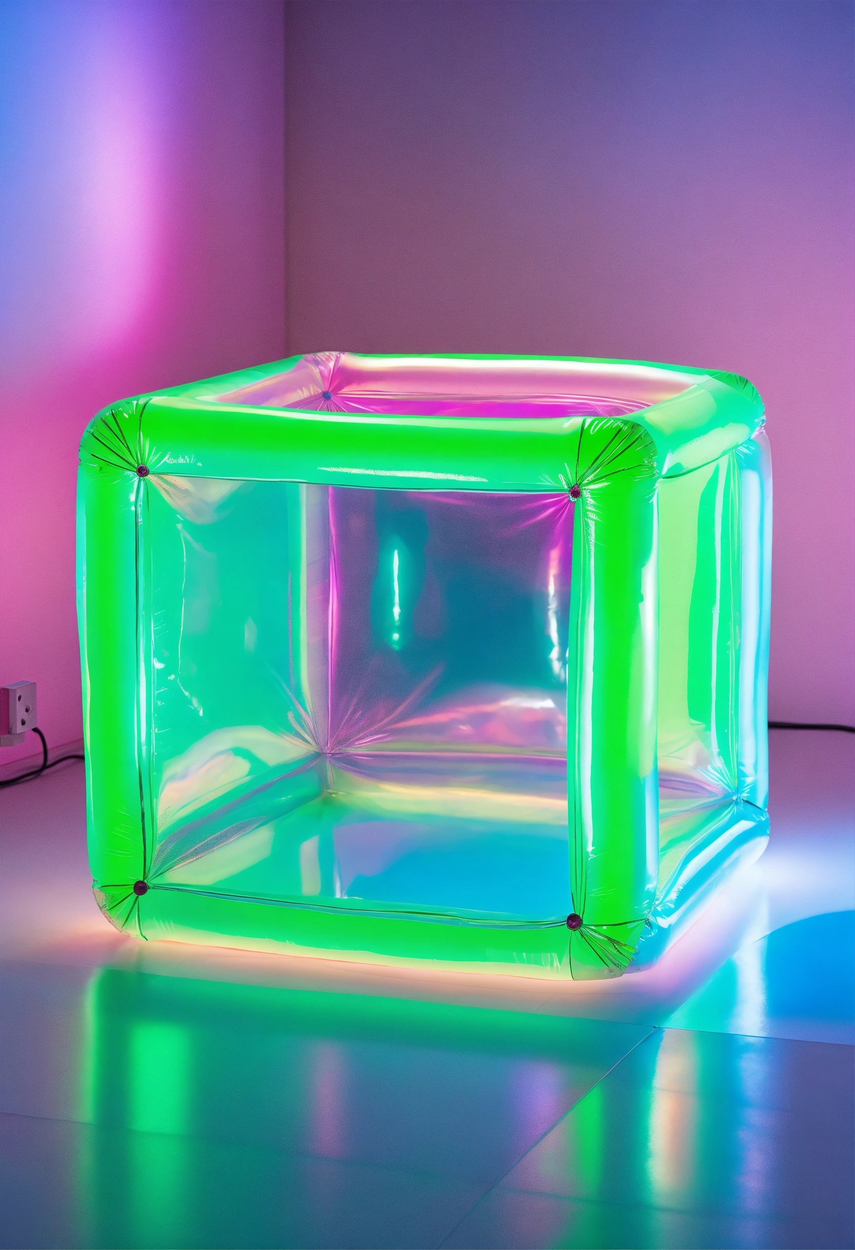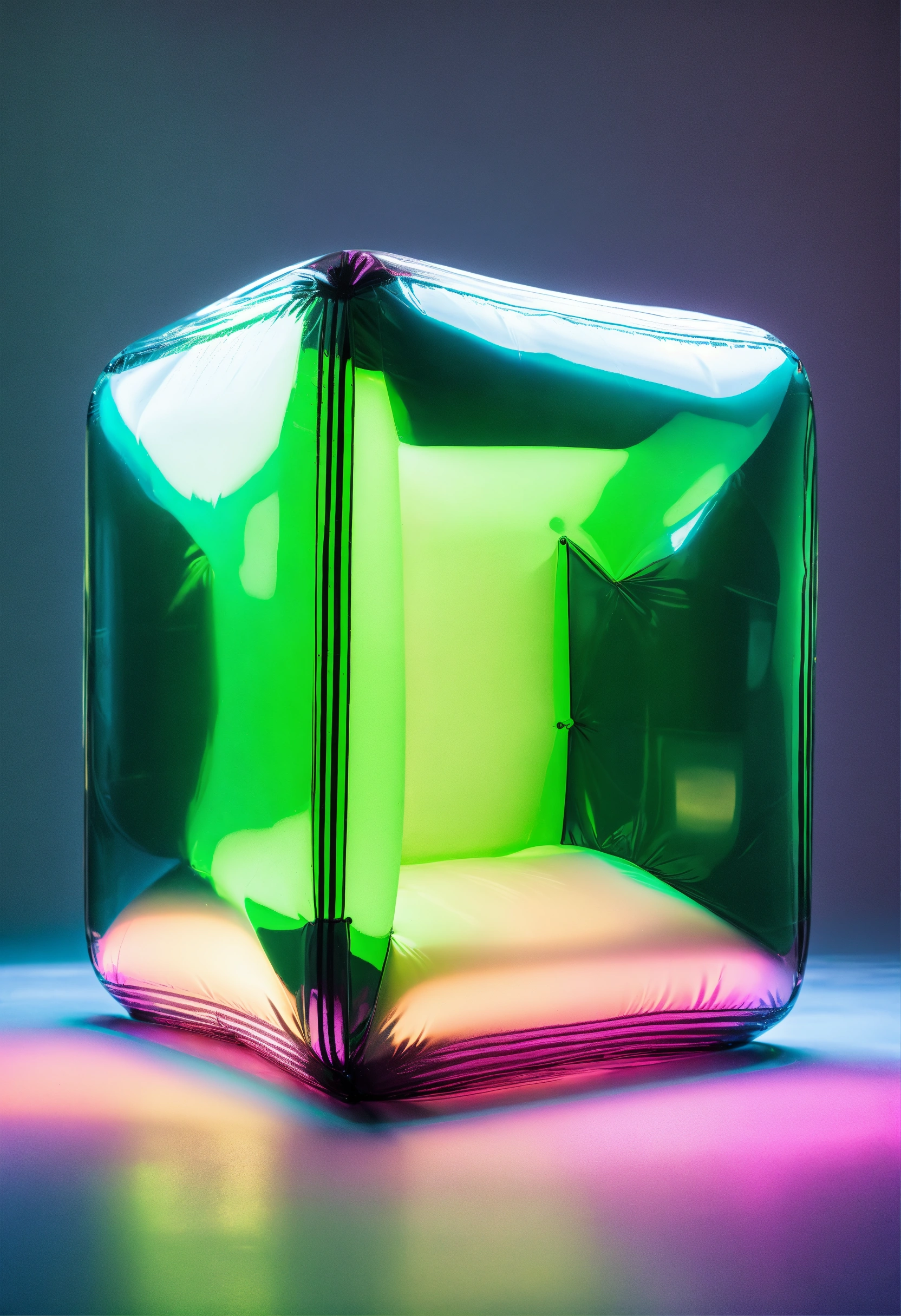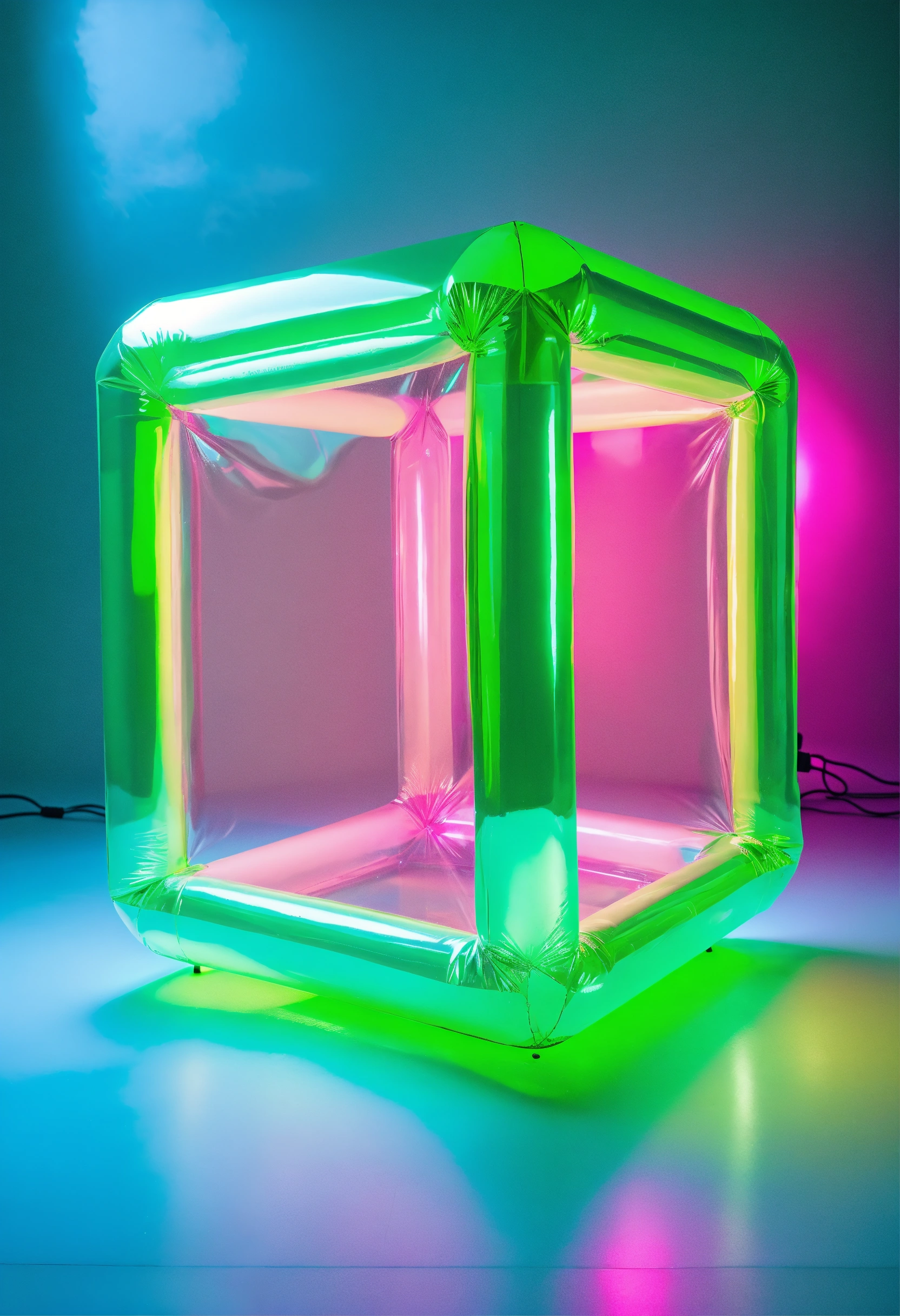Inflatable clear cube, studio photography, some neon green accent color, 4k, iridescent! muted color background! realistic!
