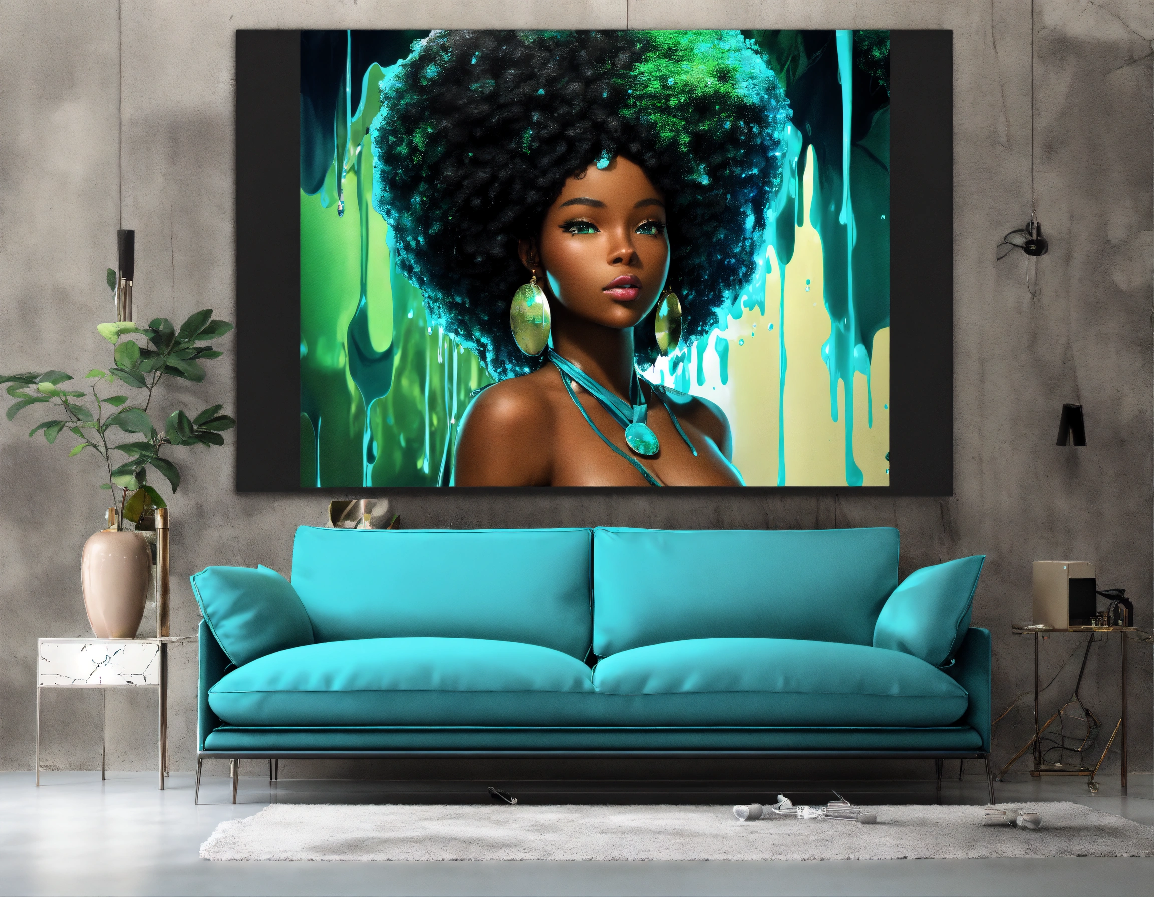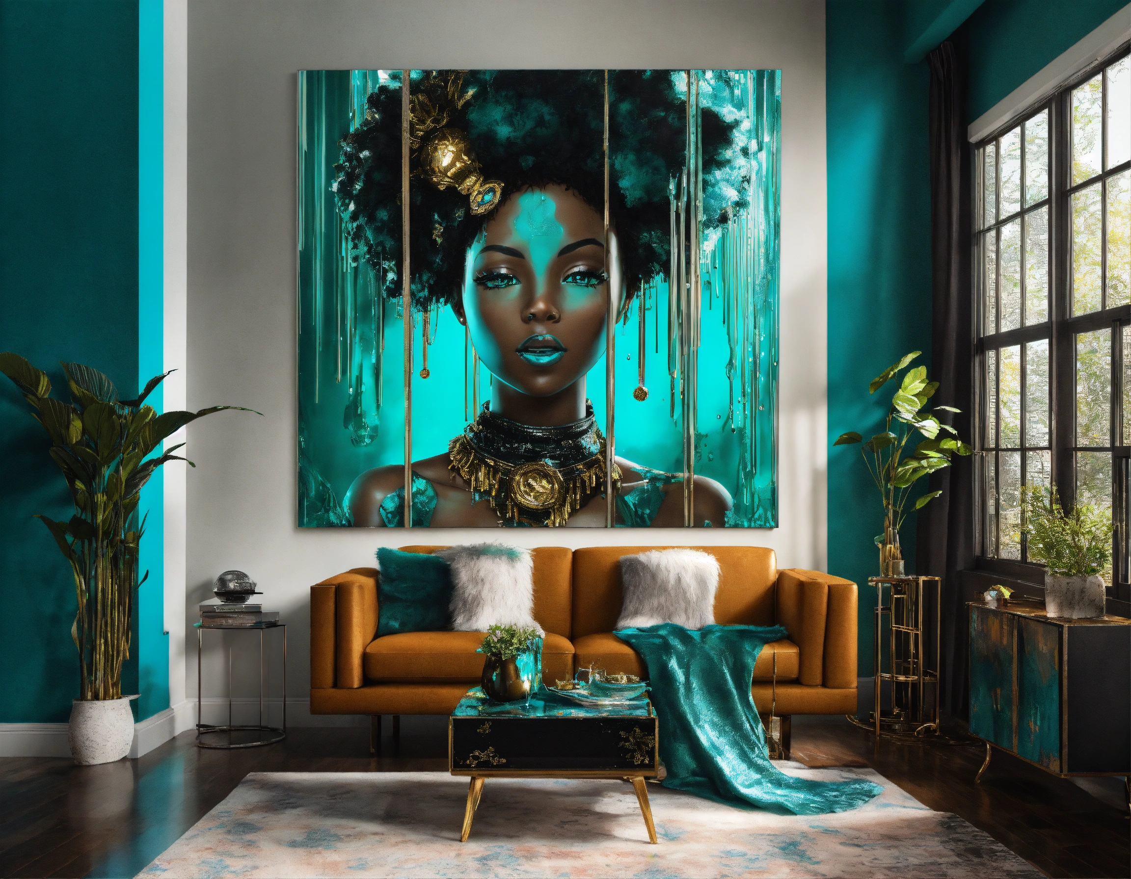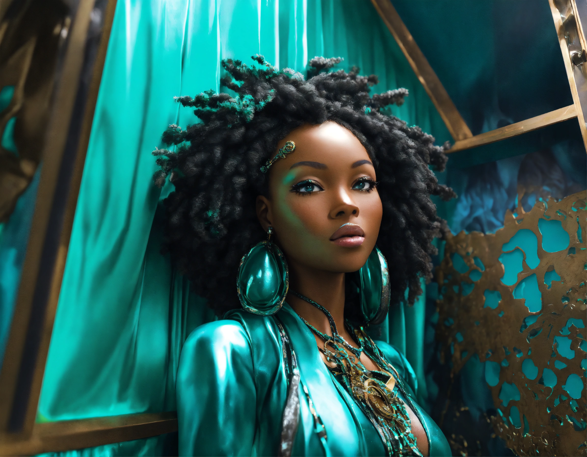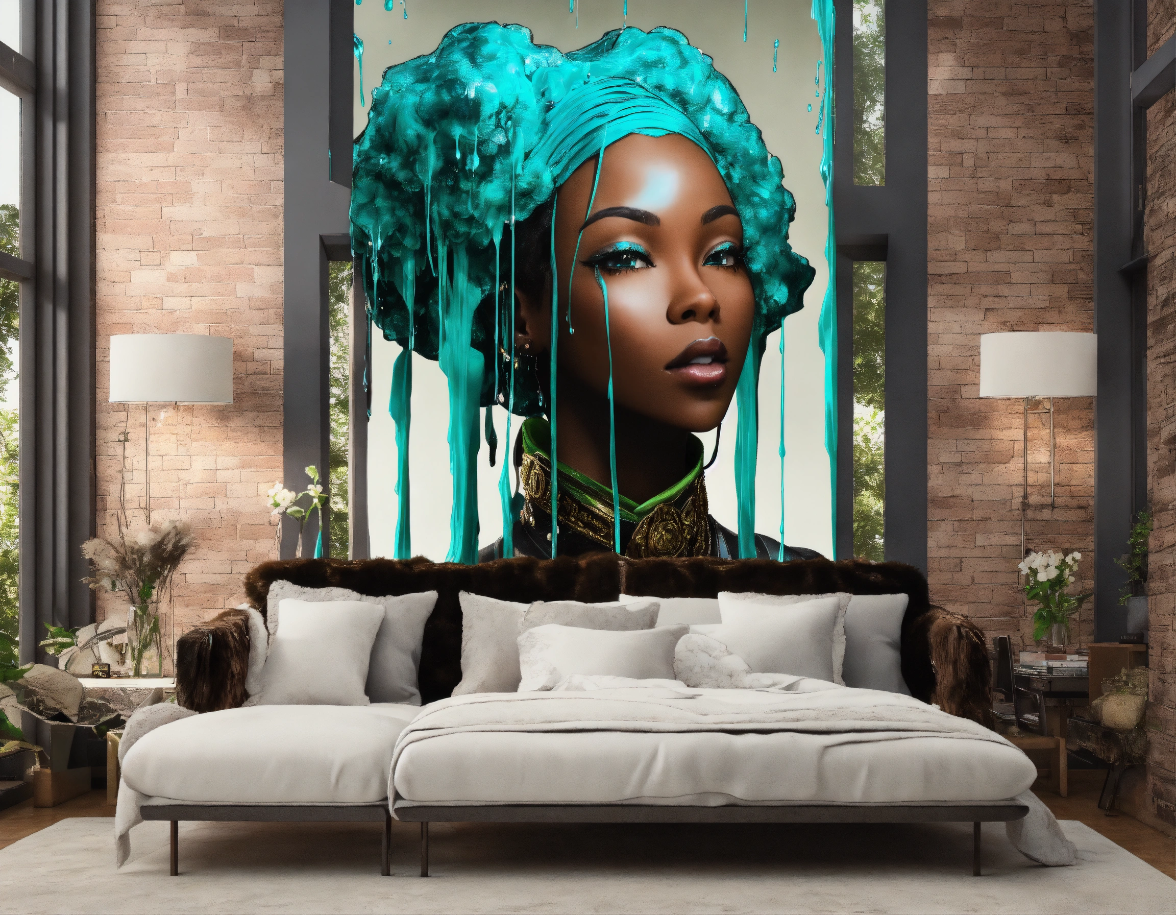 3d wall art, moe anime african american afrocentric women bursting out from through the wall, color scheme turquoise blue, black, metallic white, lucky green, afrocentric woman, draped in leathers silks and fur and dripping liquid metal down the wall, wide shot view moe ghibli anime inspired