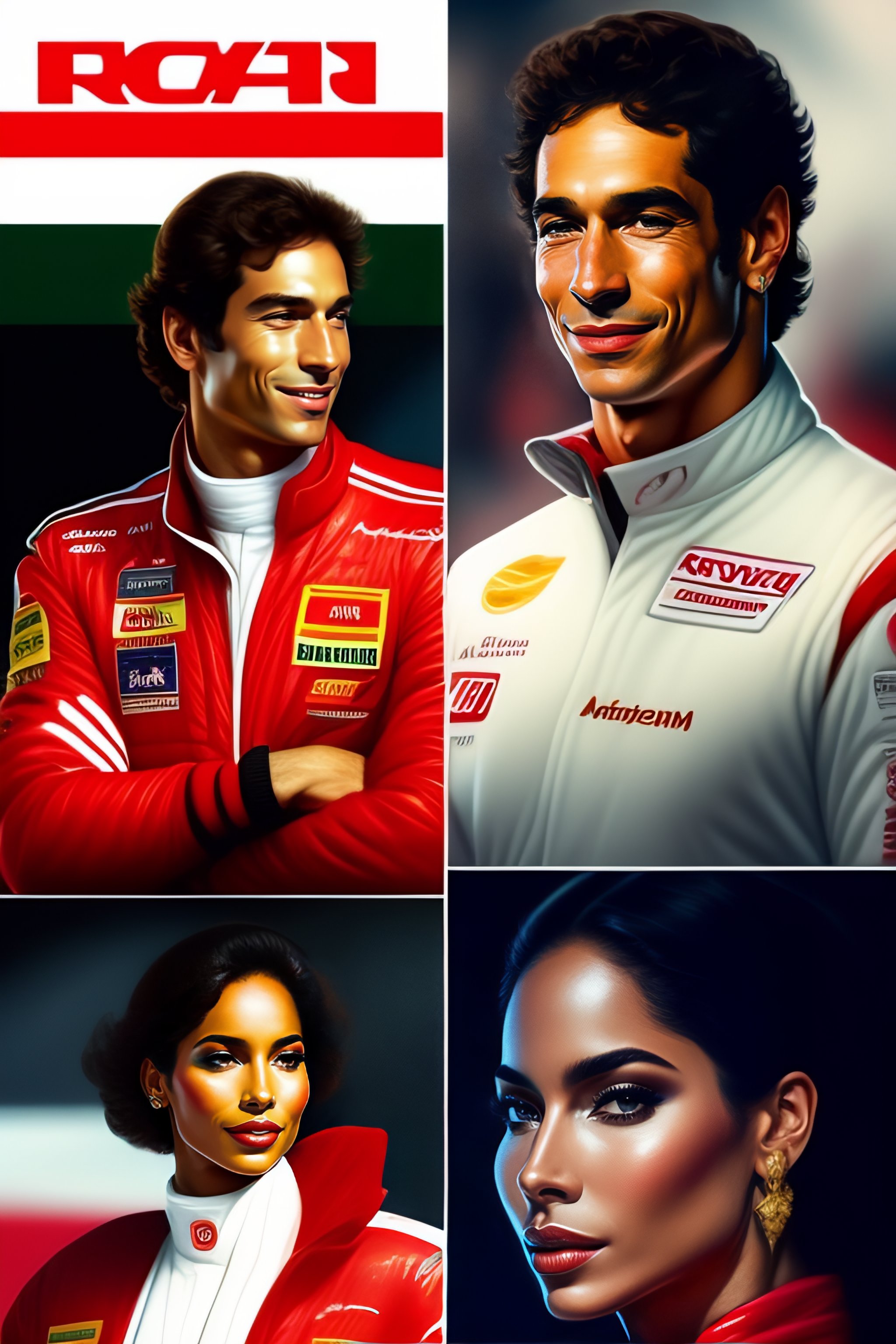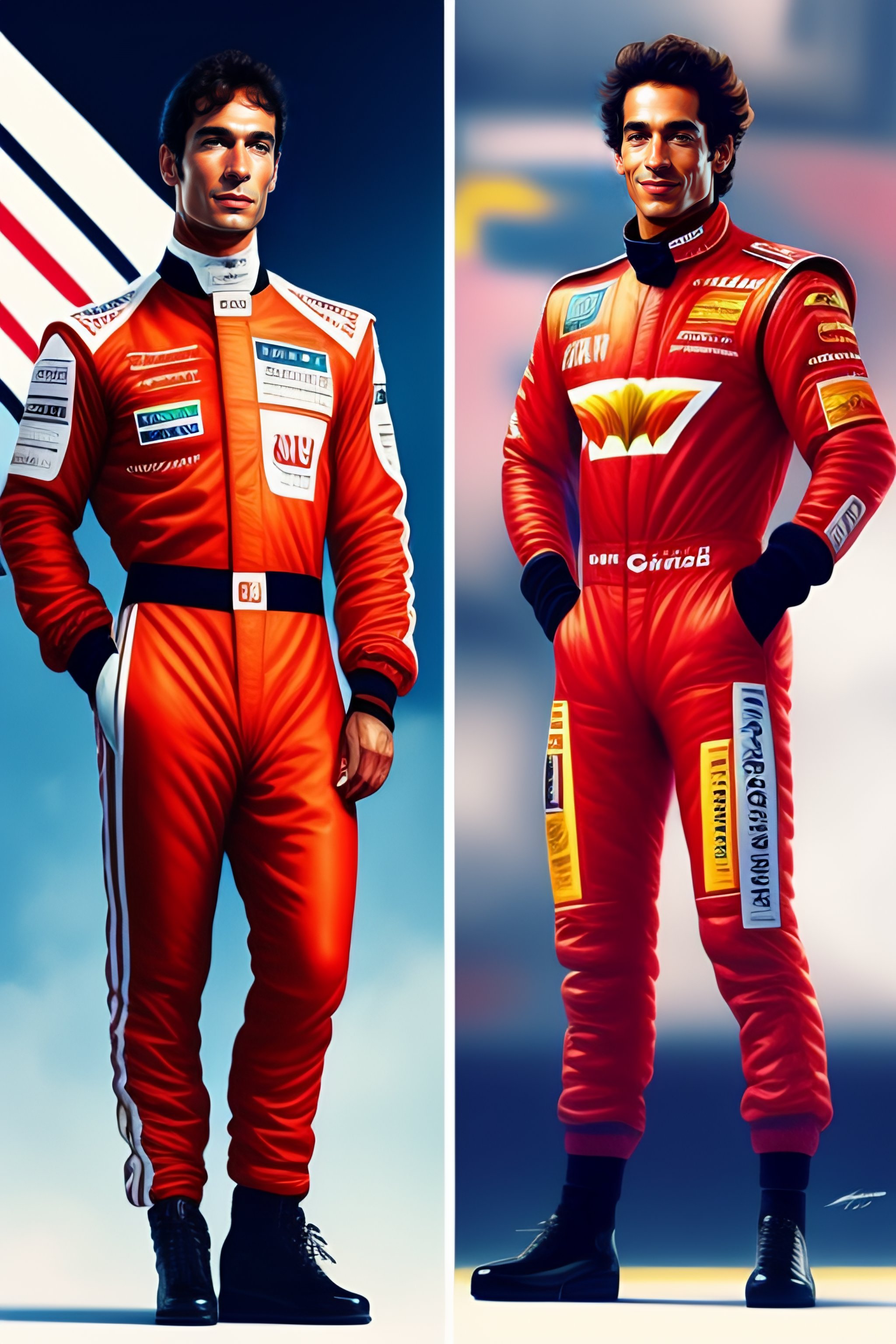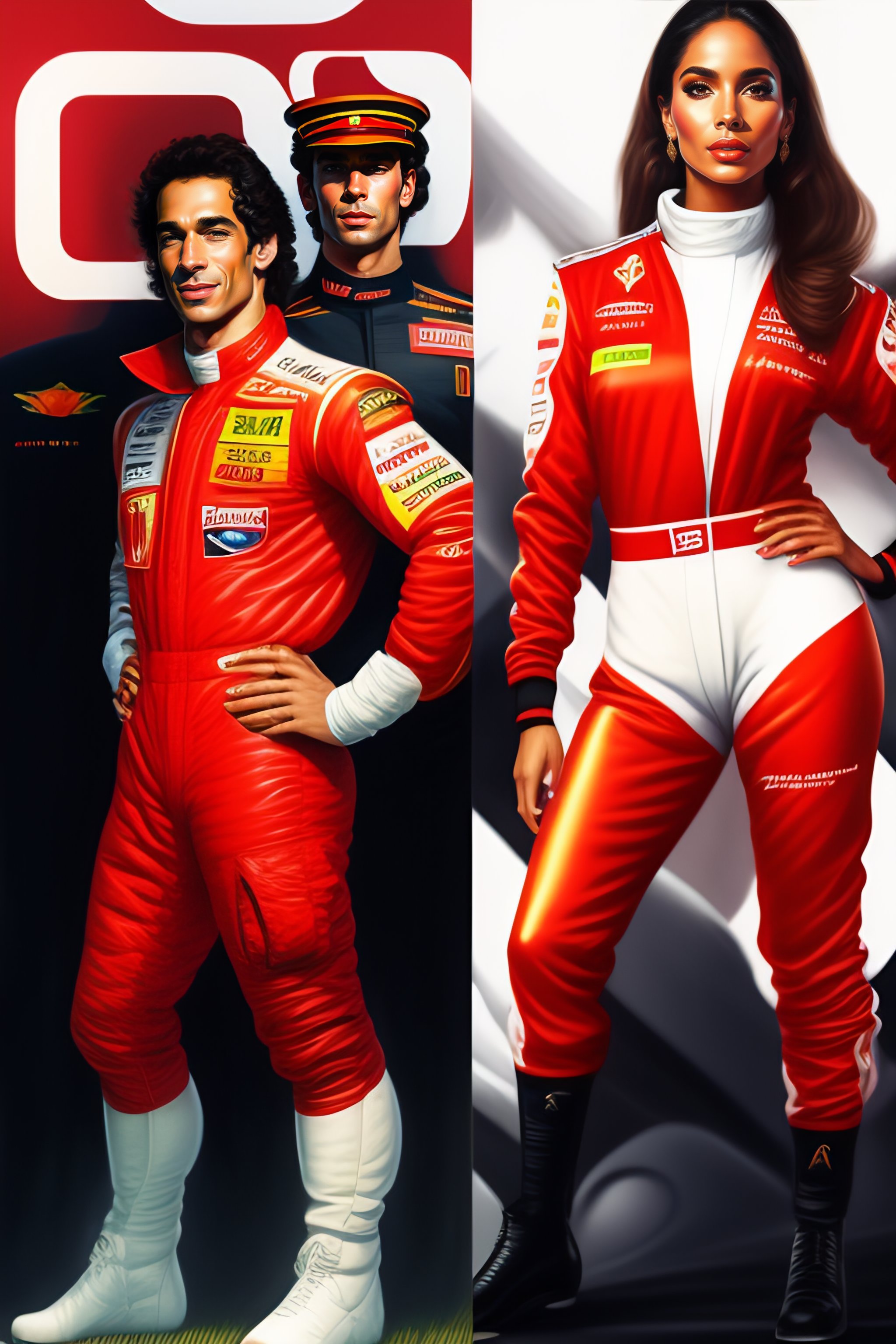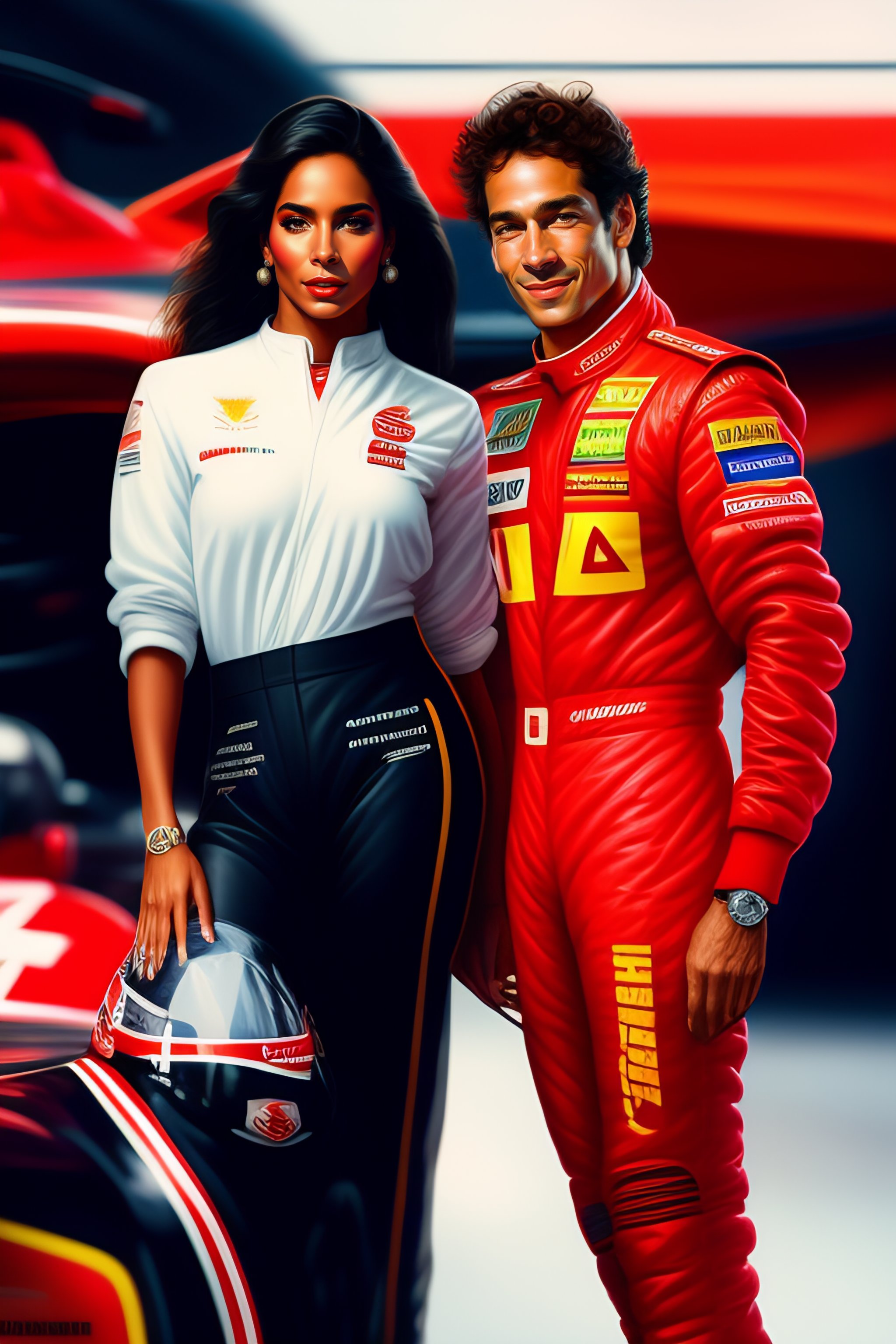 Ayrton senna and anitta as a formula 1 professional, full body view, wearing in red pilot suit, little chickens in background, art by caravaggio, rossdraws, artgerm.