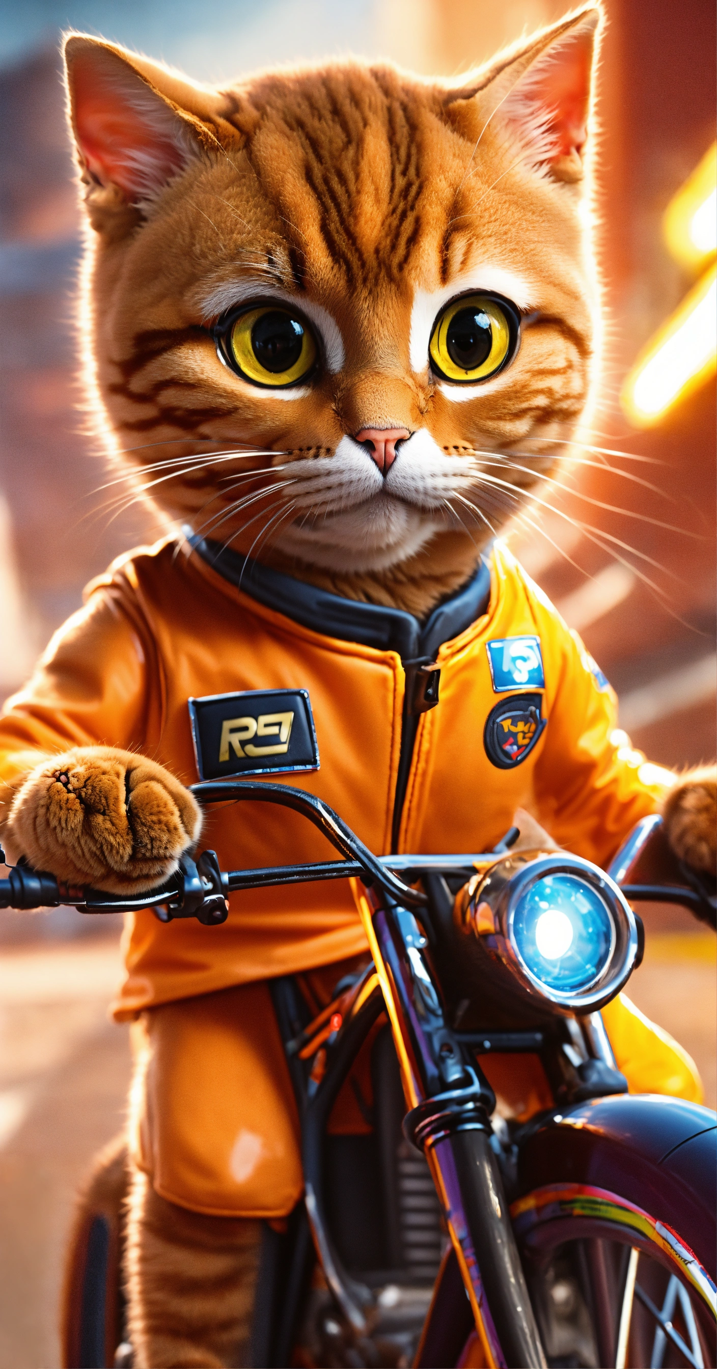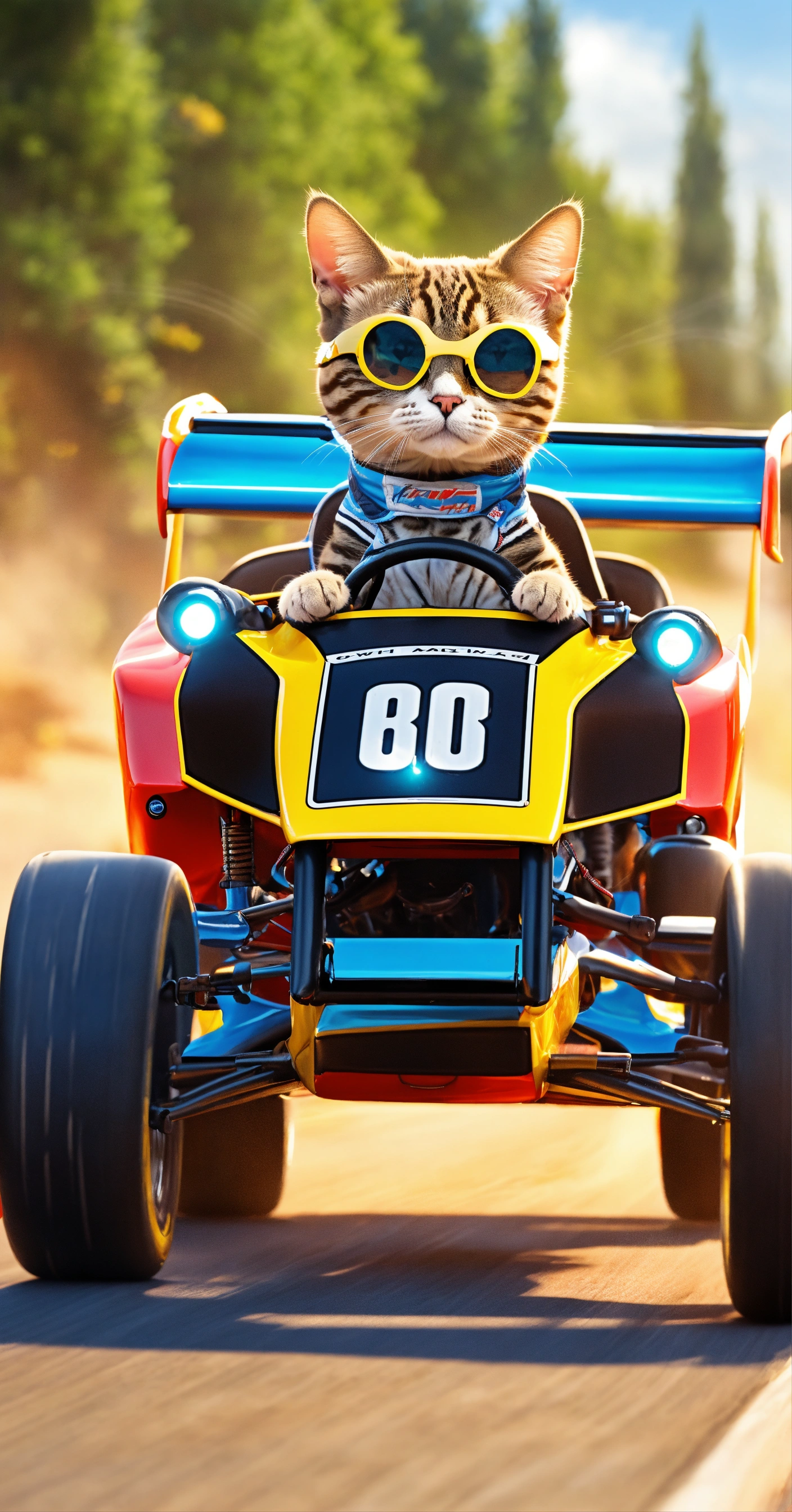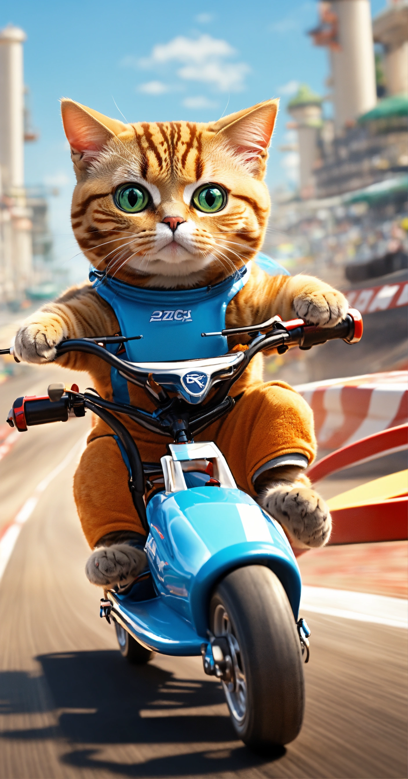 Create a picture of a cat as a fearless race car driver, competing in a high-speed miniature race car bike on a thrilling racetrack.