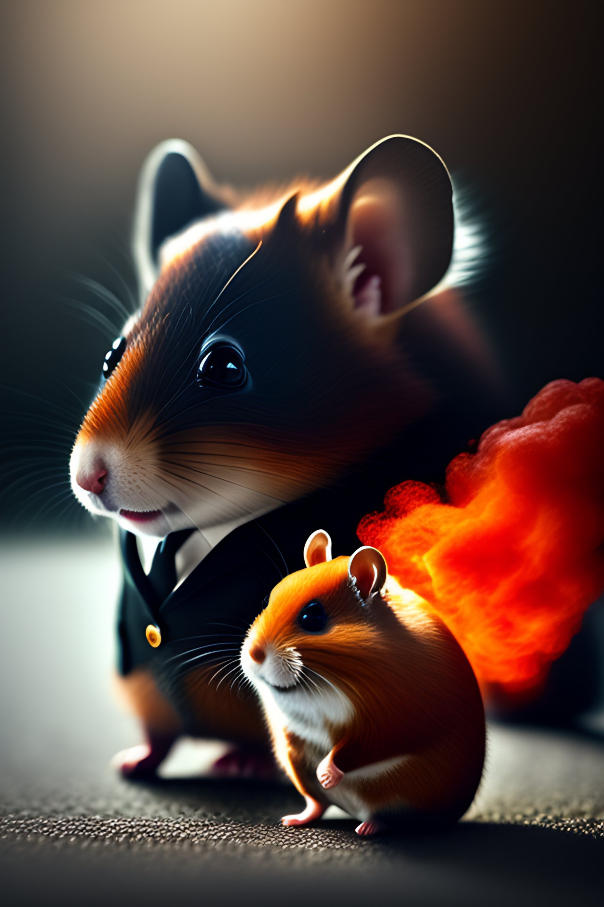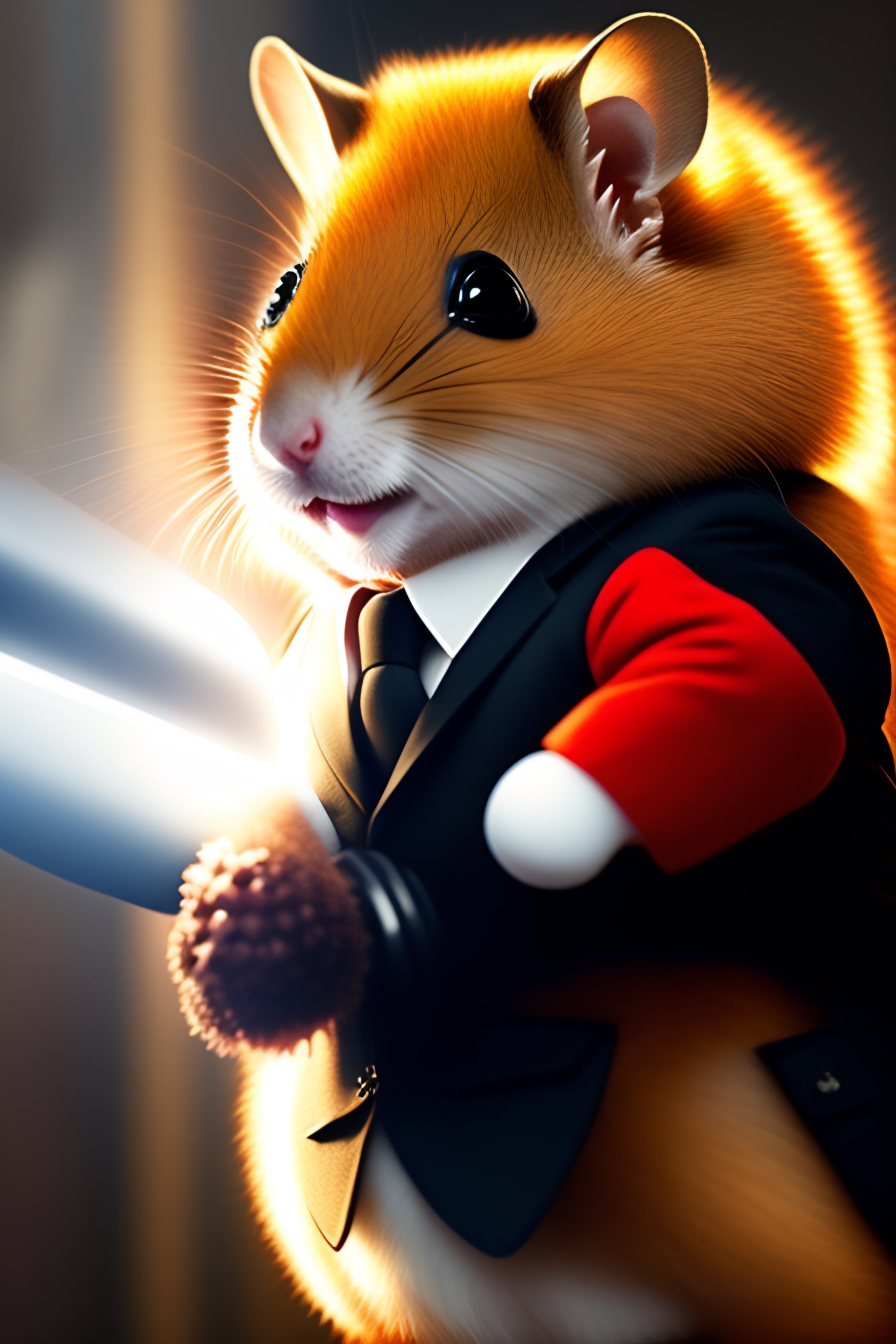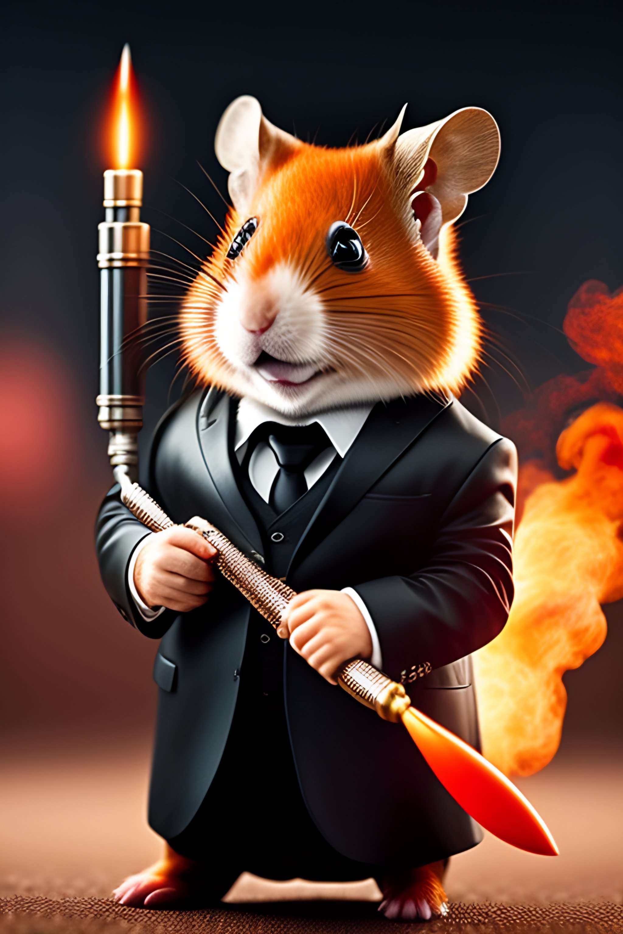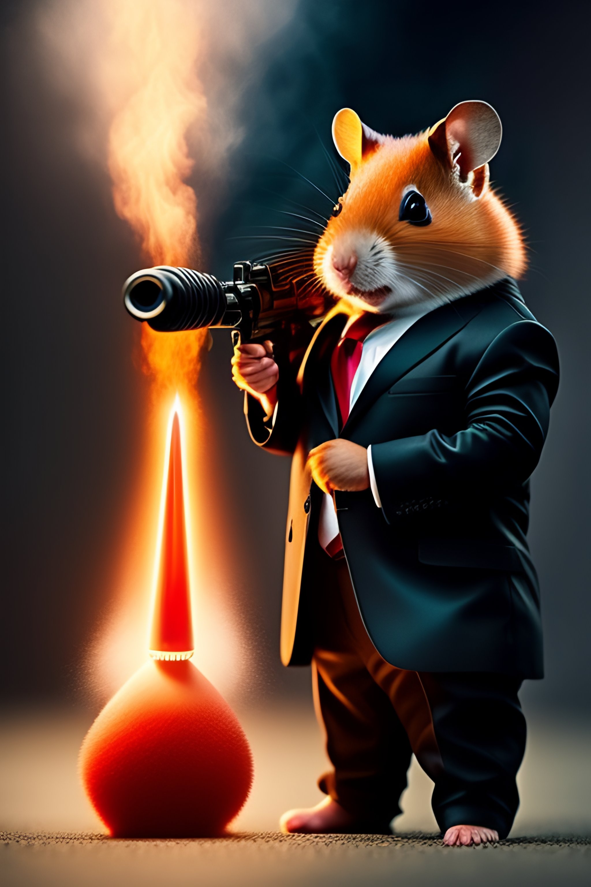 Anthropomorphic red hamster in a bodyguard black suit with rocket launcher