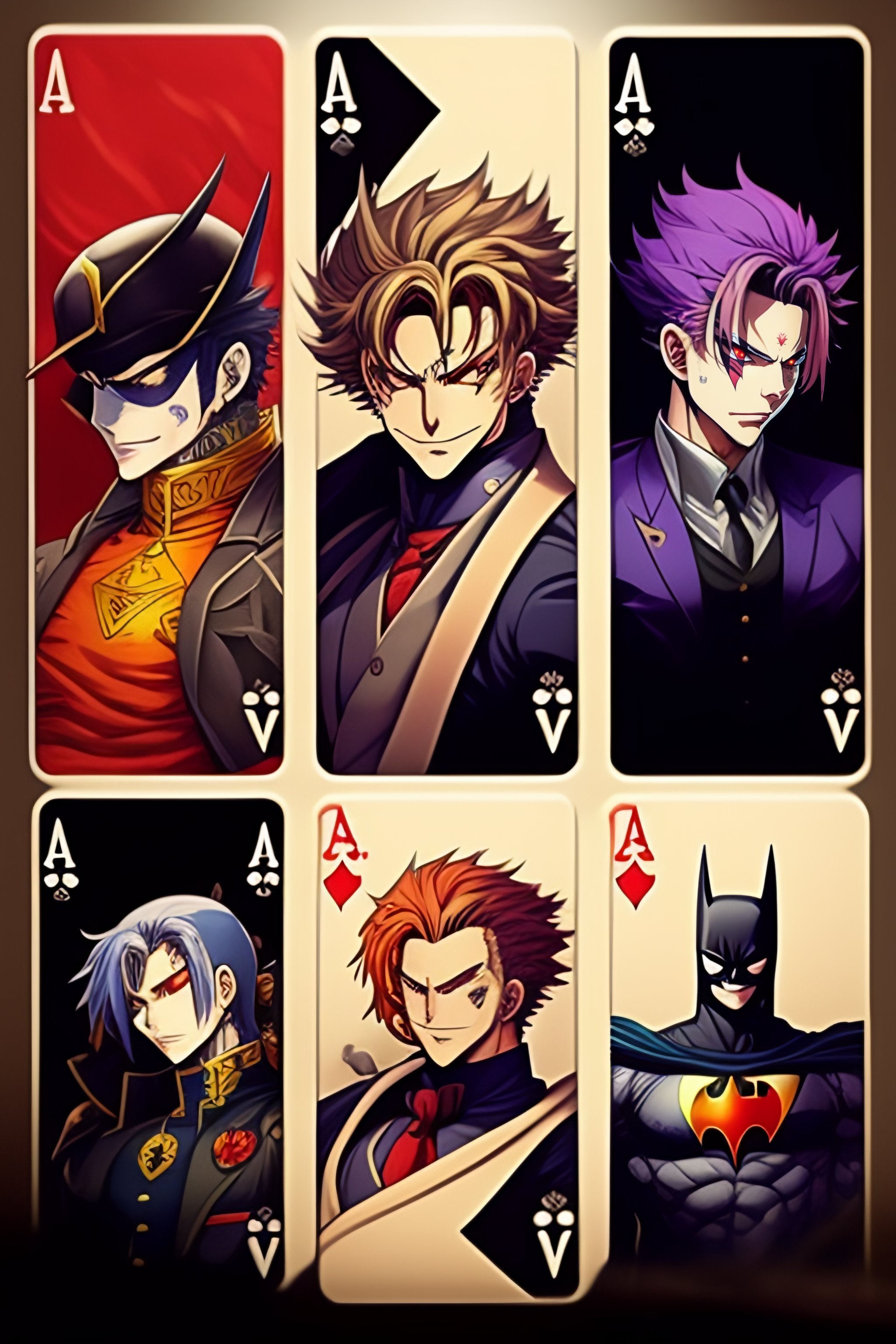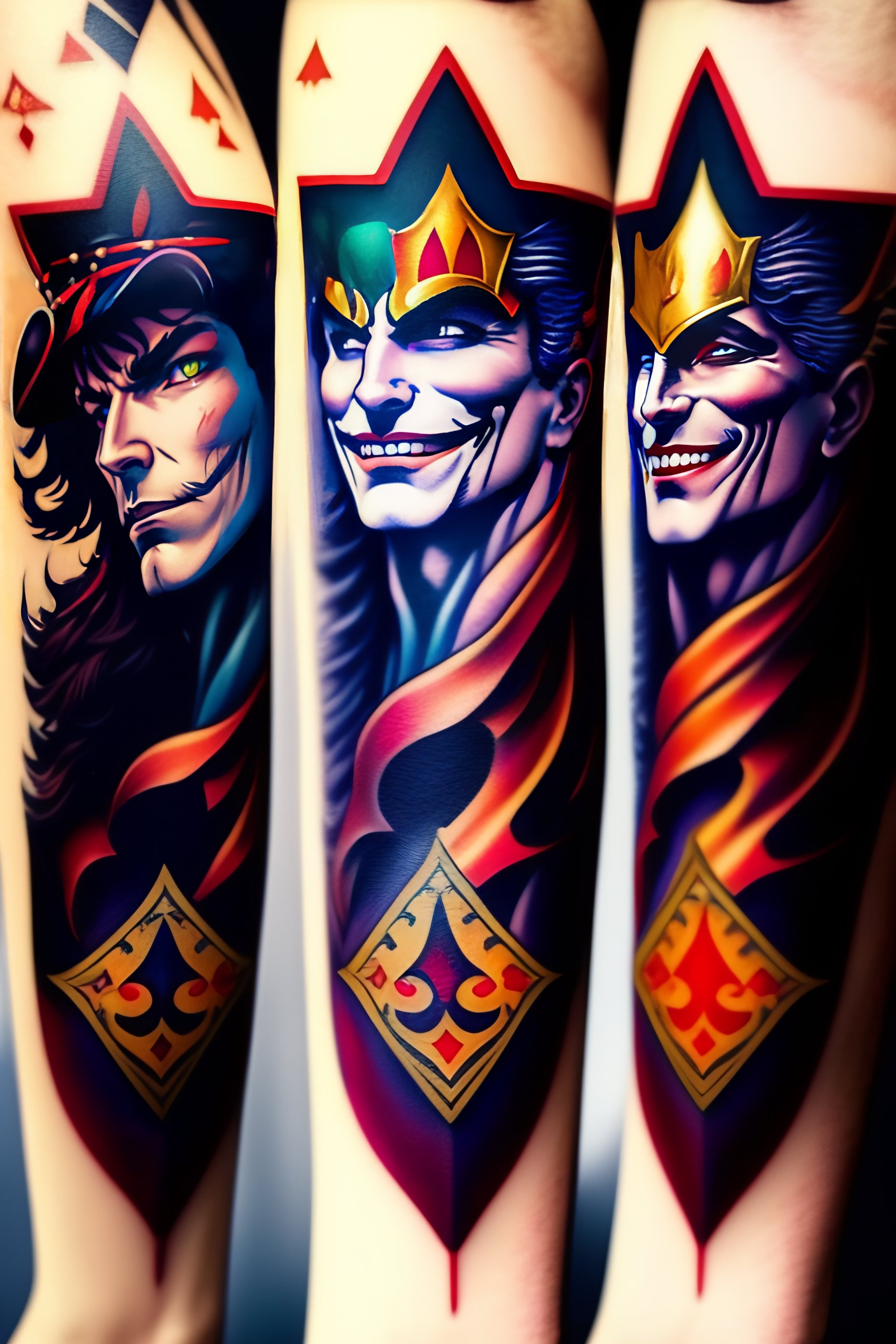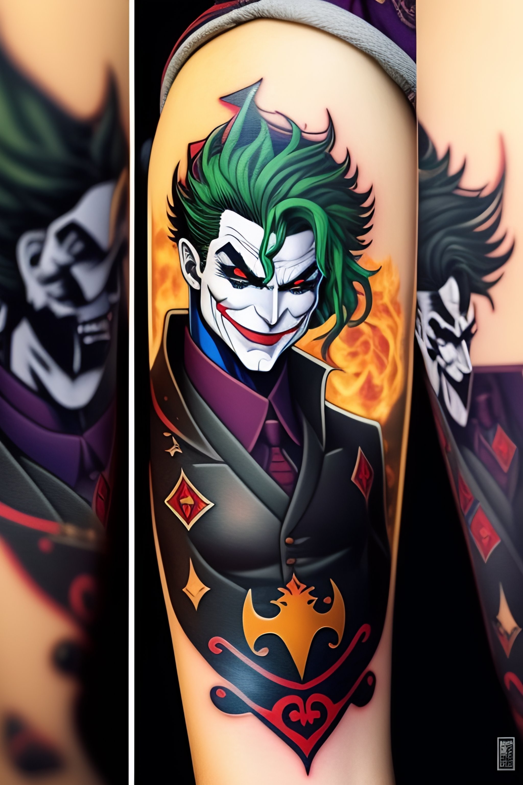 A tattoo of 5 playing cards each one representing one of the folowing character : 1 the joker 2 smoker (fire force anime) 3 gambit (comics) 4 hisoka (hunter x hunter anime) 5 batman who laugh (comics)