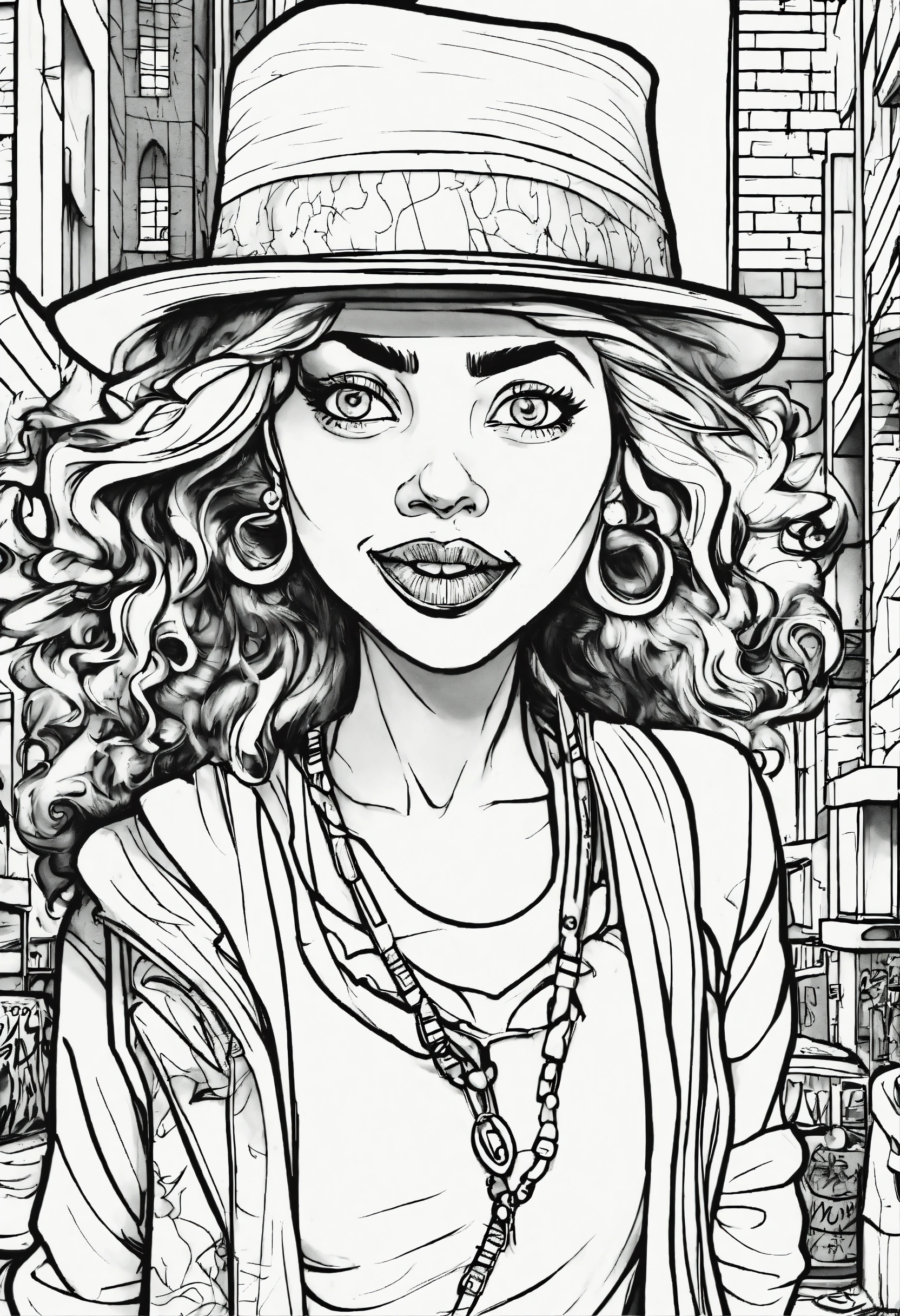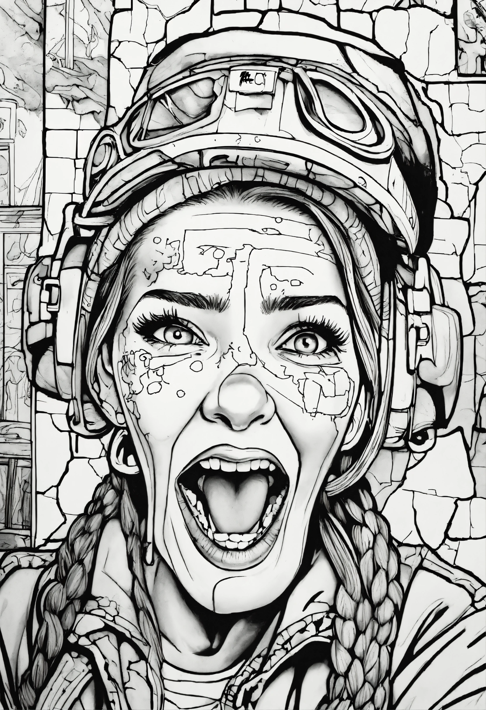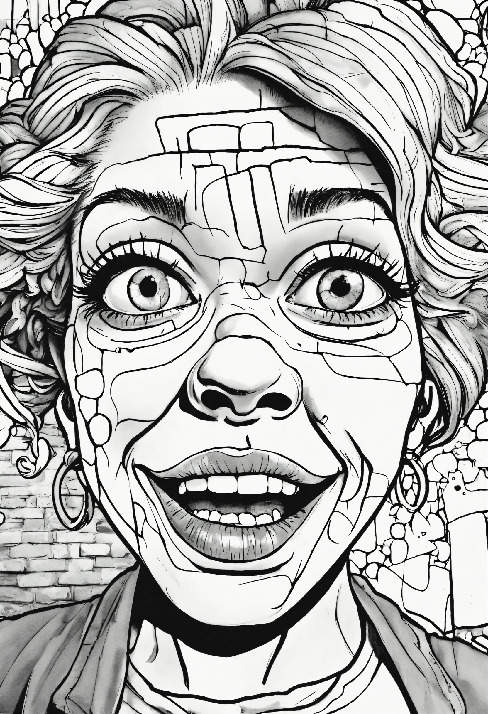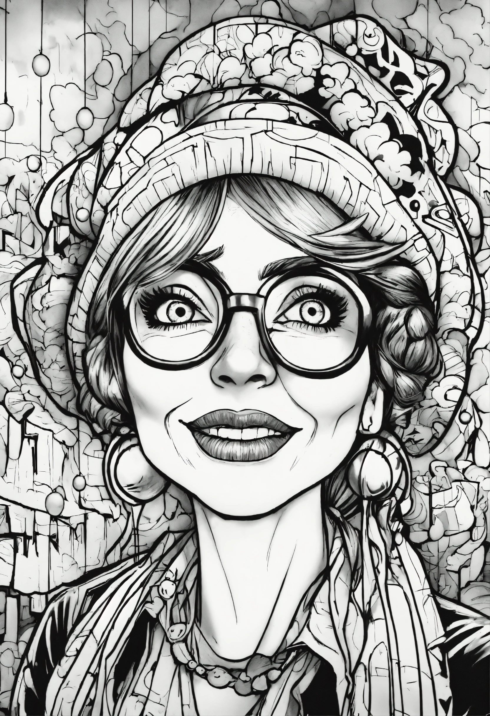 Coloring page for adults, graffiti art, mad magazine character idiot face, woman jerk, black and white, caricature, white background