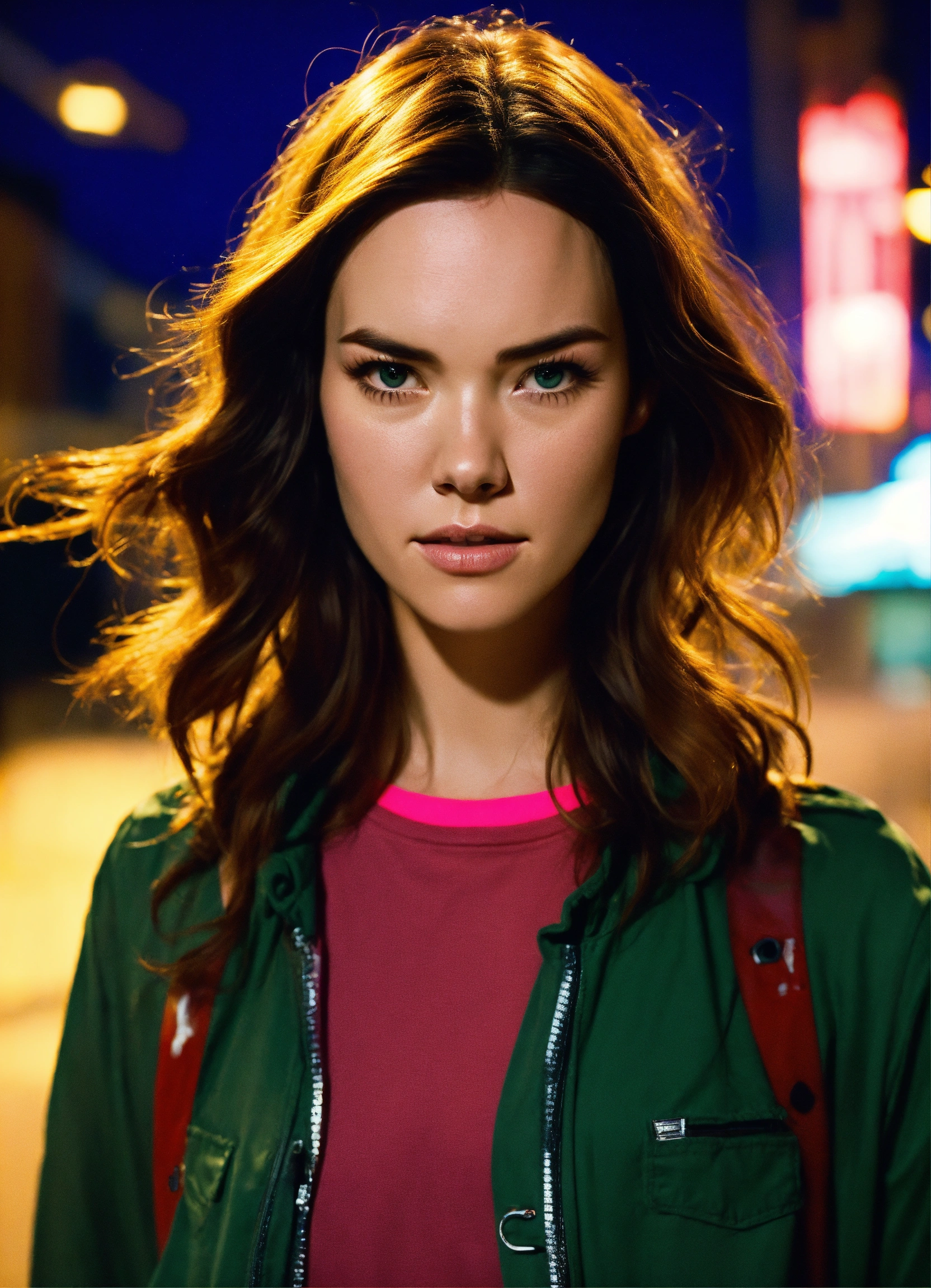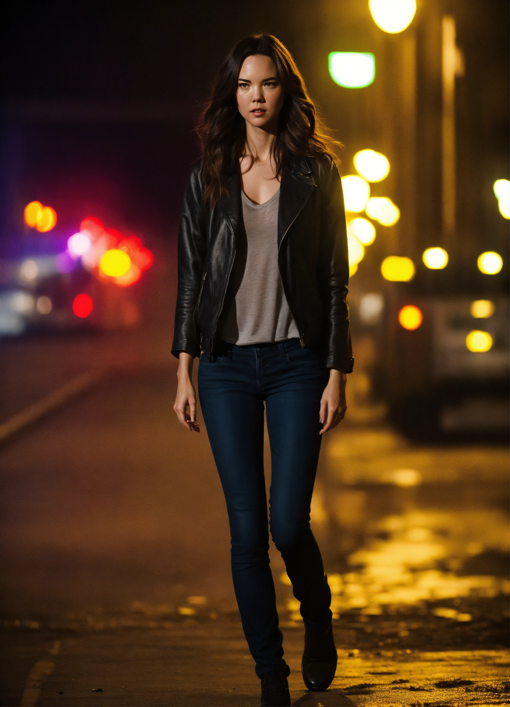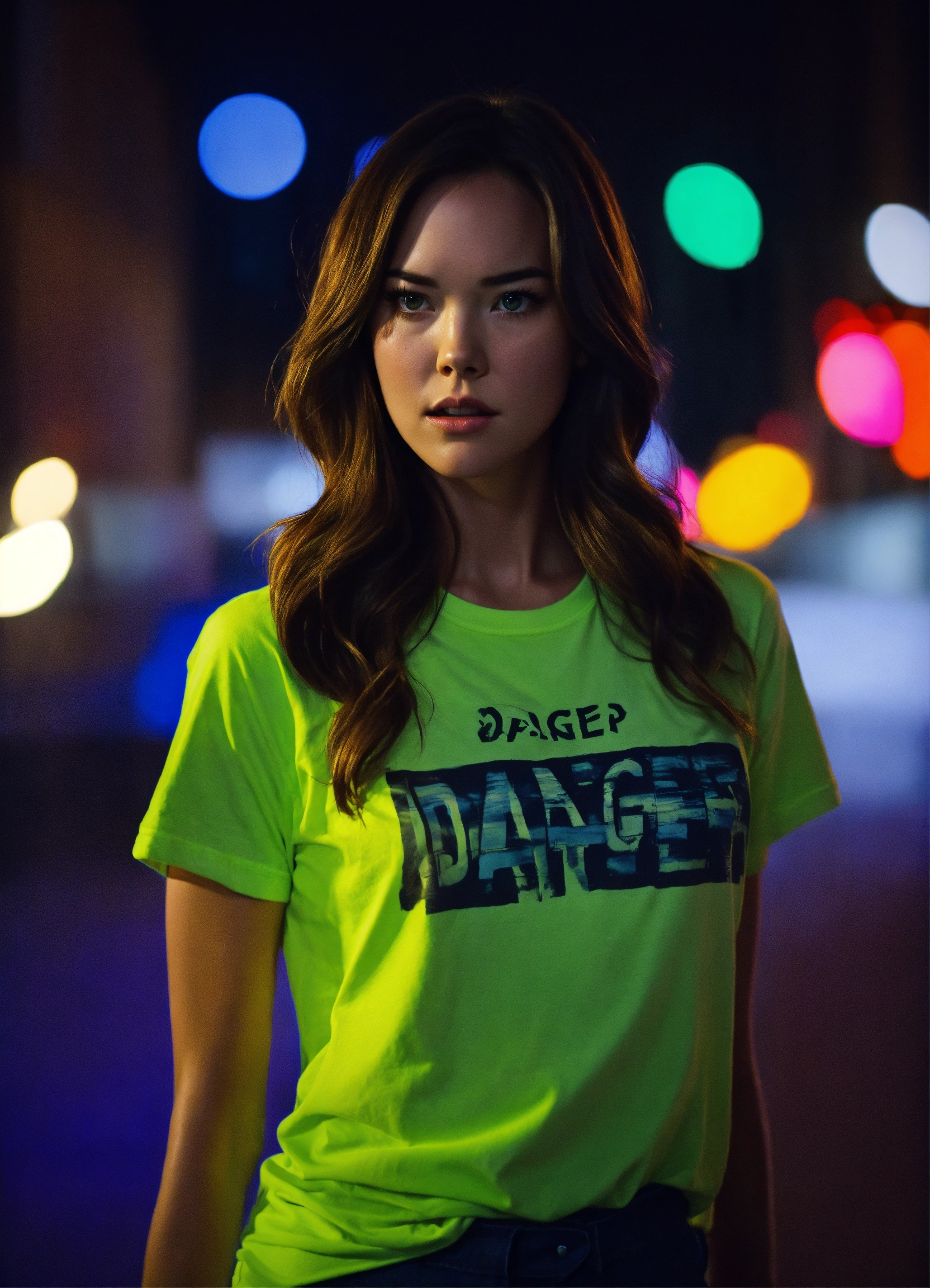 Beautiful young odette annable, big eyes with chestnut hair, walk, thriller style, danger, detective story, scared, night, cinematic, neon, t-shirt