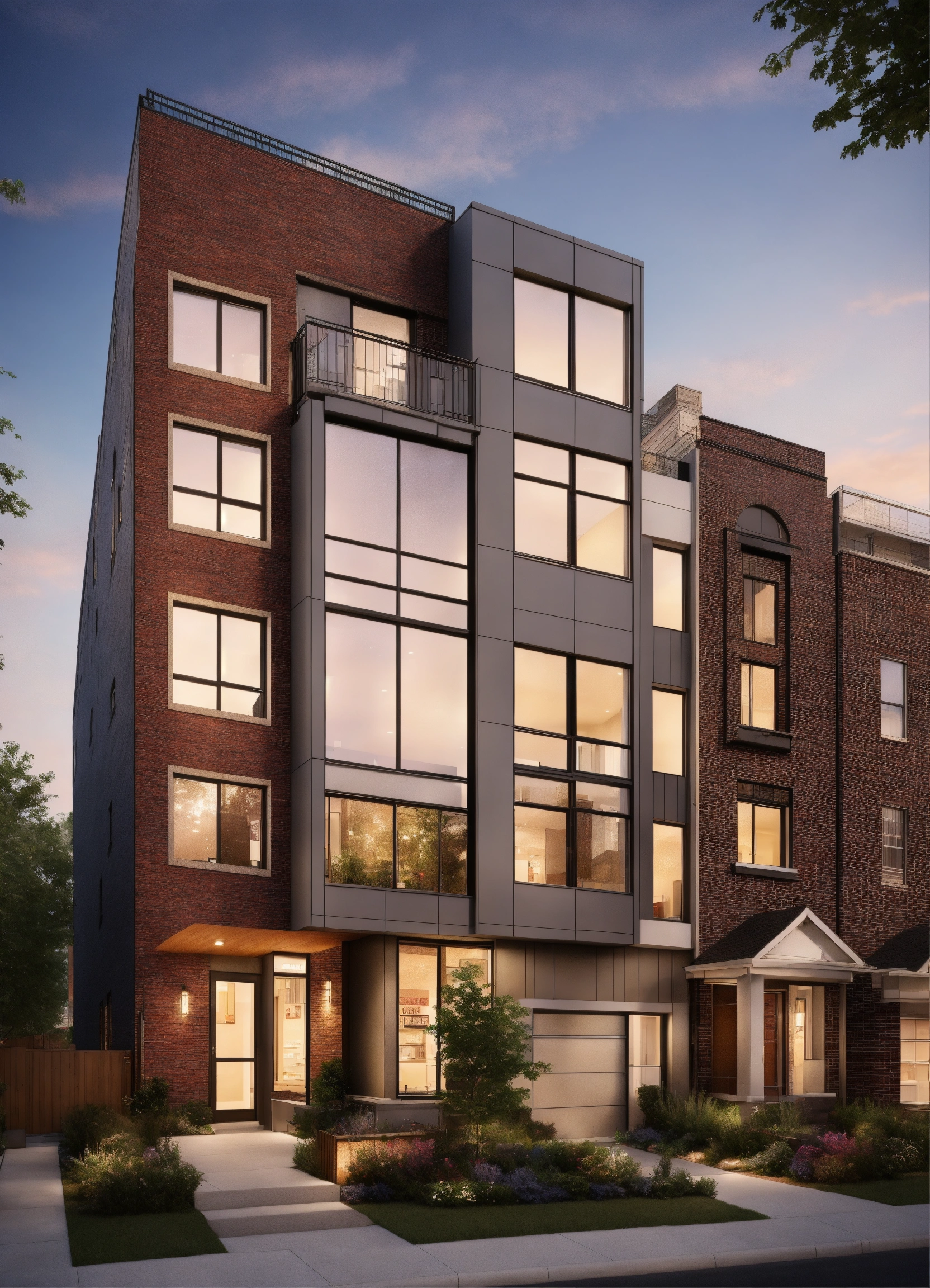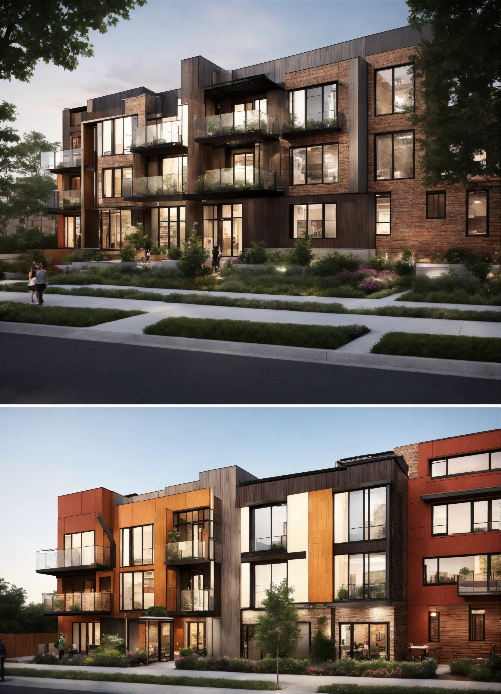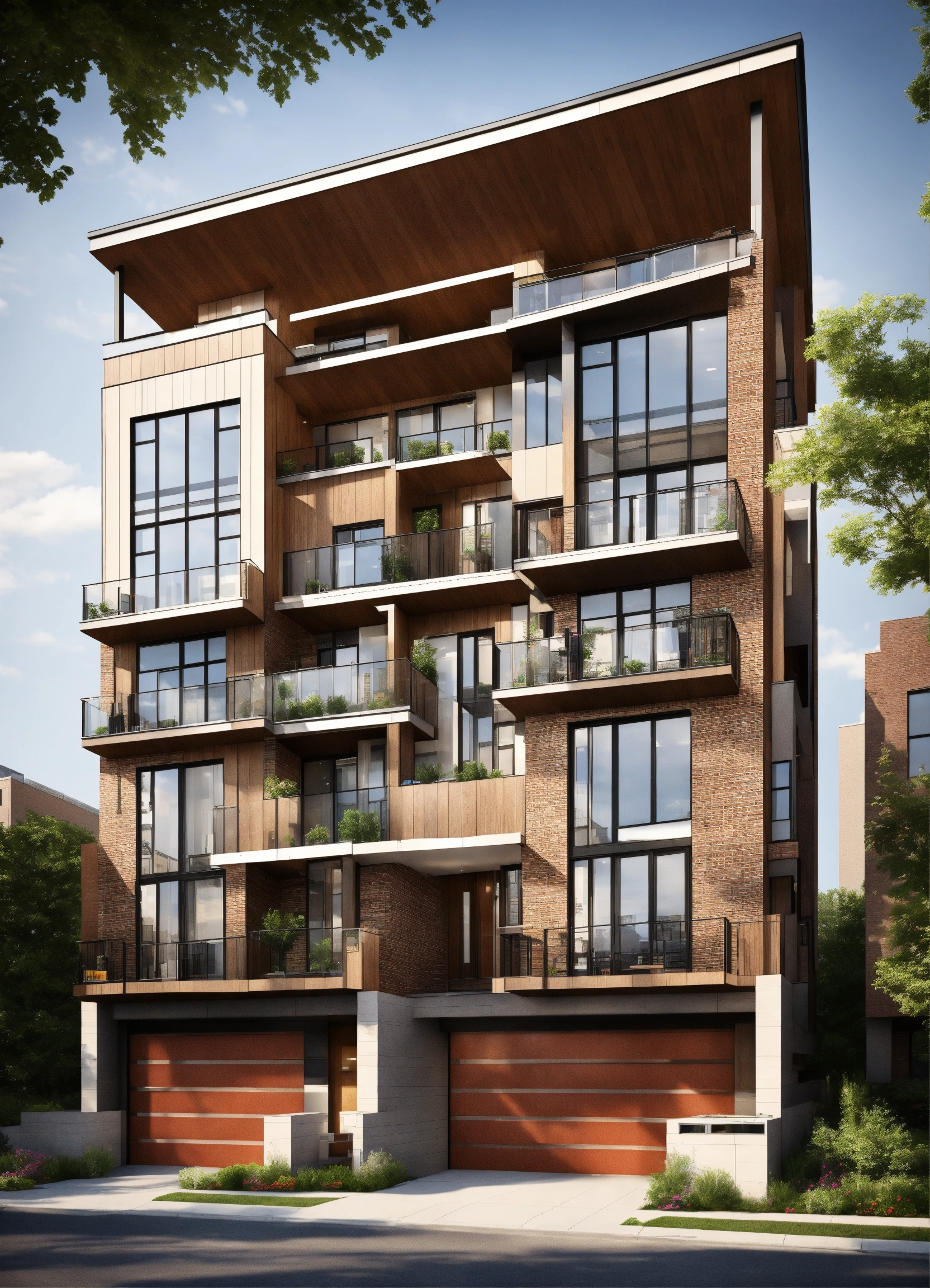 Sleek and modern 1st and second-floor amenity 3rd to 8th-floor condos, 9th and 10th penthouse. building in a vibrant neighborhood offers everything you need to live a comfortable and convenient lifestyle. the ground floor features retail shops, restaurants, a grocery store, and a pharmacy on the south and west side on the east side it has townhomes. the second-floor houses a community center with a gym, swimming pool, rooftop terrace, meeting room, and children's play area. the upper floors offer a mix of condos and rental apartments, with a lofted-story penthouse and terrace on top. make the image 4k wide angle showing the whole building and surrounding sidewalks. give me options on how the townhouses will look on only the east side of the building the area of the site is 164x175 in the shape of a rhombus