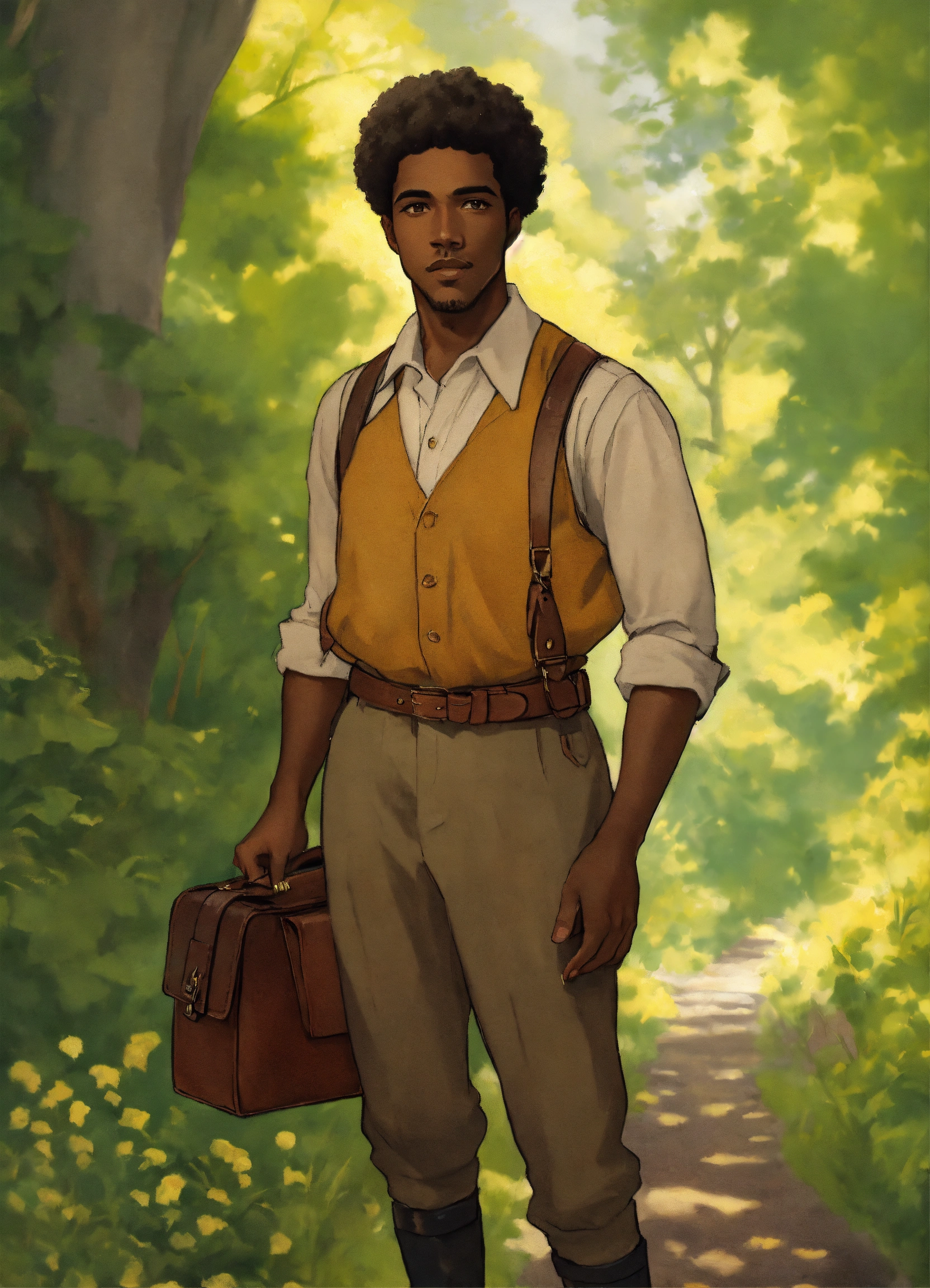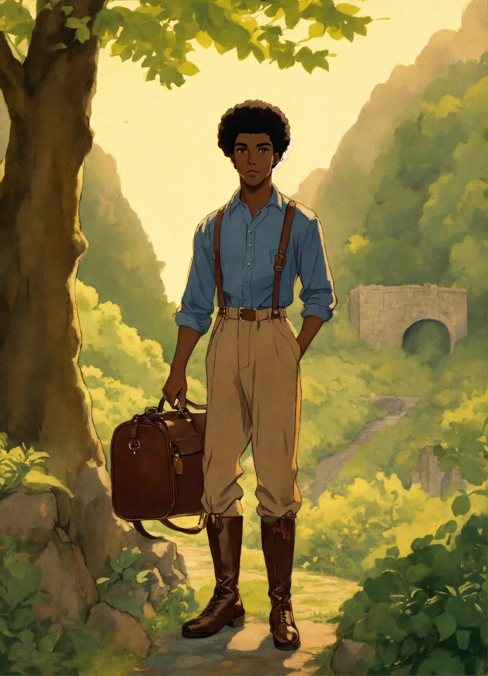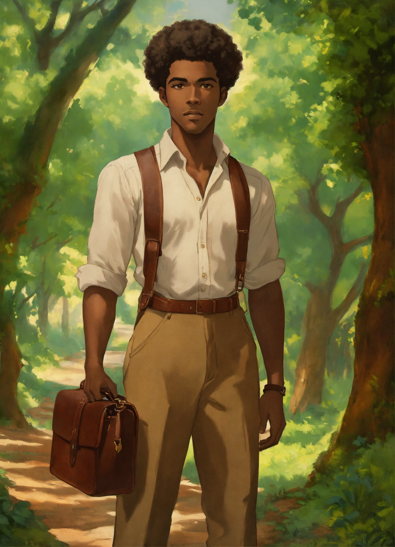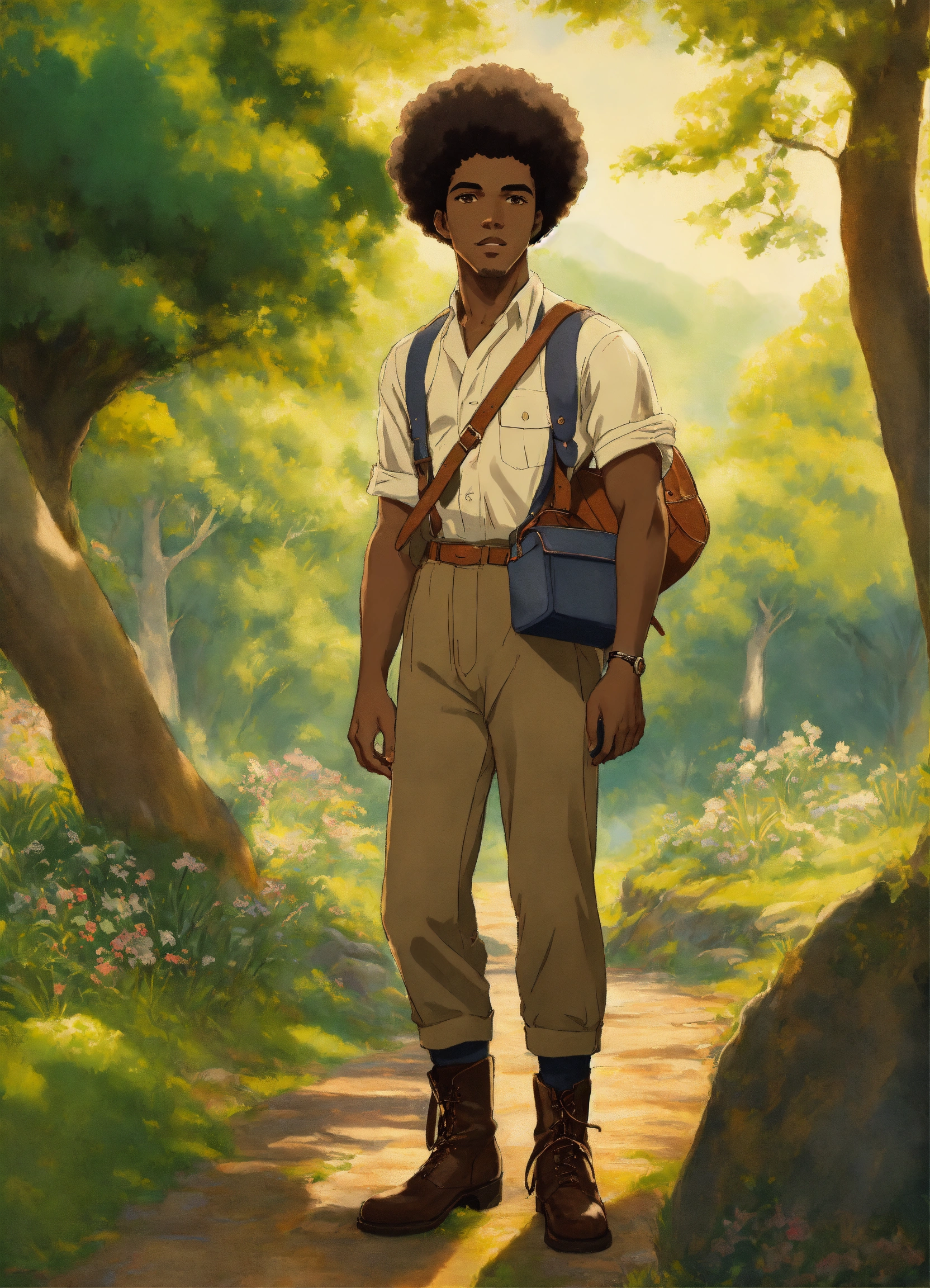 A 1930s portrait of an extremely handsome black man with short afro hair, hazel eyes standing in a glen with a satchel and boots by studio ghibli.