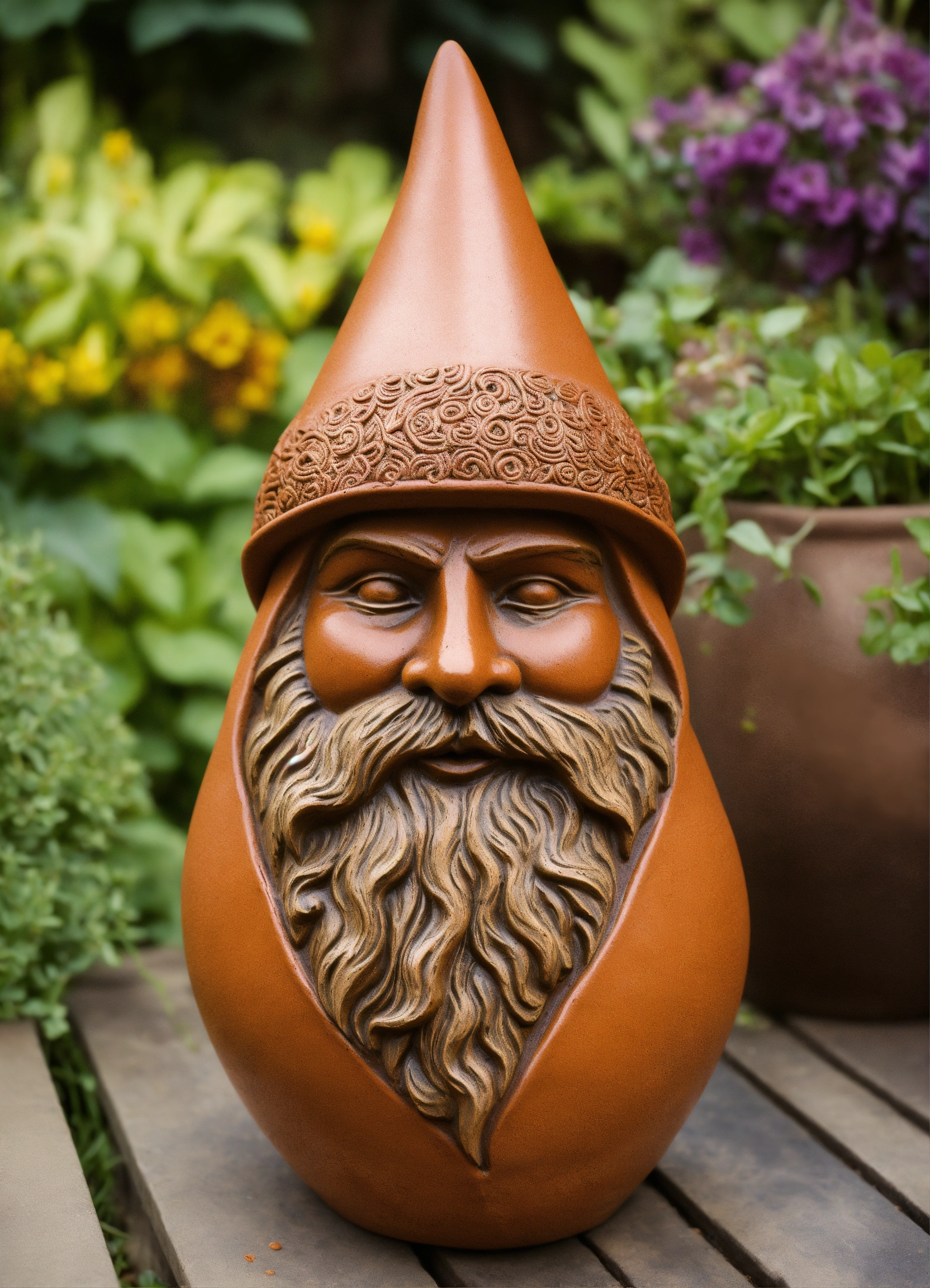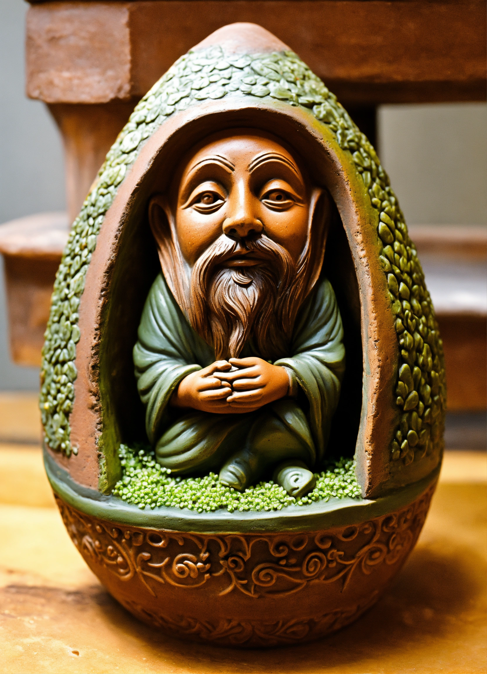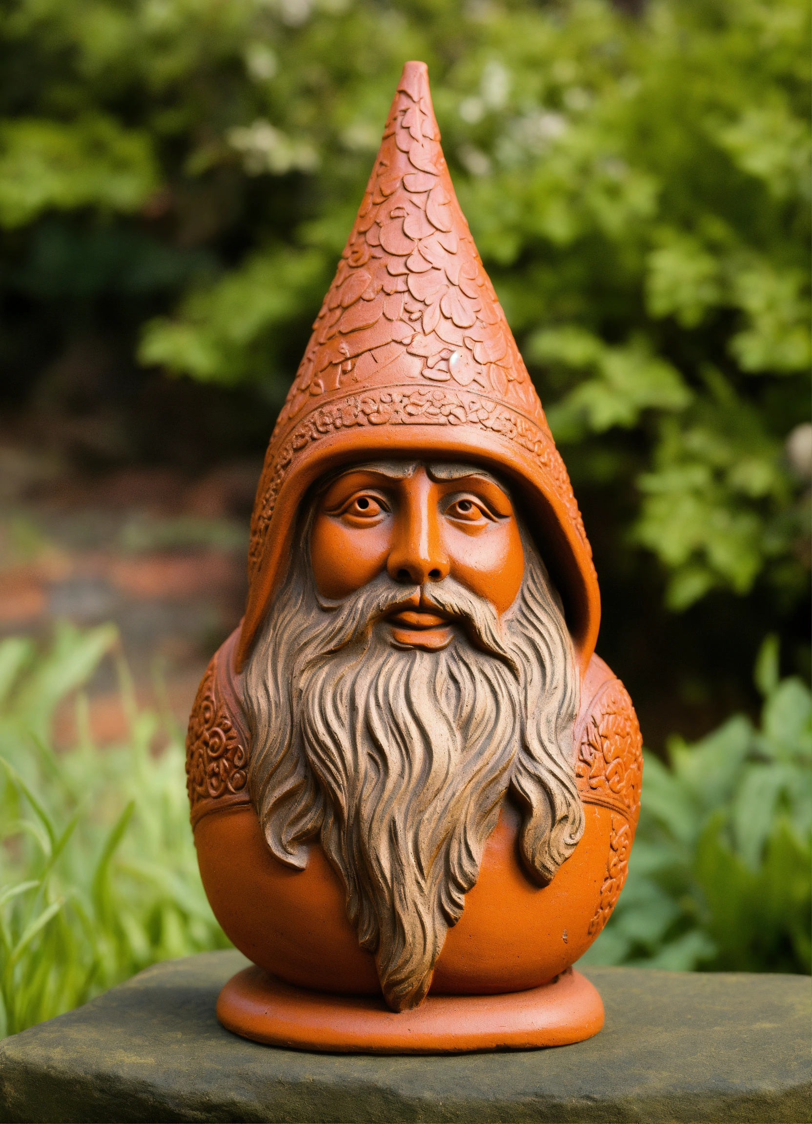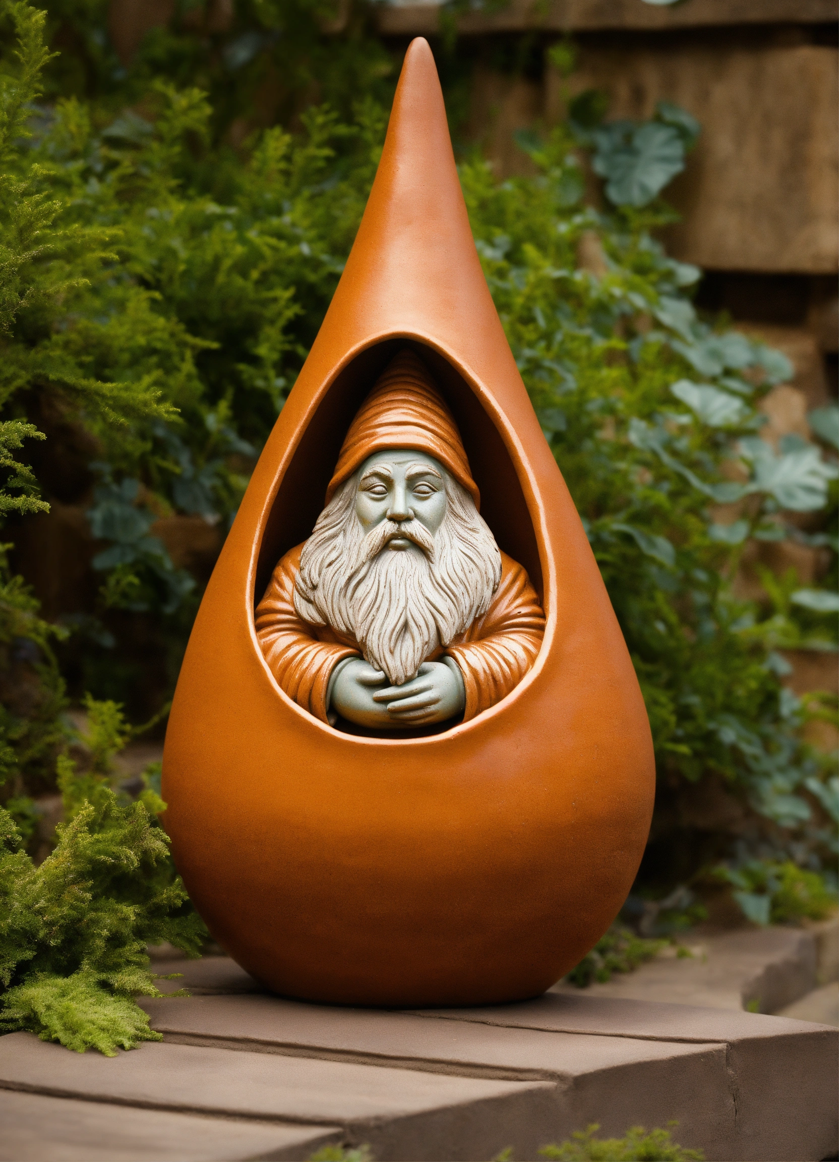 An ancient clay hooded sculptured garden gnome teardrop shaped