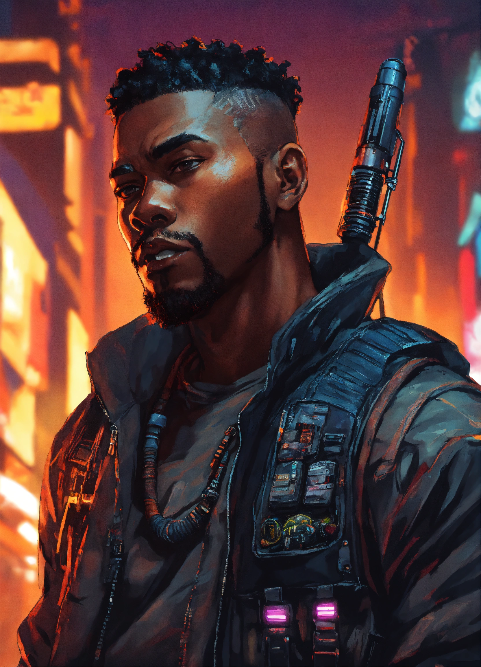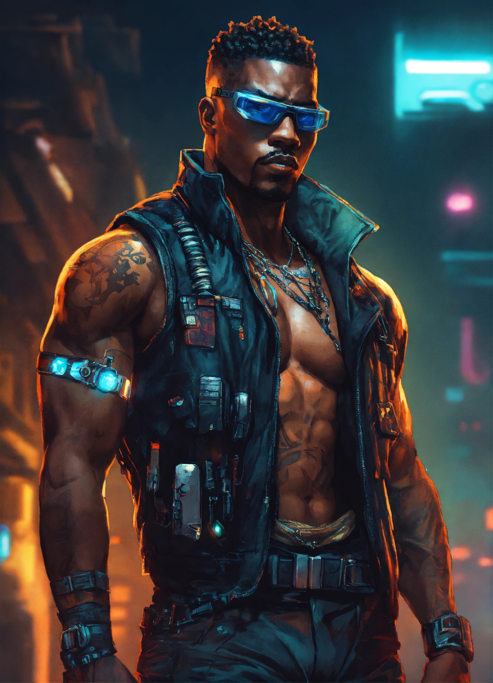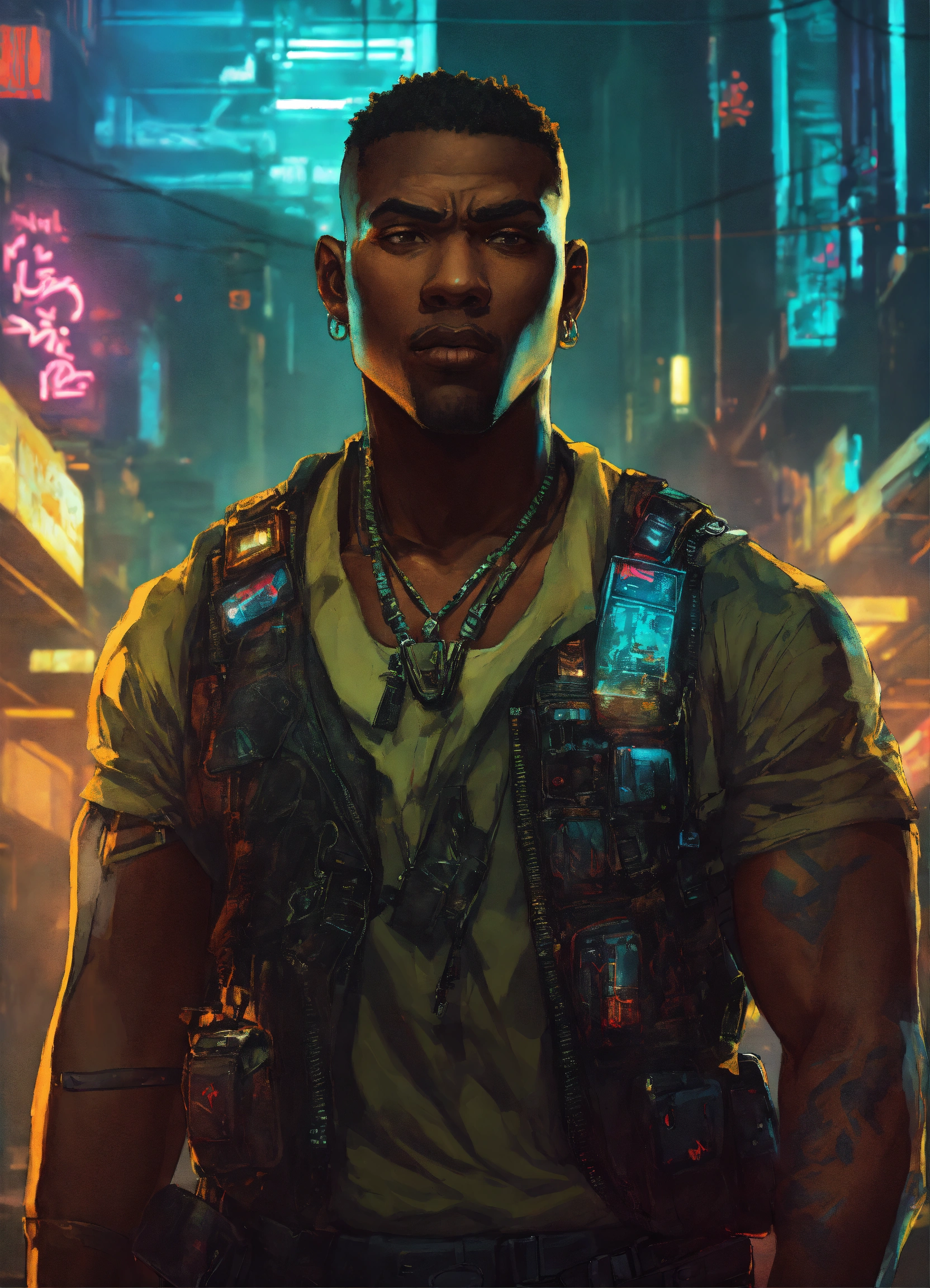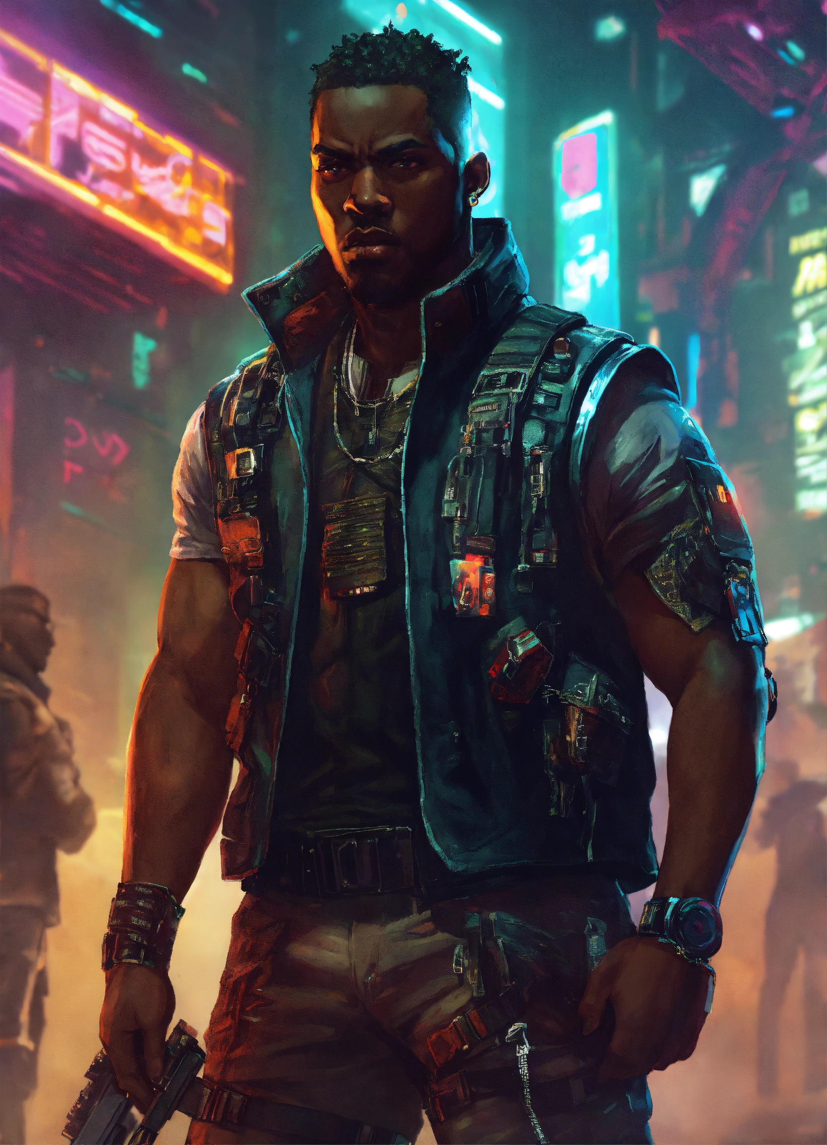 African american tough and big cyberpunk wearing a vest with short hair, voodoo boys in cyberpunk, cyberpunk art poster style
