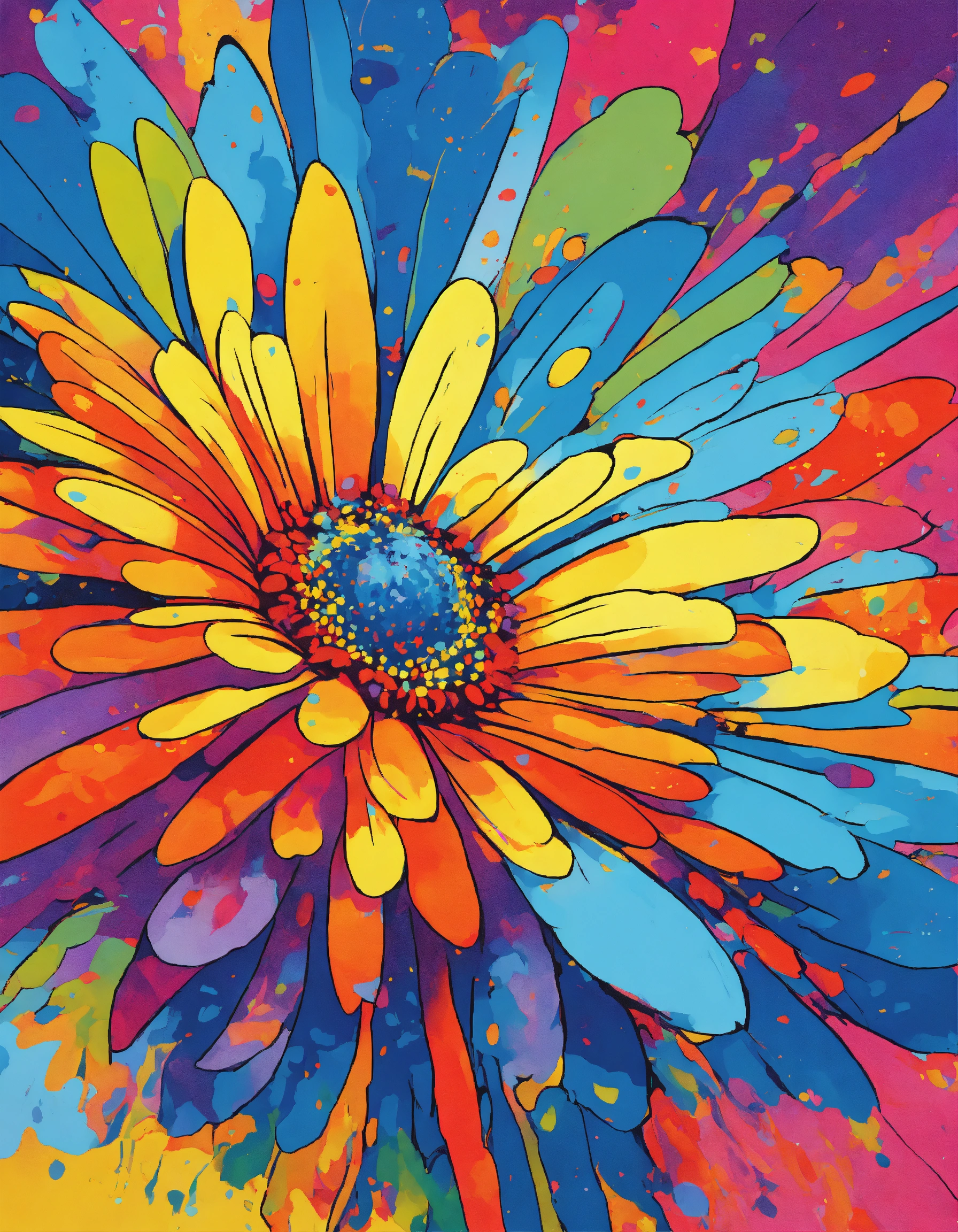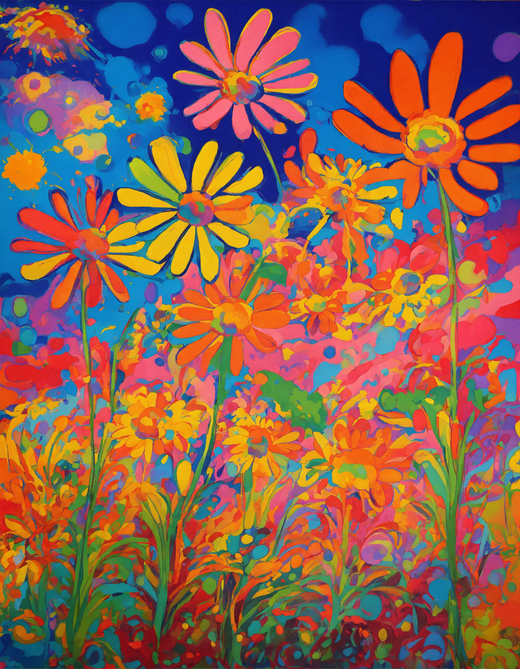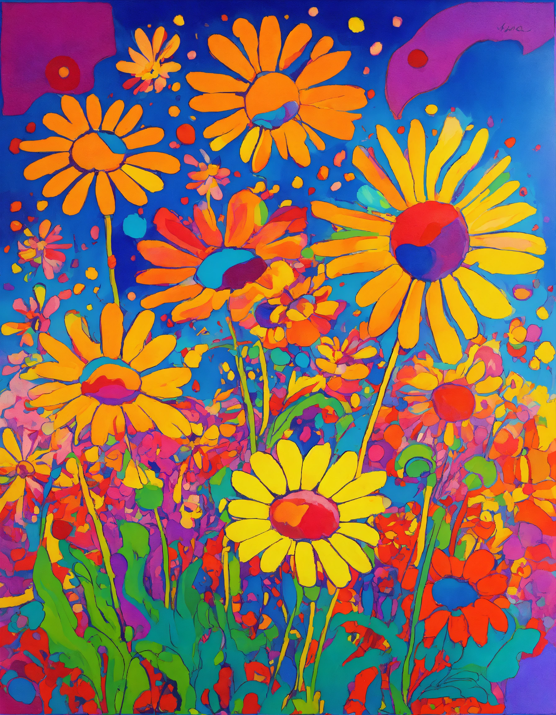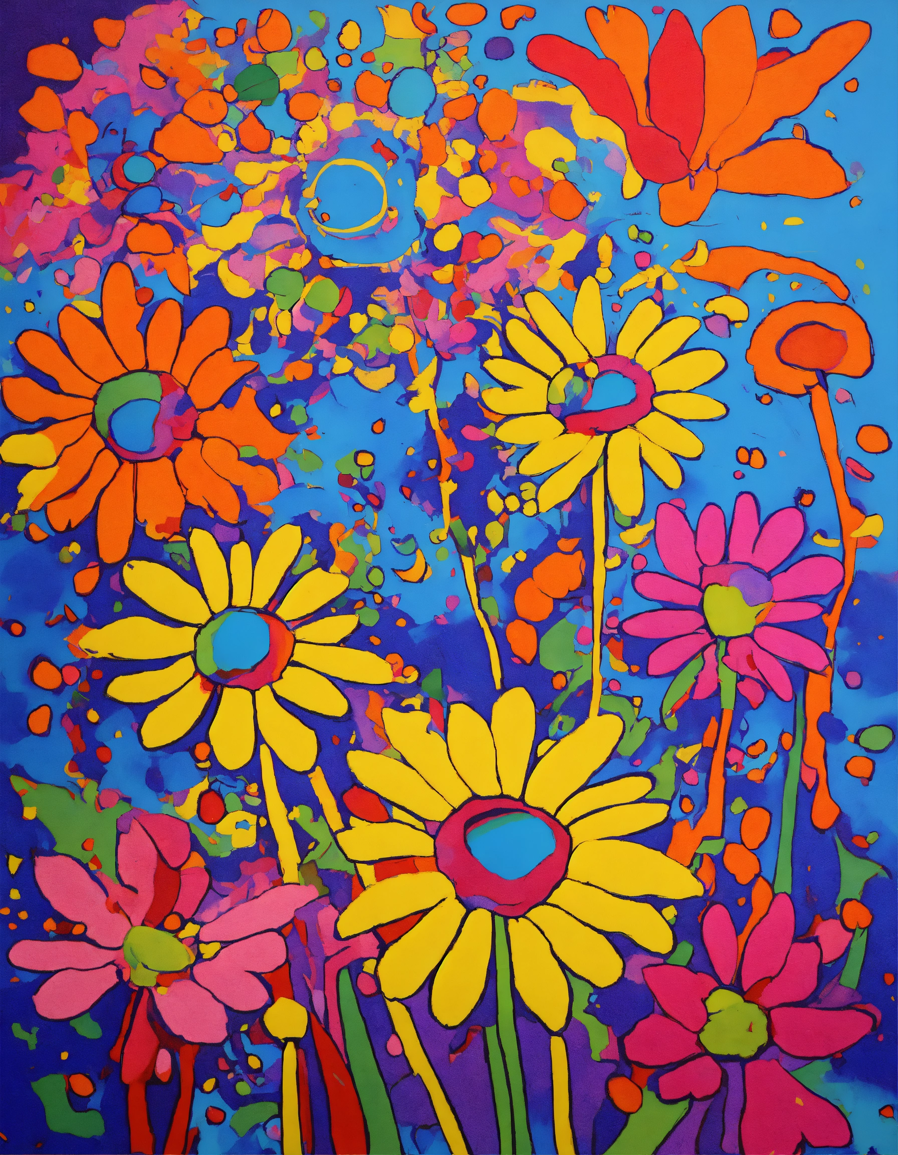 Exploding psychedelic daisies in the style of peter max