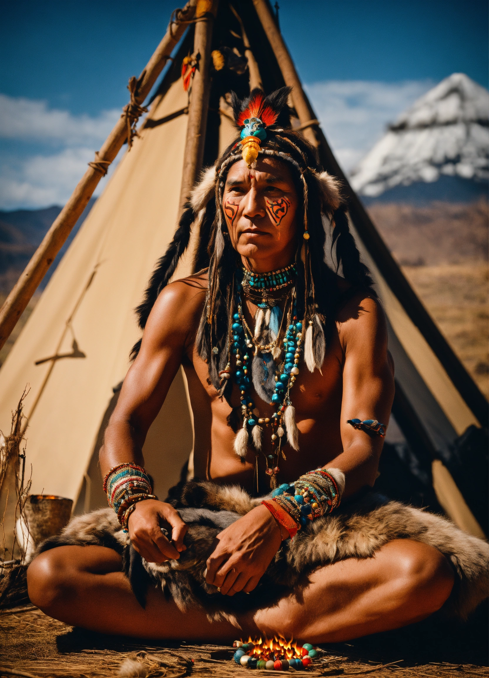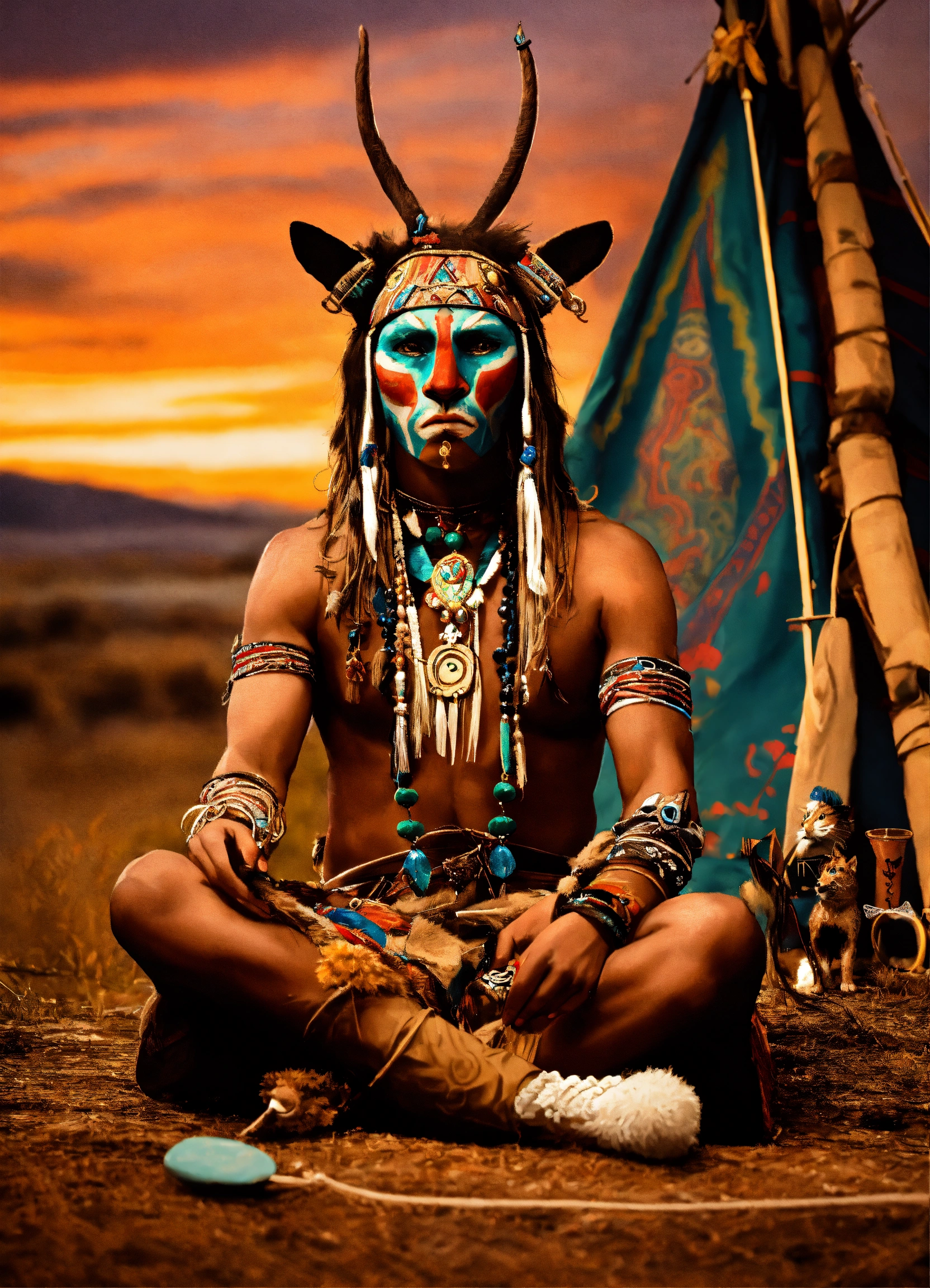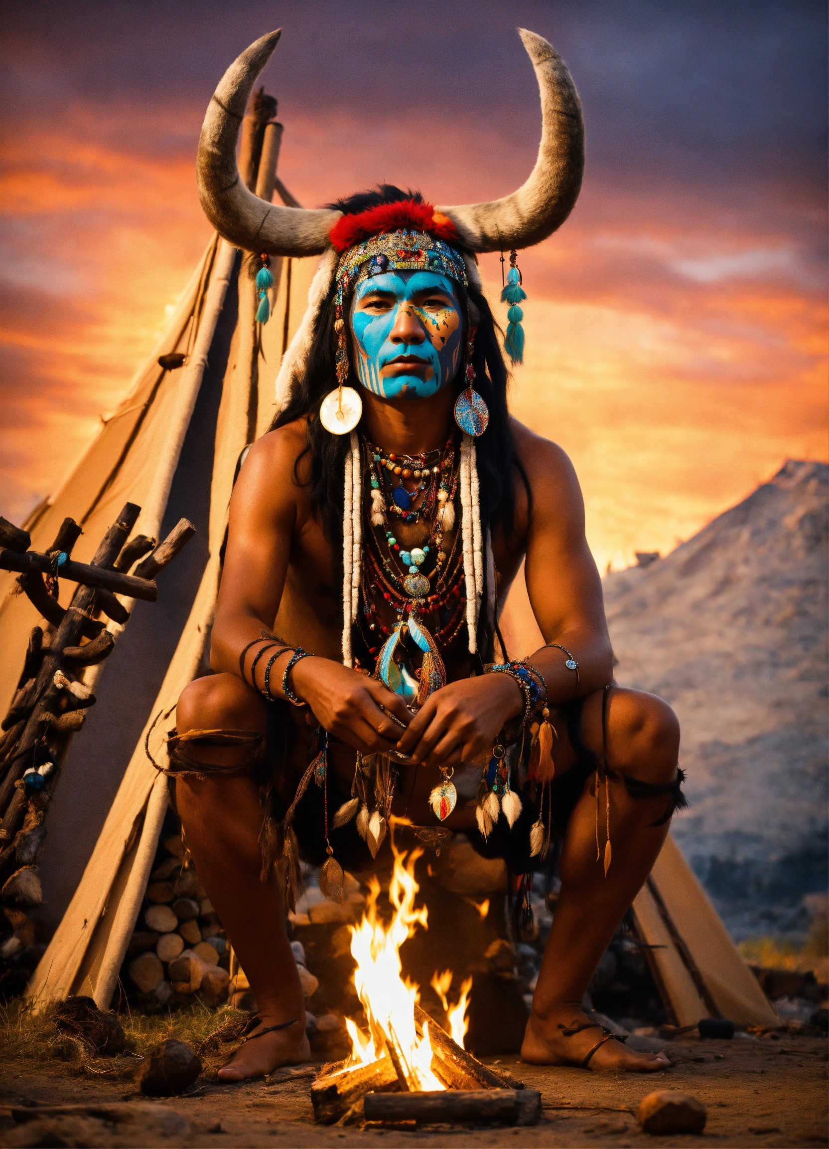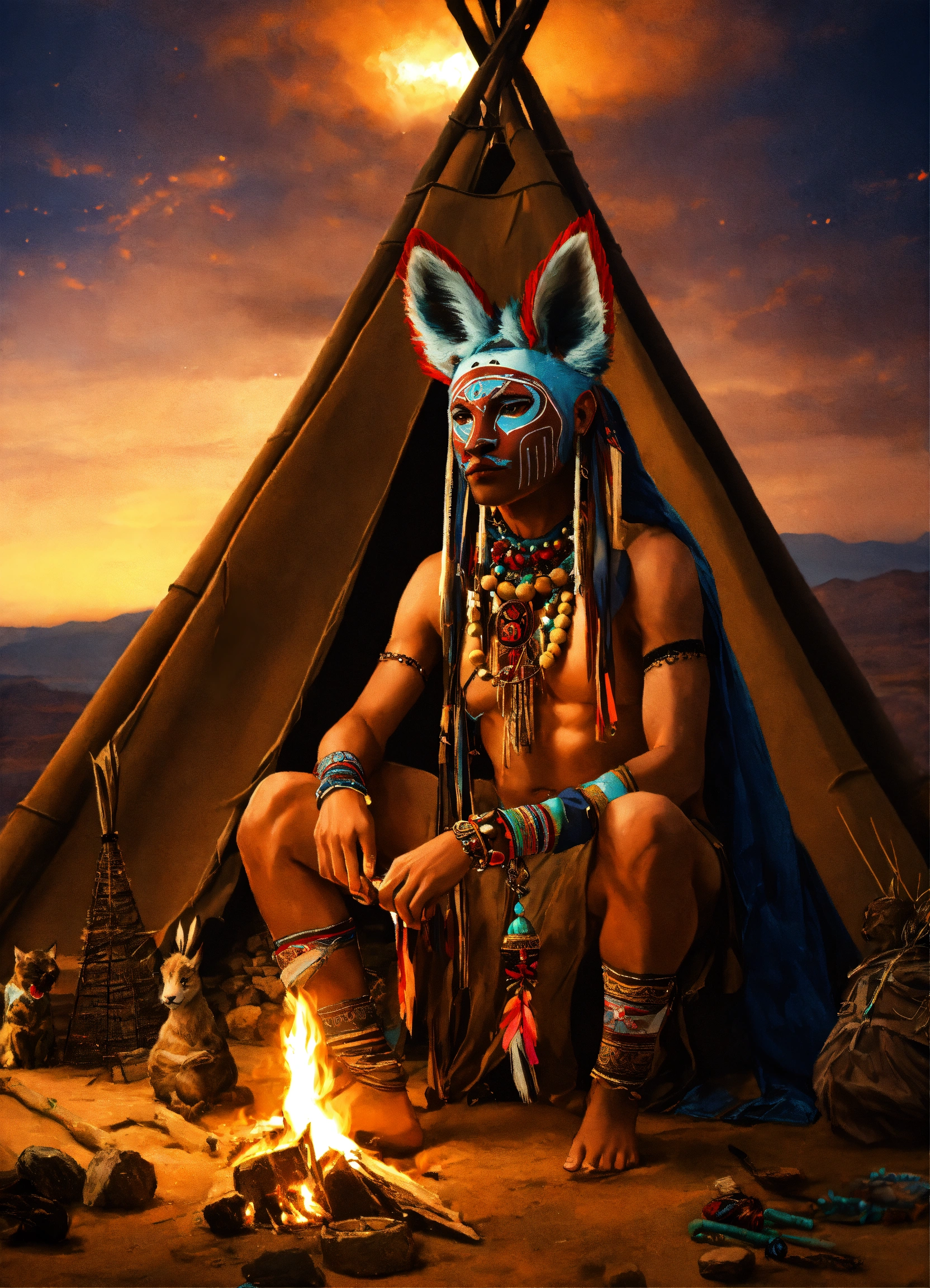 Puma head ancestral shaman, animal, surrealistic, holding a rattle, by the fire, big teepee in the background, jewlery