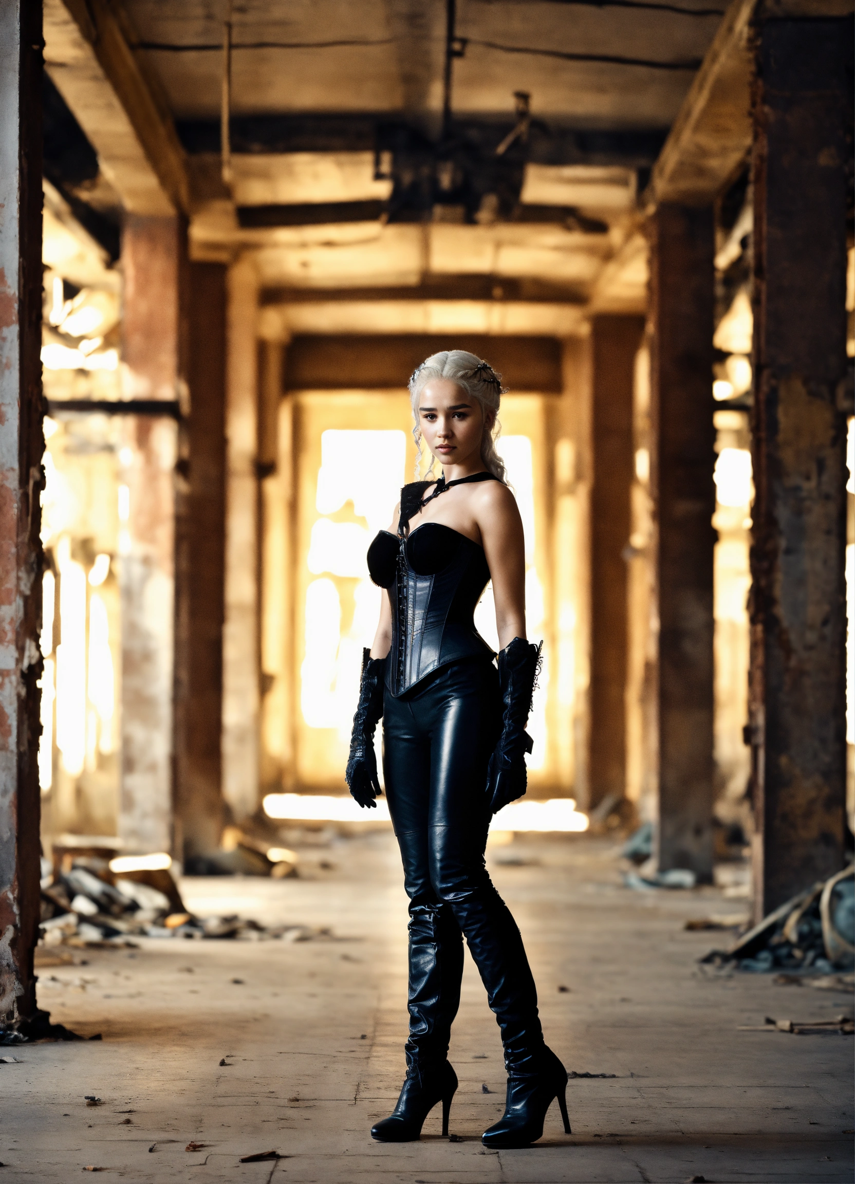 A beautiful 20 years old girl wearing a black leather corset, pants and gloves posing in an abandoned faktory corridor, high definition, 8k render fullbody, looks like a real life version of daenerys targaryen