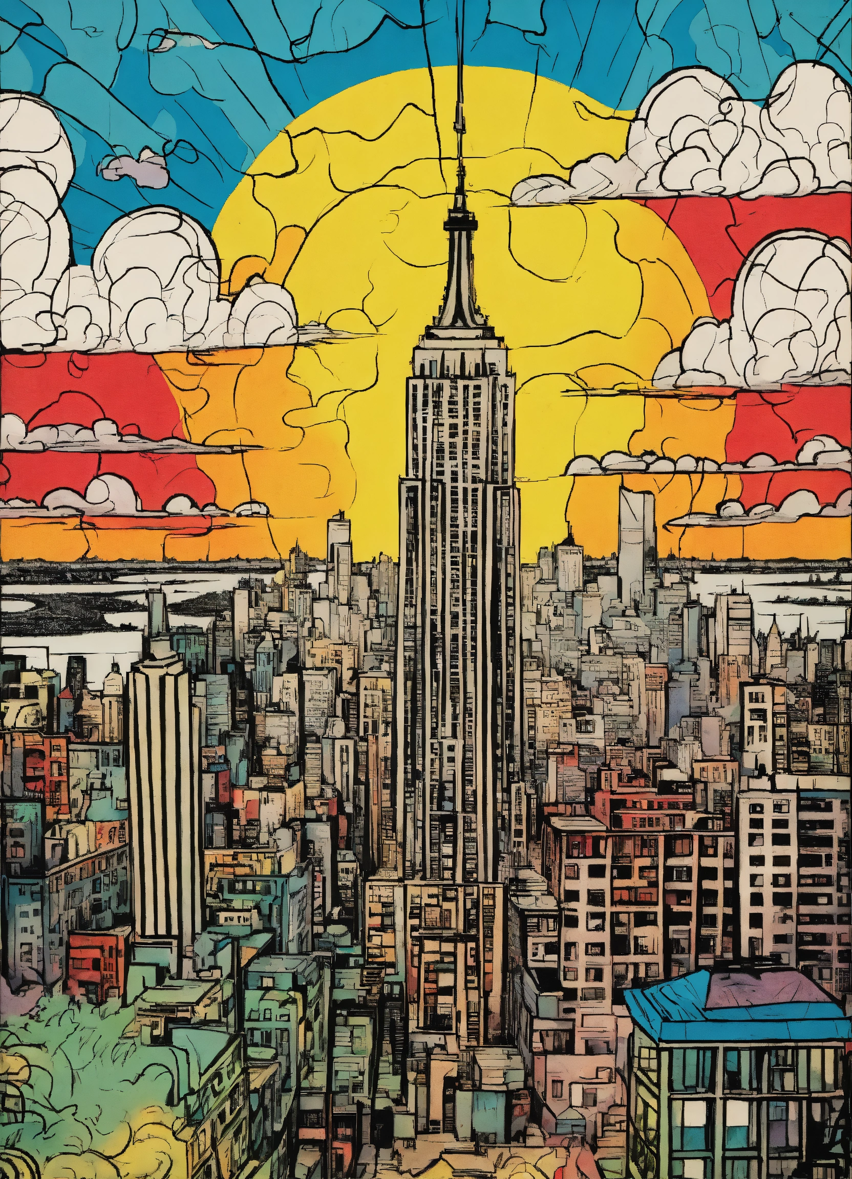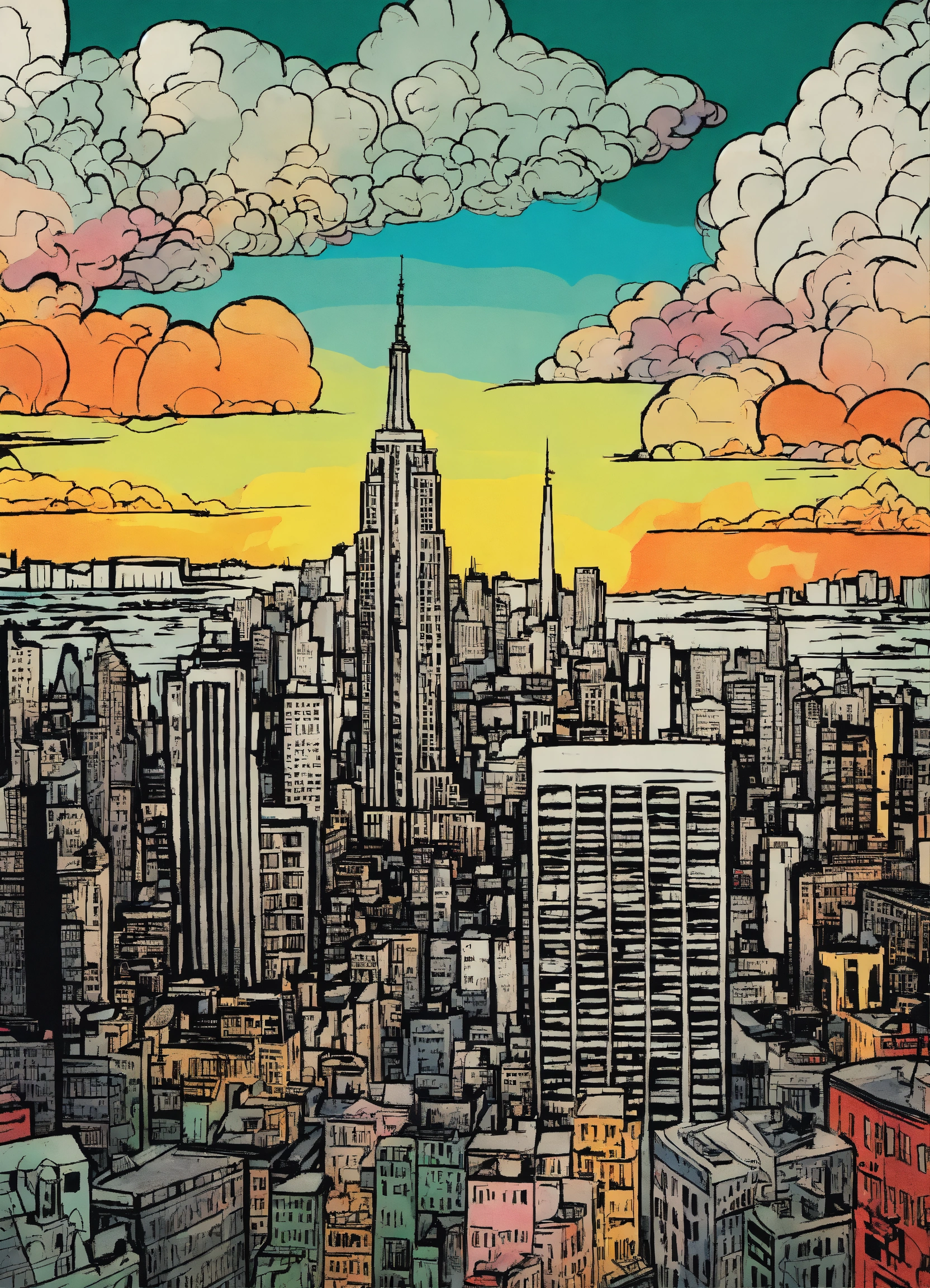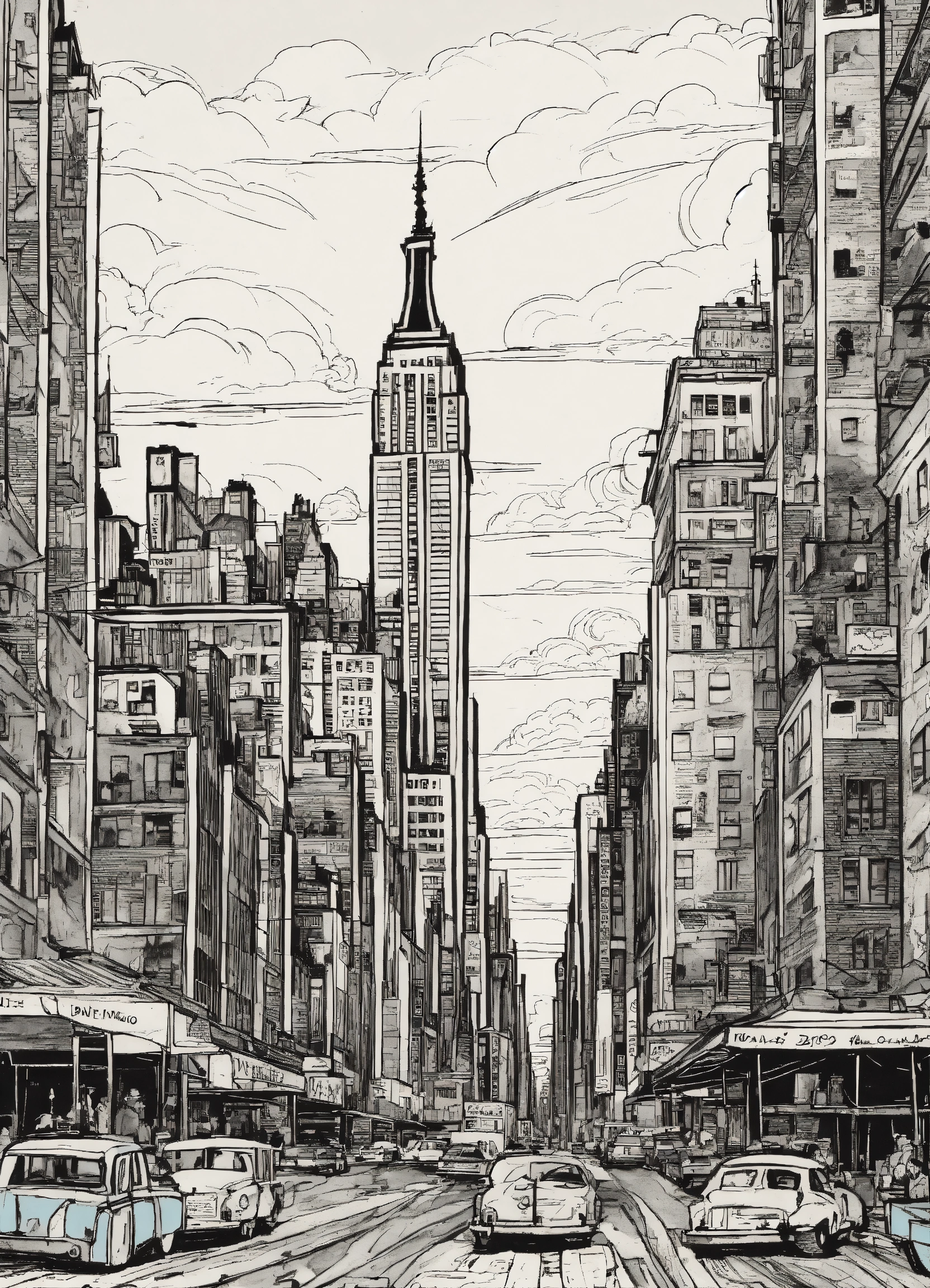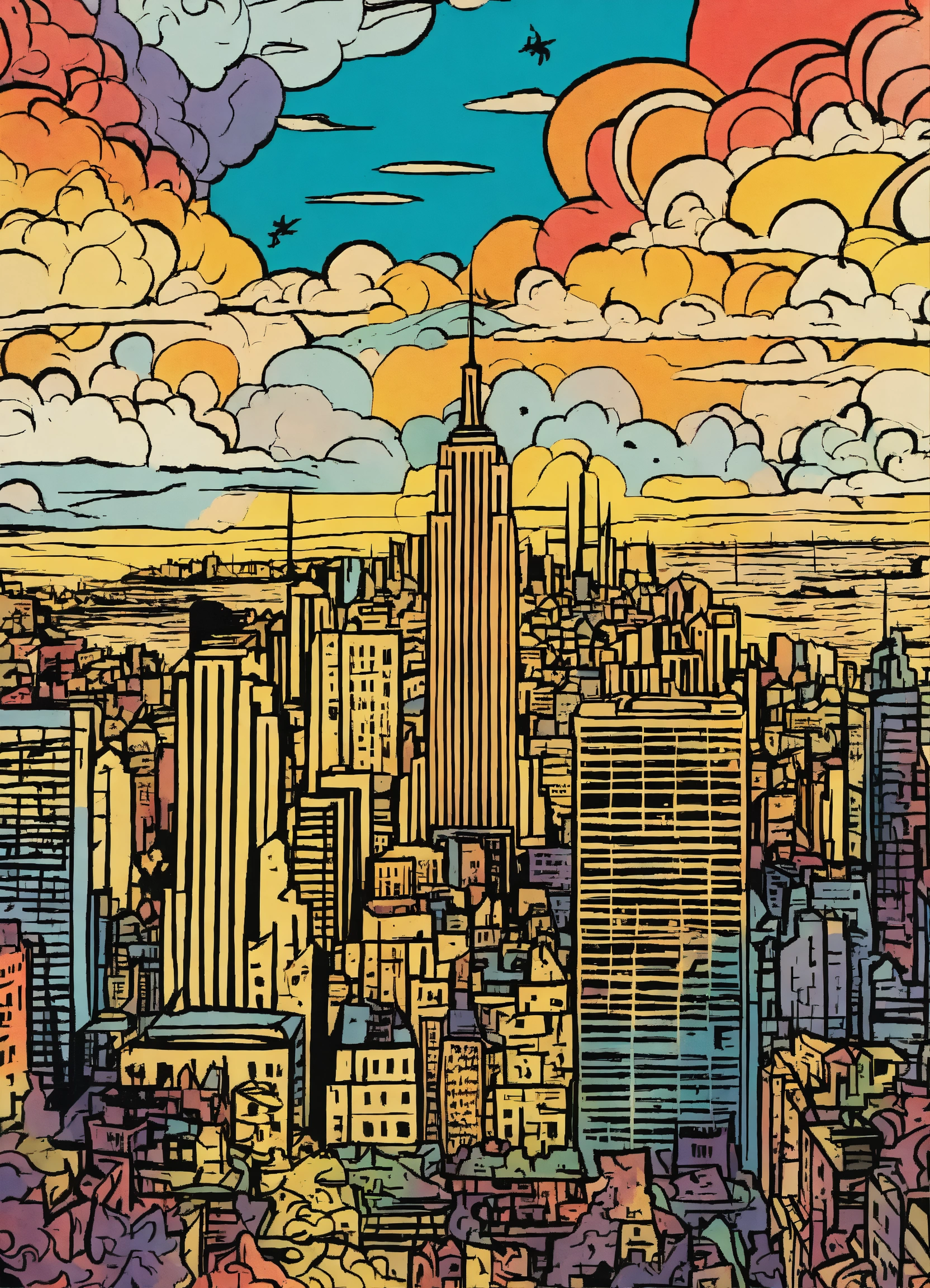 Chaotic stunning new york city, skyline, illustrated by pablo picasso, style of tin tin comics, pen and ink. vintage 90's anime style, black and white, colorful clouds, symmetric