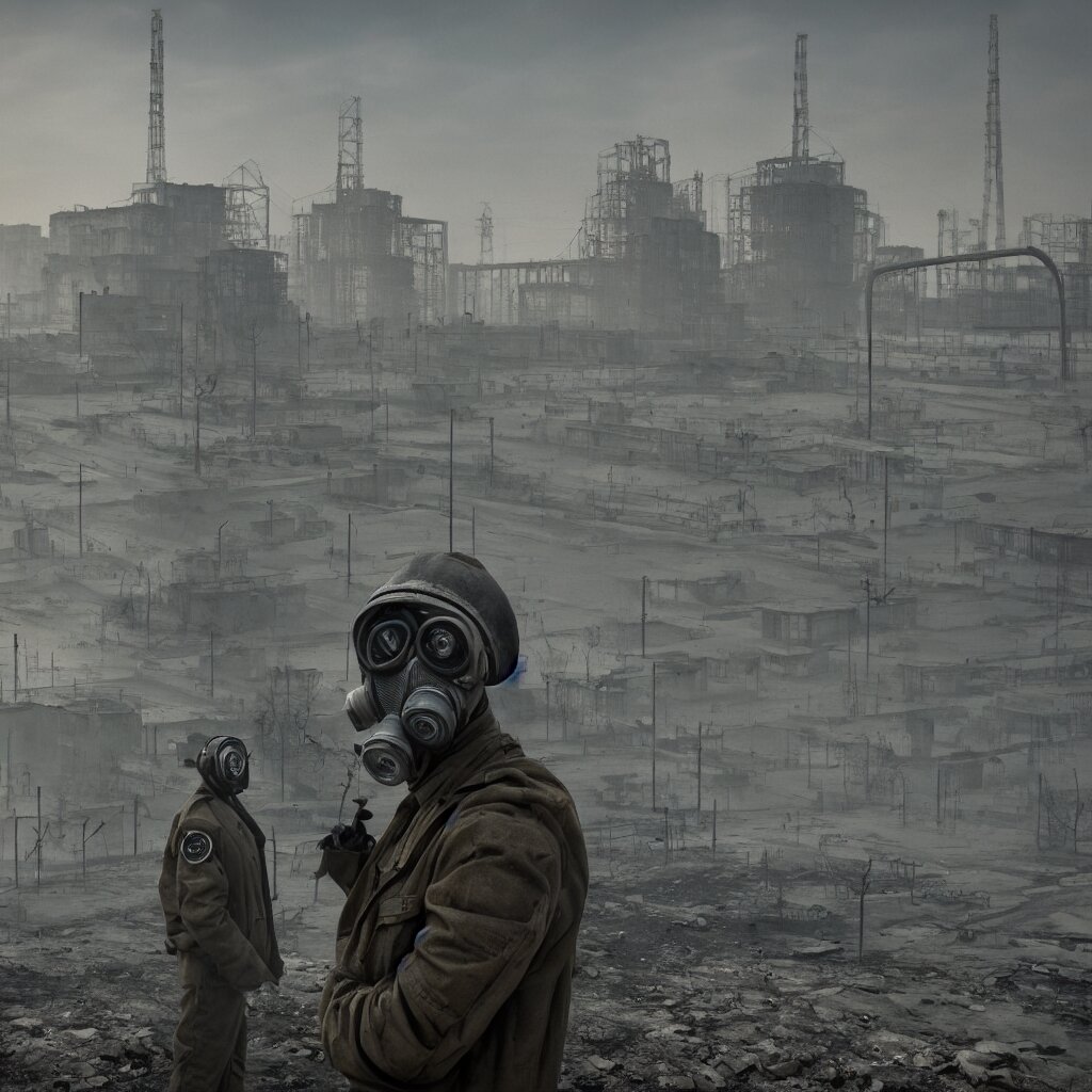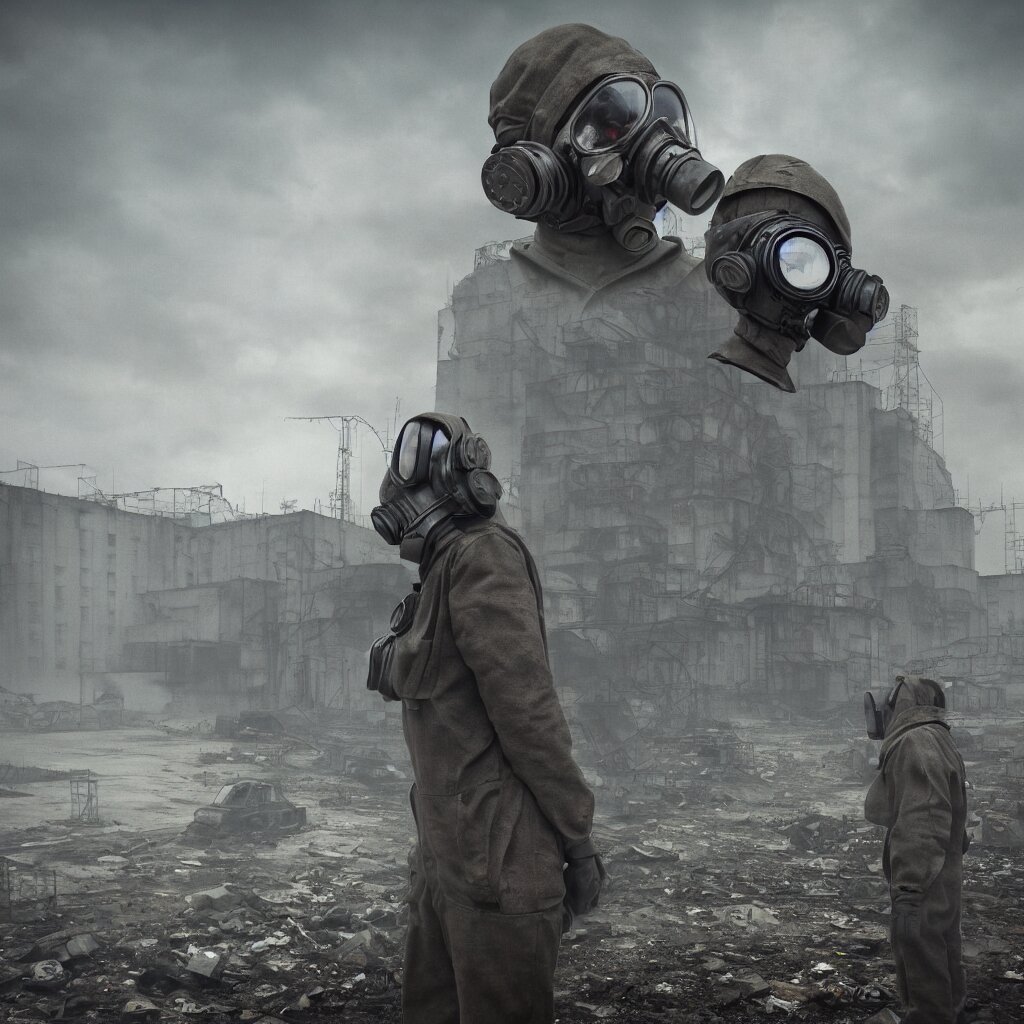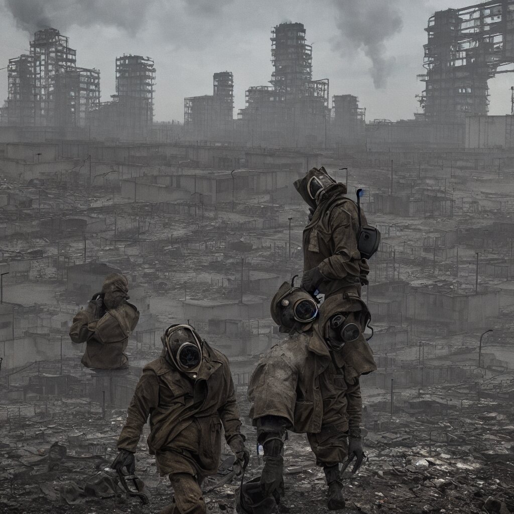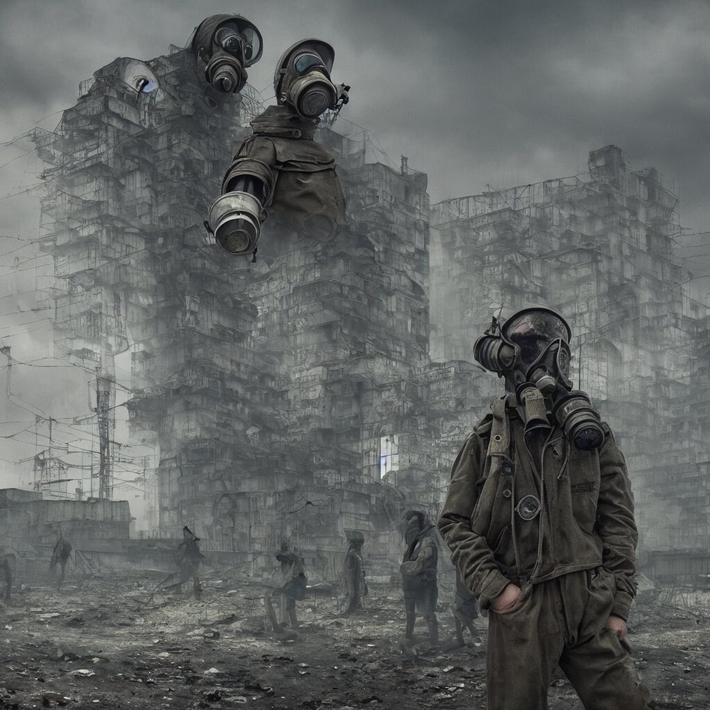 High pollution, pripyat, chernobyl, people with gas masks, soviet brutalism, dieselpunk, industrial, futuristic, very detailed, diesel, 4 k