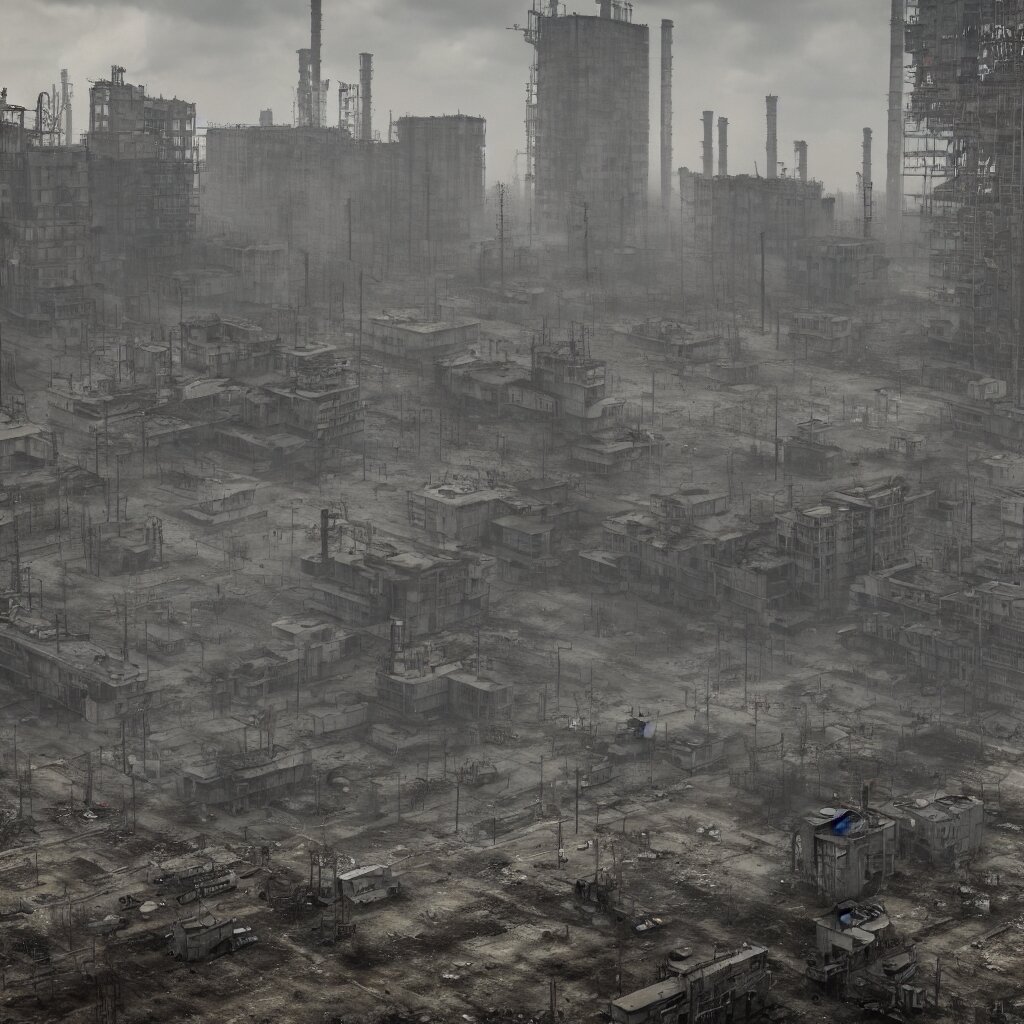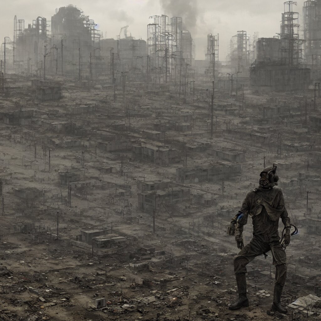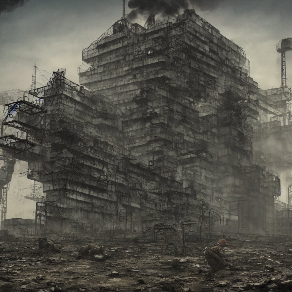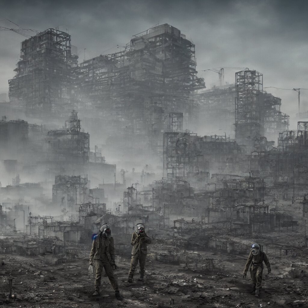 High pollution, pripyat, chernobyl, people with gas masks, soviet brutalism, dieselpunk, industrial, futuristic, very detailed, diesel, 4 k