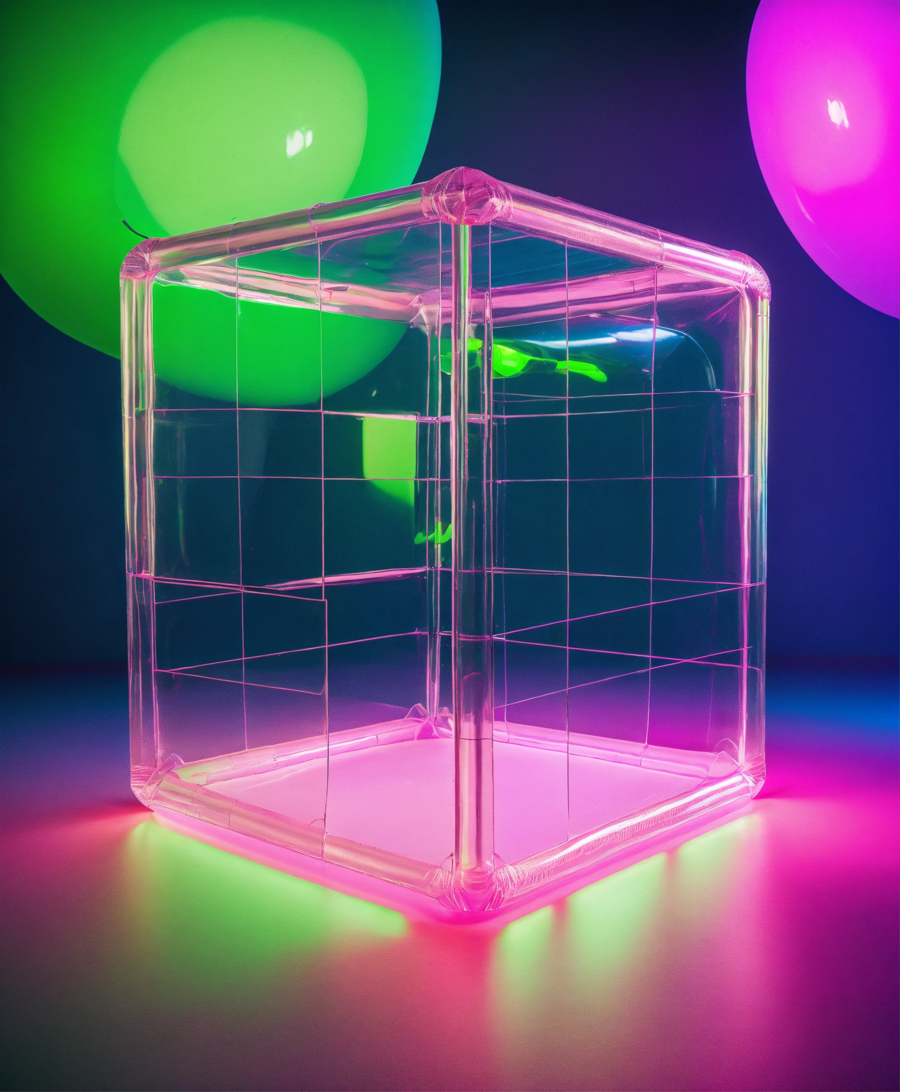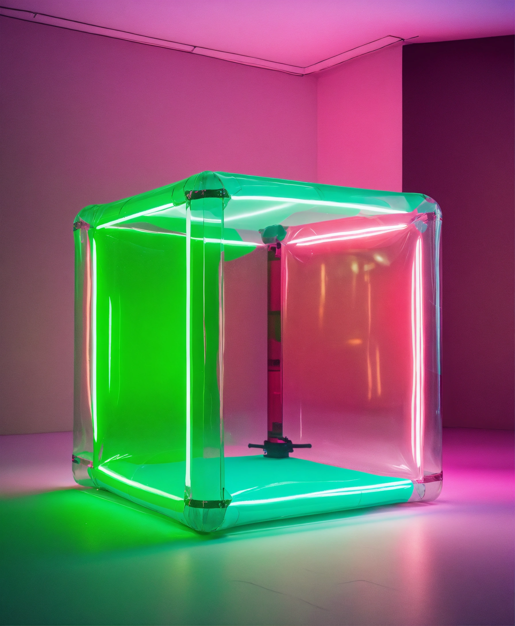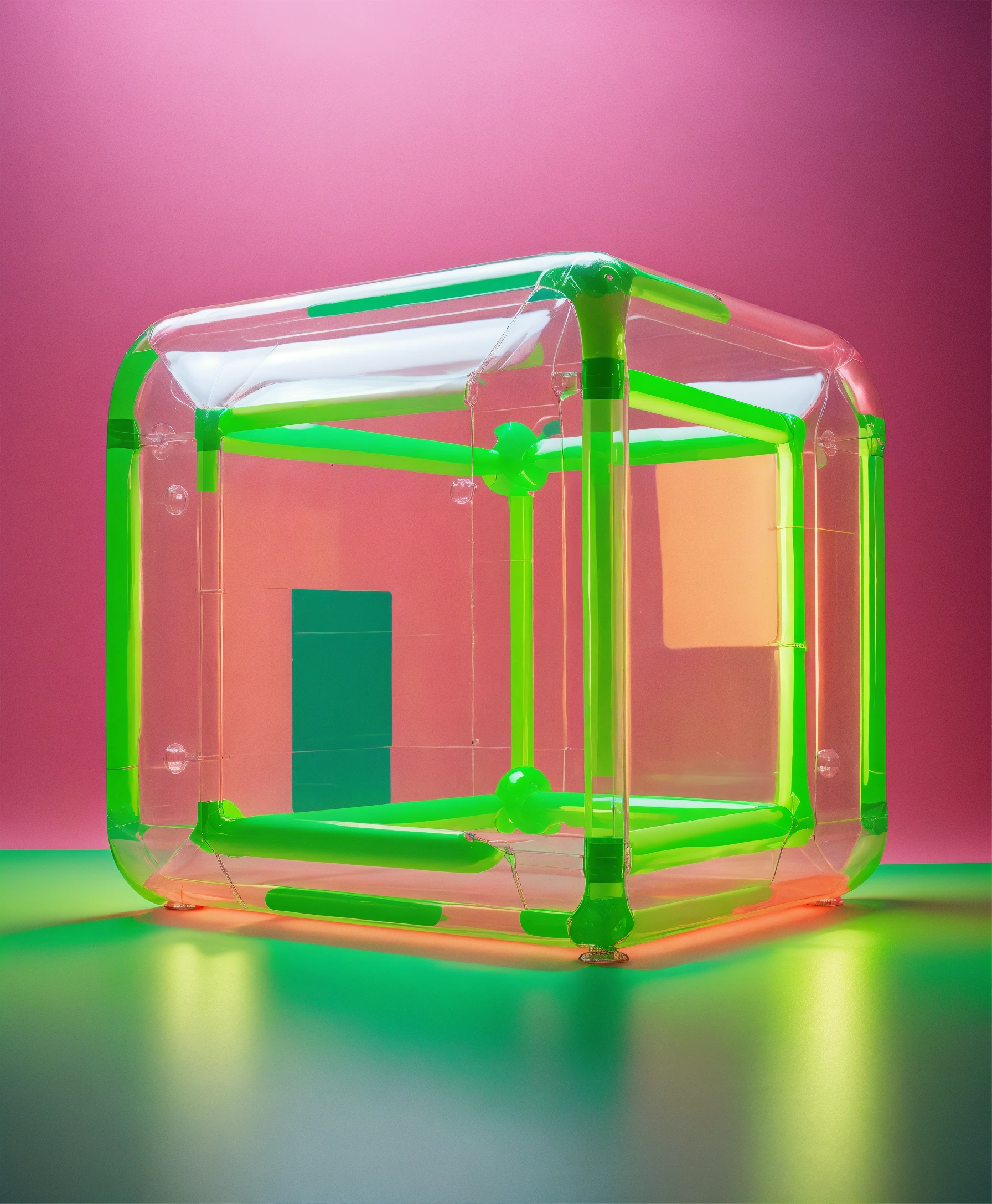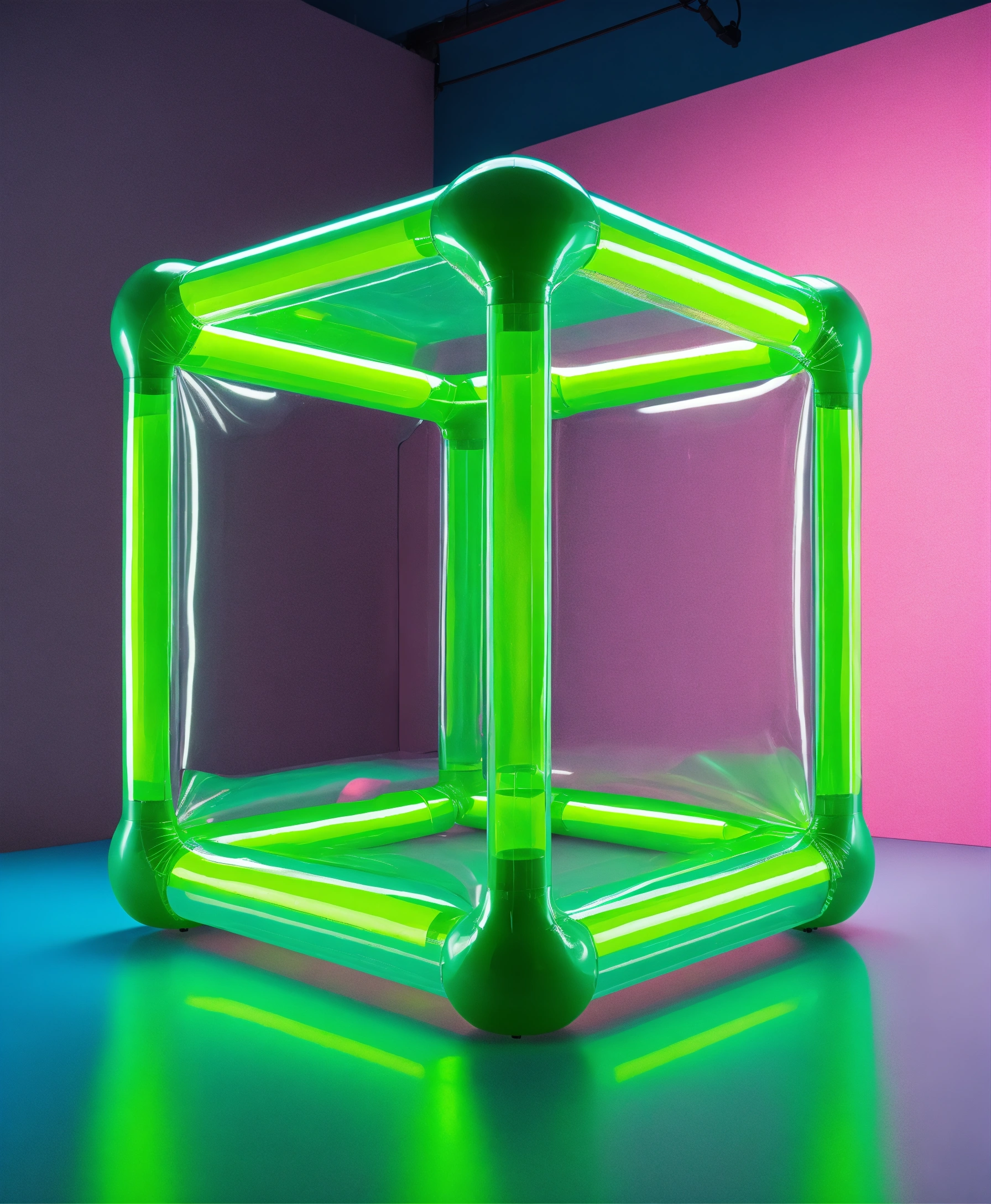 Inflatable clear cube, studio photography, some neon green accent color, 4k, muted color background! realistic!