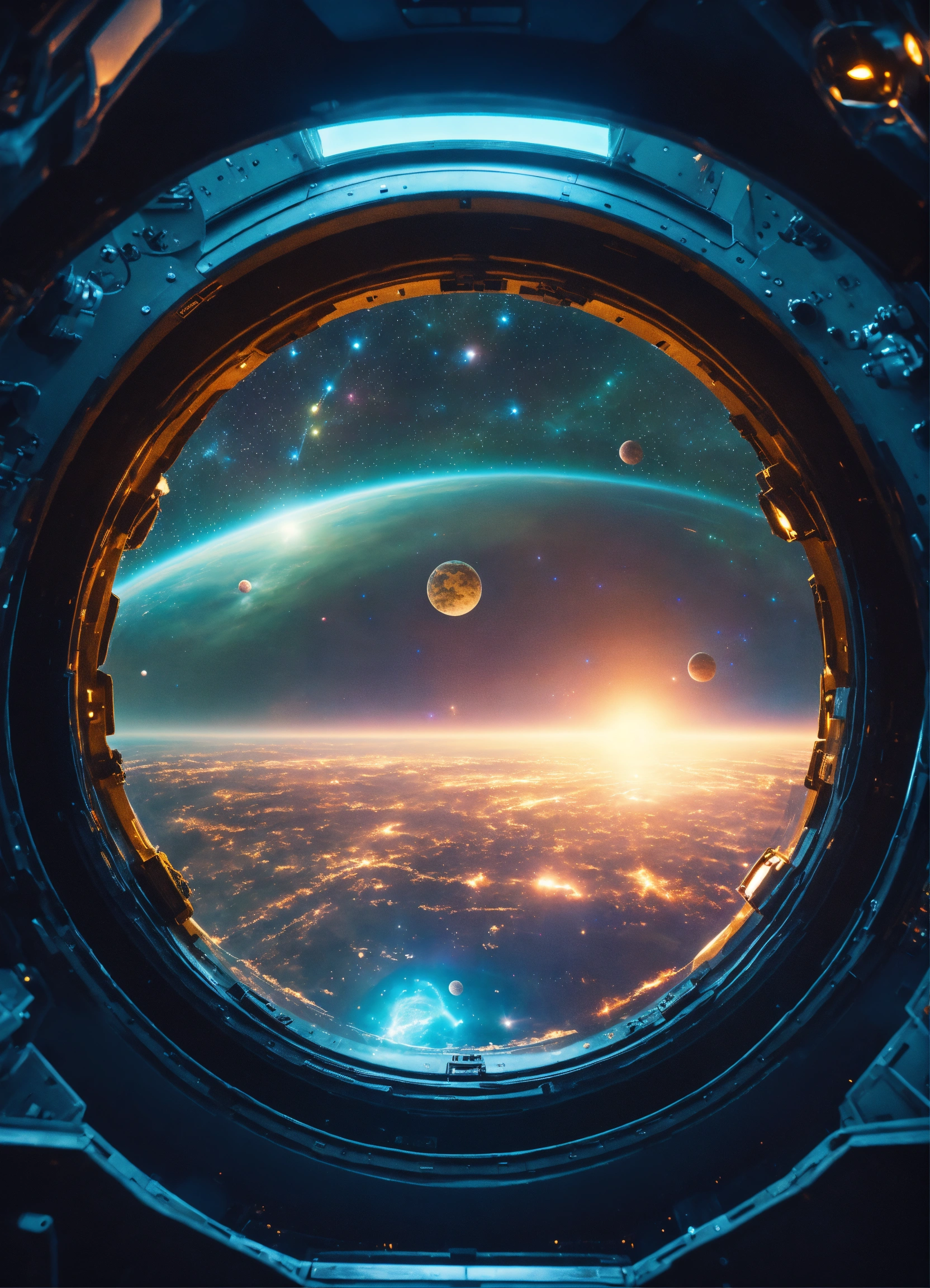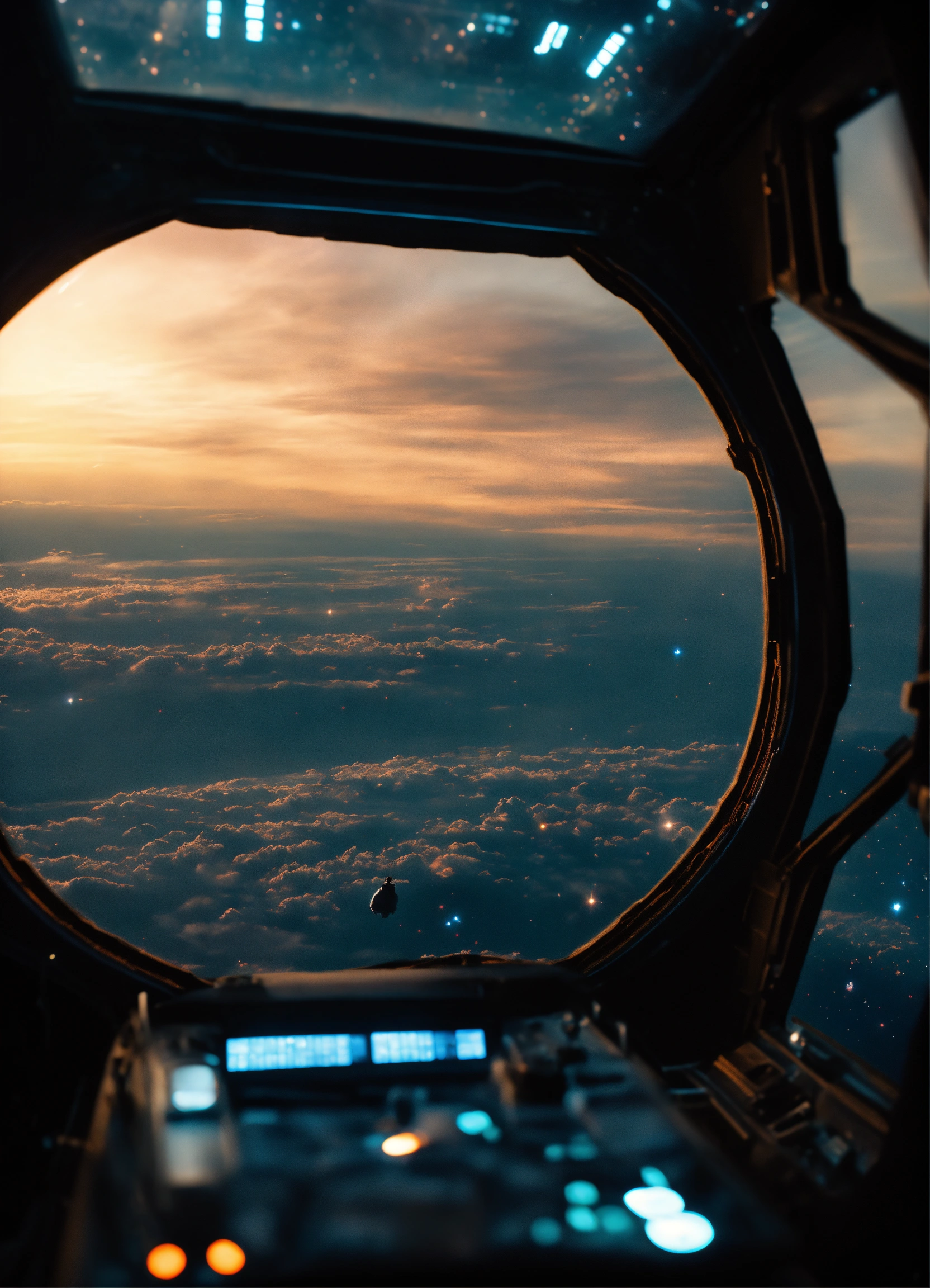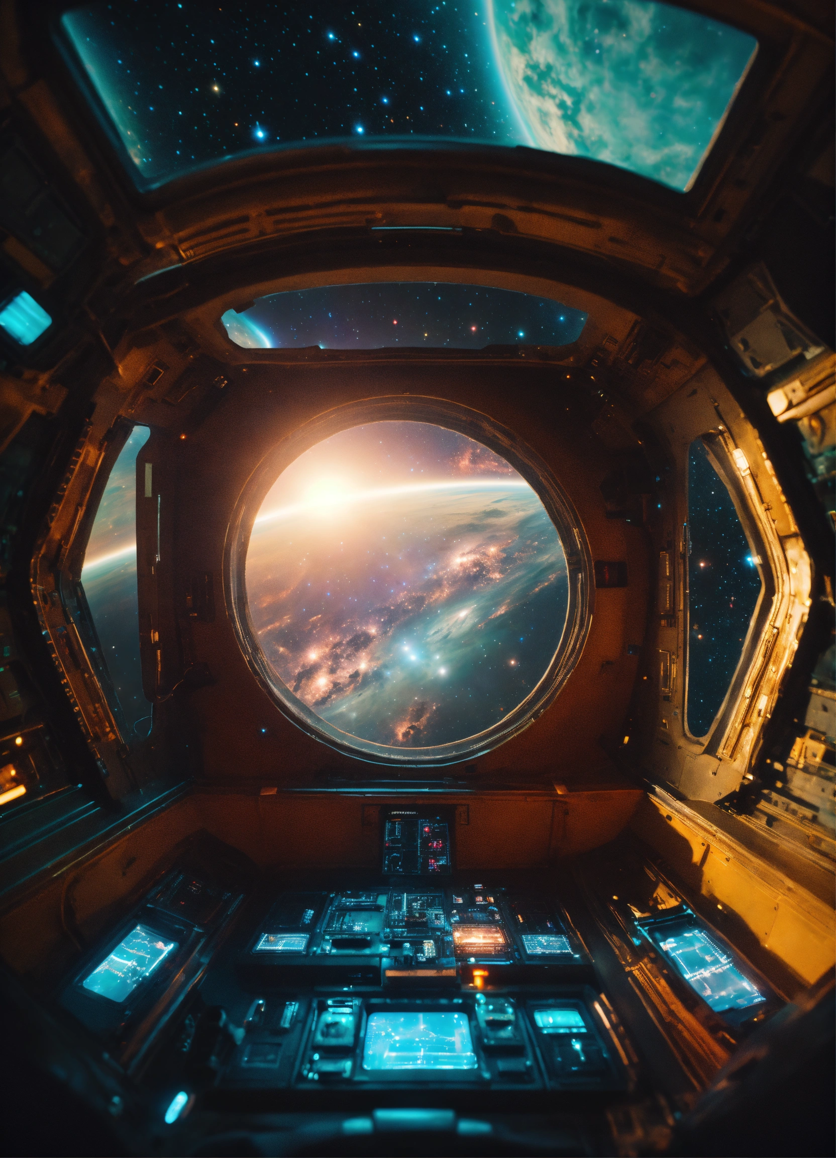 Time jumping through an inter dimensional portal, view through space ship cockpit window, wide shot, cinematic still, opening scene in epic syfi movie